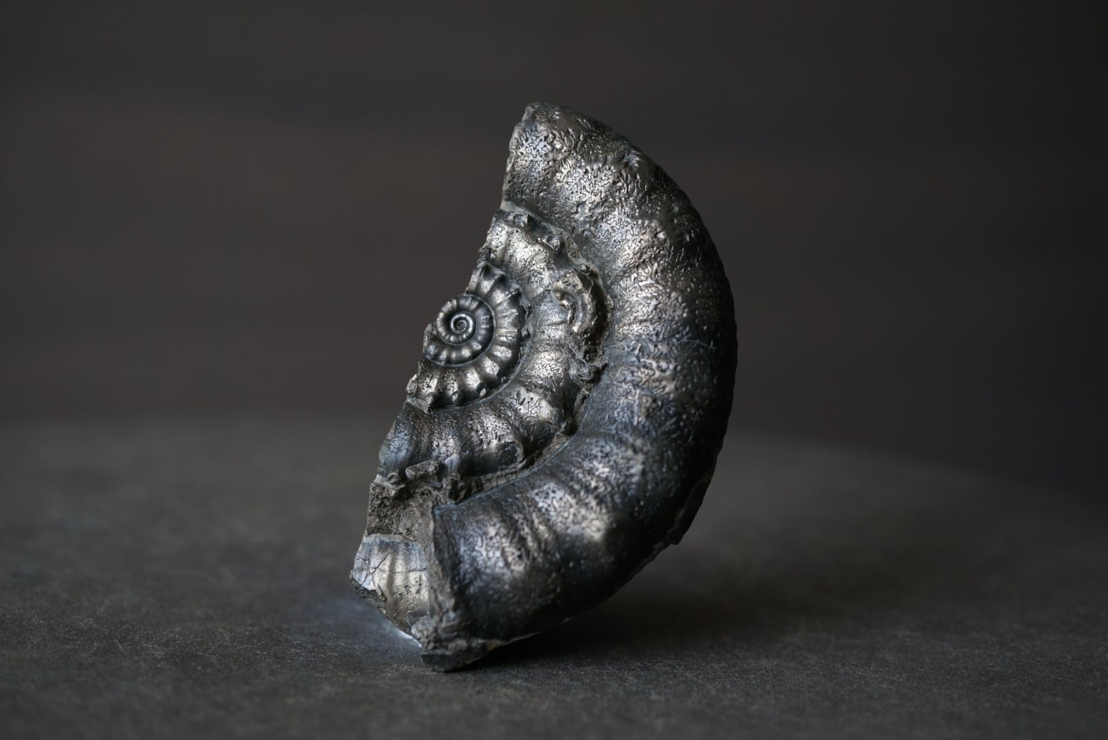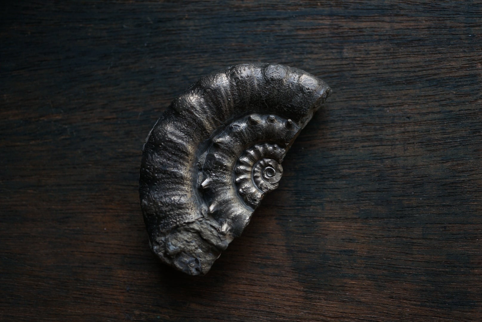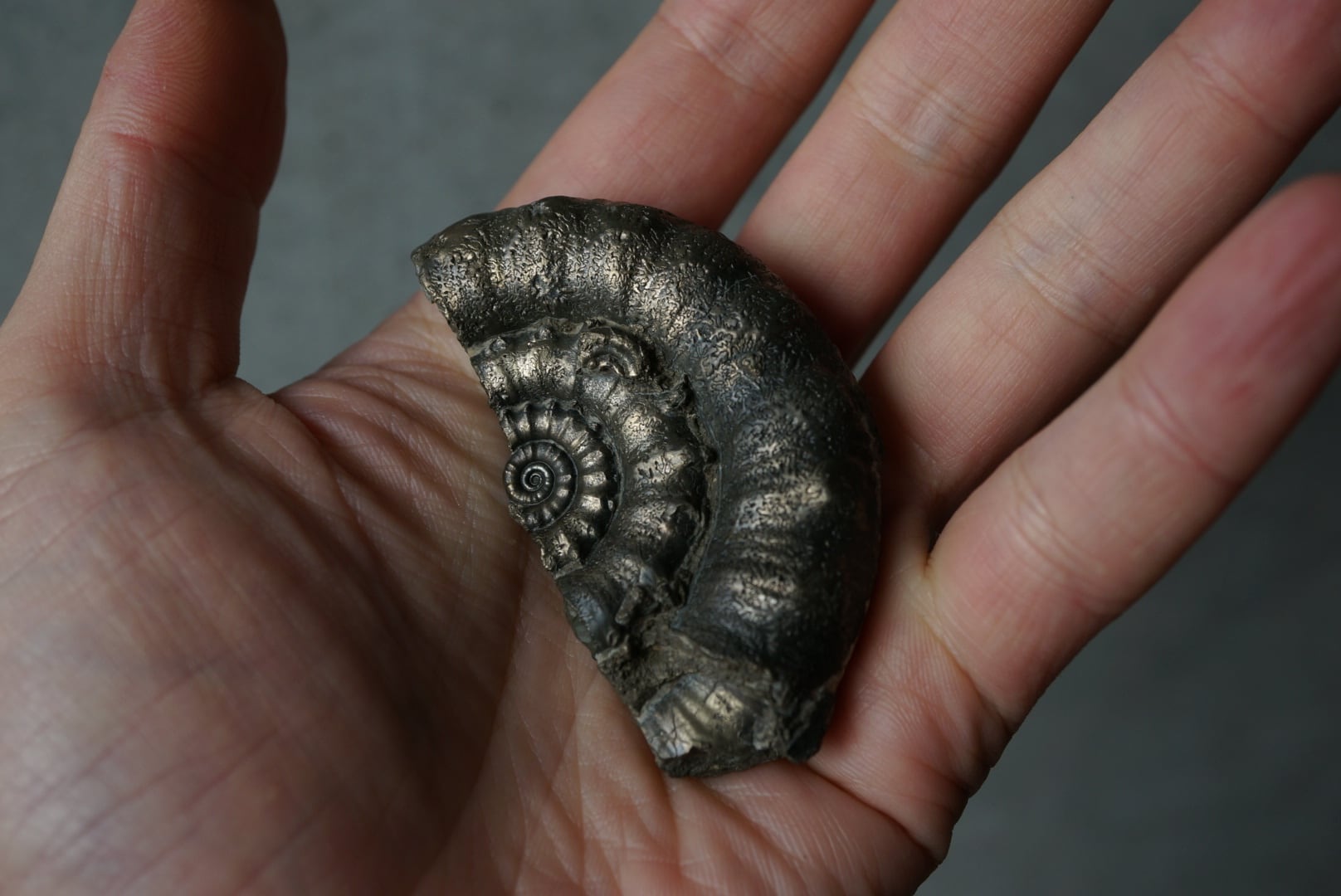 ジュラ紀(約2億130万年前から約1億4550万年前)の海に生息していたアンモナイトの遺骸が、バクテリアによる分解と鉄イオン/硫化物の反応により、黄鉄鉱によって置換され、金属光沢をもつ硬質な物質へと変化したものです。