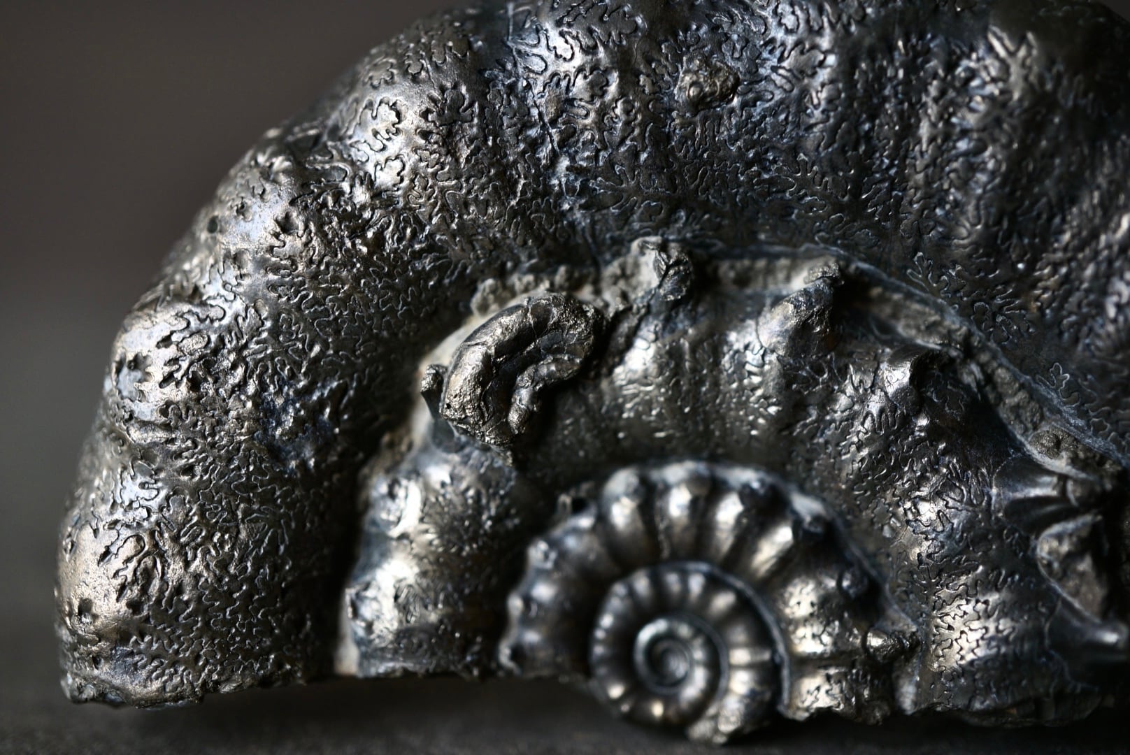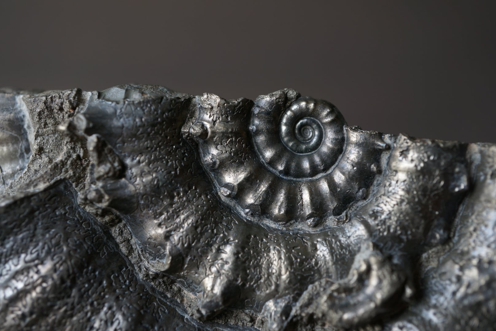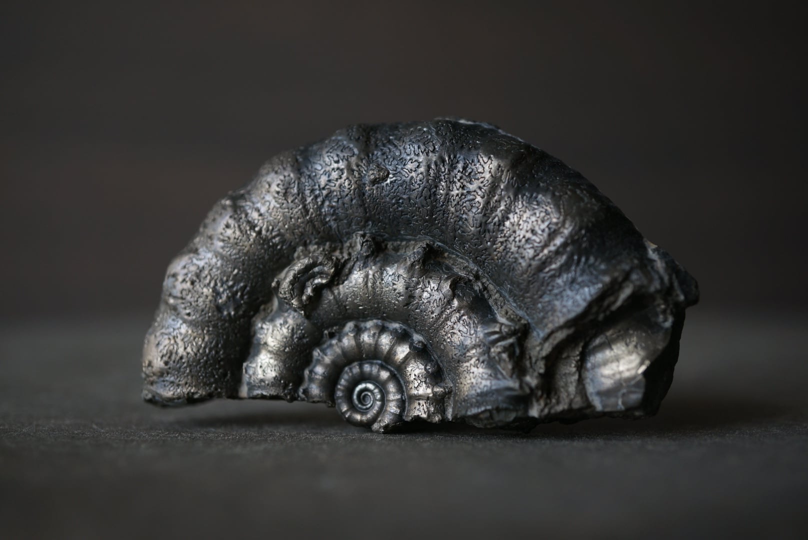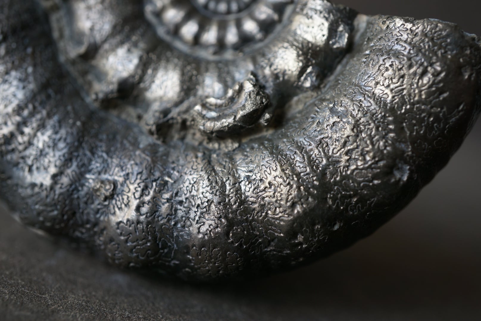 ジュラ紀(約2億130万年前から約1億4550万年前)の海に生息していたアンモナイトの遺骸が、バクテリアによる分解と鉄イオン/硫化物の反応により、黄鉄鉱によって置換され、金属光沢をもつ硬質な物質へと変化したものです。
