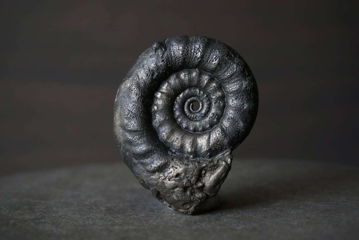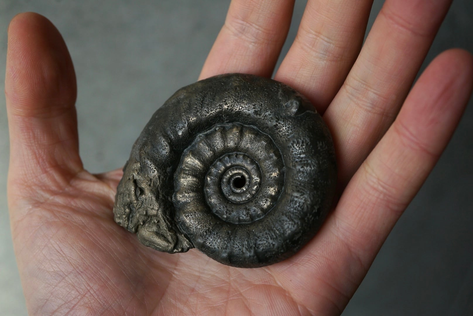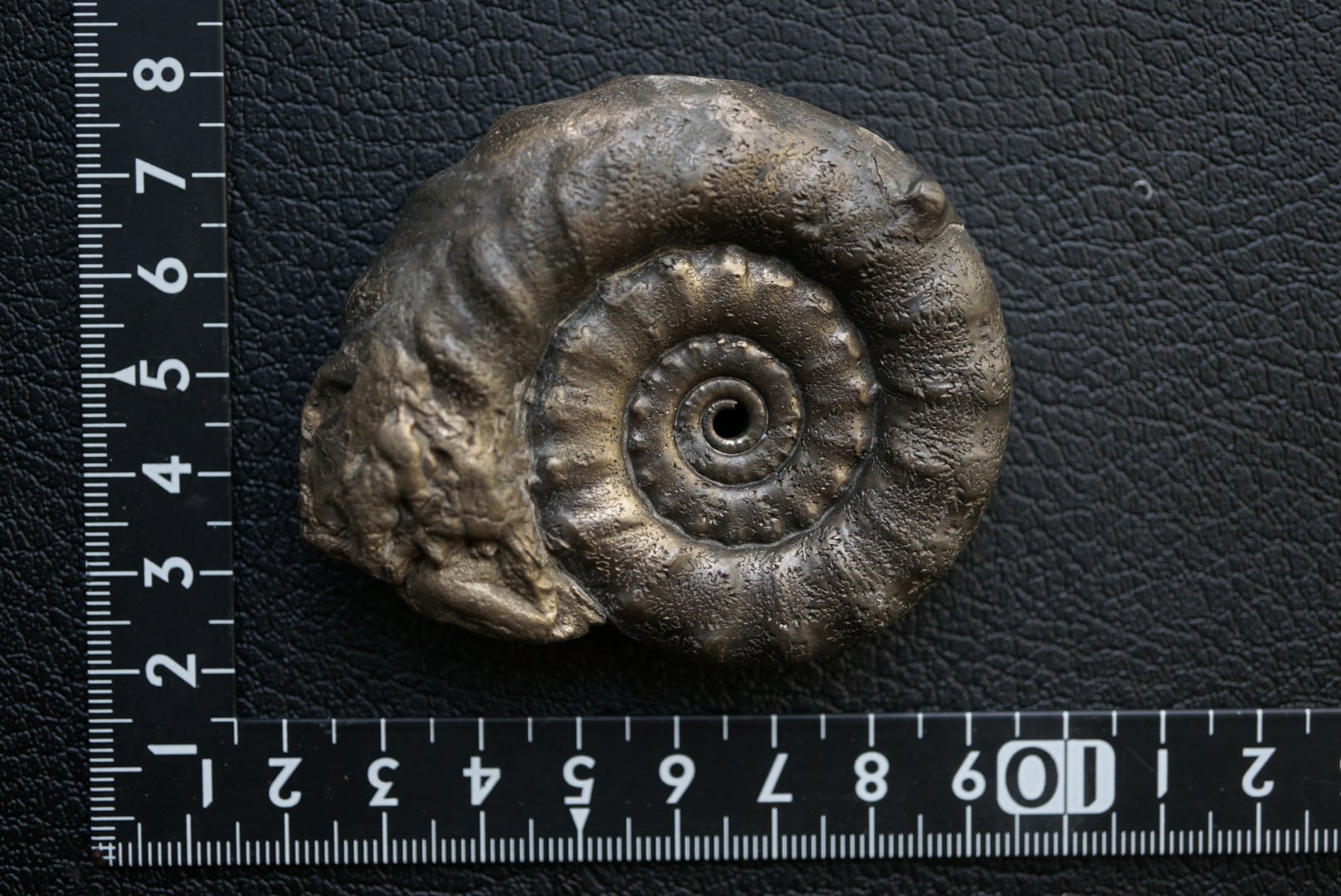ジュラ紀(約2億130万年前から約1億4550万年前)の海に生息していたアンモナイトの遺骸が、バクテリアによる分解と鉄イオン/硫化物の反応により、黄鉄鉱によって置換され、金属光沢をもつ硬質な物質へと変化したものです。