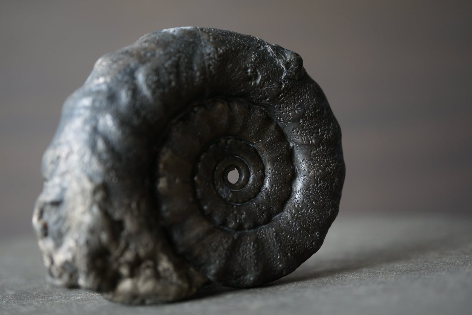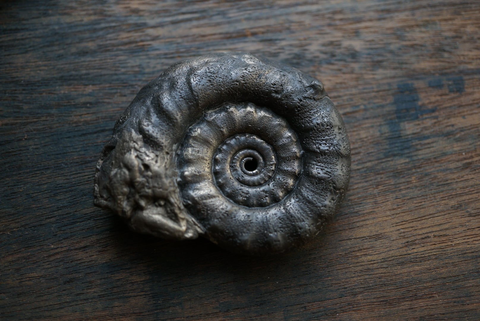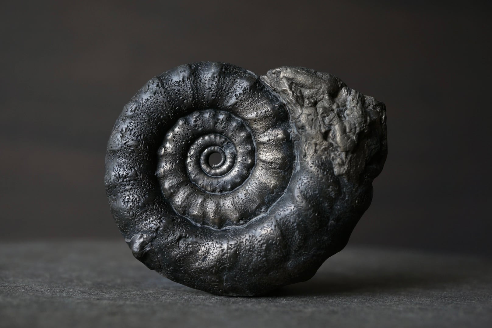 ジュラ紀(約2億130万年前から約1億4550万年前)の海に生息していたアンモナイトの遺骸が、バクテリアによる分解と鉄イオン/硫化物の反応により、黄鉄鉱によって置換され、金属光沢をもつ硬質な物質へと変化したものです。