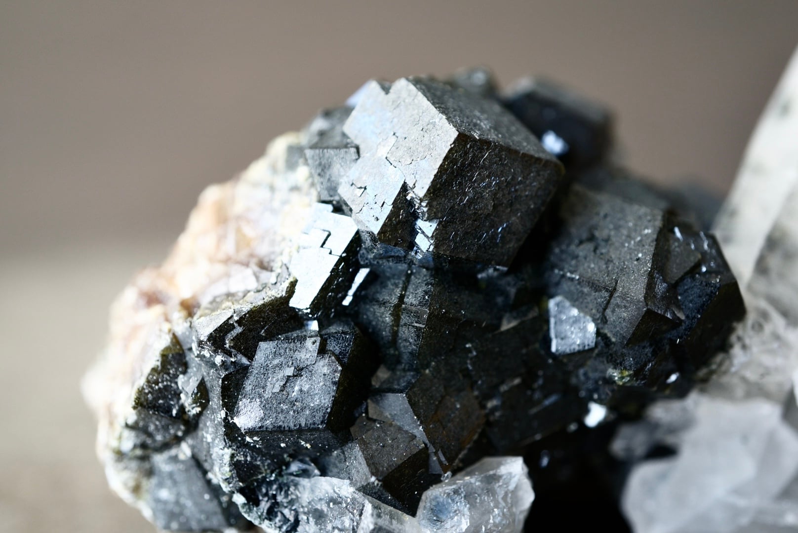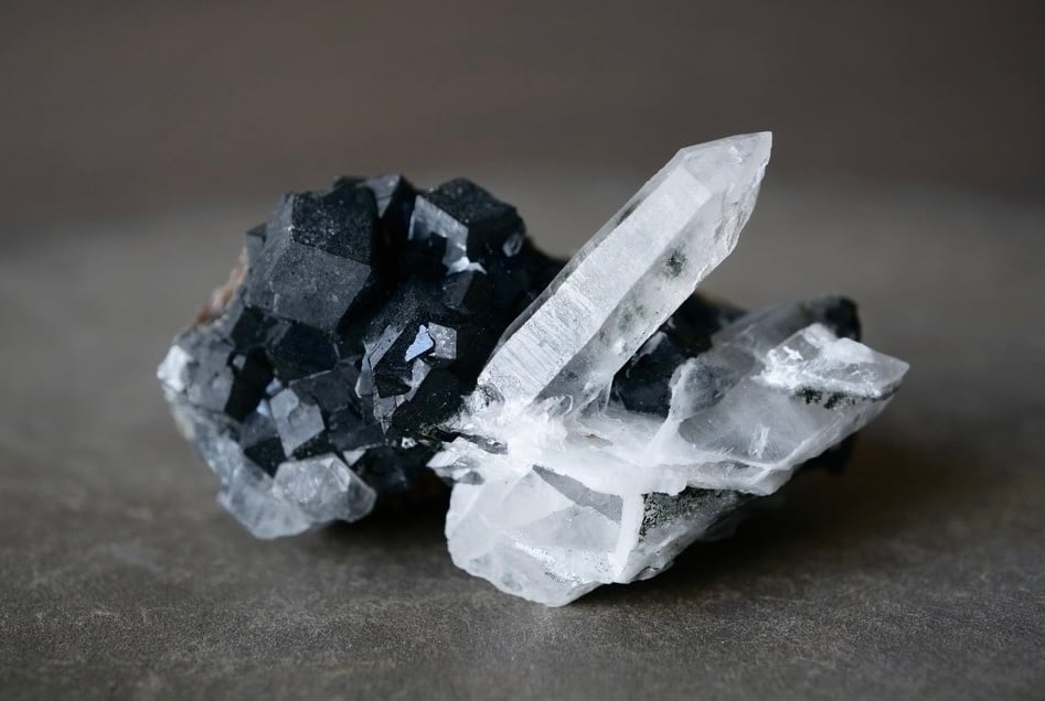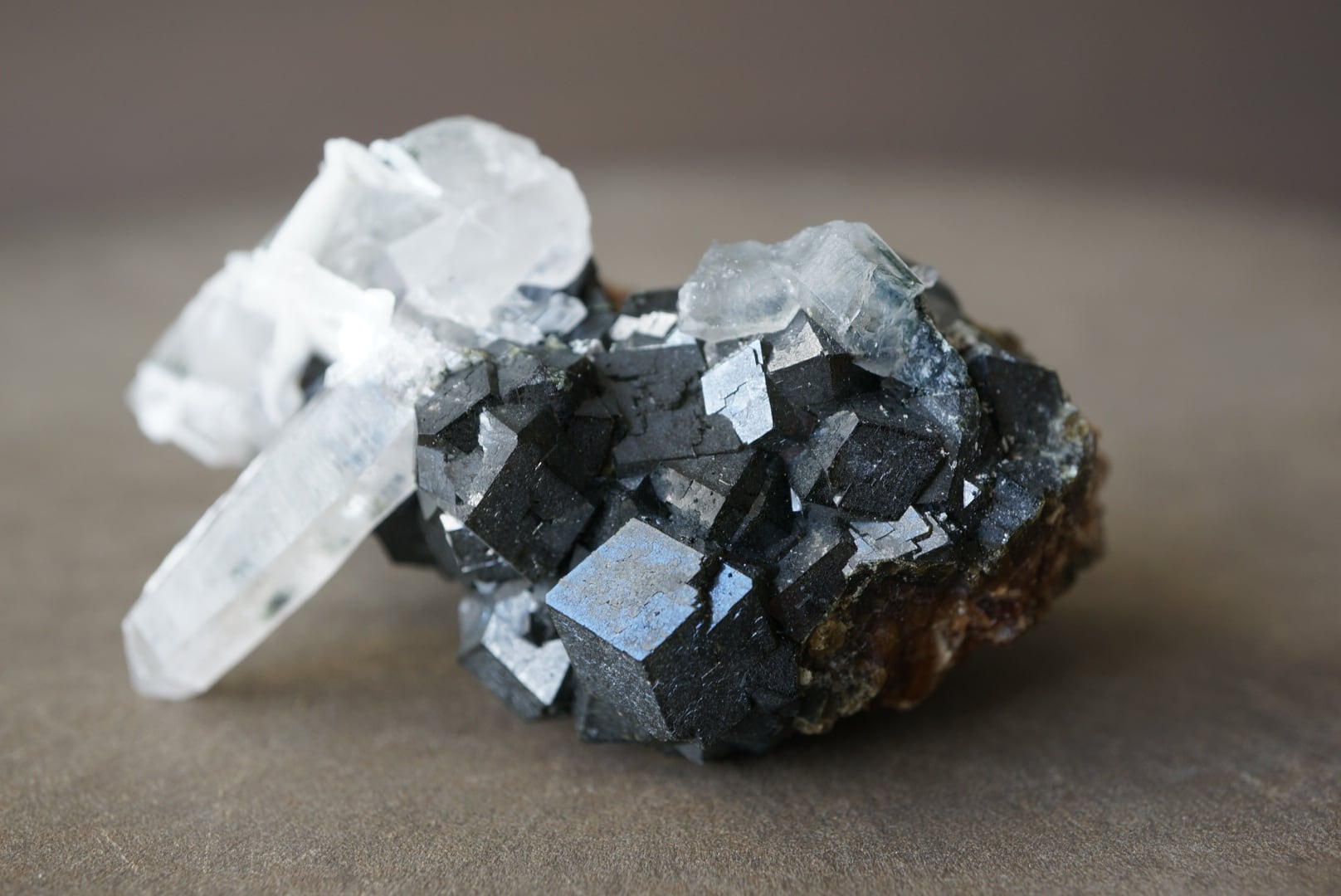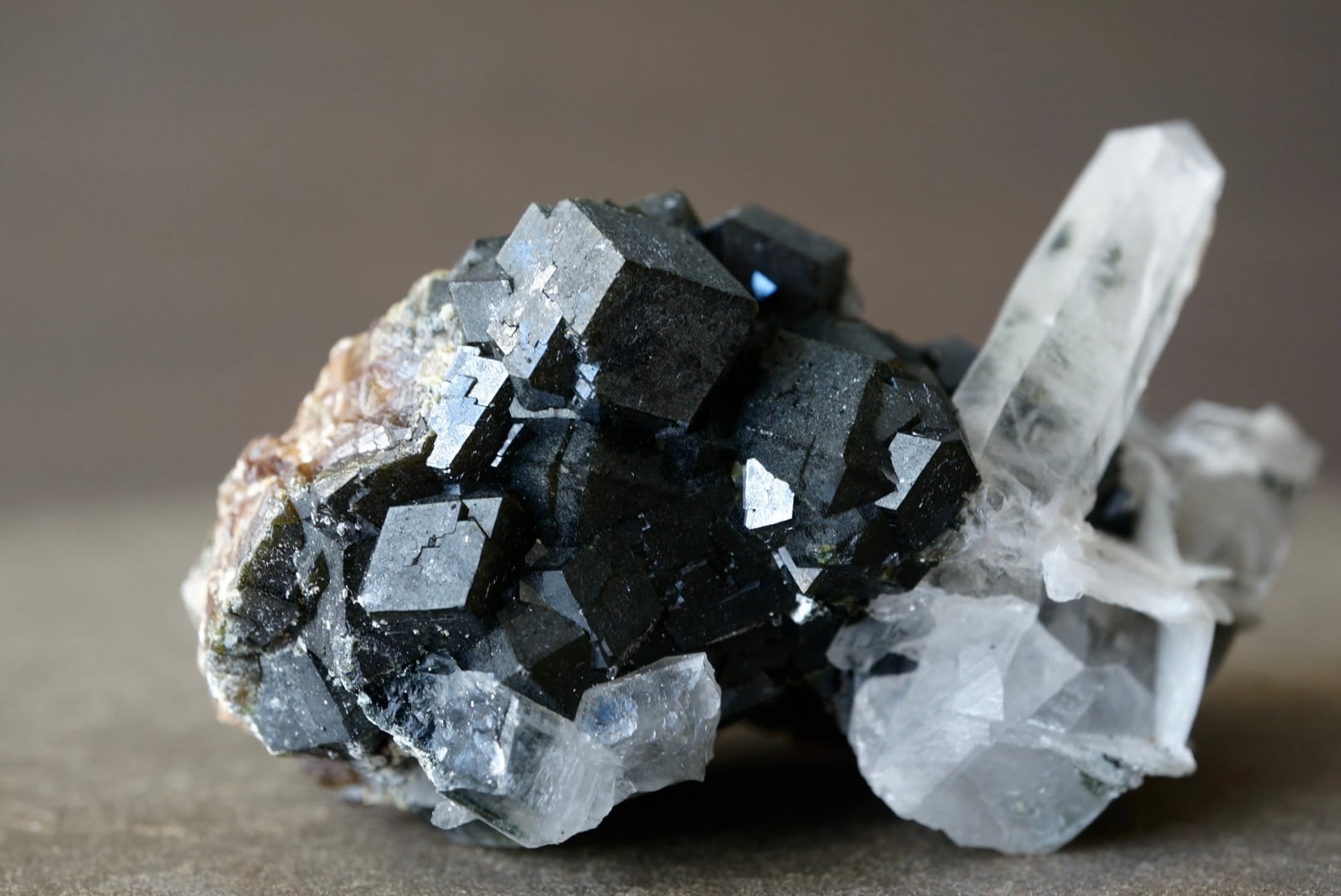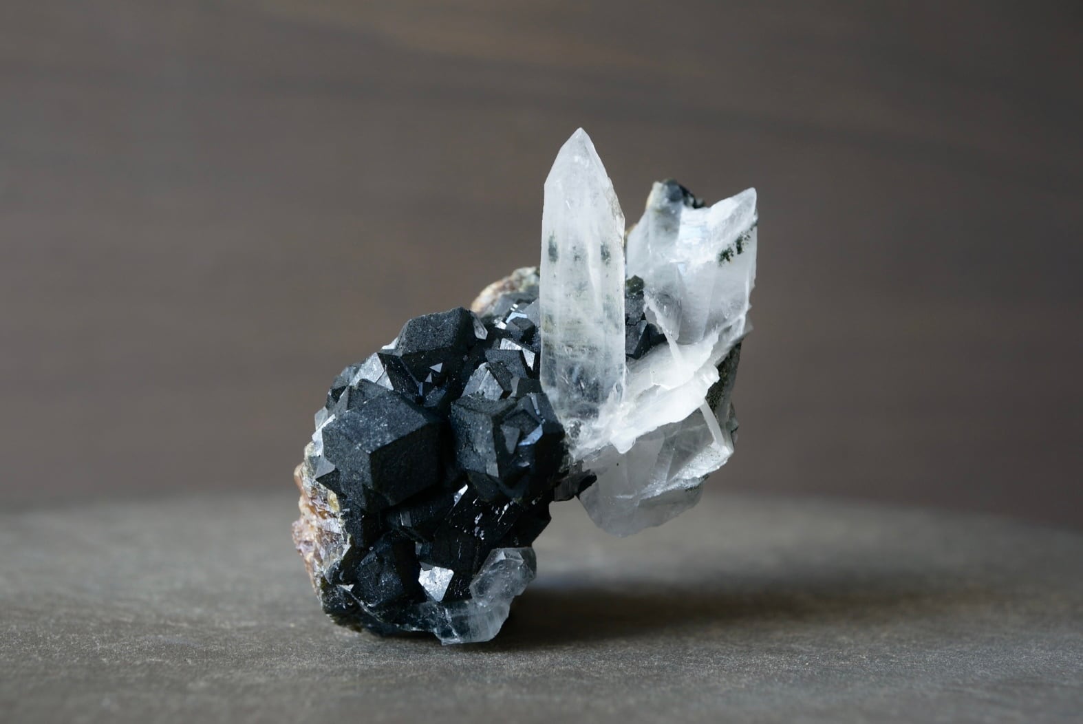 その暗色の集積を突き破るように、透明感のあるクォーツの柱状結晶が真っ直ぐに伸びています。