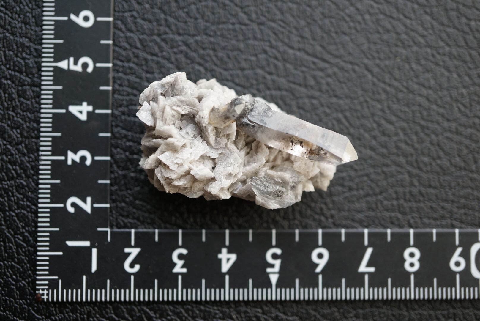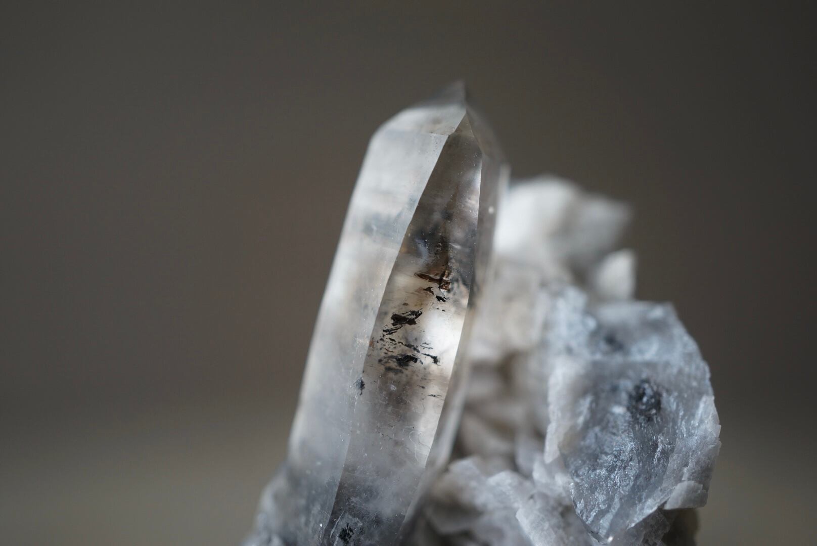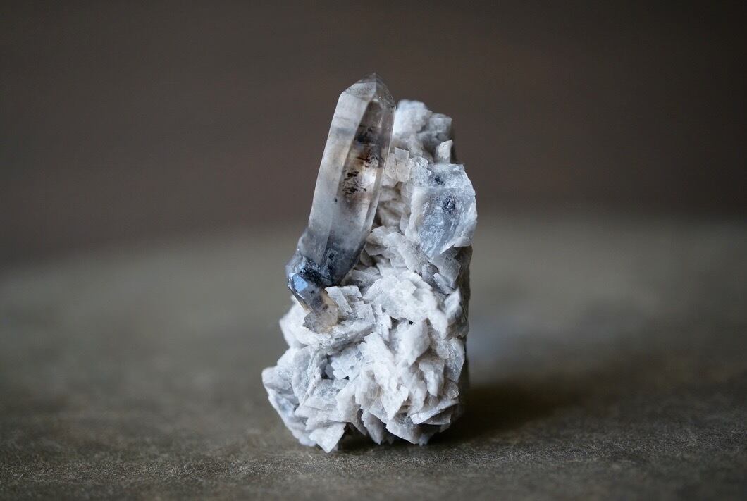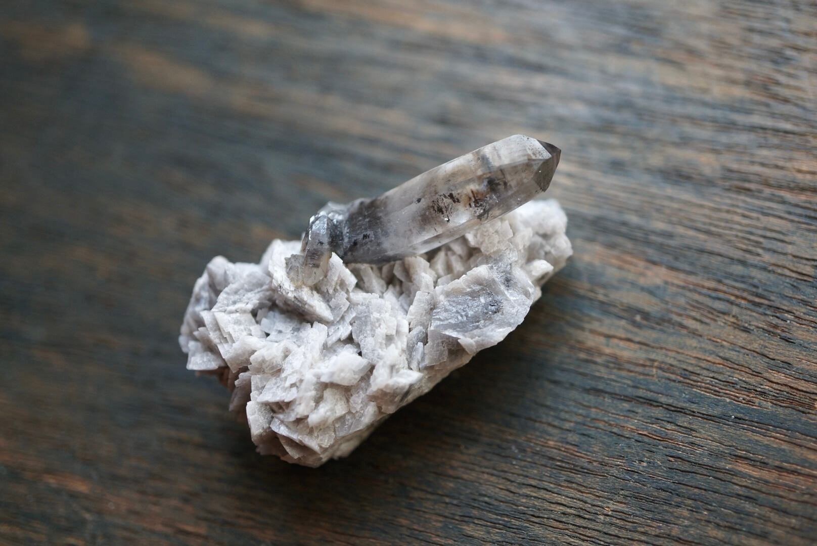 母岩部分は、フェルスパーの細かな階段状の結晶が層をなして積み重なり、その上に据えられたクォーツは、透明度が高く、稜線の整った端正なフォルムを保ったまま伸びています。