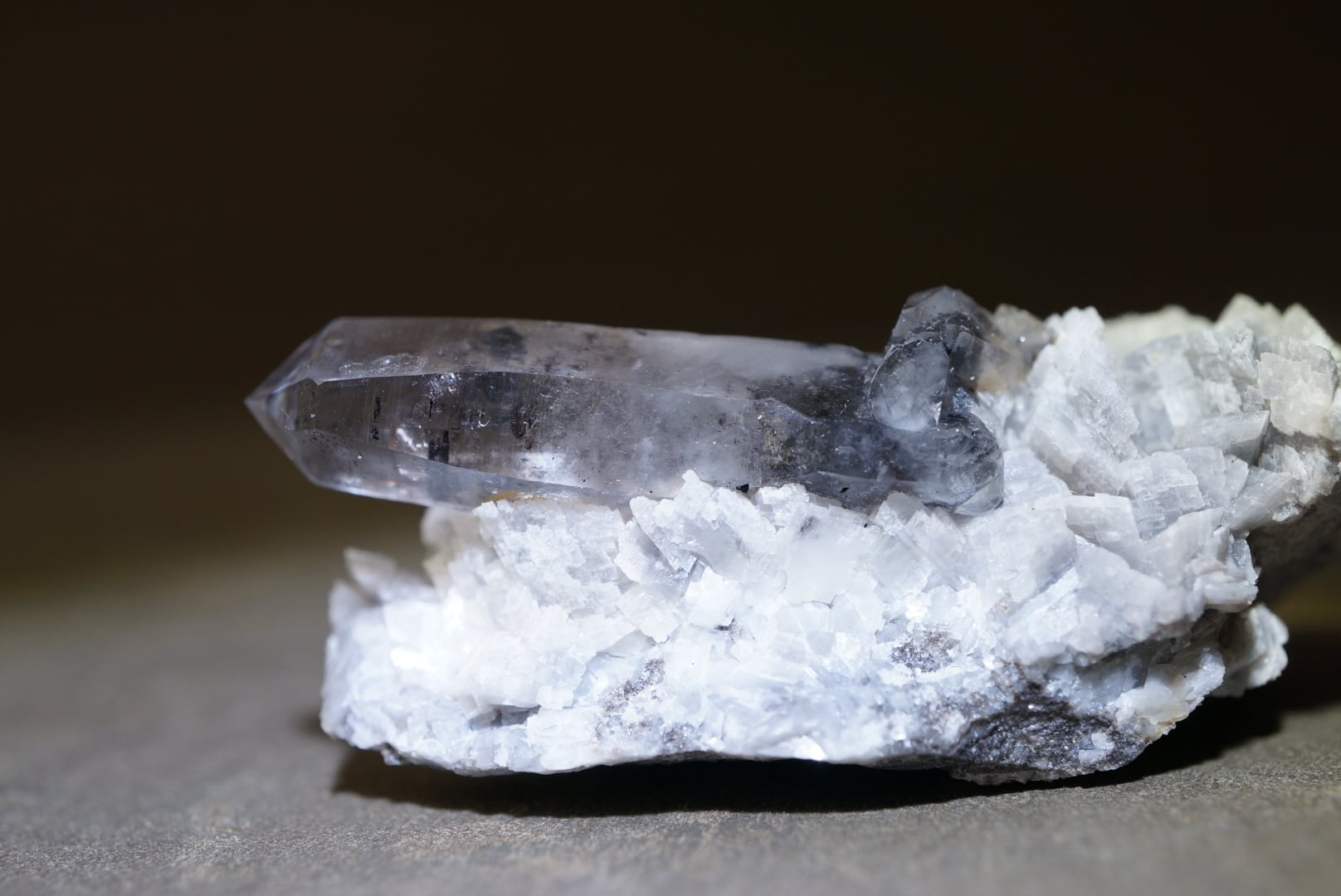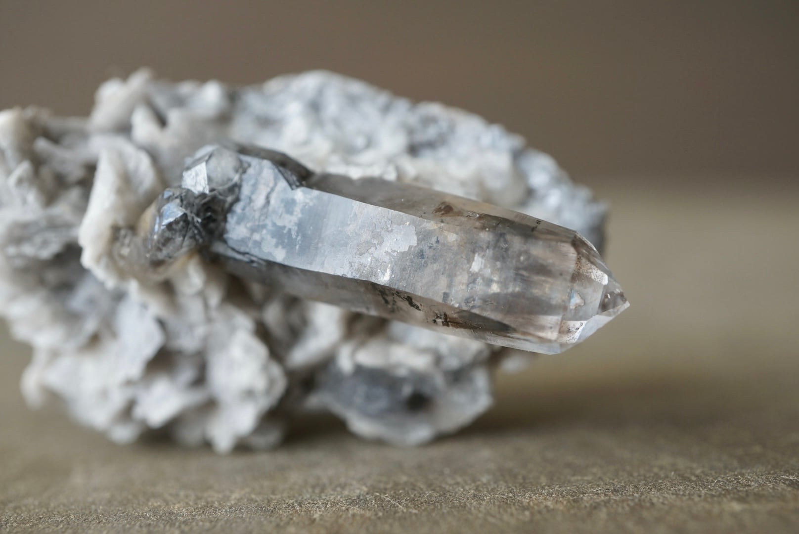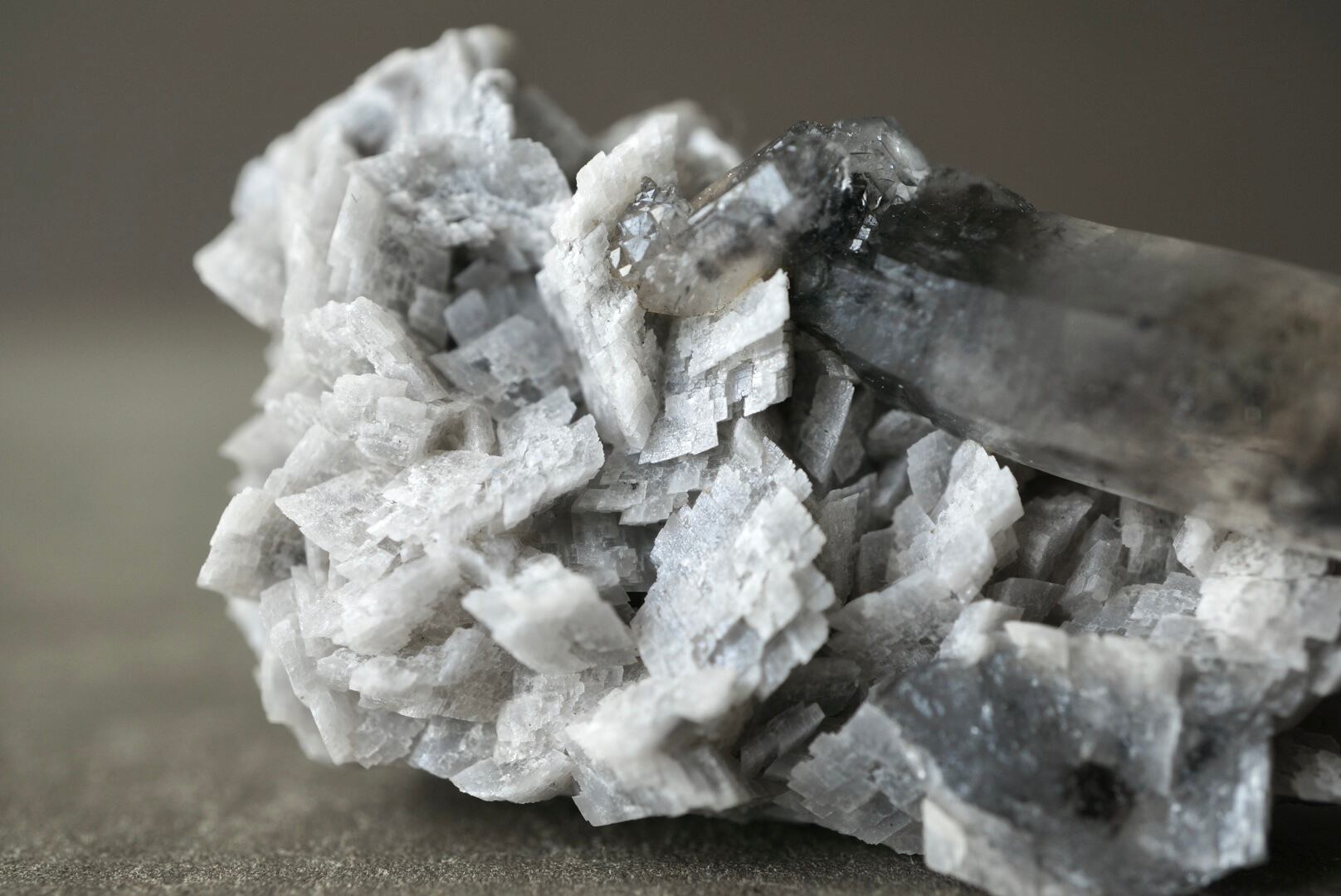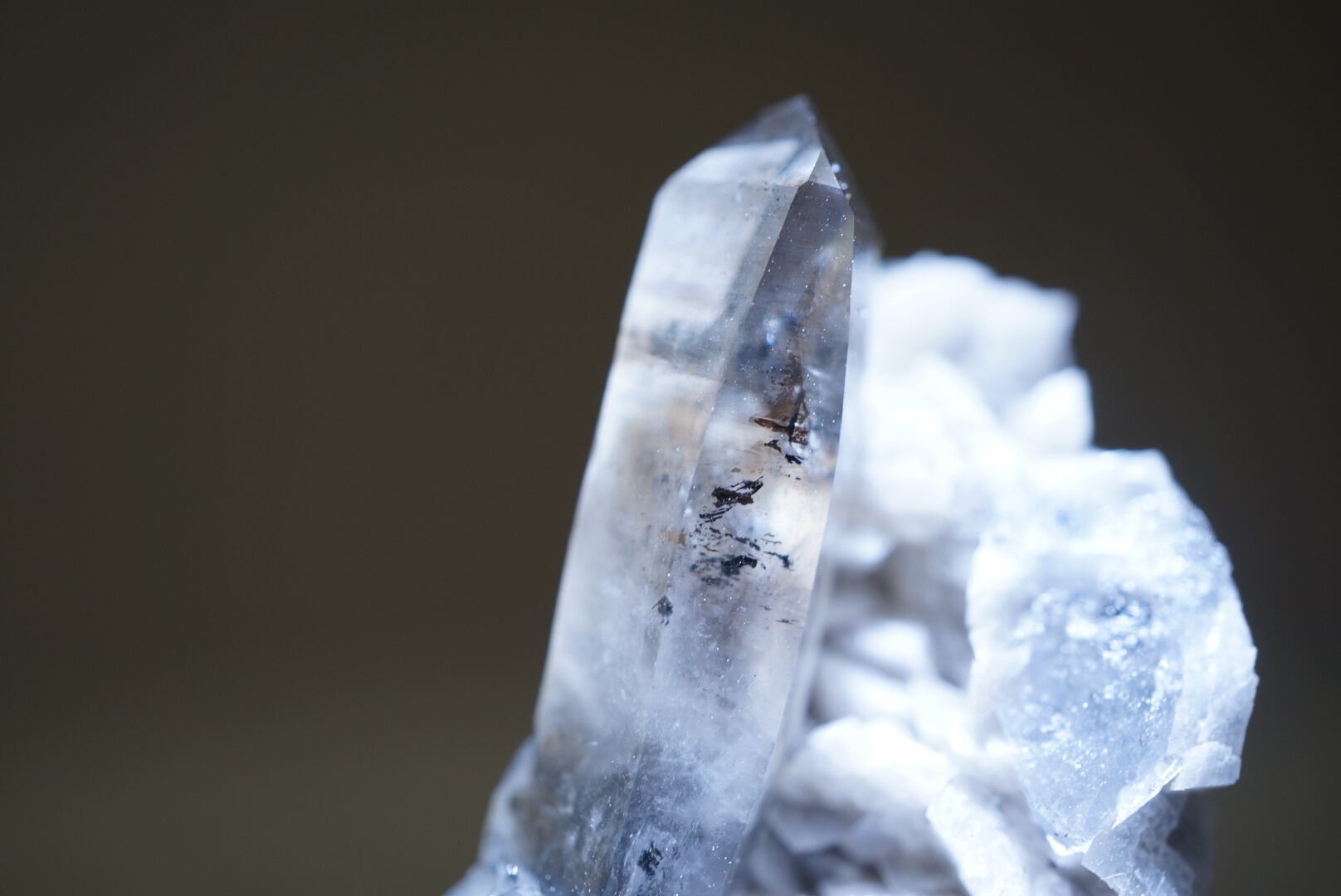 母岩部分は、フェルスパーの細かな階段状の結晶が層をなして積み重なり、その上に据えられたクォーツは、透明度が高く、稜線の整った端正なフォルムを保ったまま伸びています。
