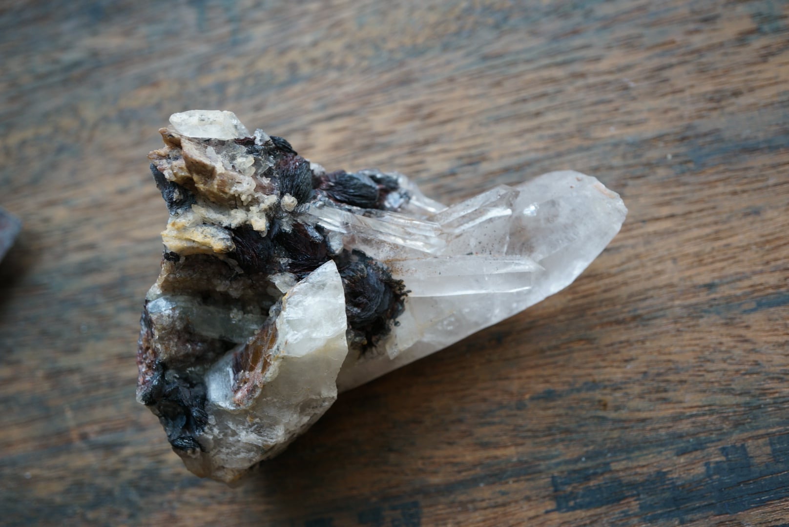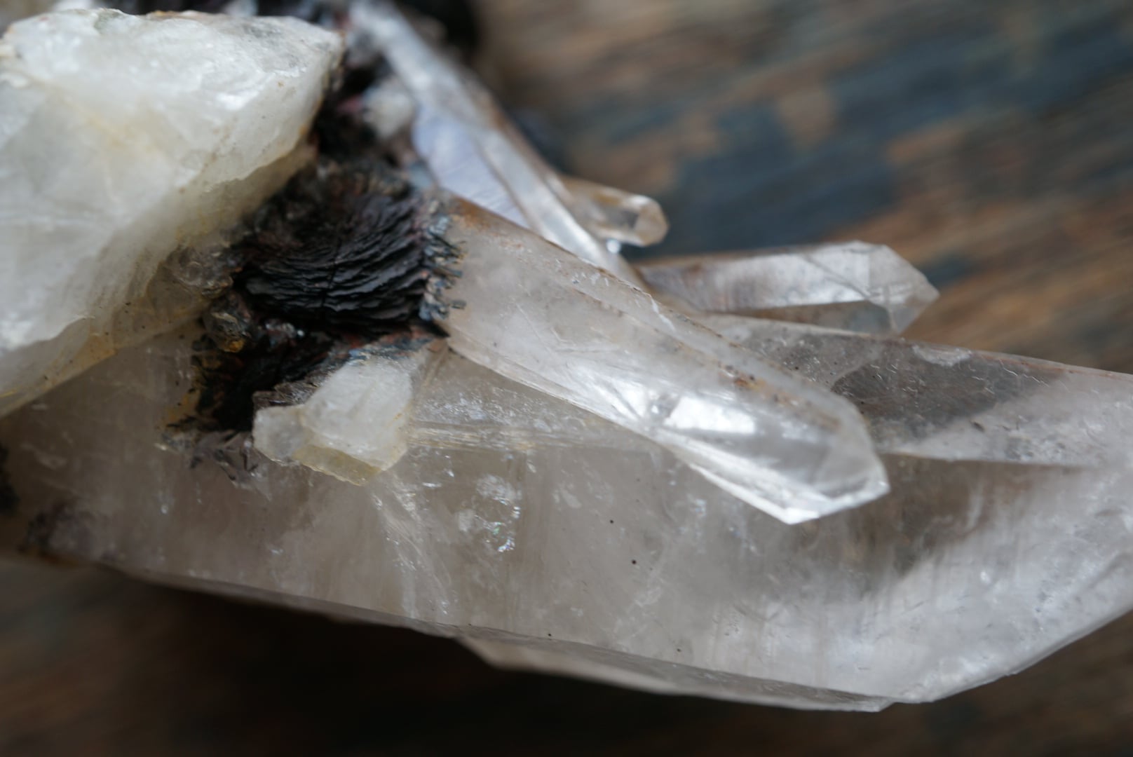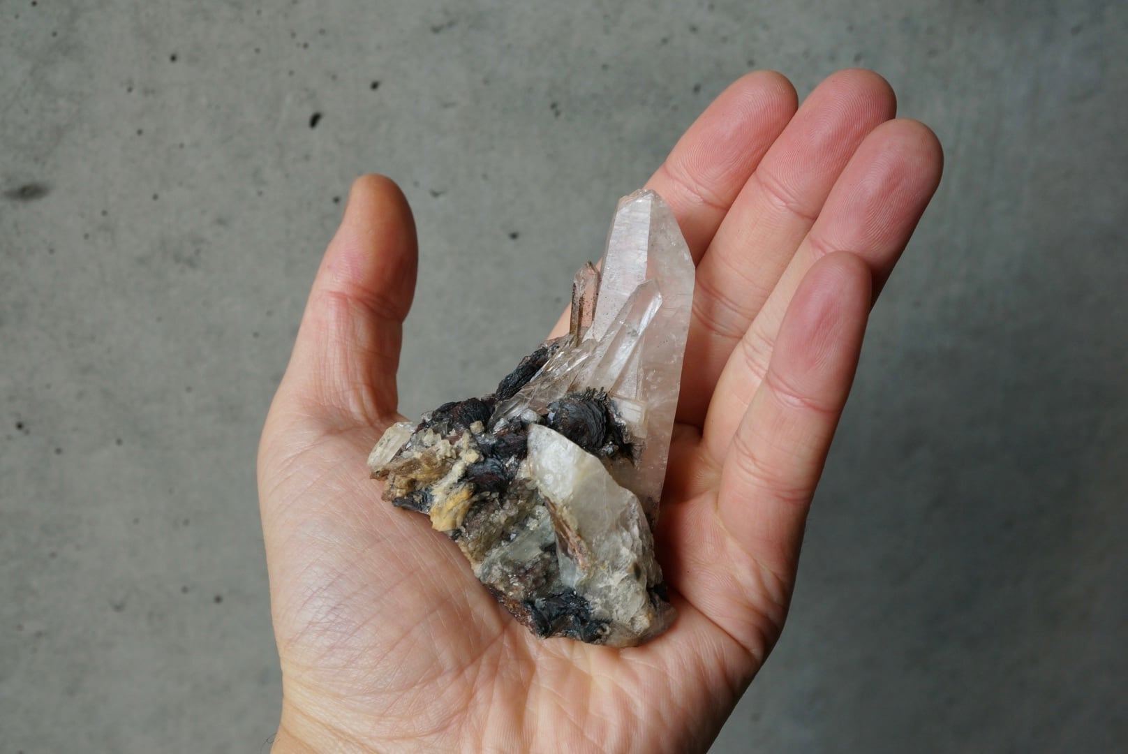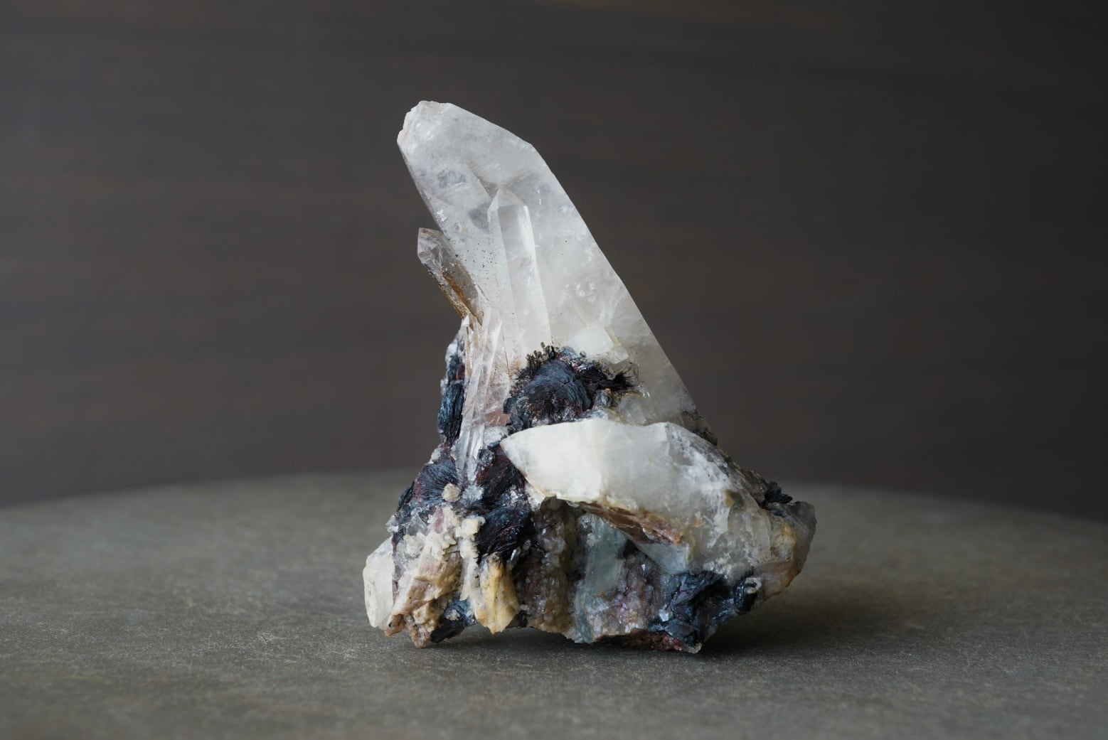 その硬質で重厚な質感に対して、伸びやかに突き出すクォーツは鋭いラインを描きながら光を透過します。