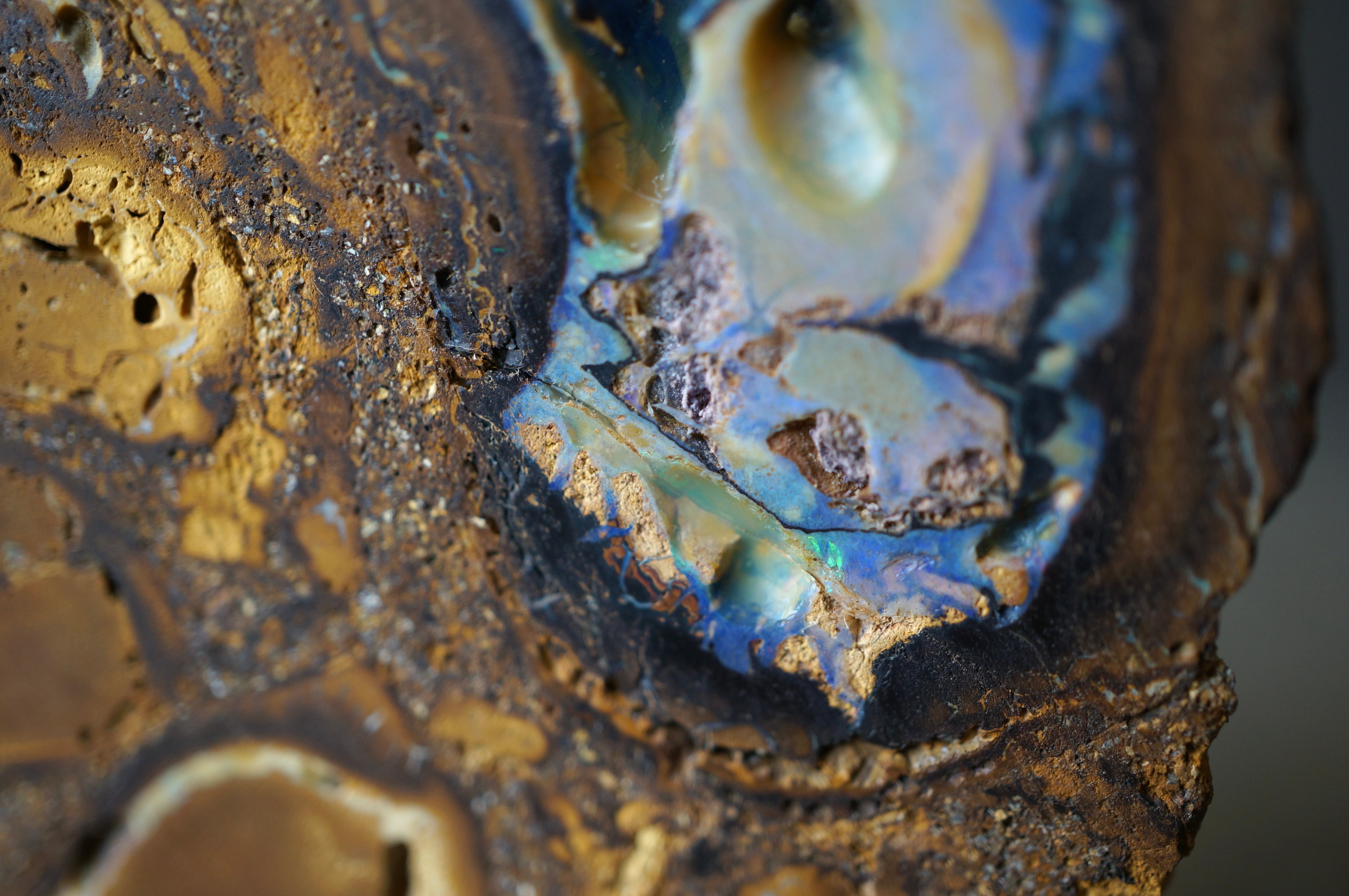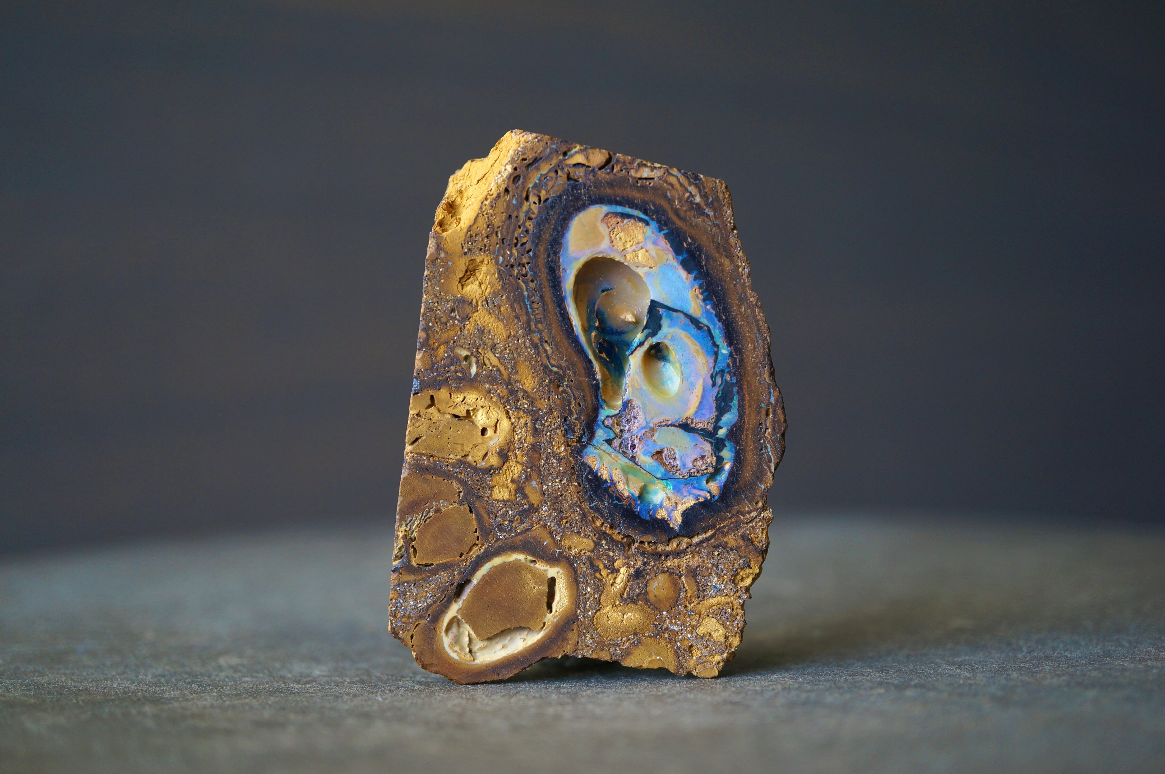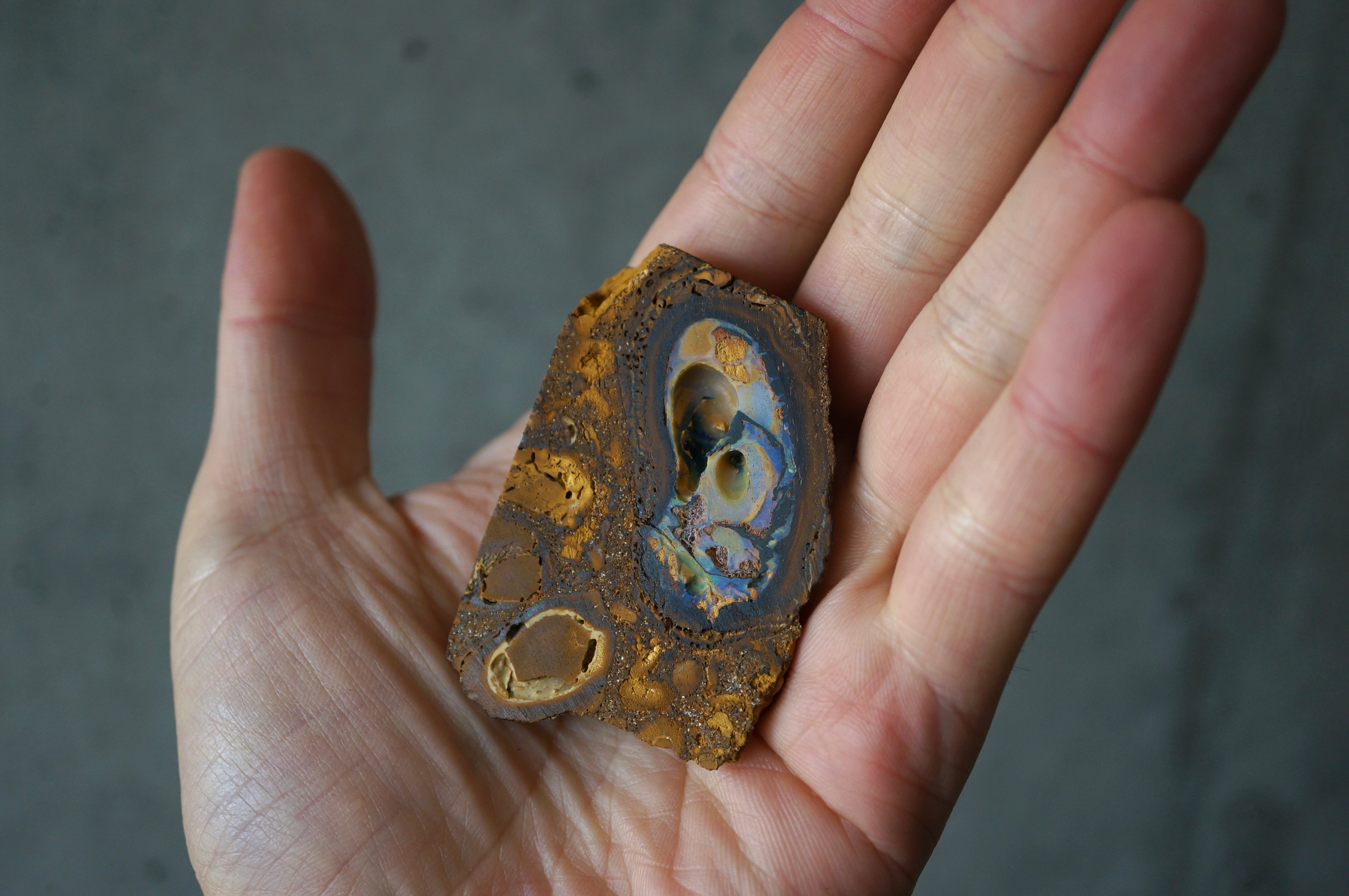 ボルダーオパールは鉄分を多く含む砂岩中に形成されたオパールを、母岩ごと切り出したものです。
