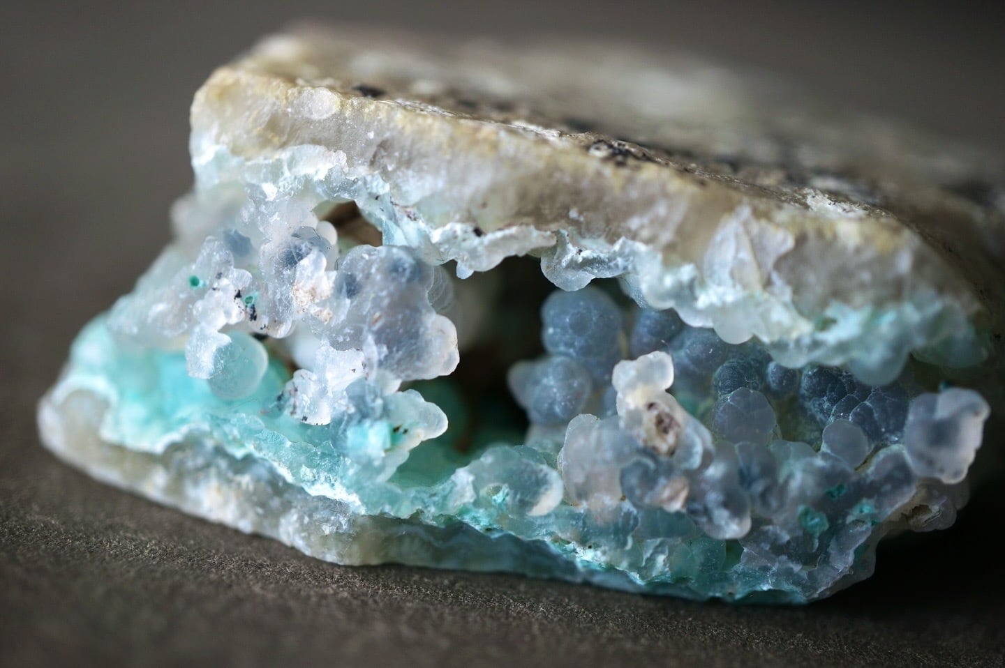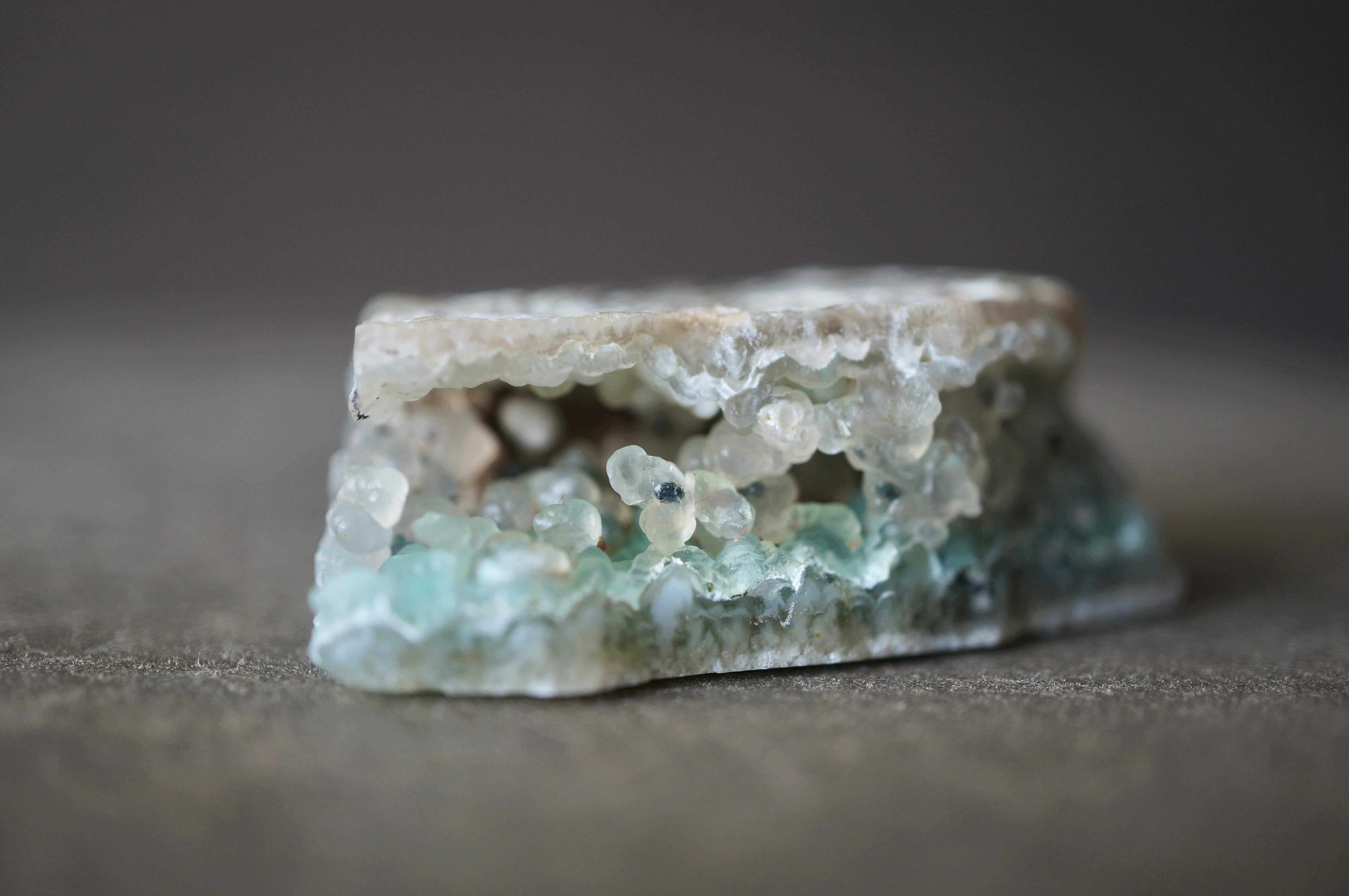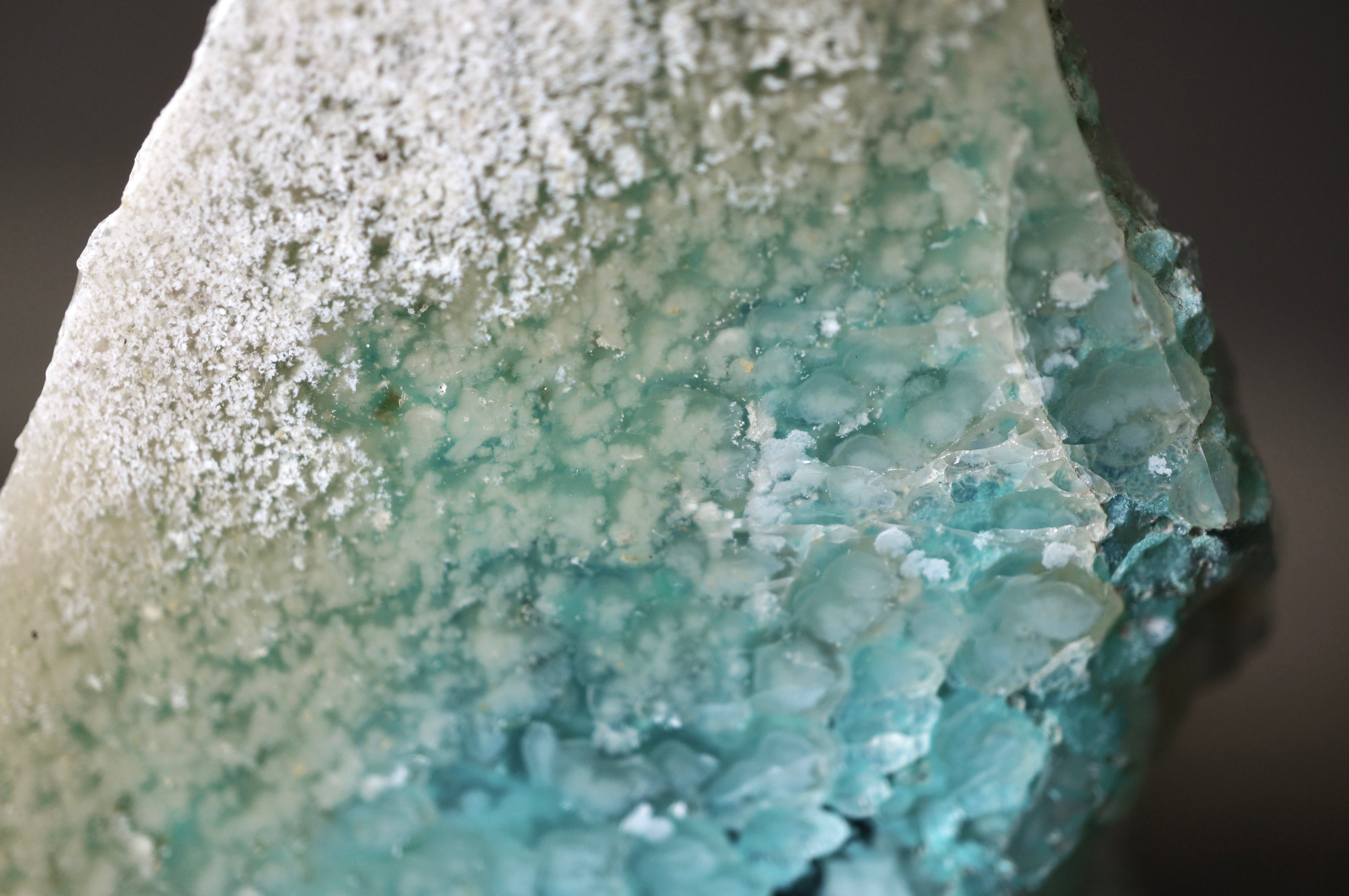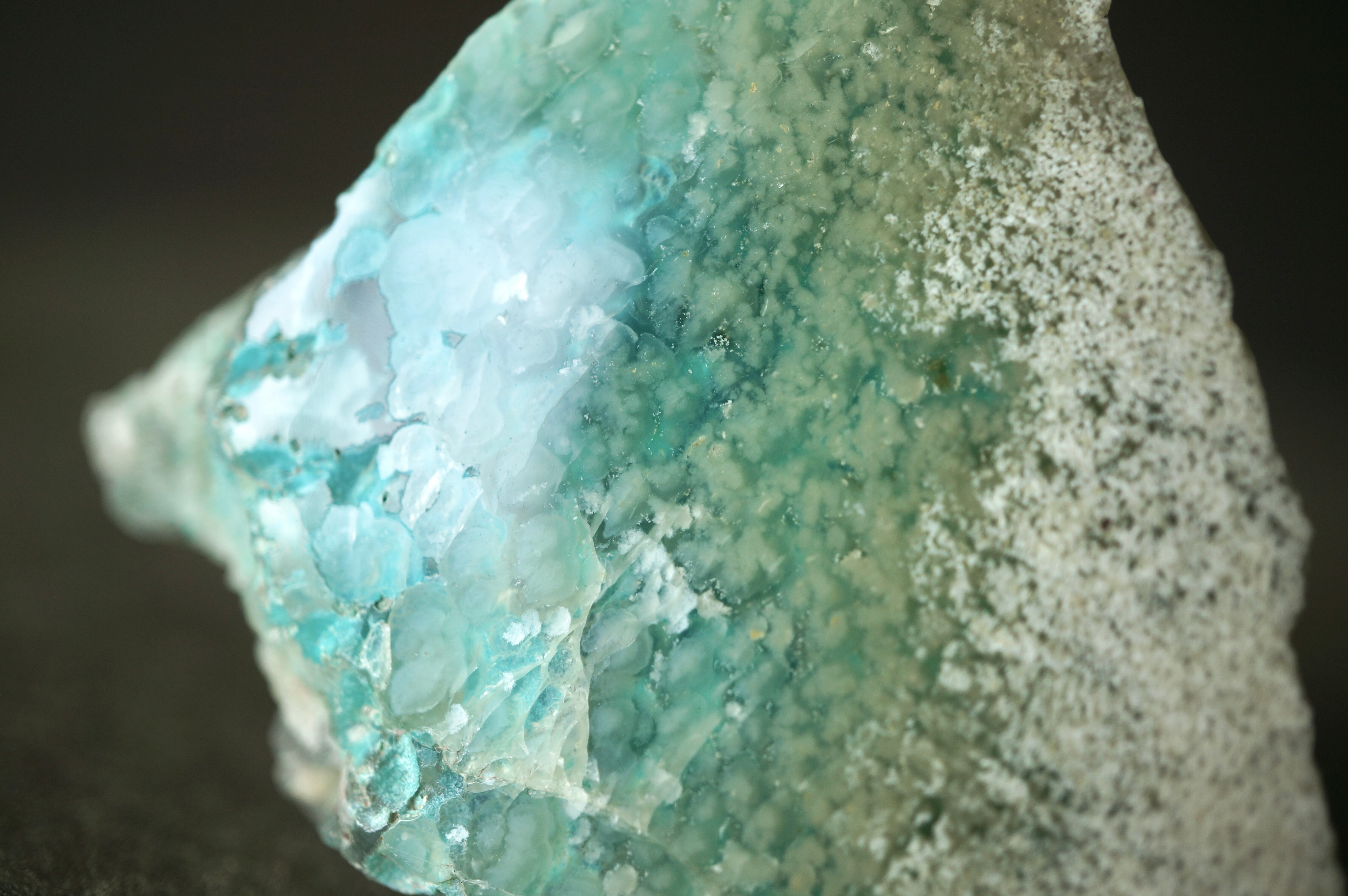 半透明のカルセドニーに、クリソコラ由来の淡い青から青緑がにじむように広がり、波打つようなみずみずしいグラデーションを描きます。