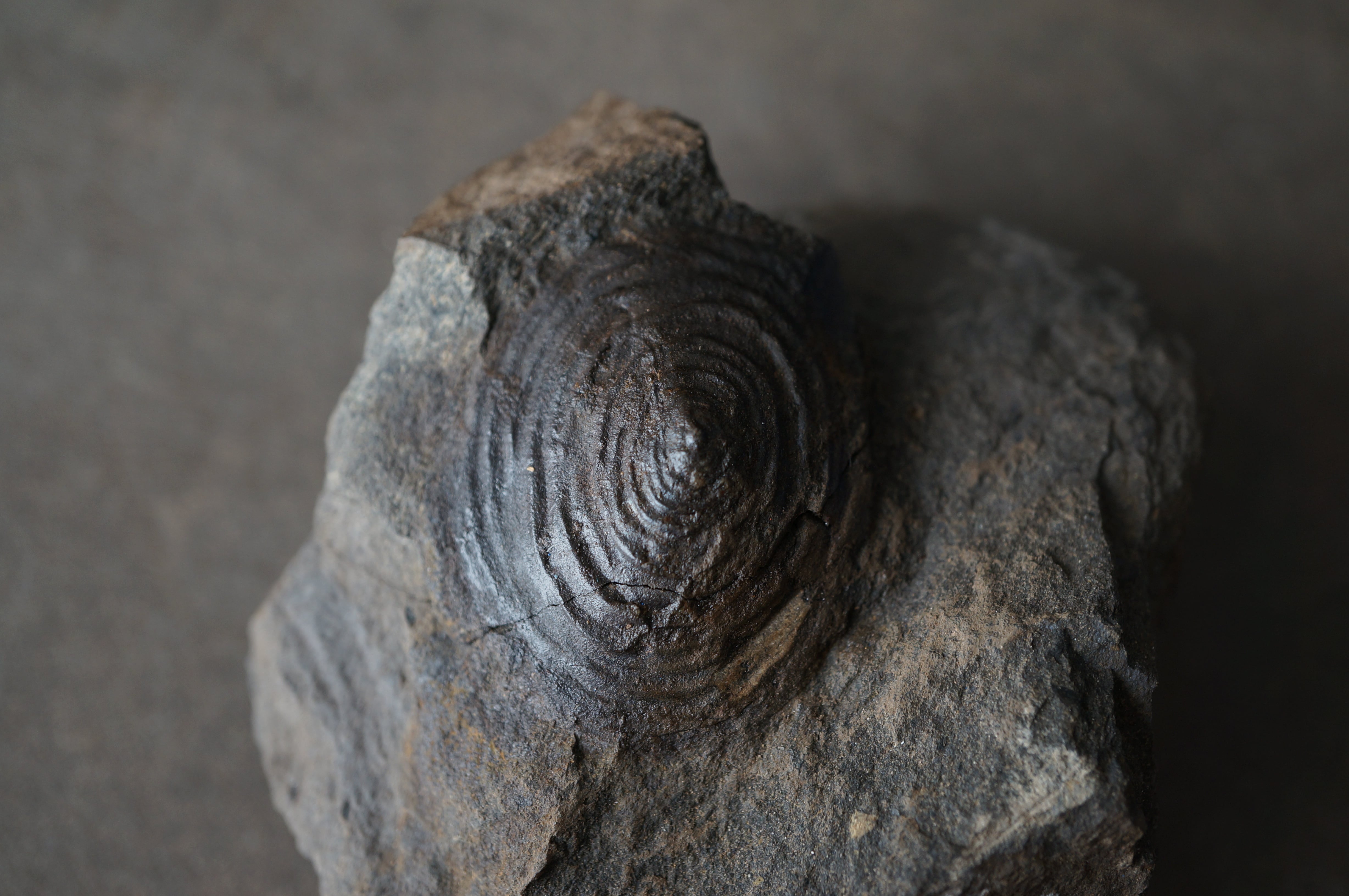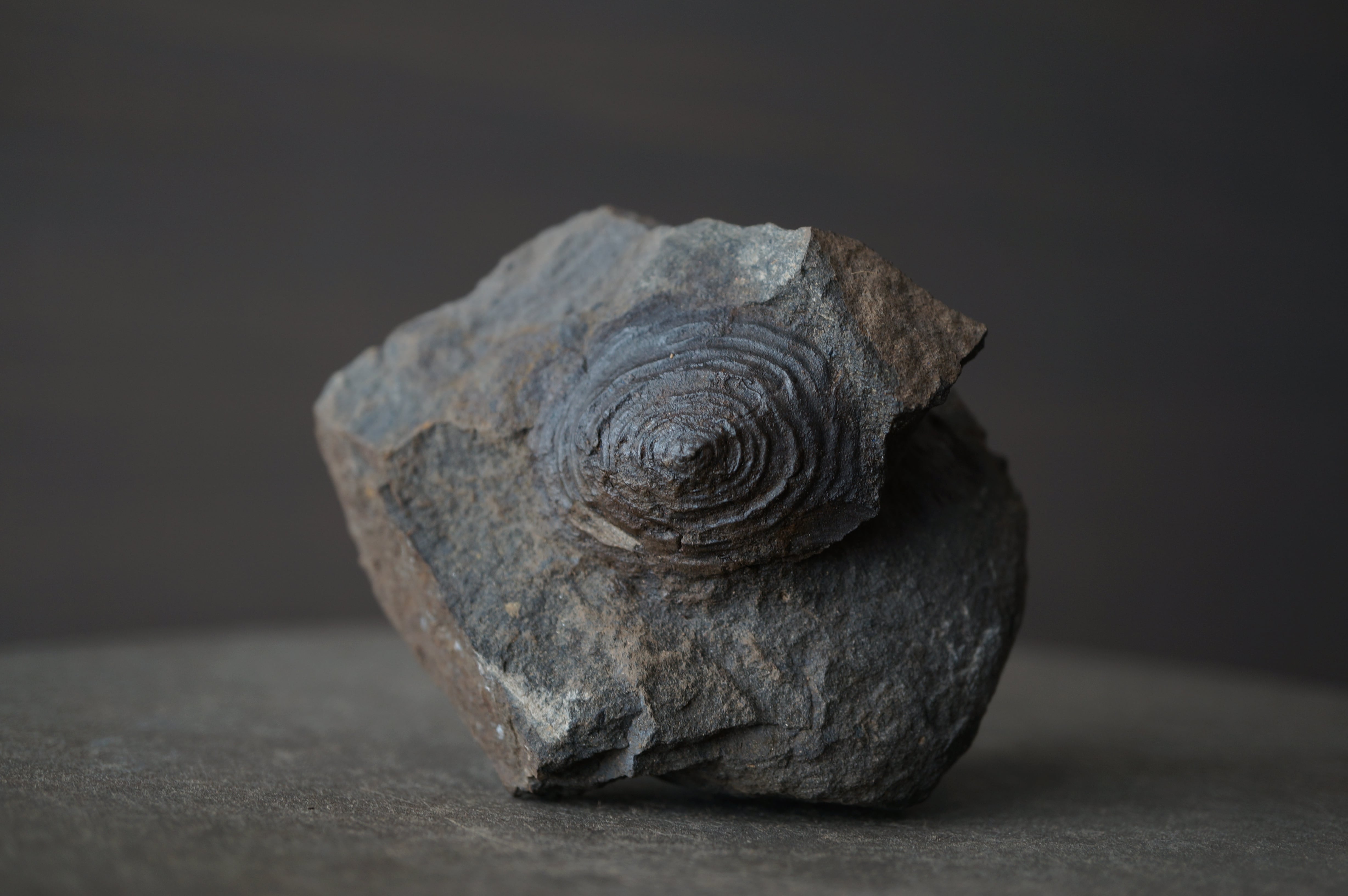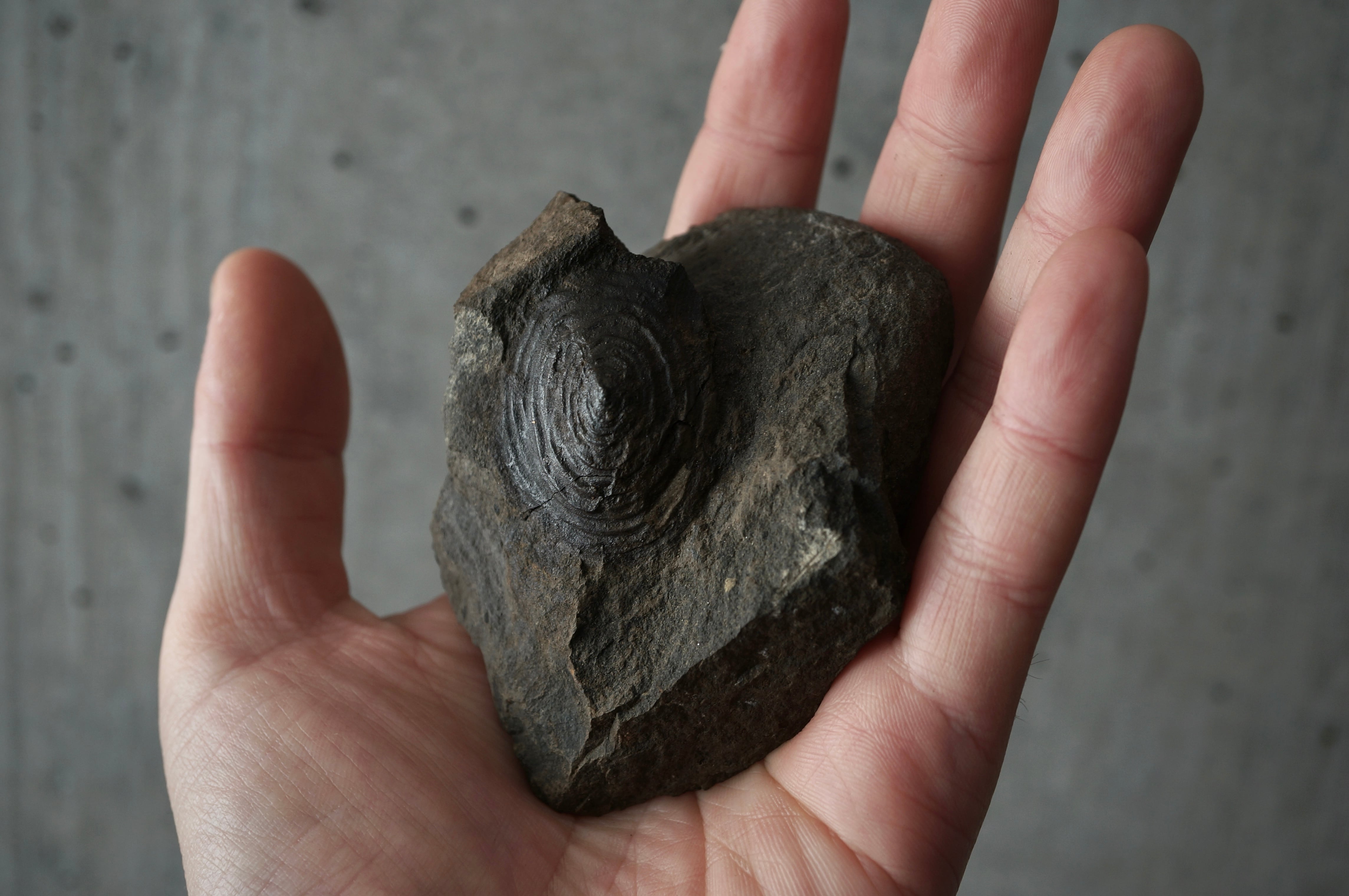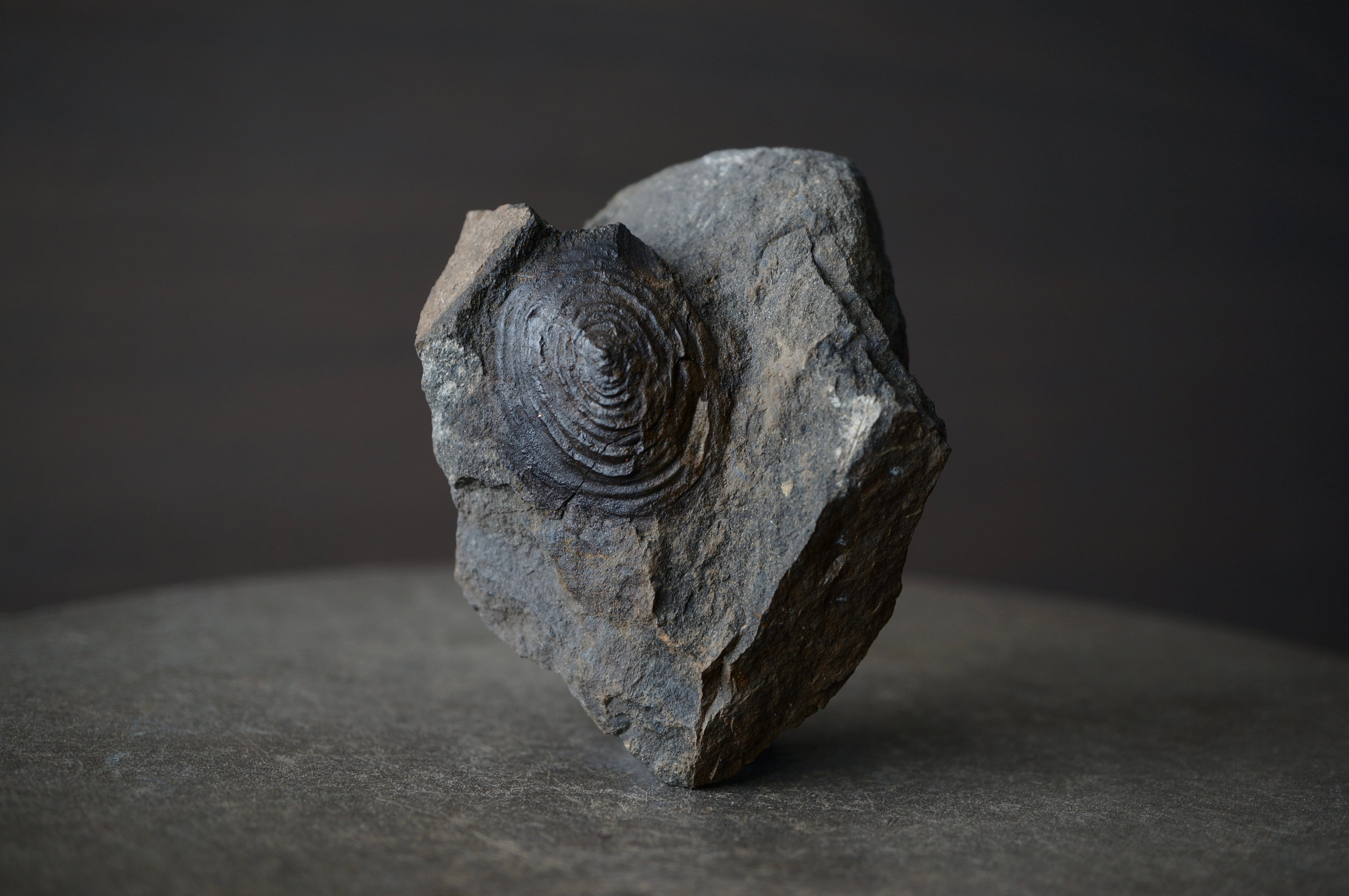 黒褐色に緻密化したその表面は、静かな艶を帯び、まるで旋盤で削り出した円盤のような均整を保っています。