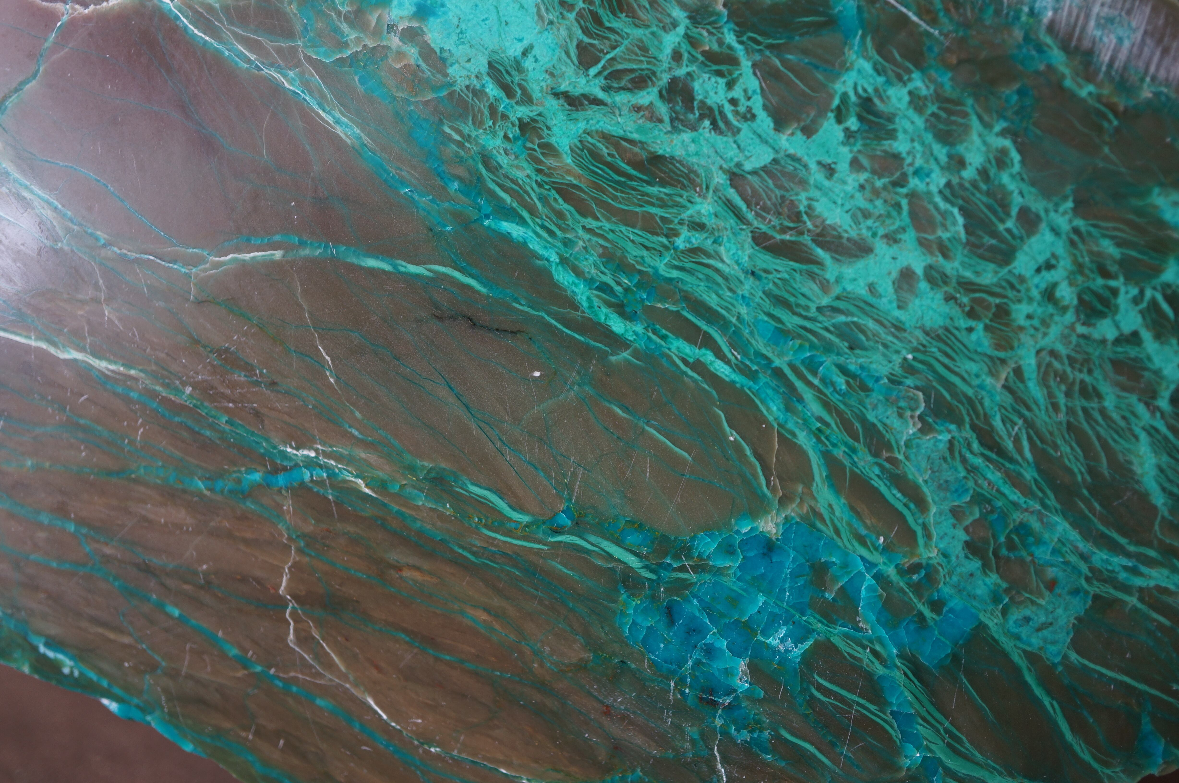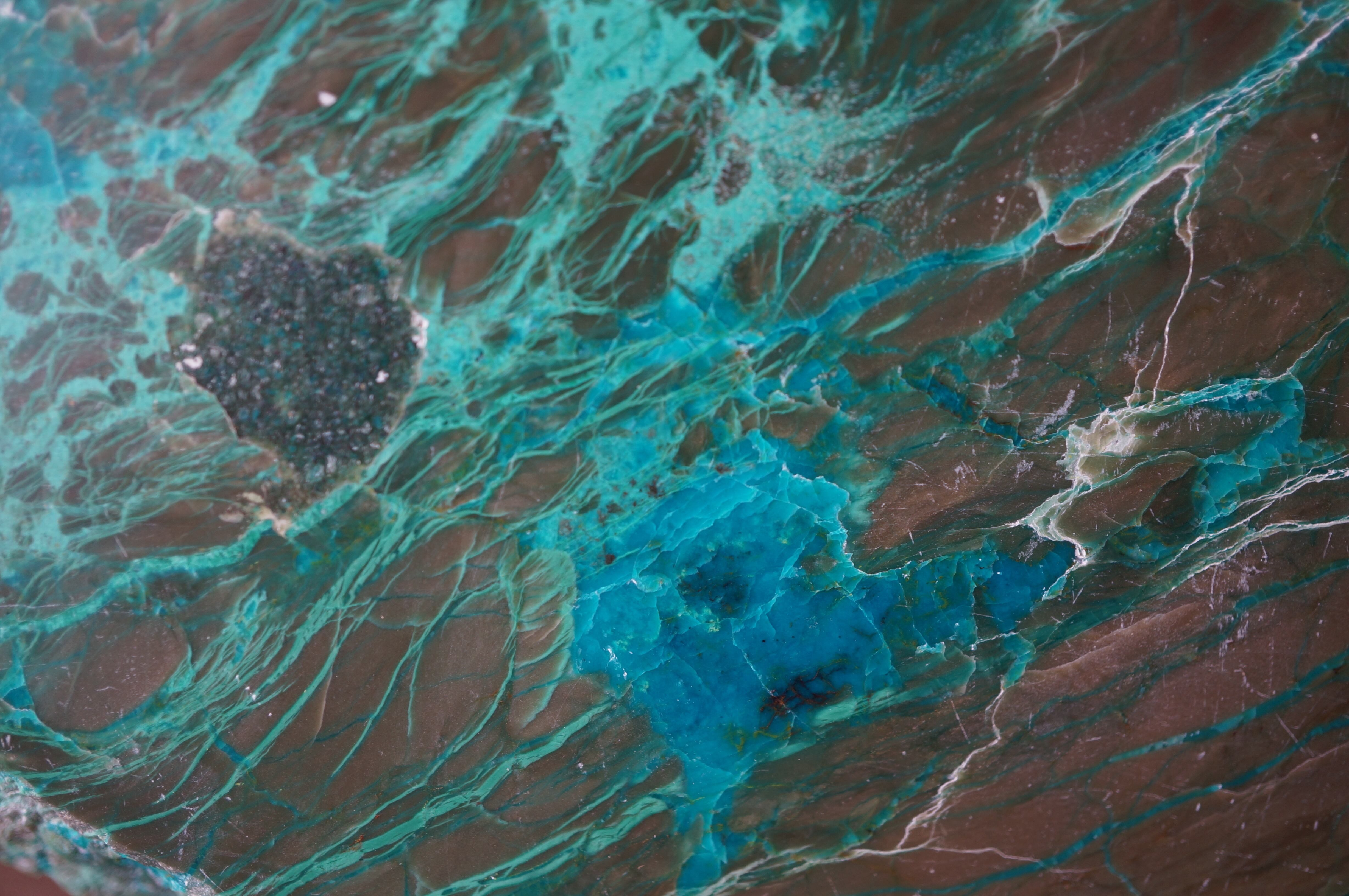 鮮烈な色彩のクリソコラ、マラカイト、キュプライト(赤銅鉱)が絵具のように美しく融和し、幻想的な風景を描いています。
