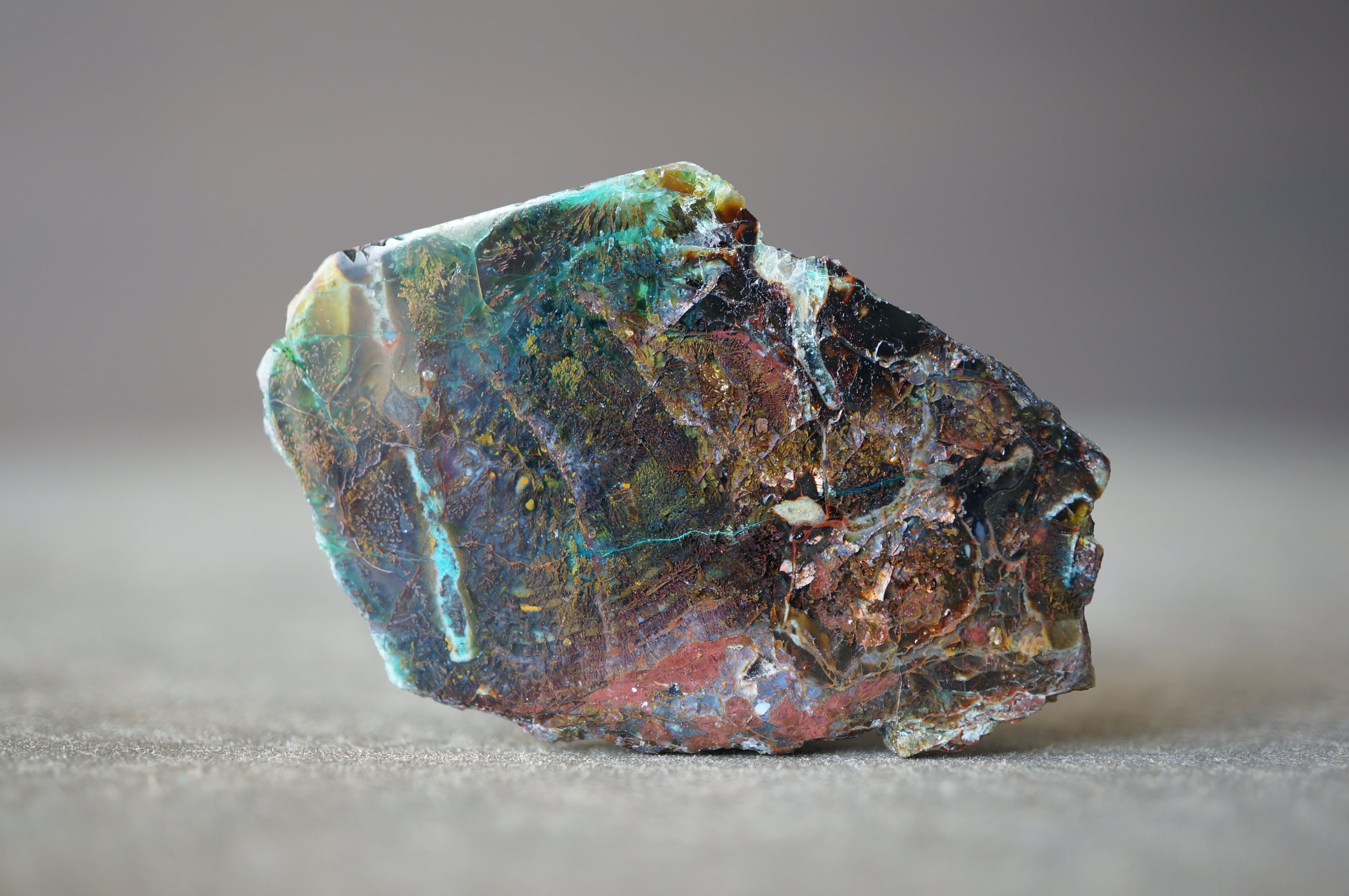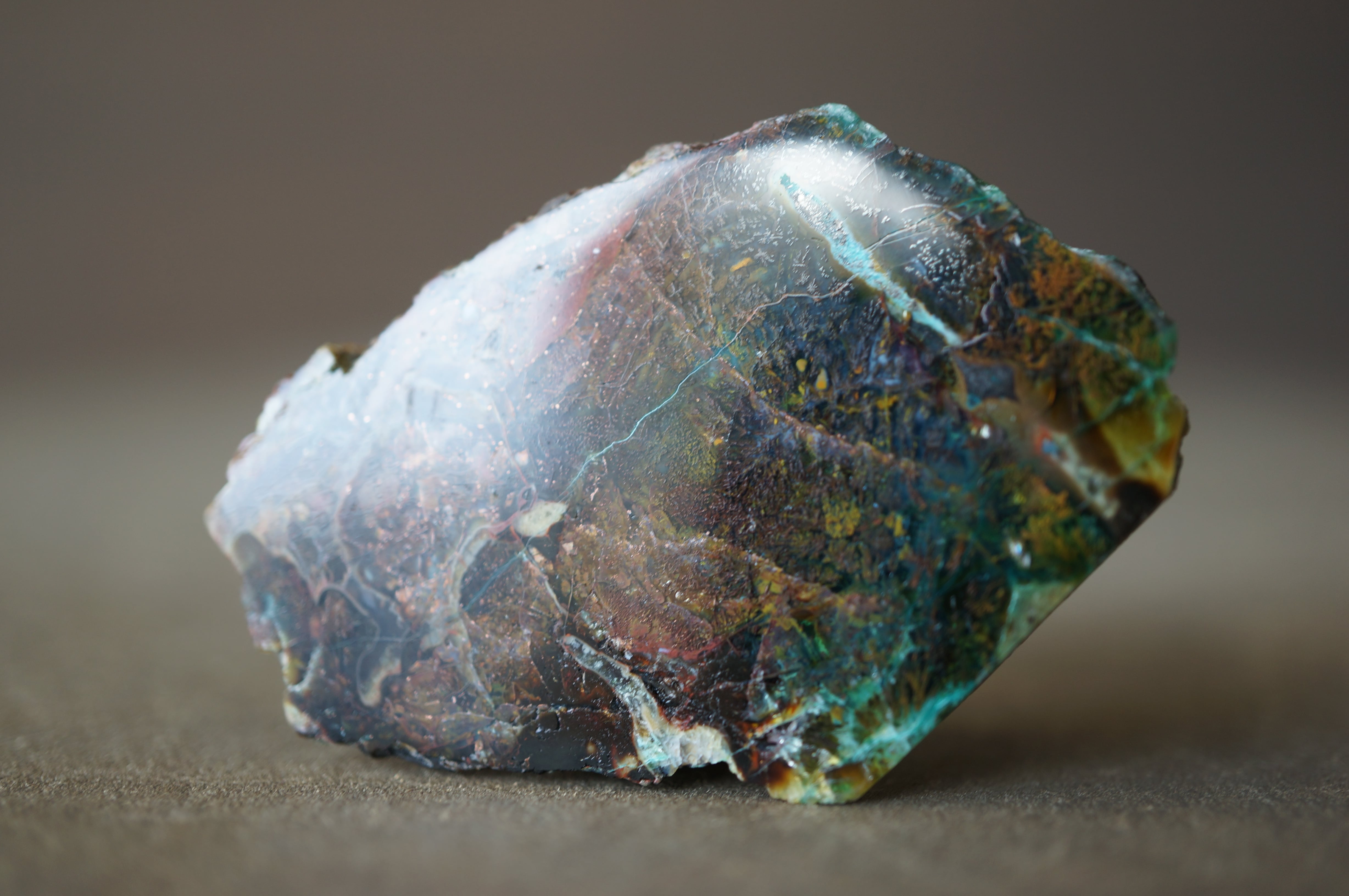 研磨された表面には、深い湖を覗くような奥行きのある色彩と、きらびやかな金属光沢が混在し、他の鉱物では得られない独特の視覚効果を見せています。