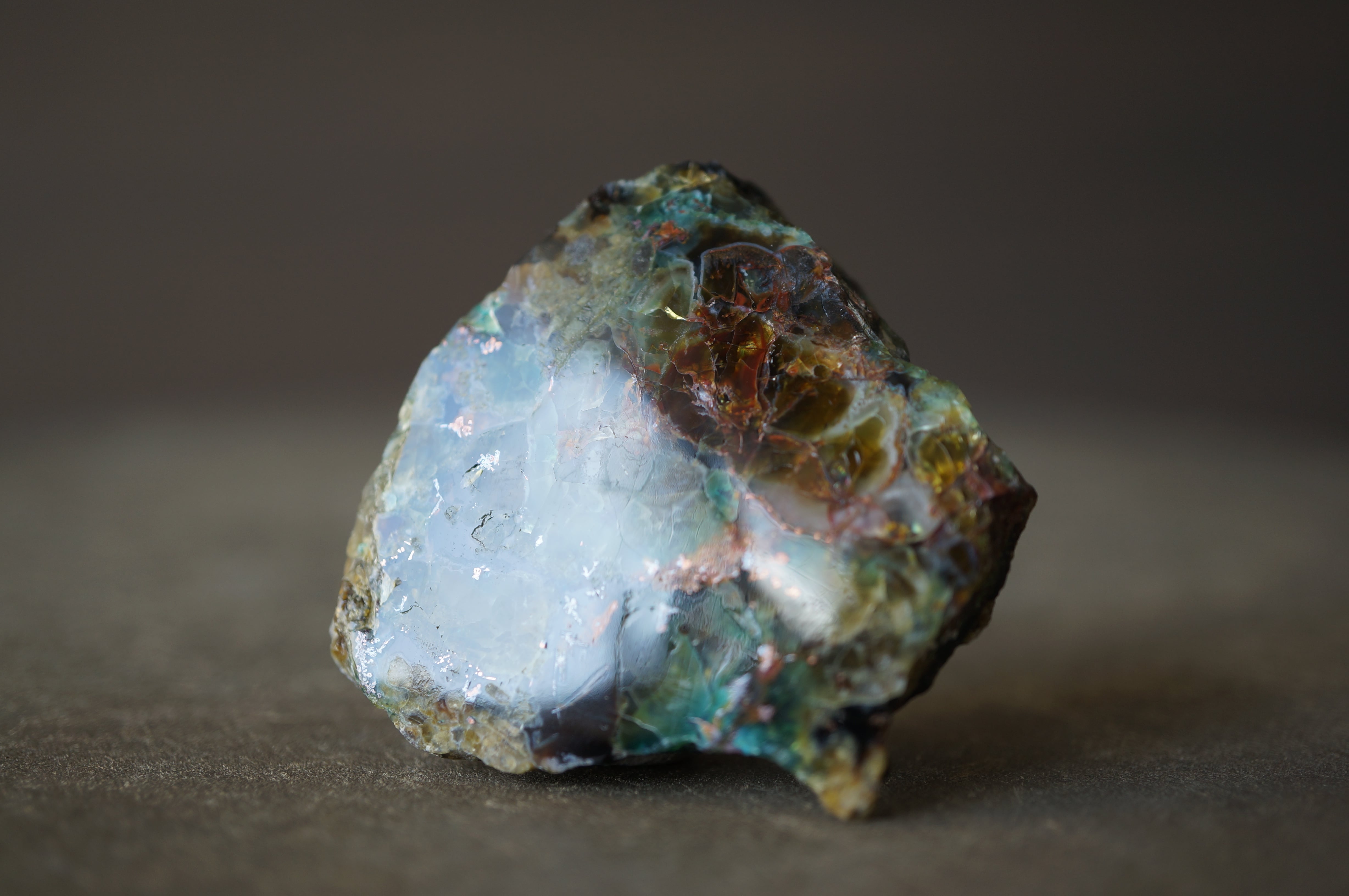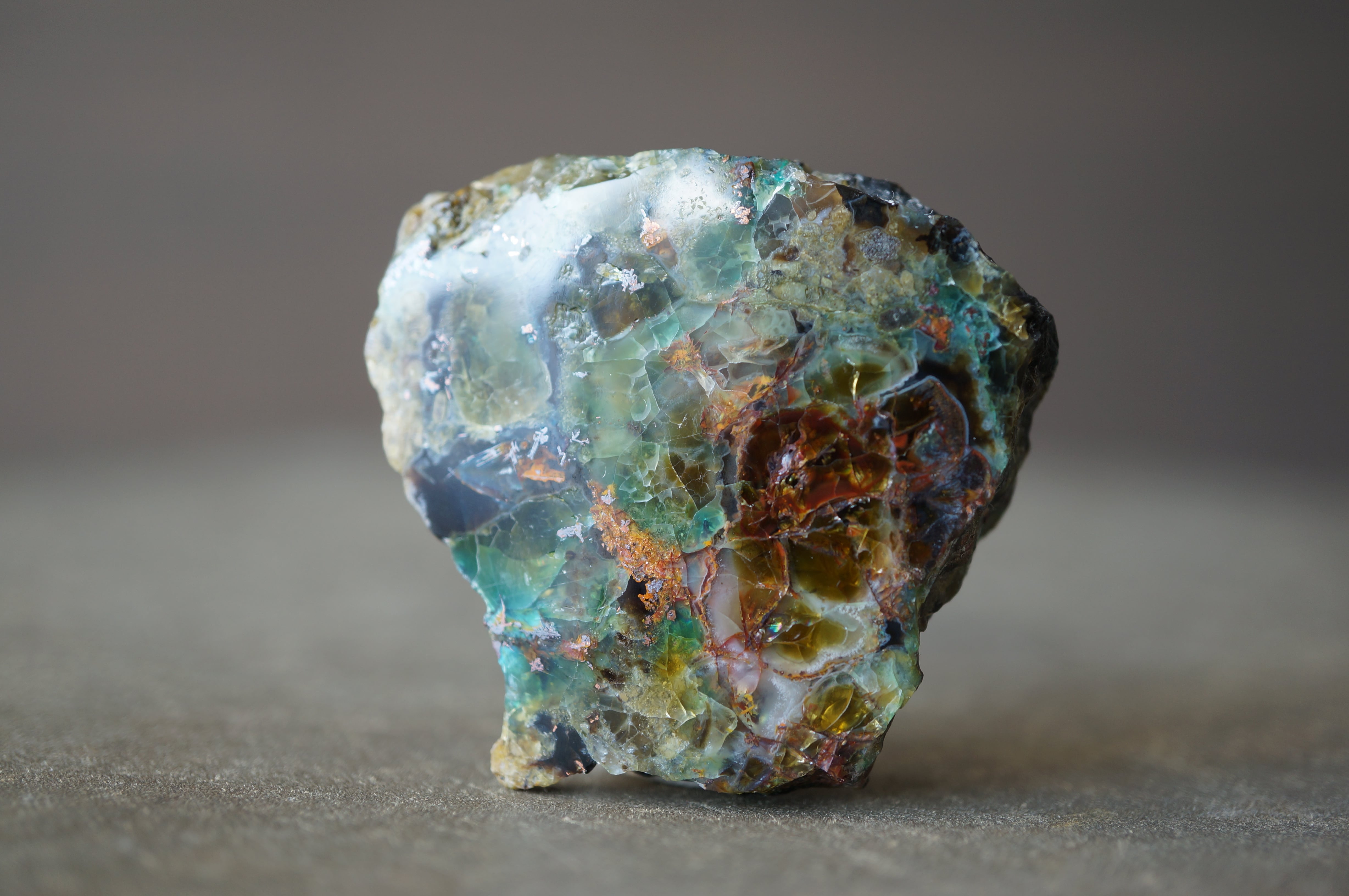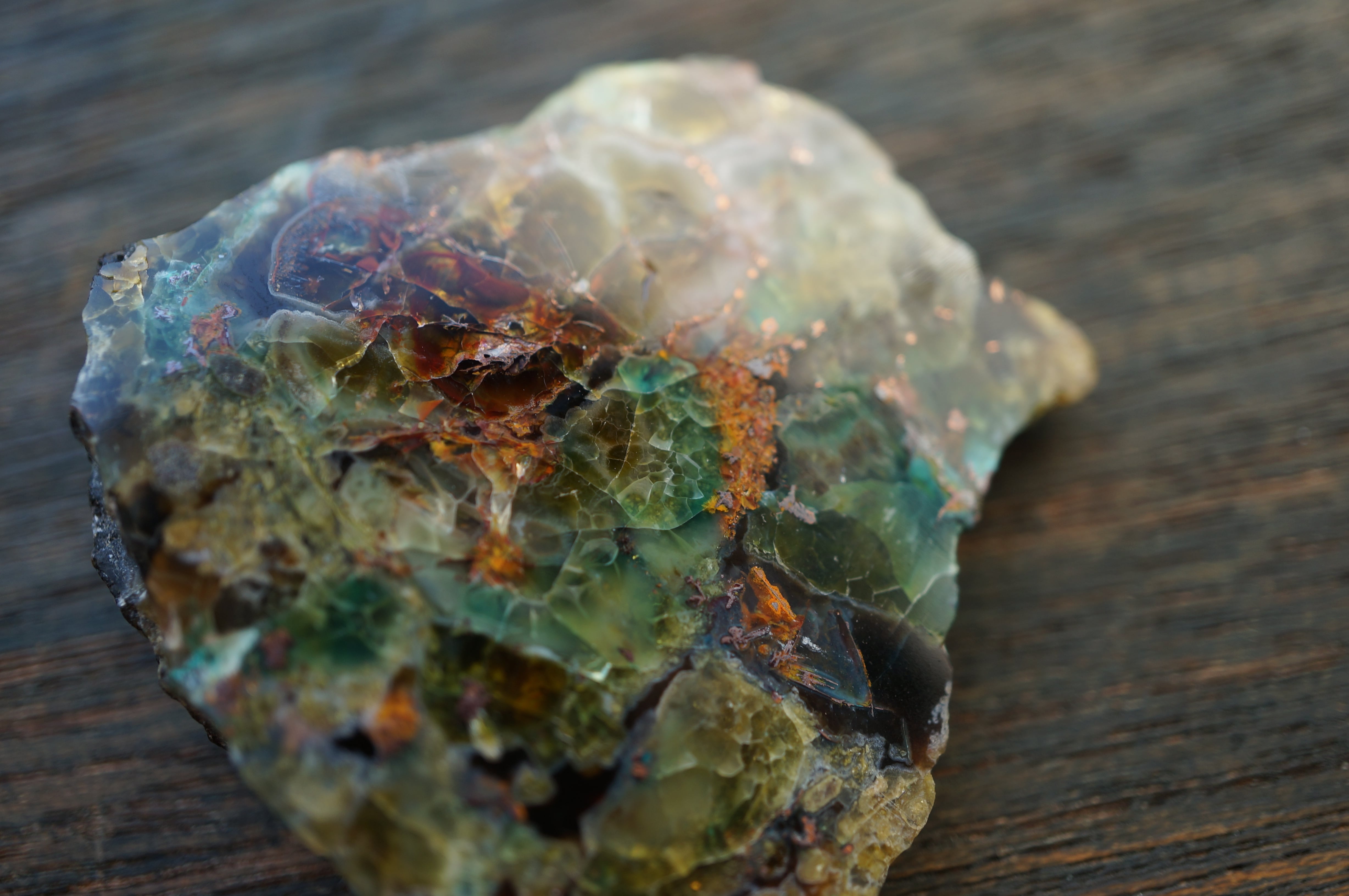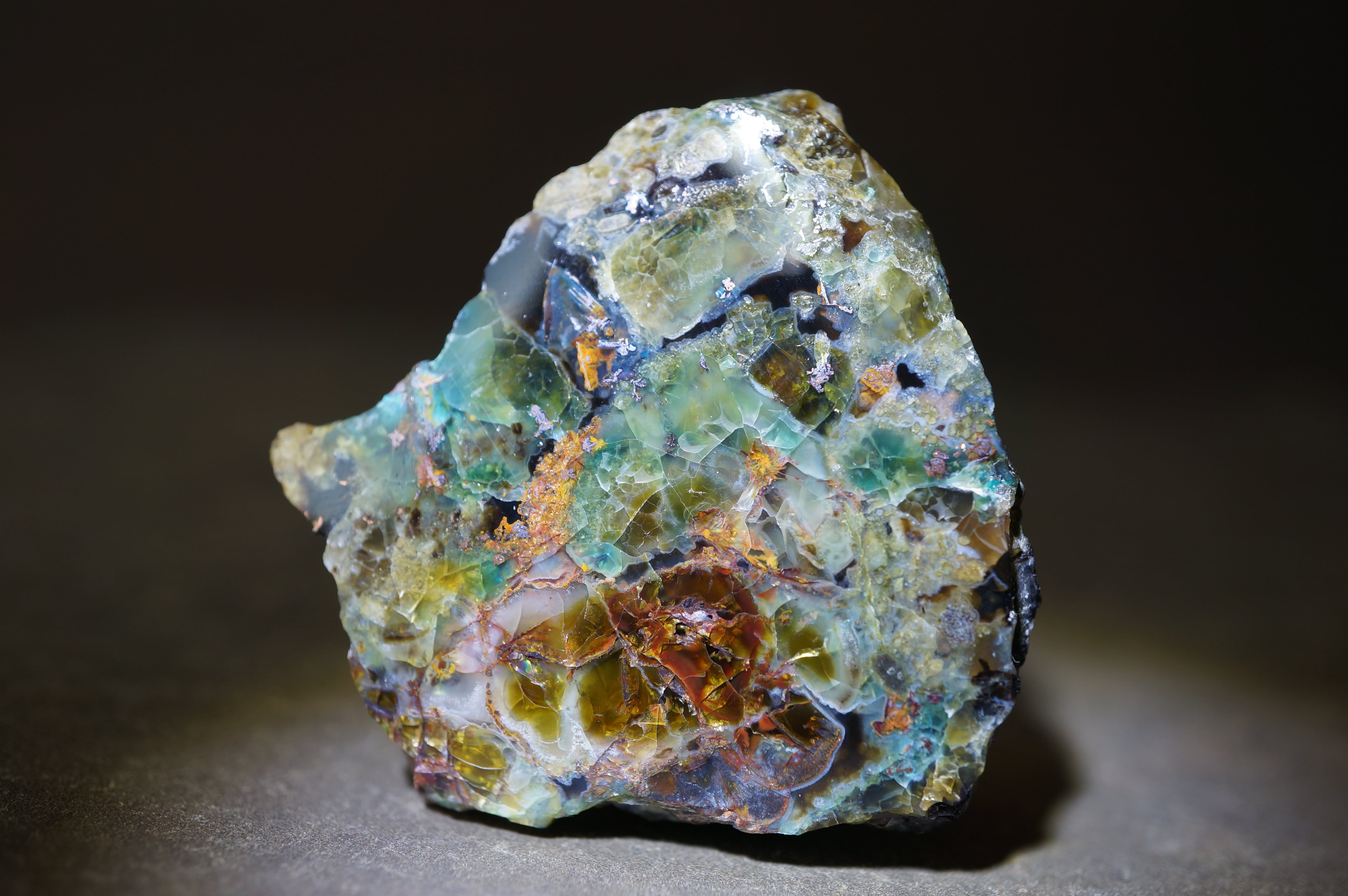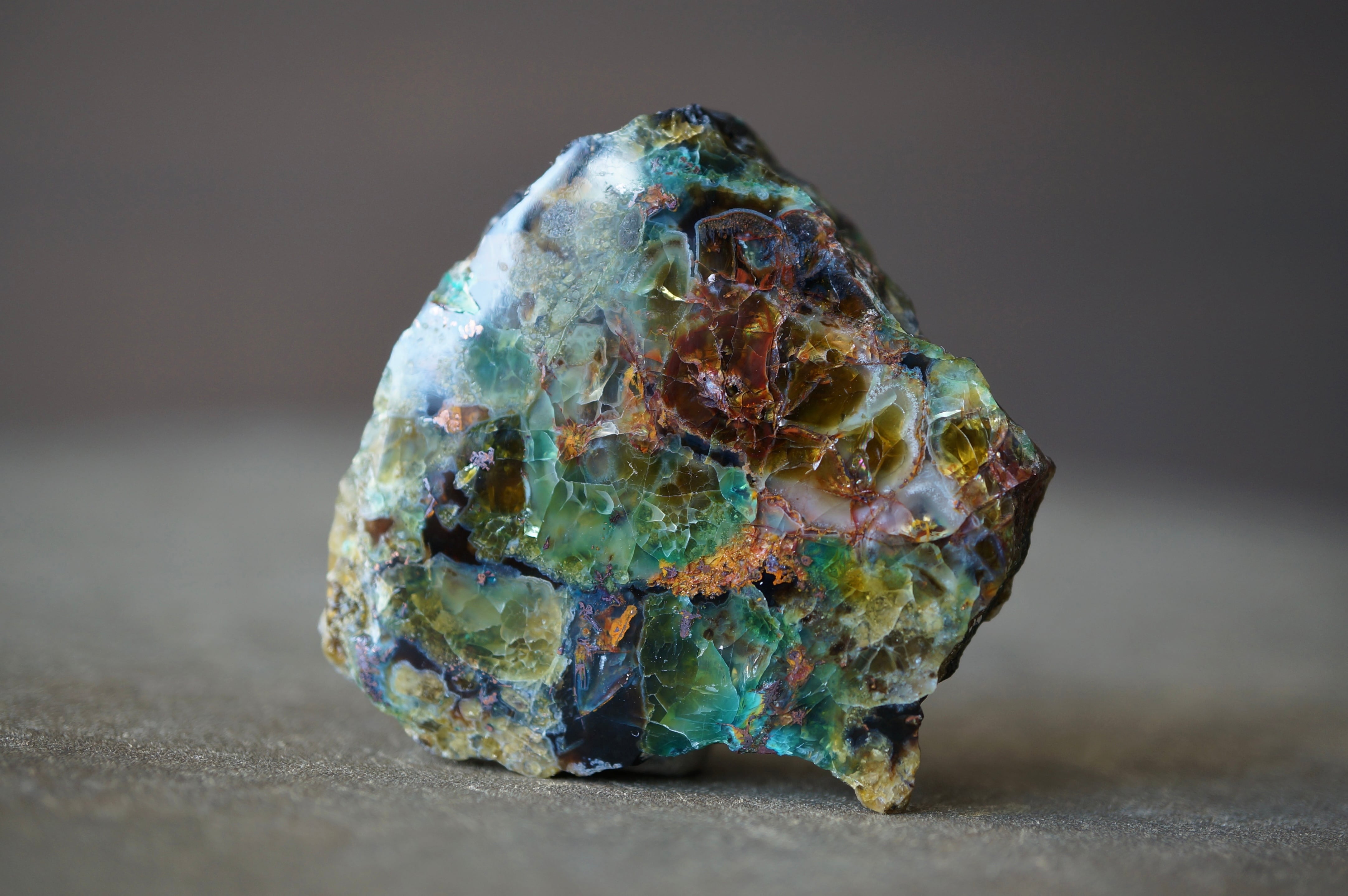 研磨された表面には、深い湖を覗くような奥行きのある色彩と、きらびやかな金属光沢が混在し、他の鉱物では得られない独特の視覚効果を見せています。