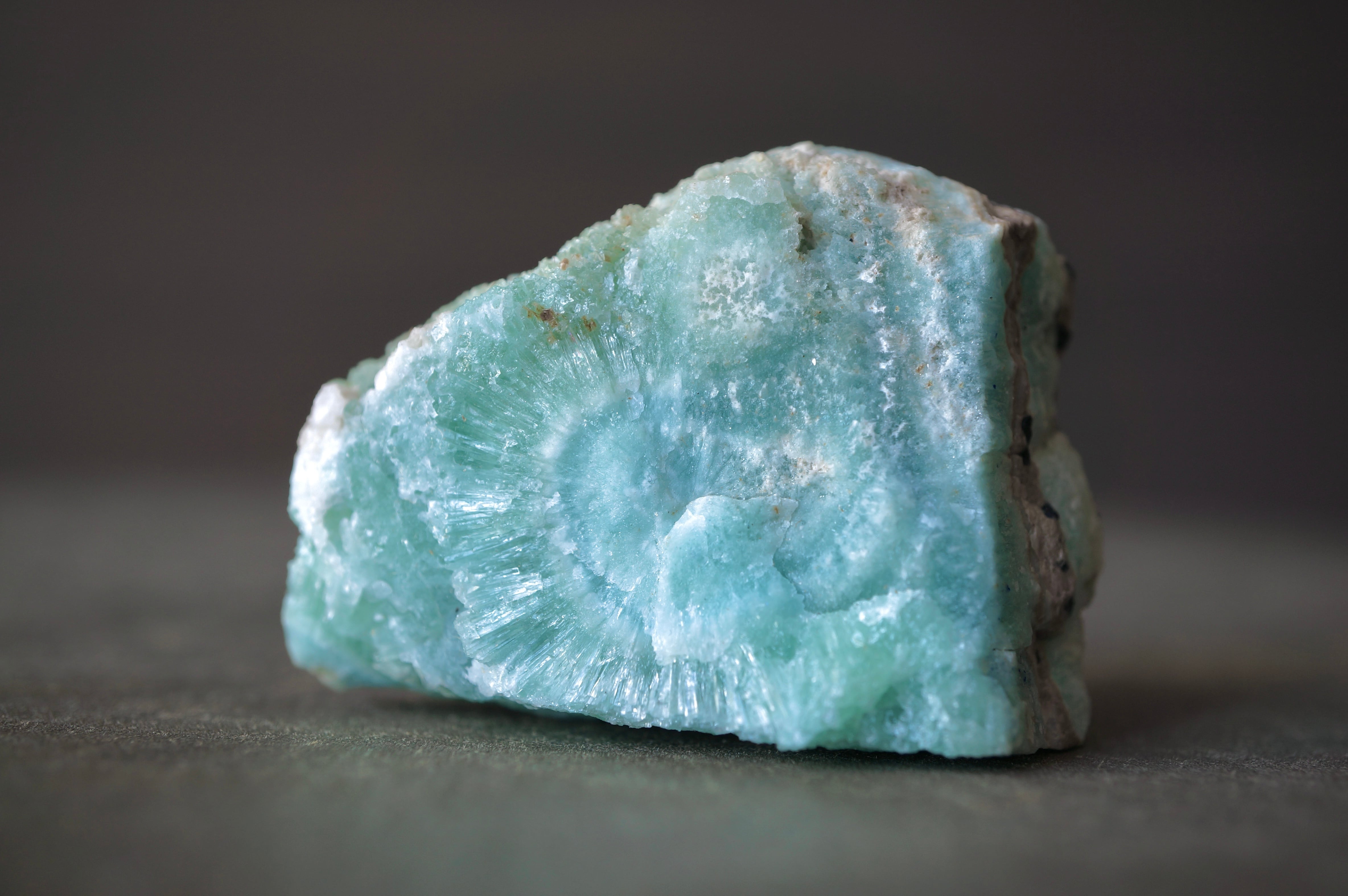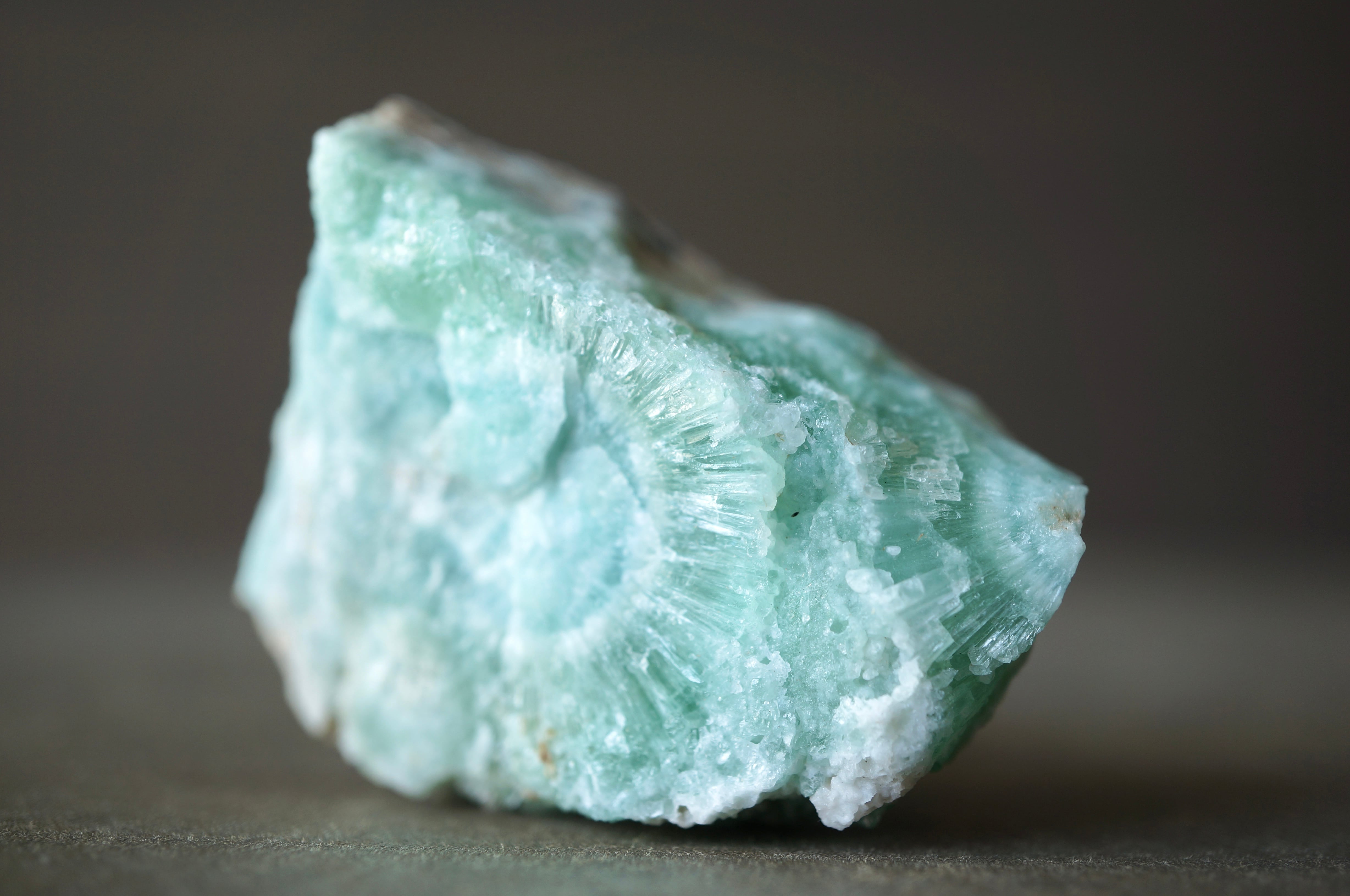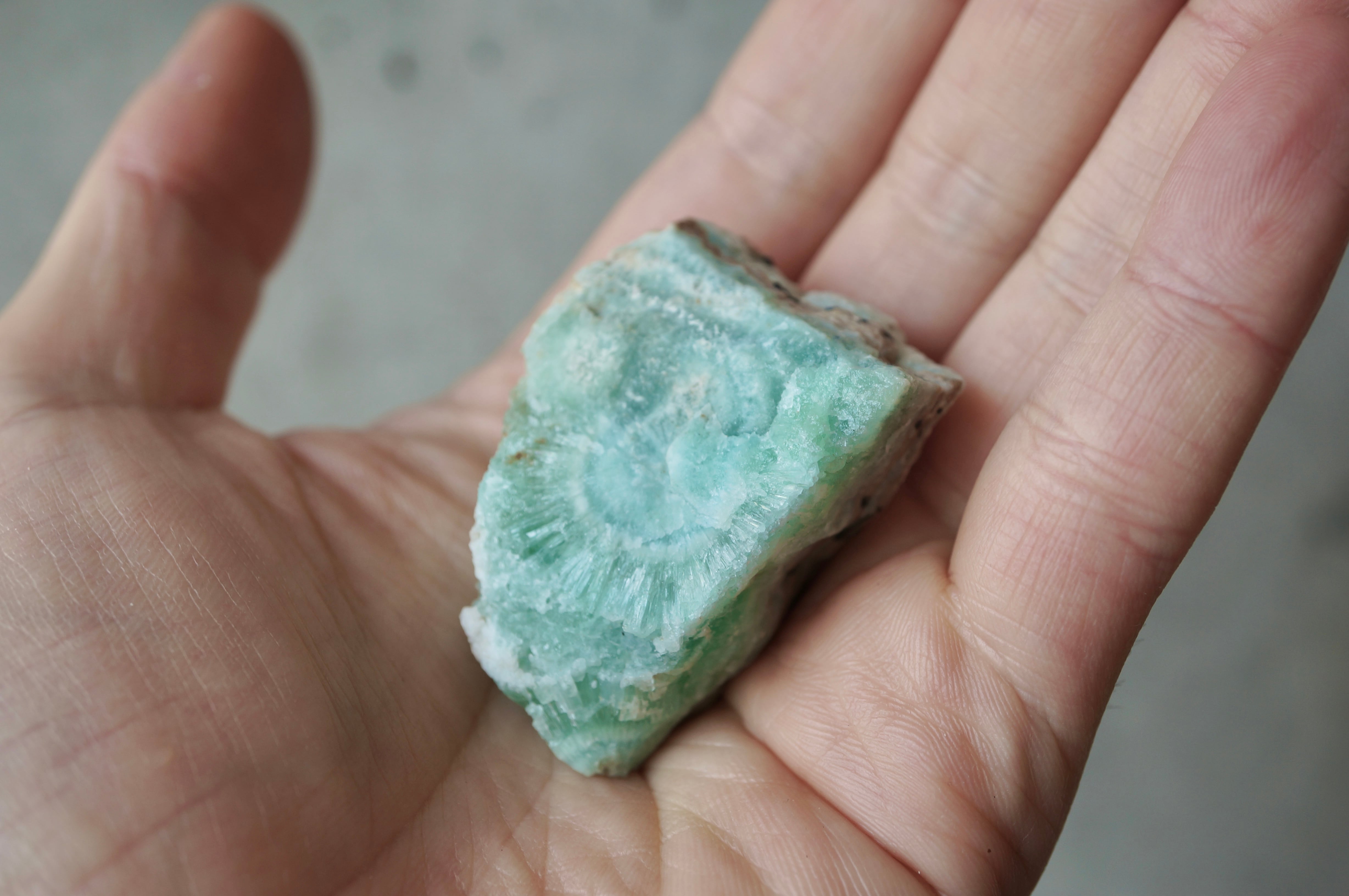ブルーアラゴナイトのやわらかな淡青緑の発色は、銅イオンを含むことで生じるとされ、青磁を思わせるような静謐な色彩が全体を包みます。