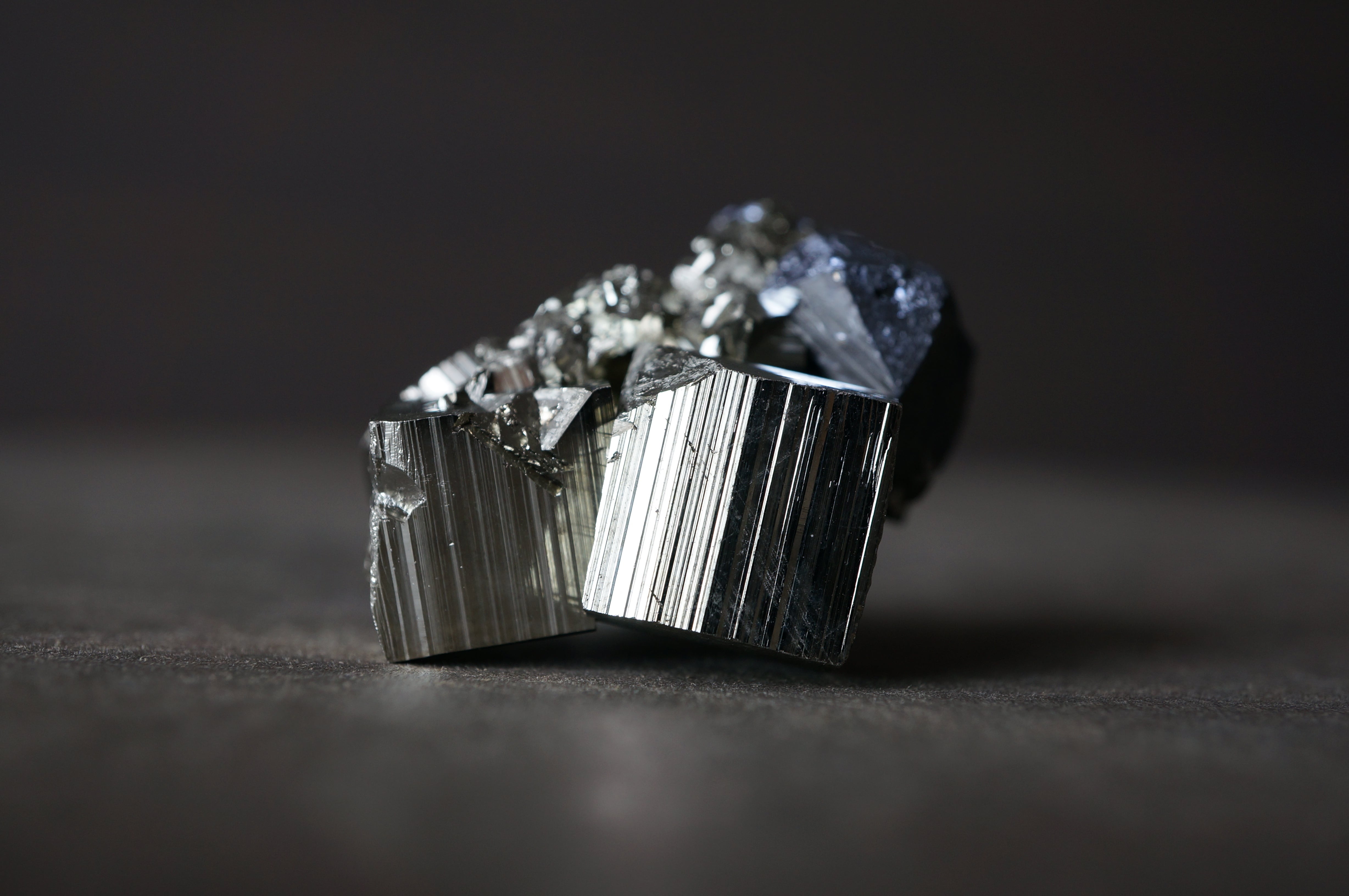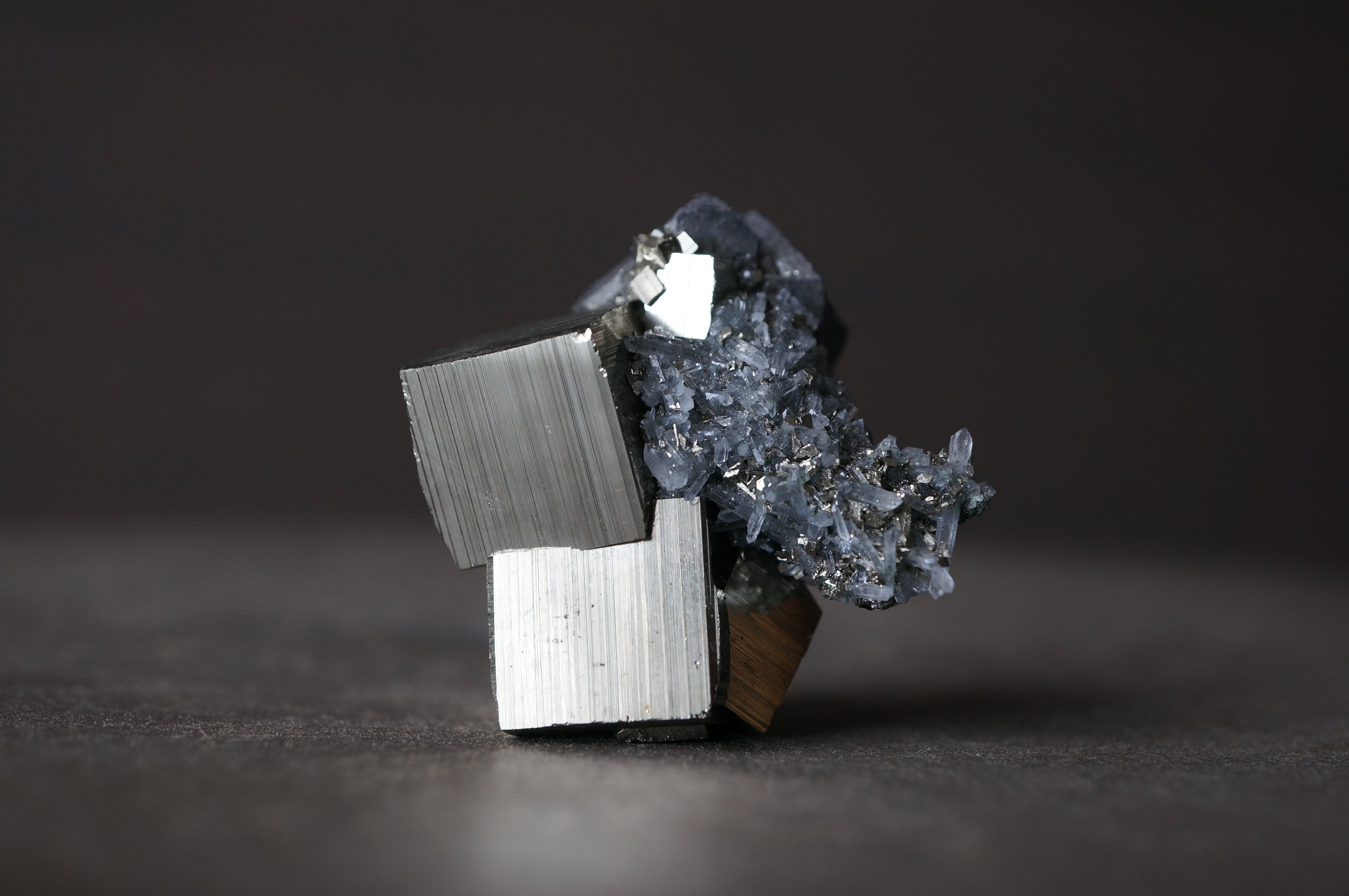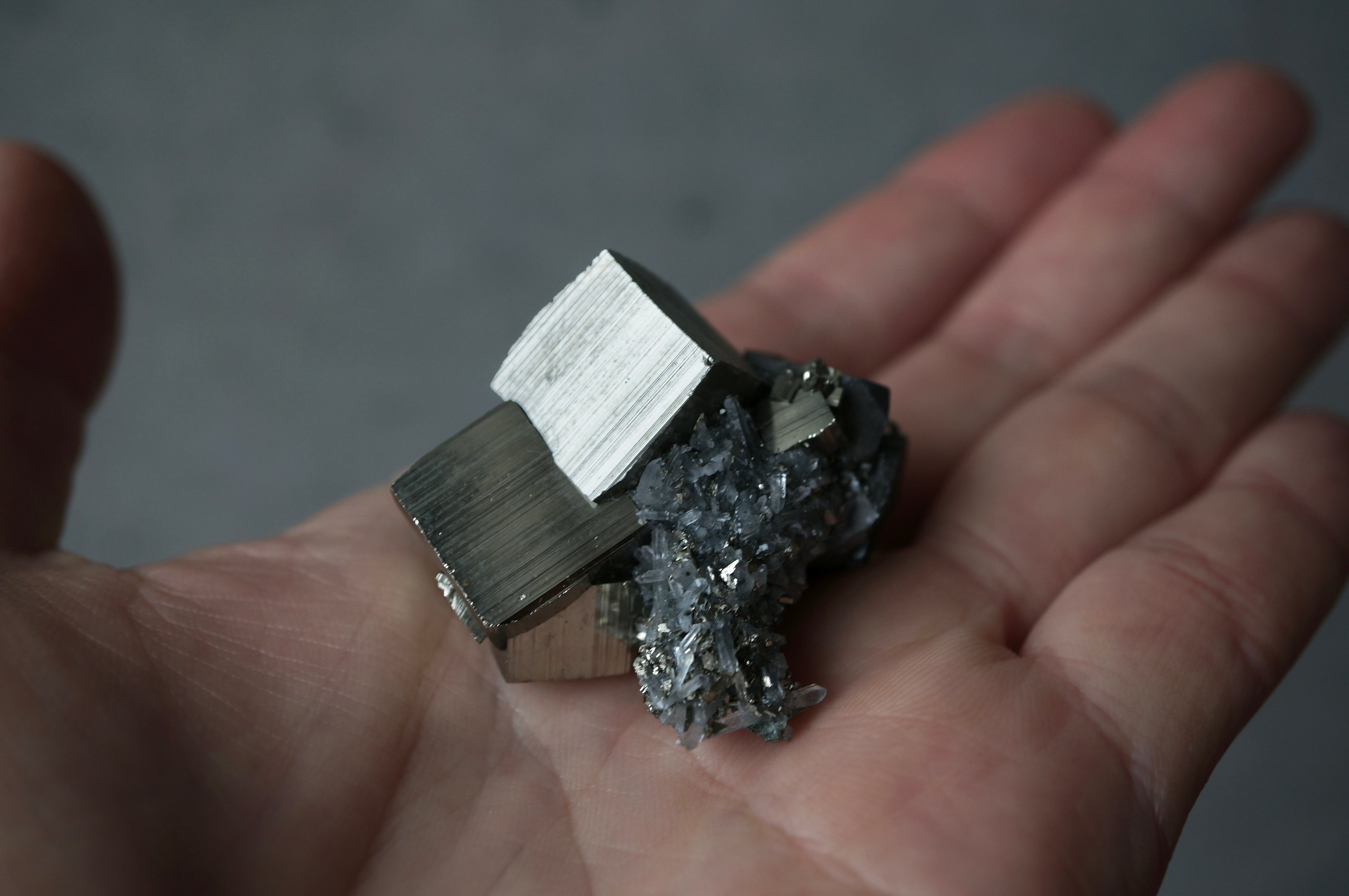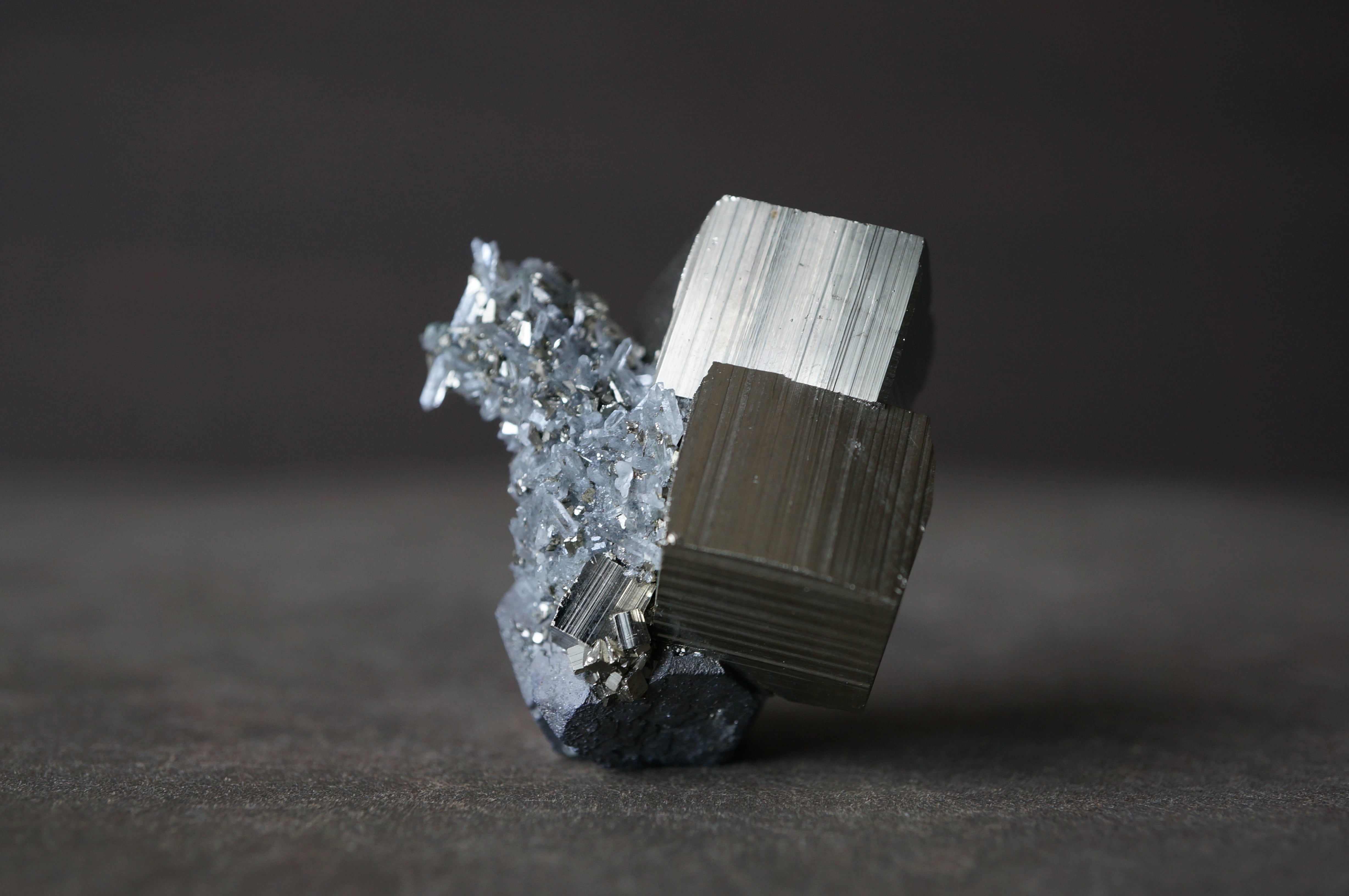 直線的なパイライトが噛み合うように連なり、全体はまるで金属彫刻や建築模型を俯瞰したような構造を見せています。
