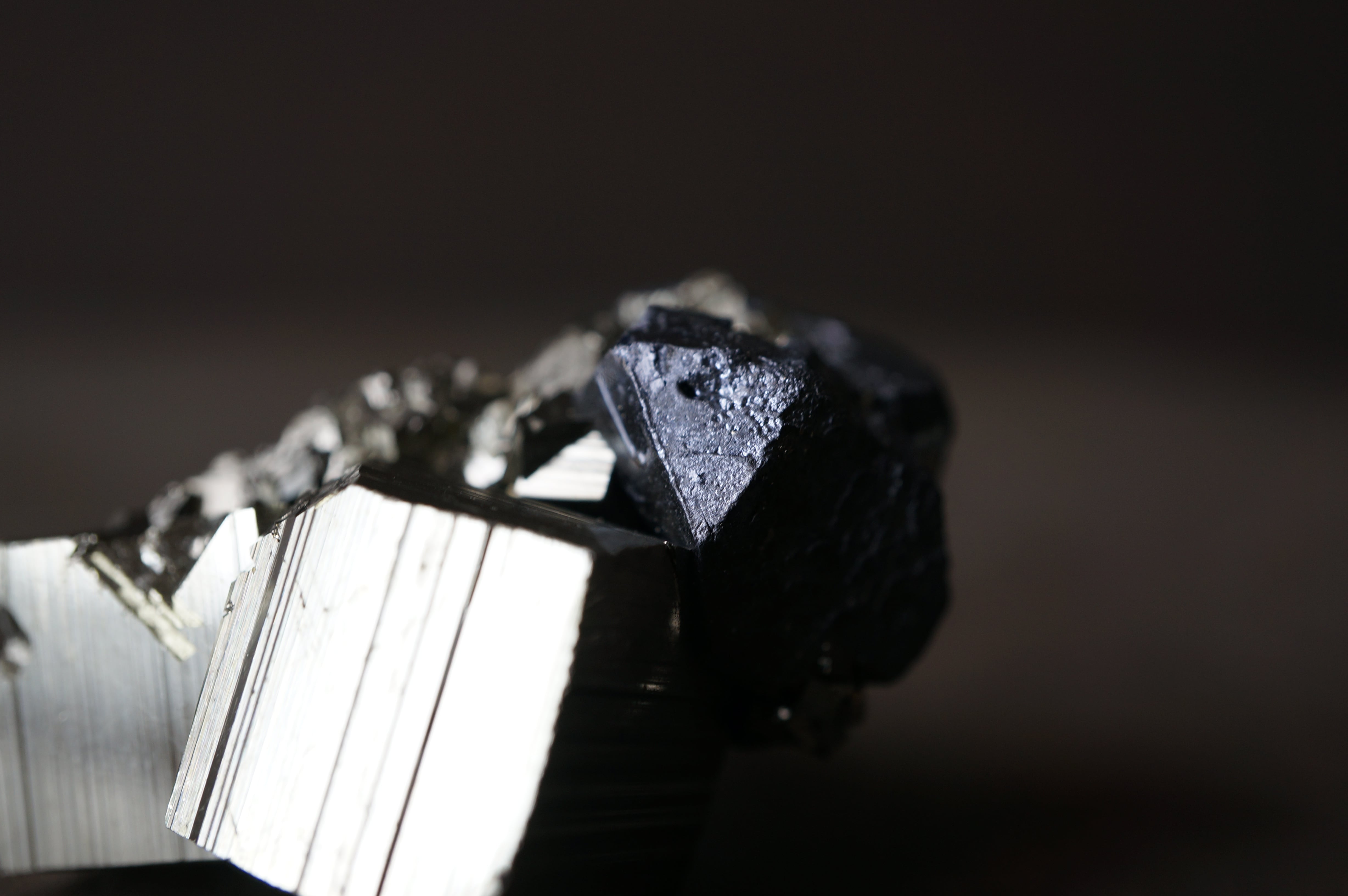 共生した水晶が静かな煌めきを添え、非常にシャープで洗練された雰囲気を醸した一石です。