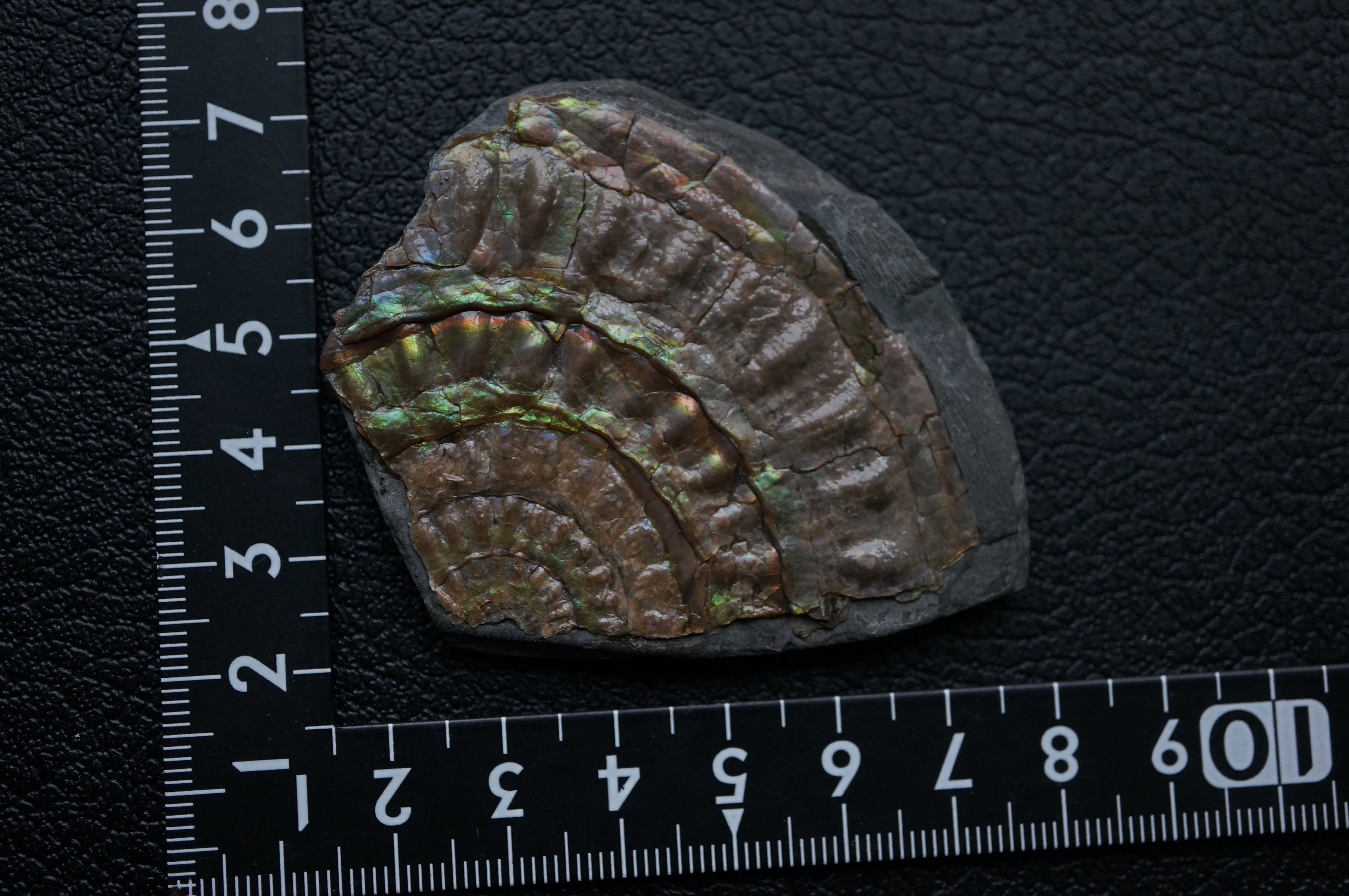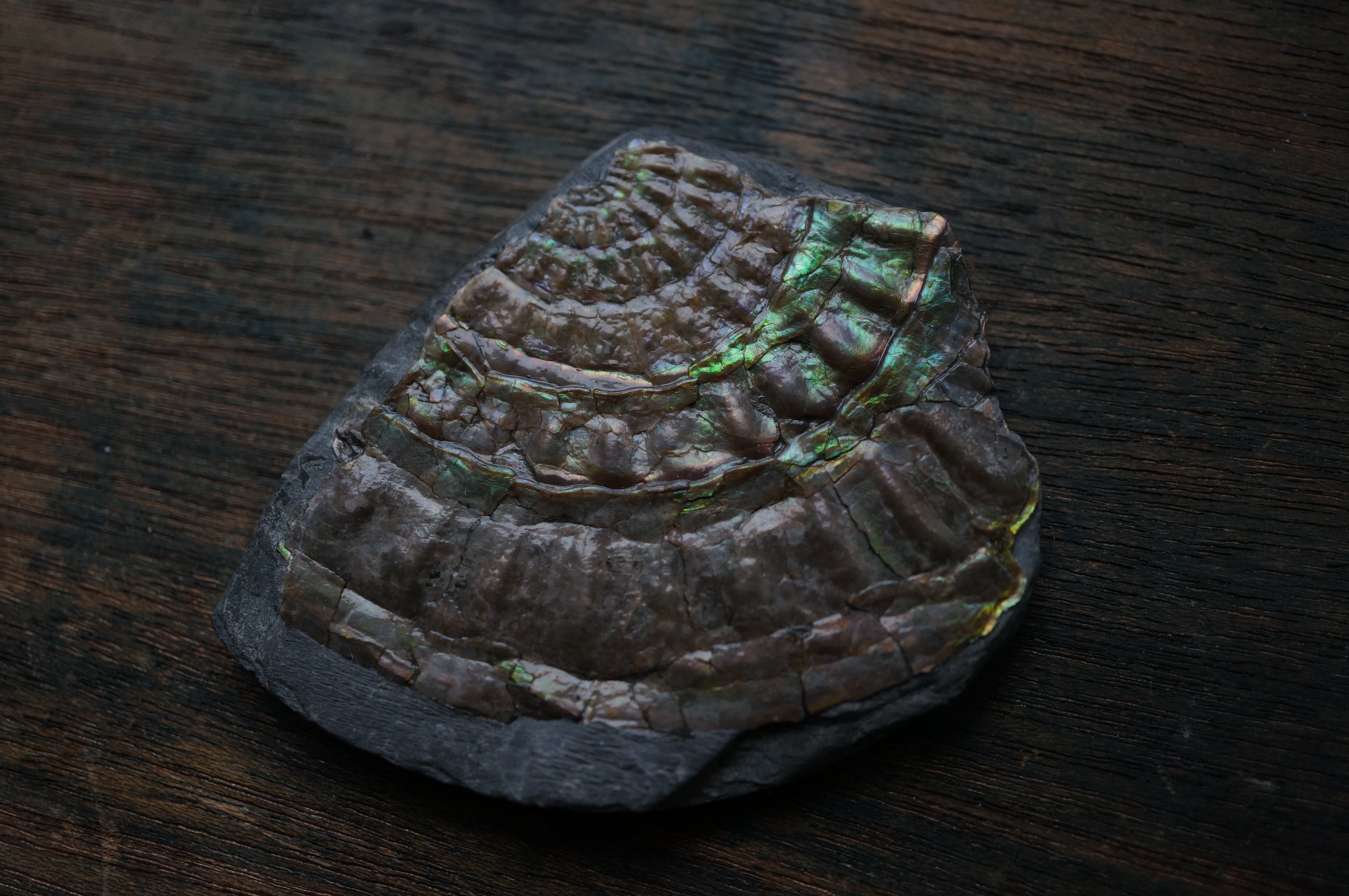 カナダ・アルバータ州産のアンモライトが広く知られていますが、イングランド産でも条件が整えばこのように虹色の干渉色が生じる例があります。