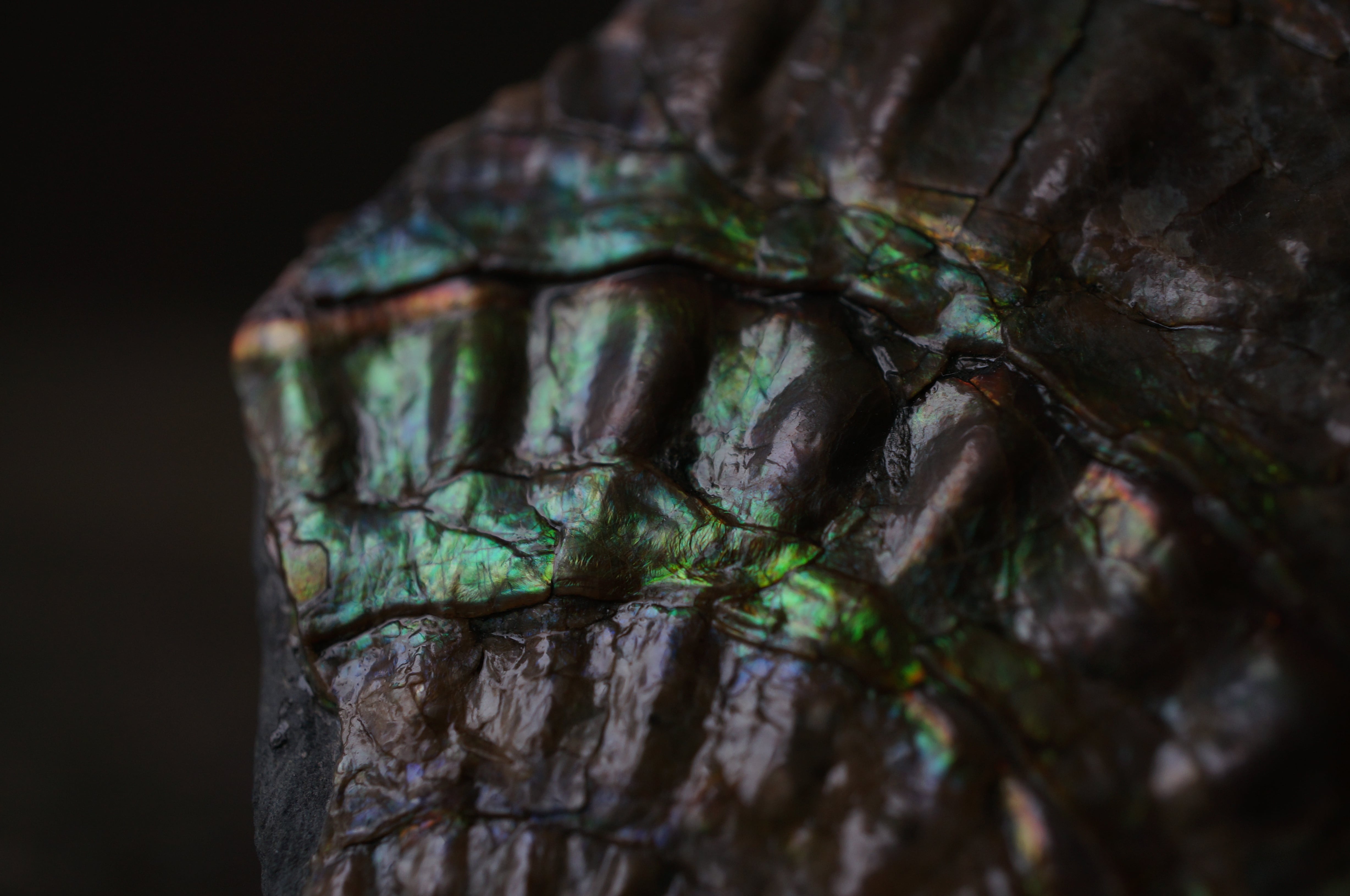 アンモナイトの遊色は殻のアラゴナイト層が微細な層状構造を保ったまま鉱化した場合に現れます。