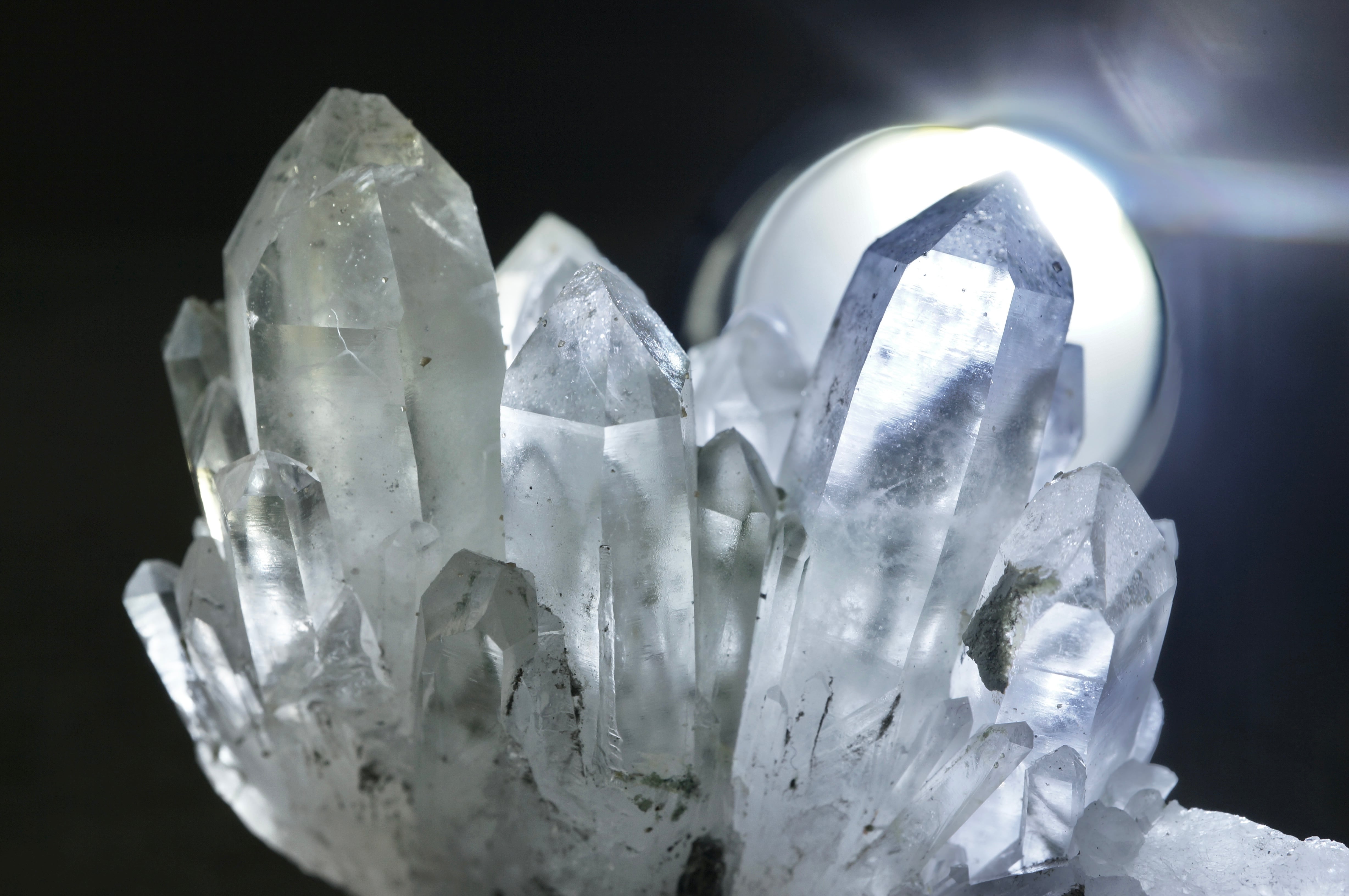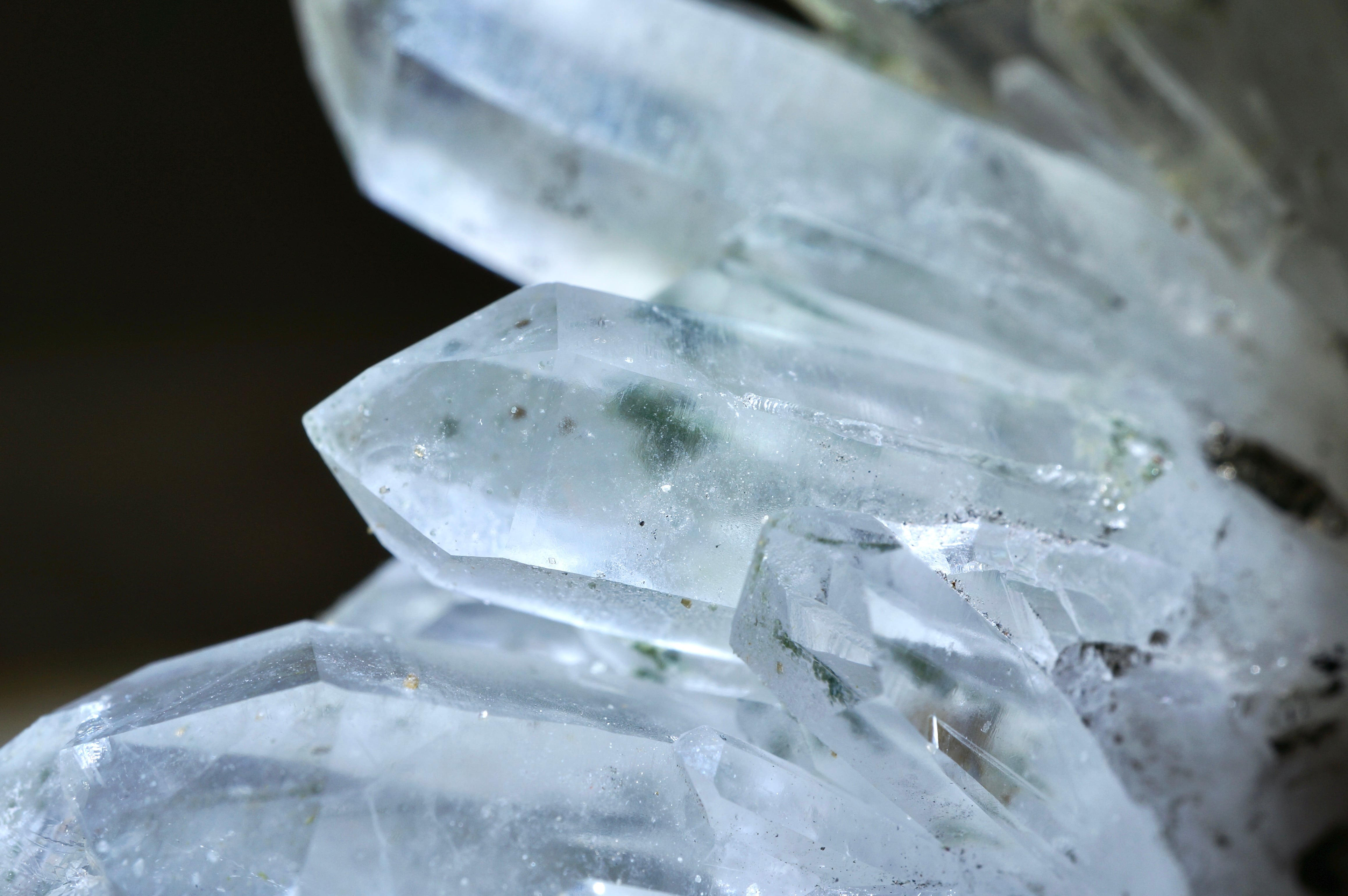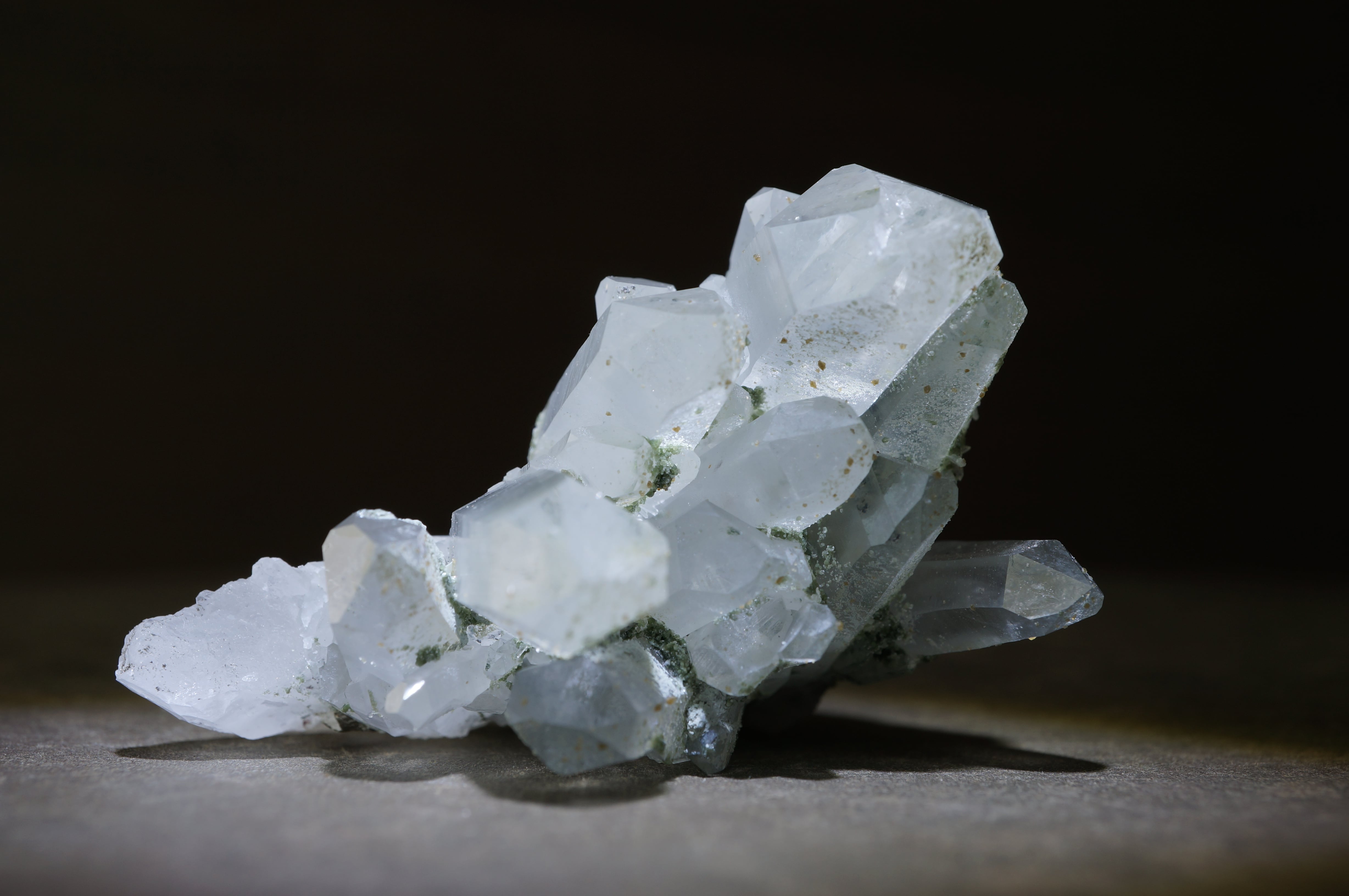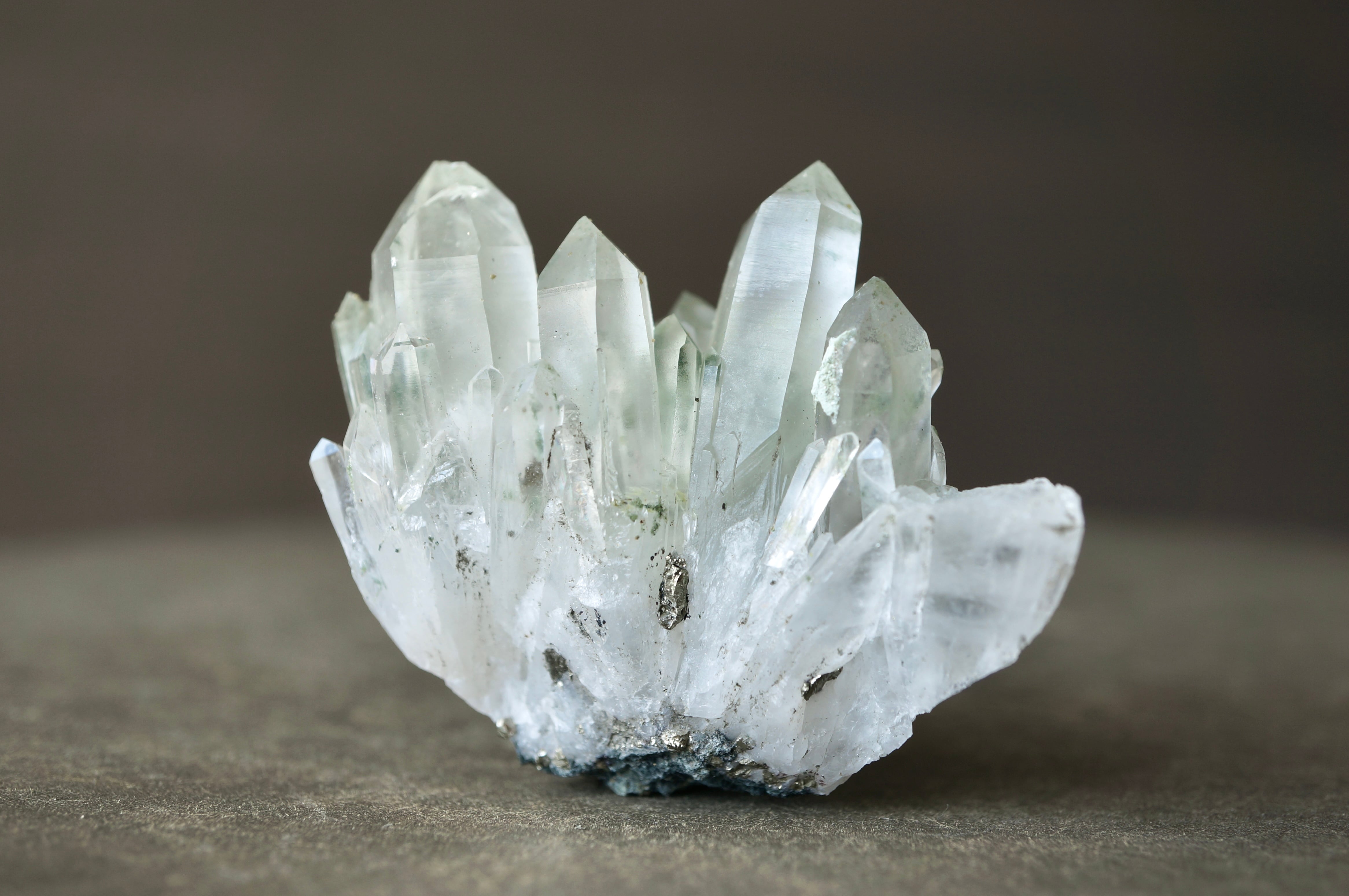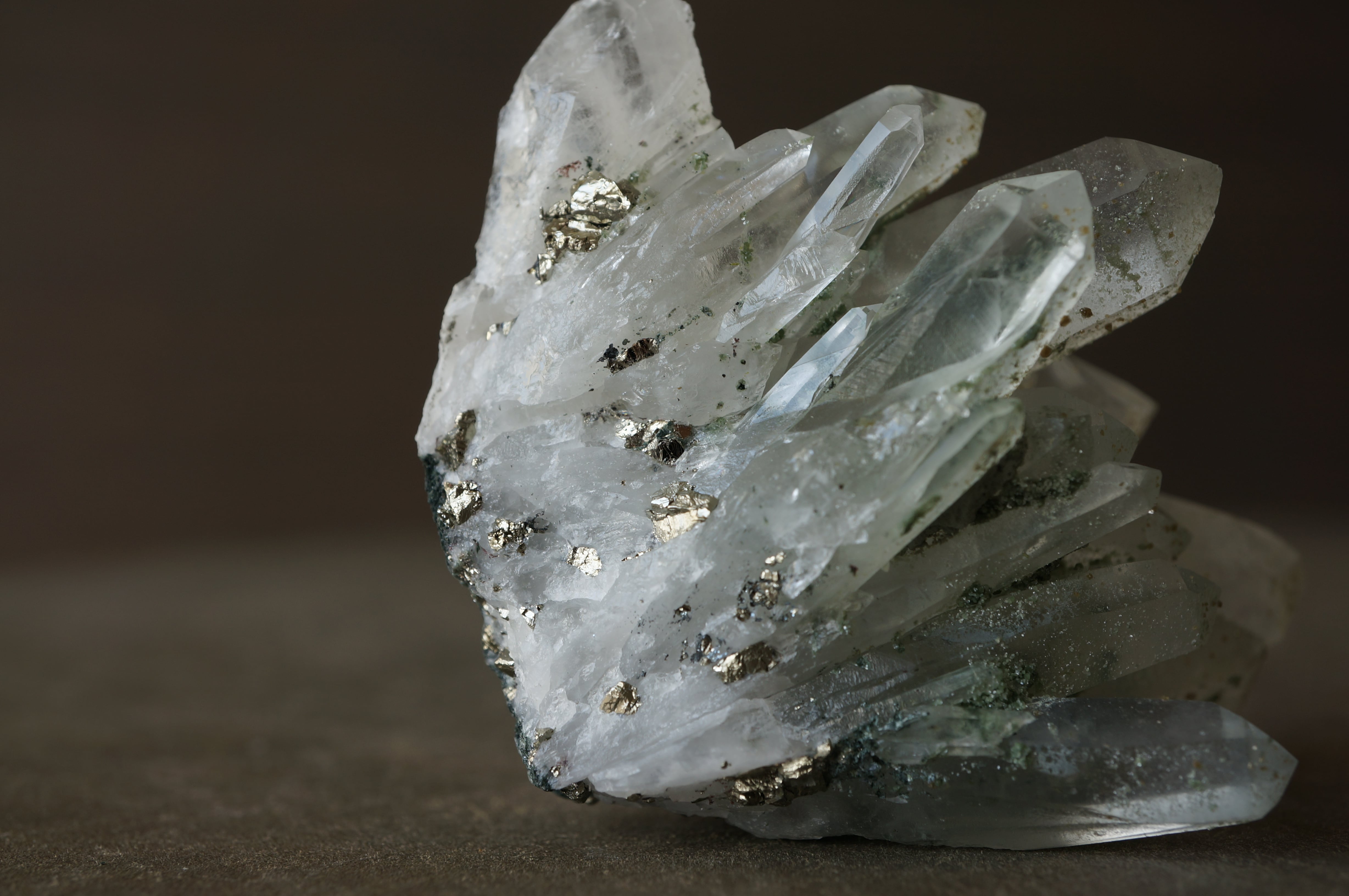 群生する透明なクォーツ上に銀色のパイライト、薄緑色のクローライトが共生しています。