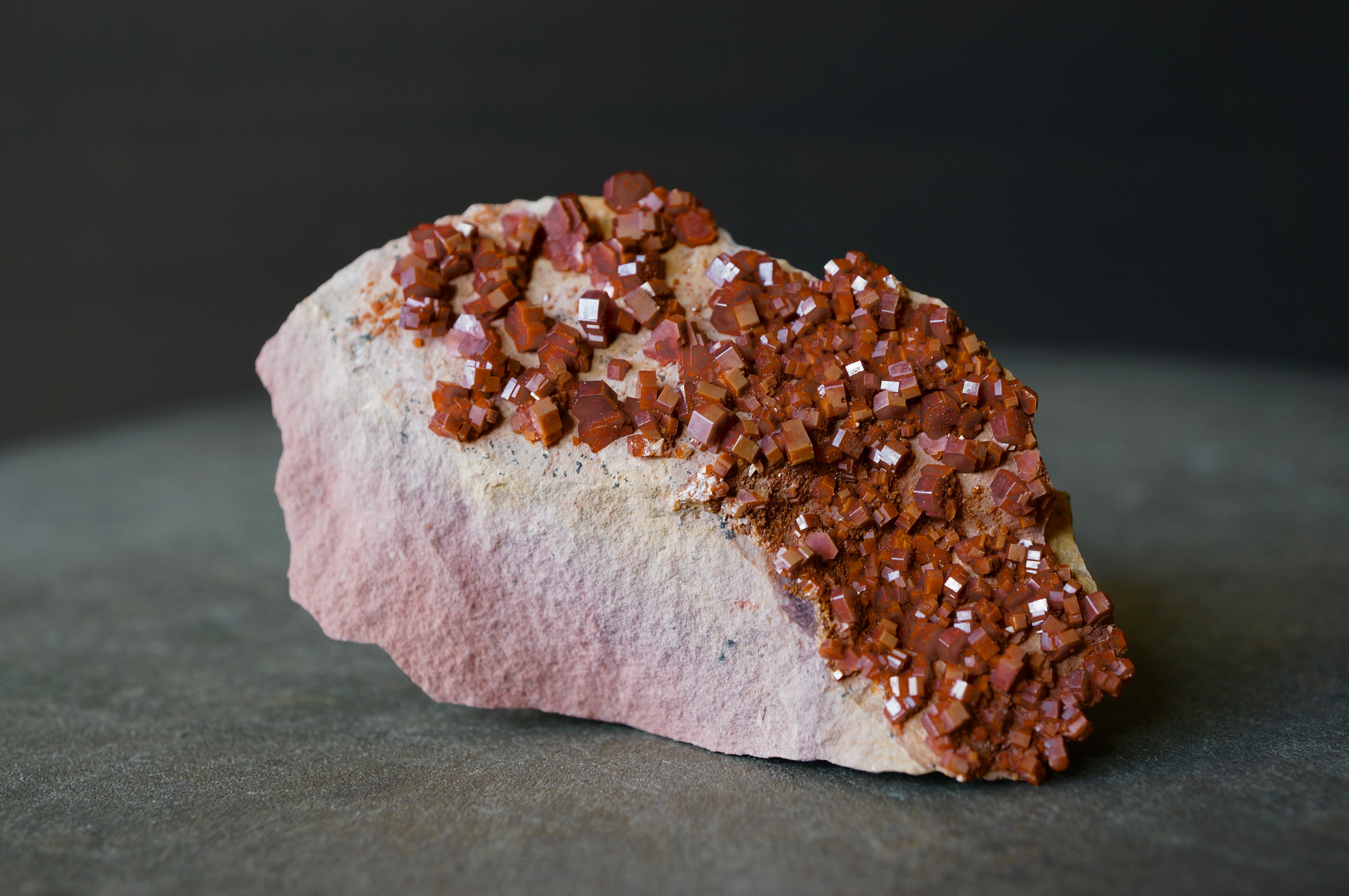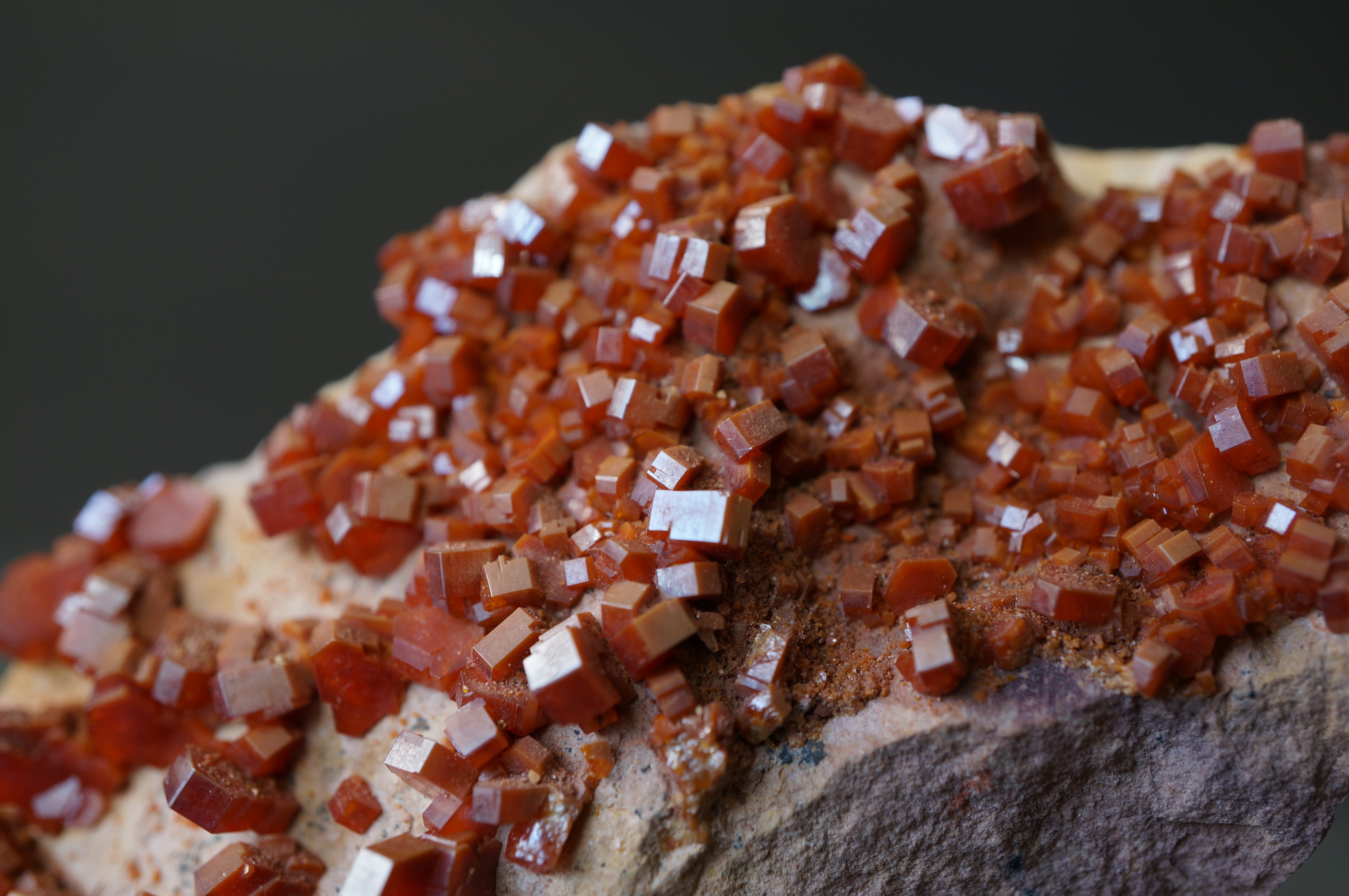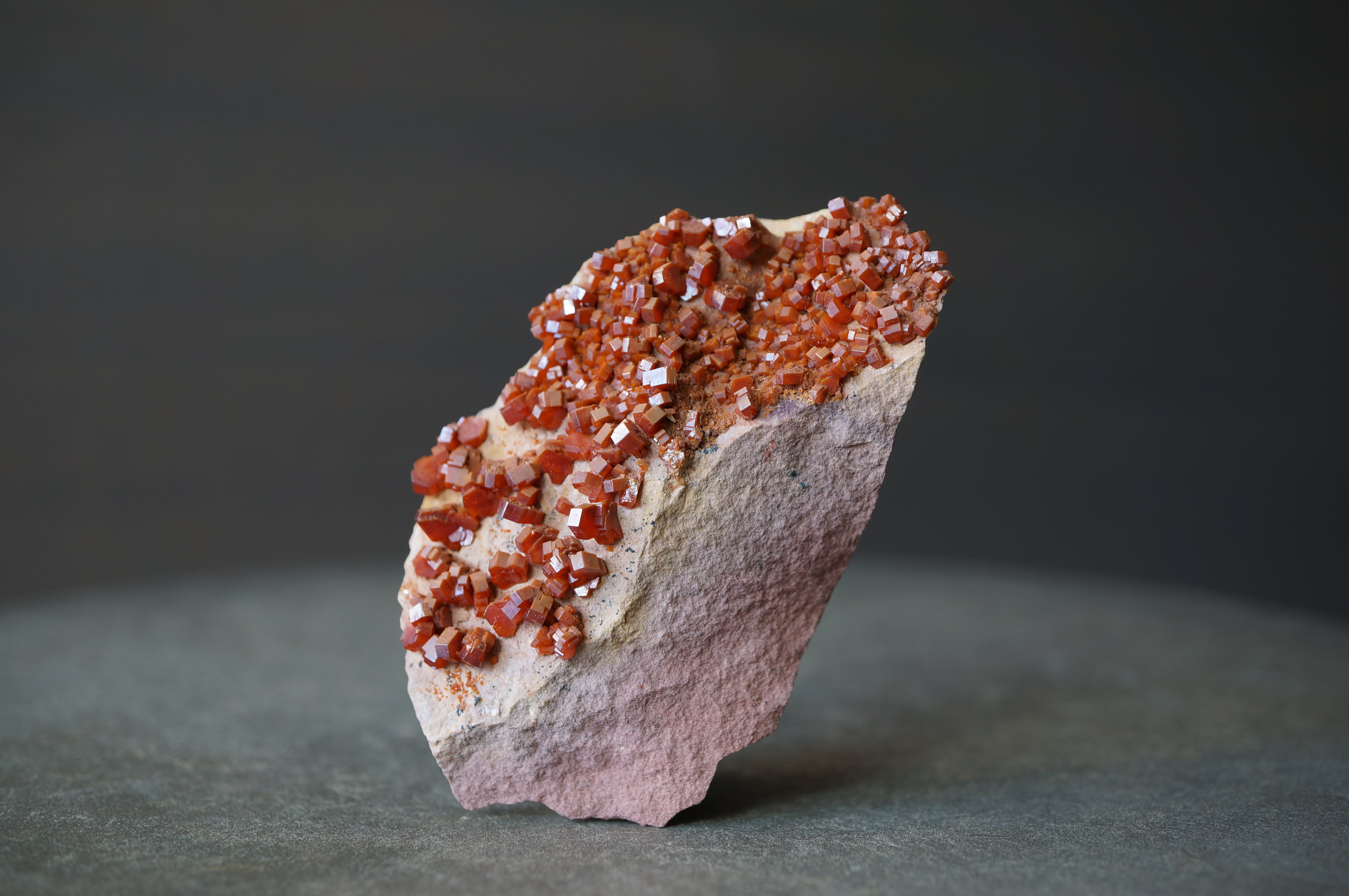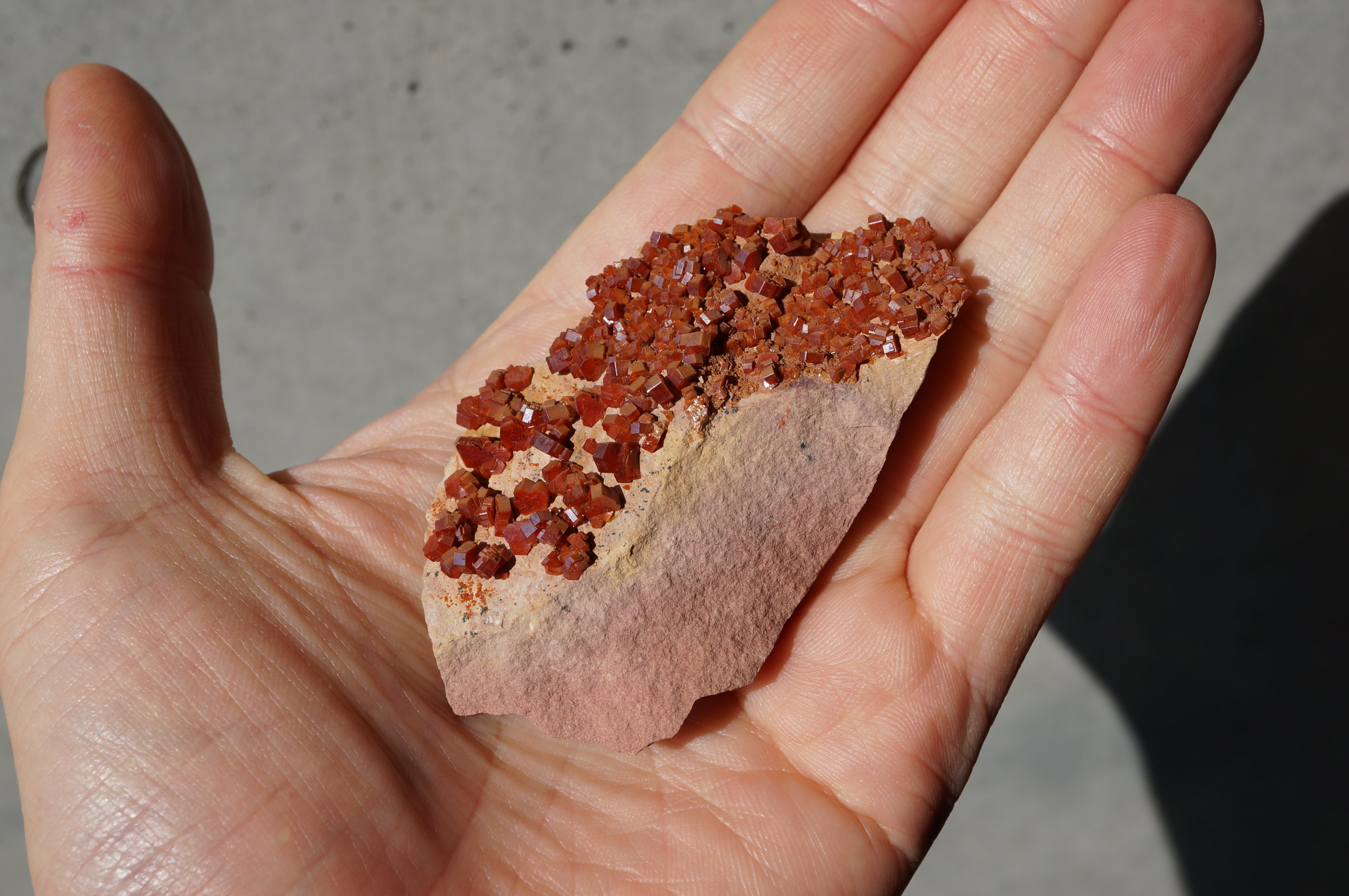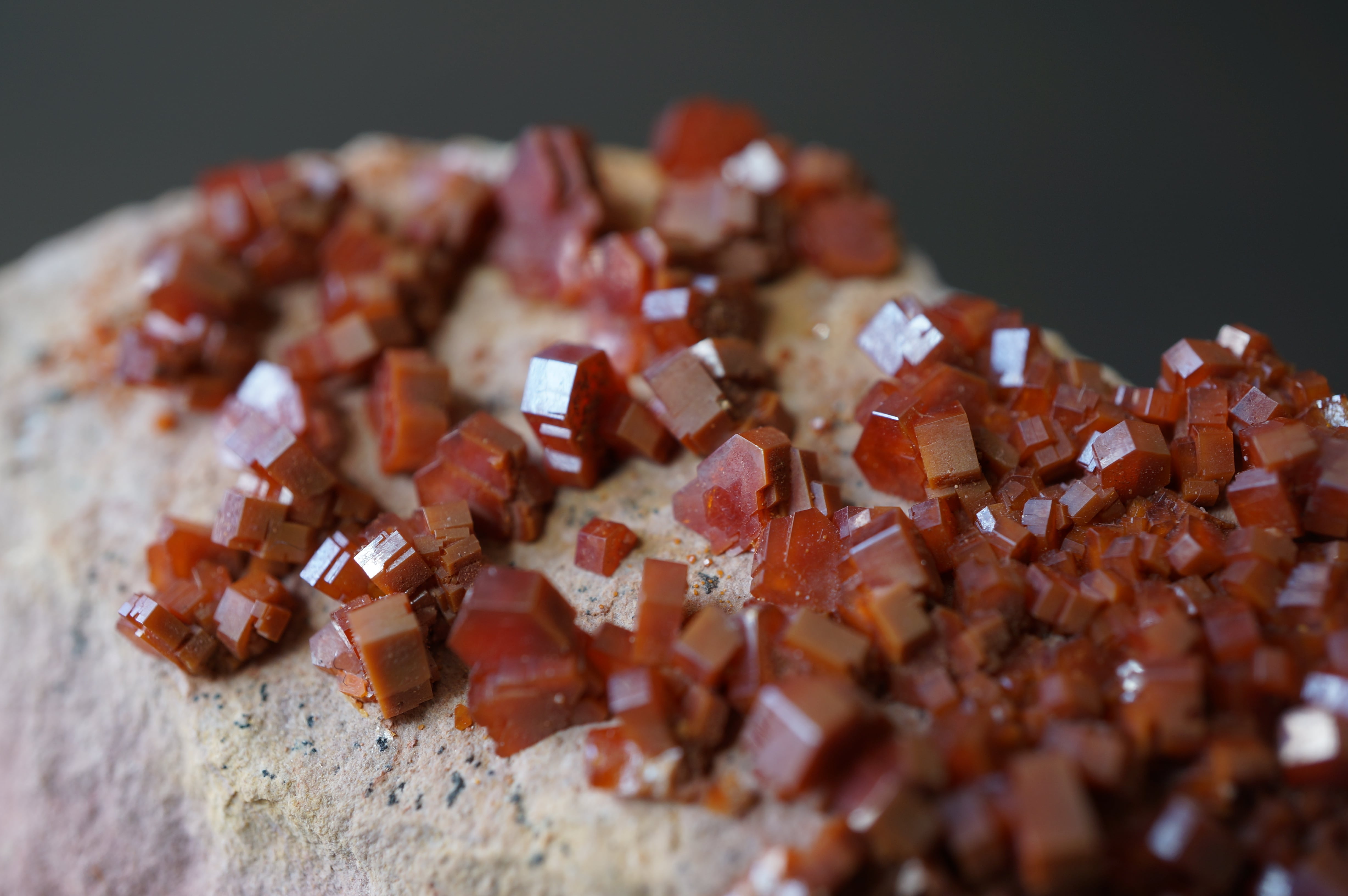 薄紅色の母岩上に幾何学的な赤い結晶が美しく並んでいます。