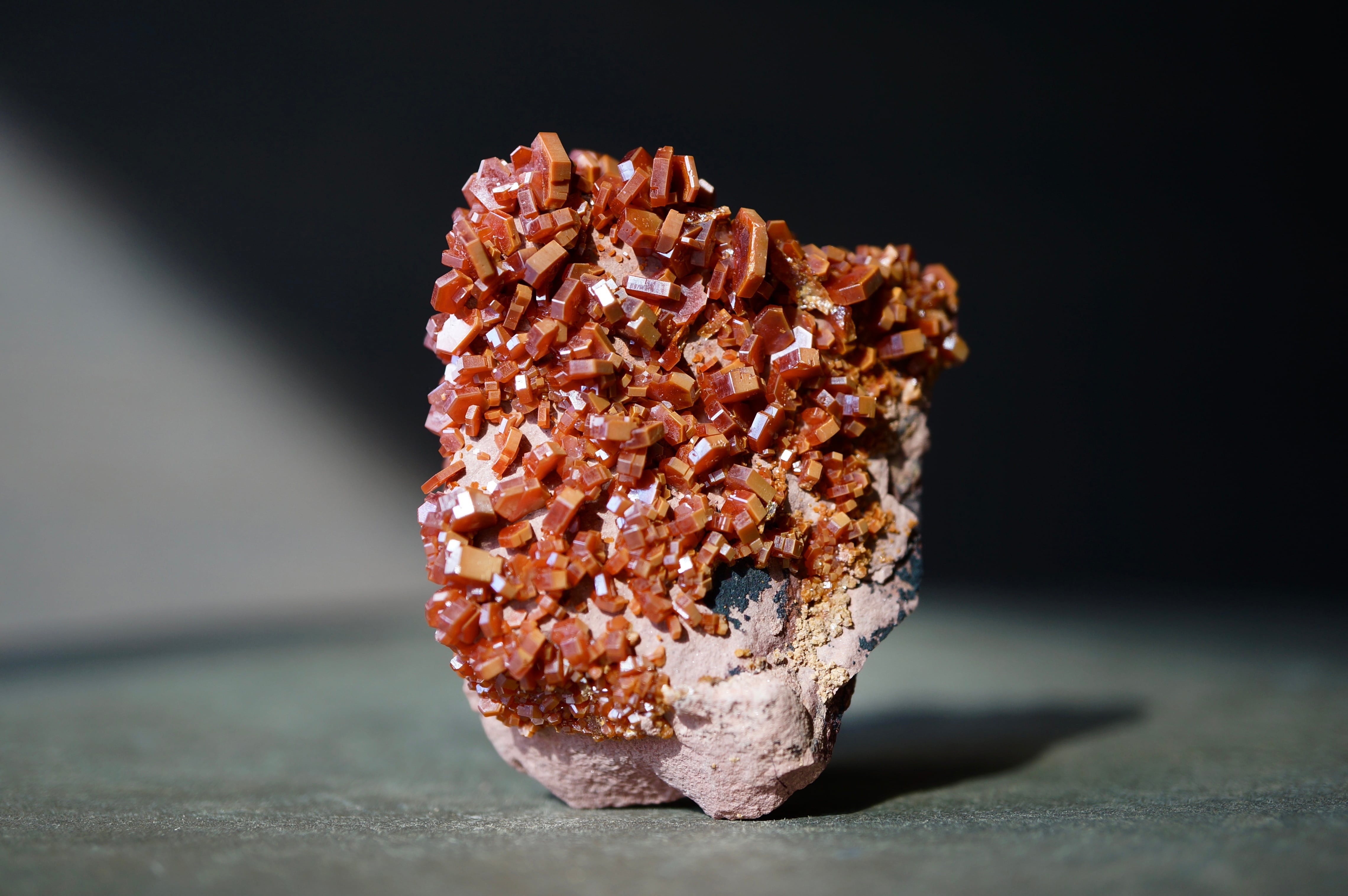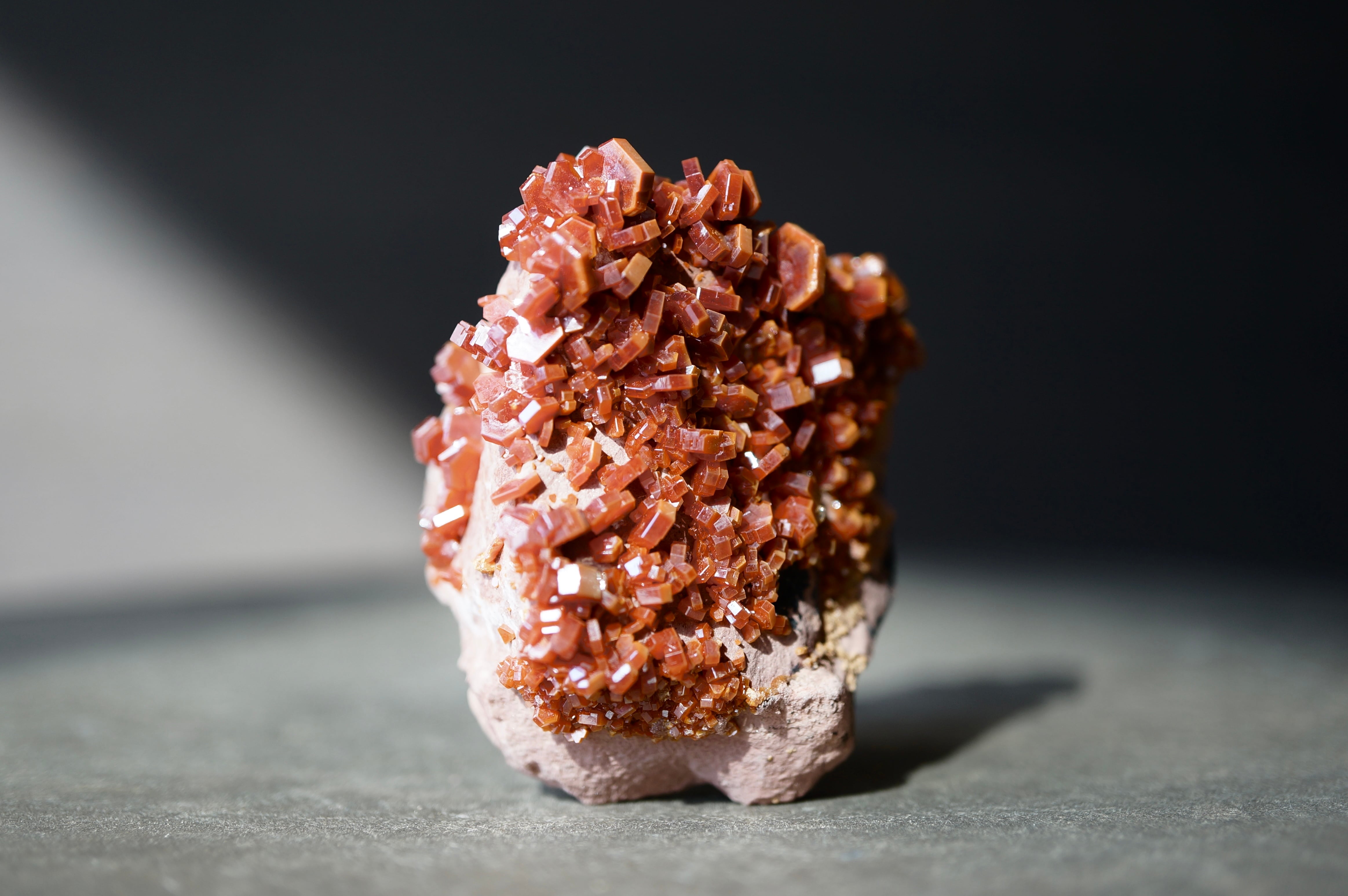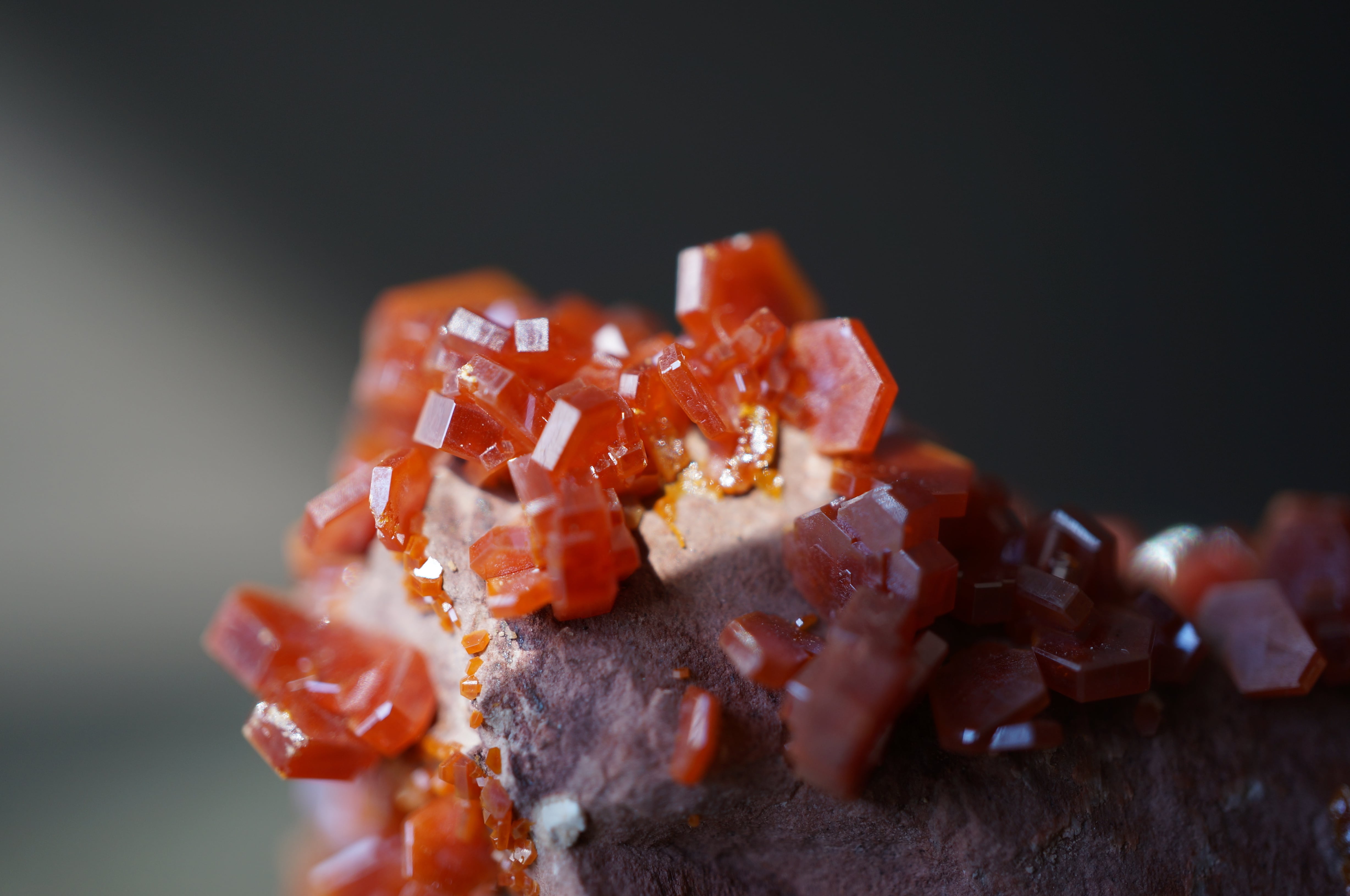 バナジナイトは鉛鉱床の酸化帯に生成するバナジウム鉱物で、六角柱状の結晶を基本とします。