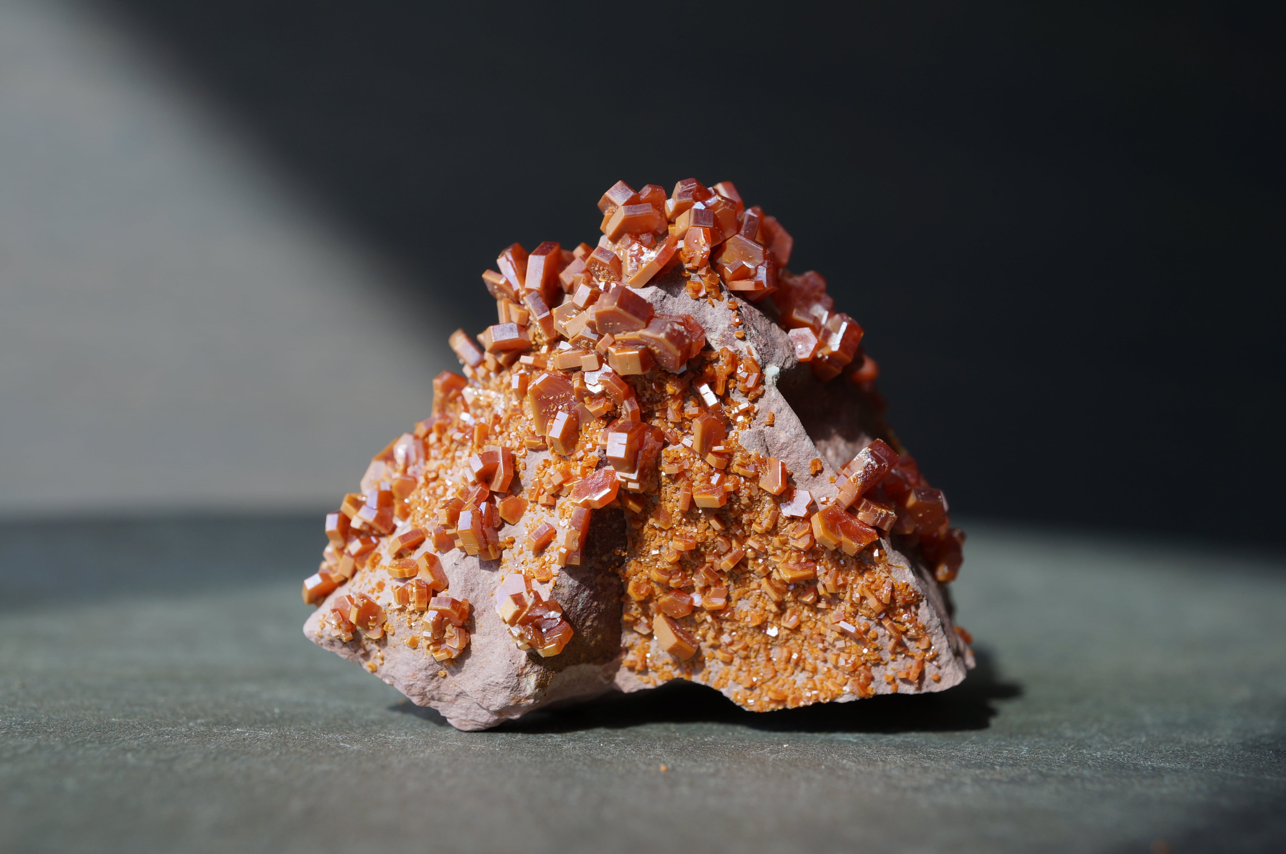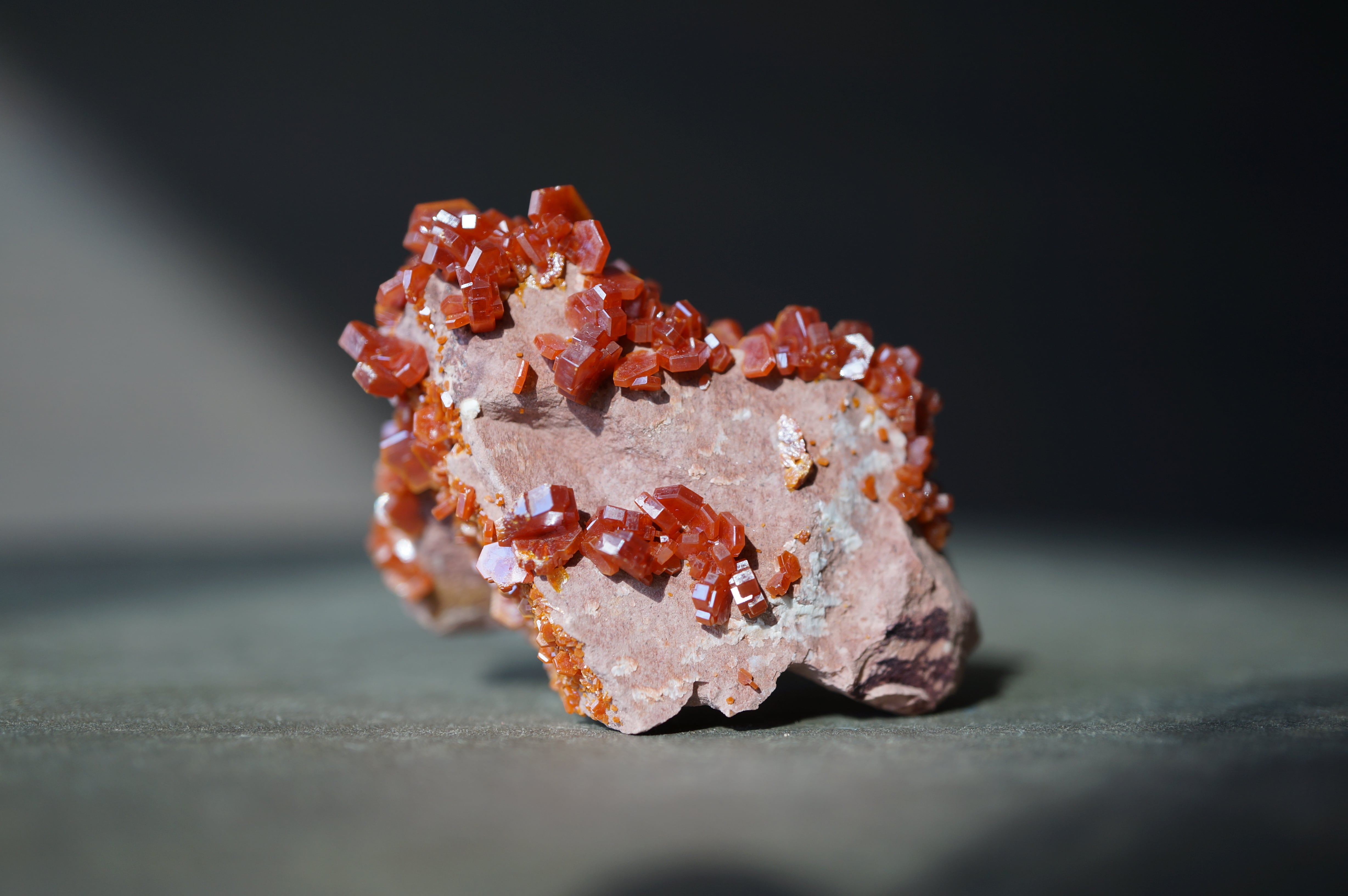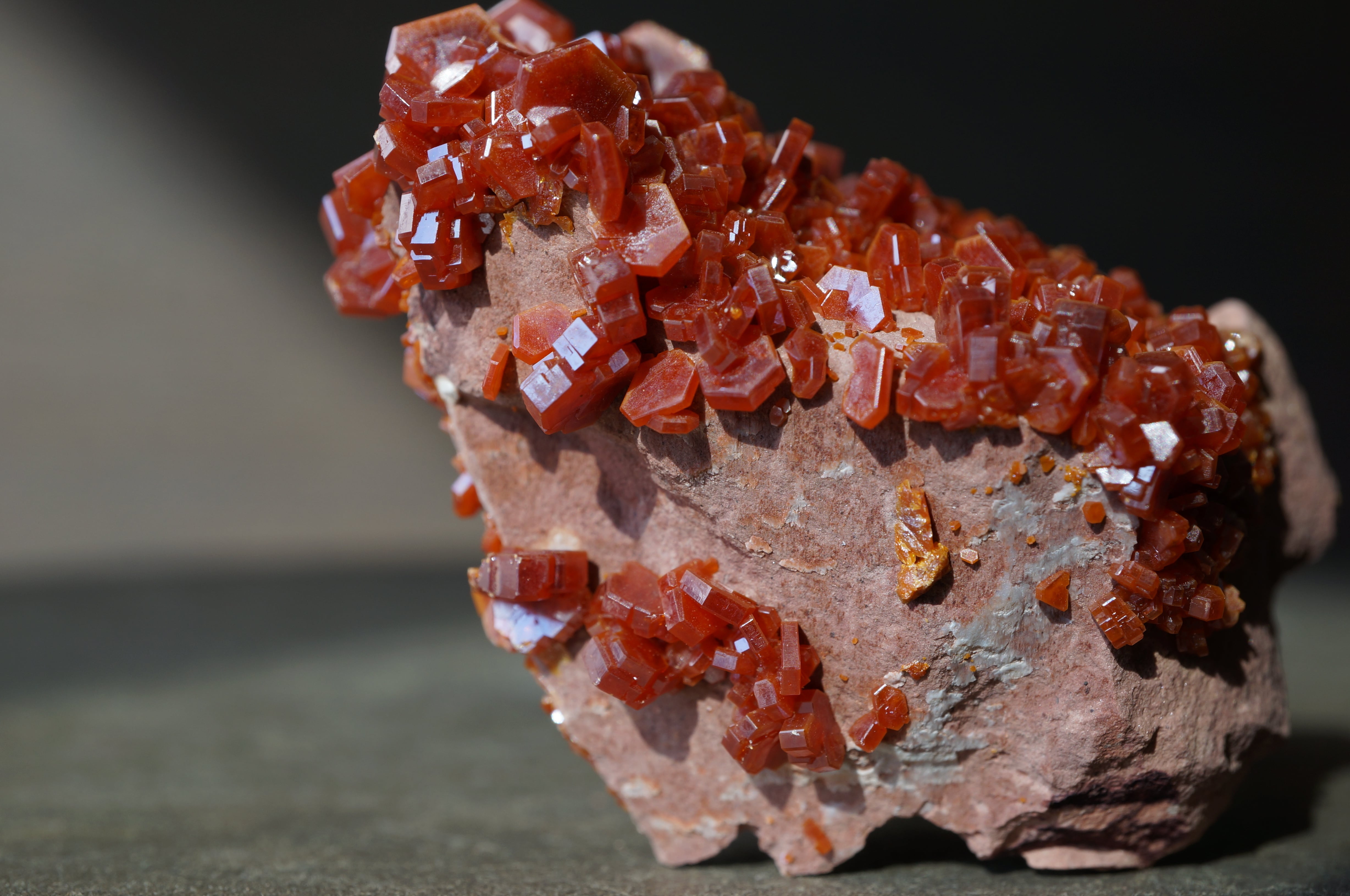 バナジナイトは鉛鉱床の酸化帯に生成するバナジウム鉱物で、六角柱状の結晶を基本とします。