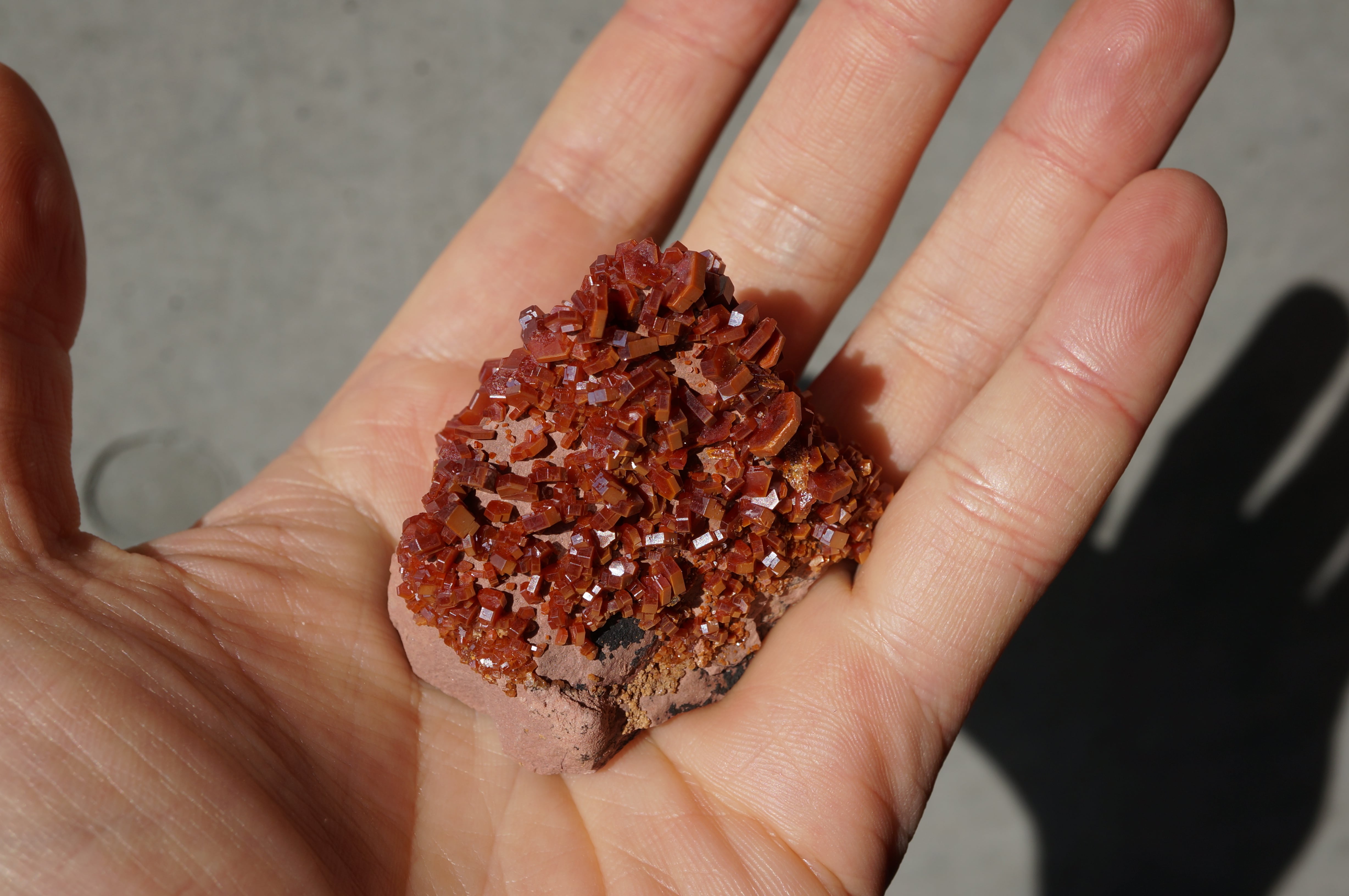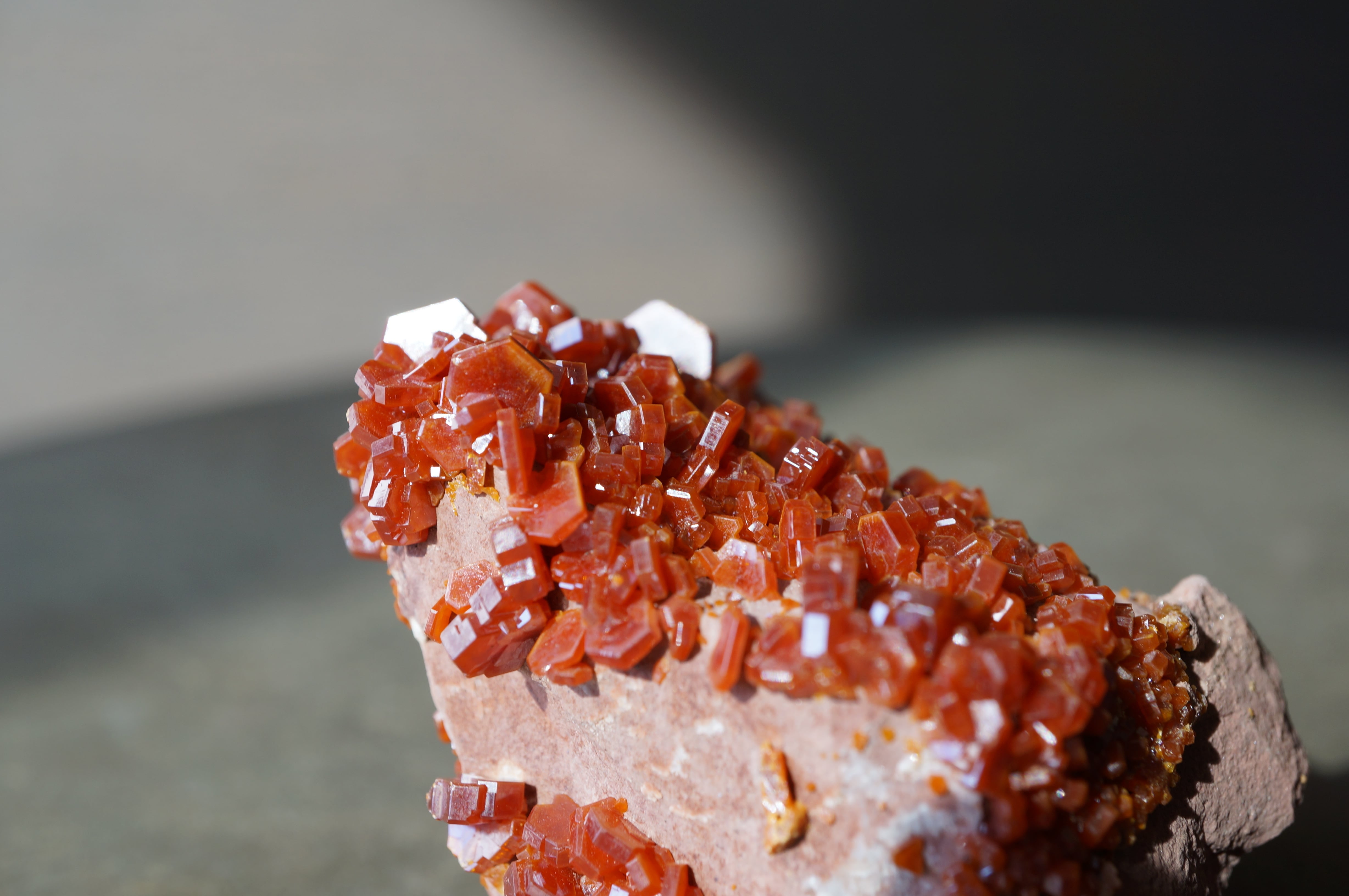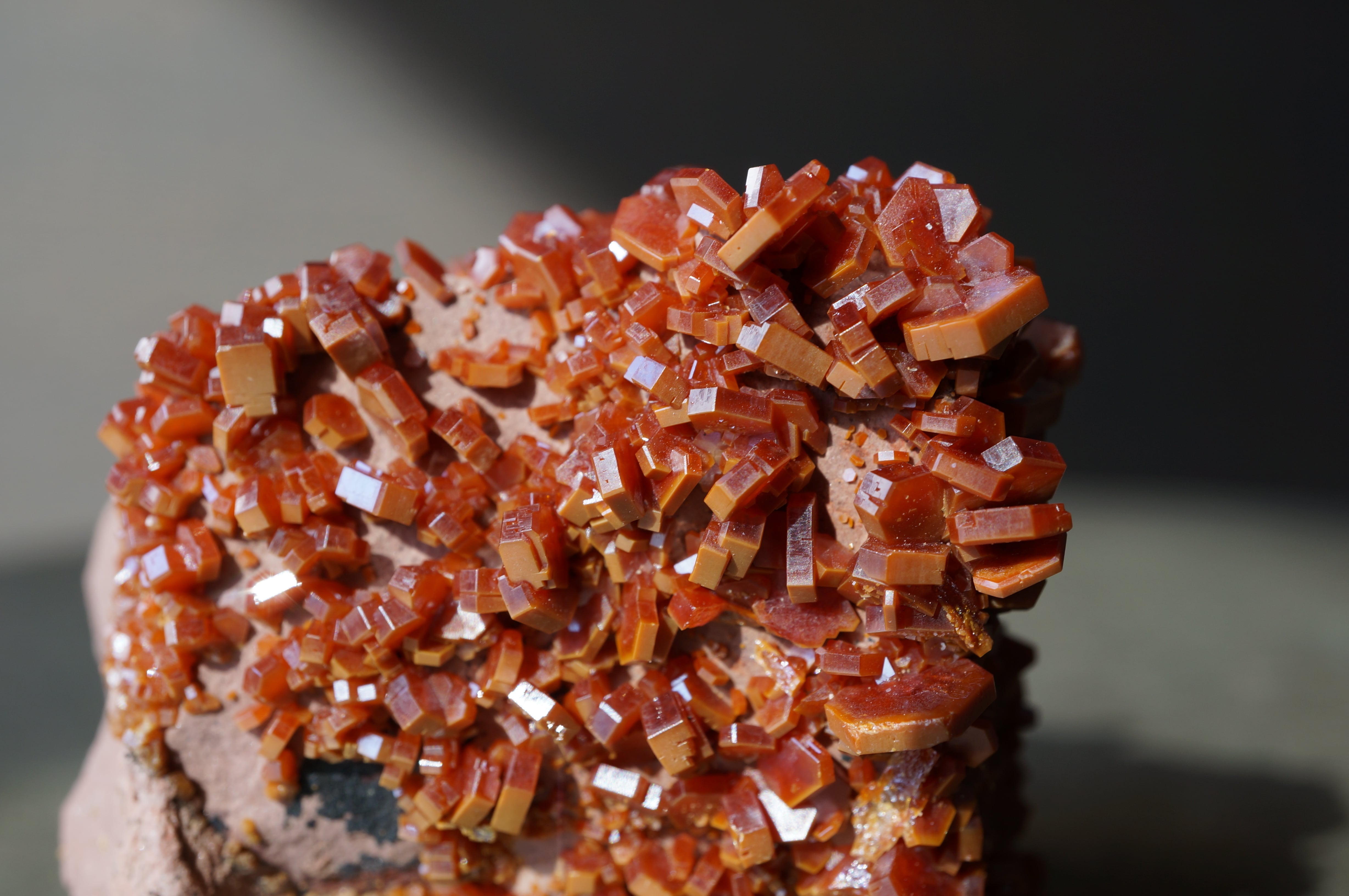 薄紅色の母岩上に幾何学的な赤い結晶が美しく並んでいます。