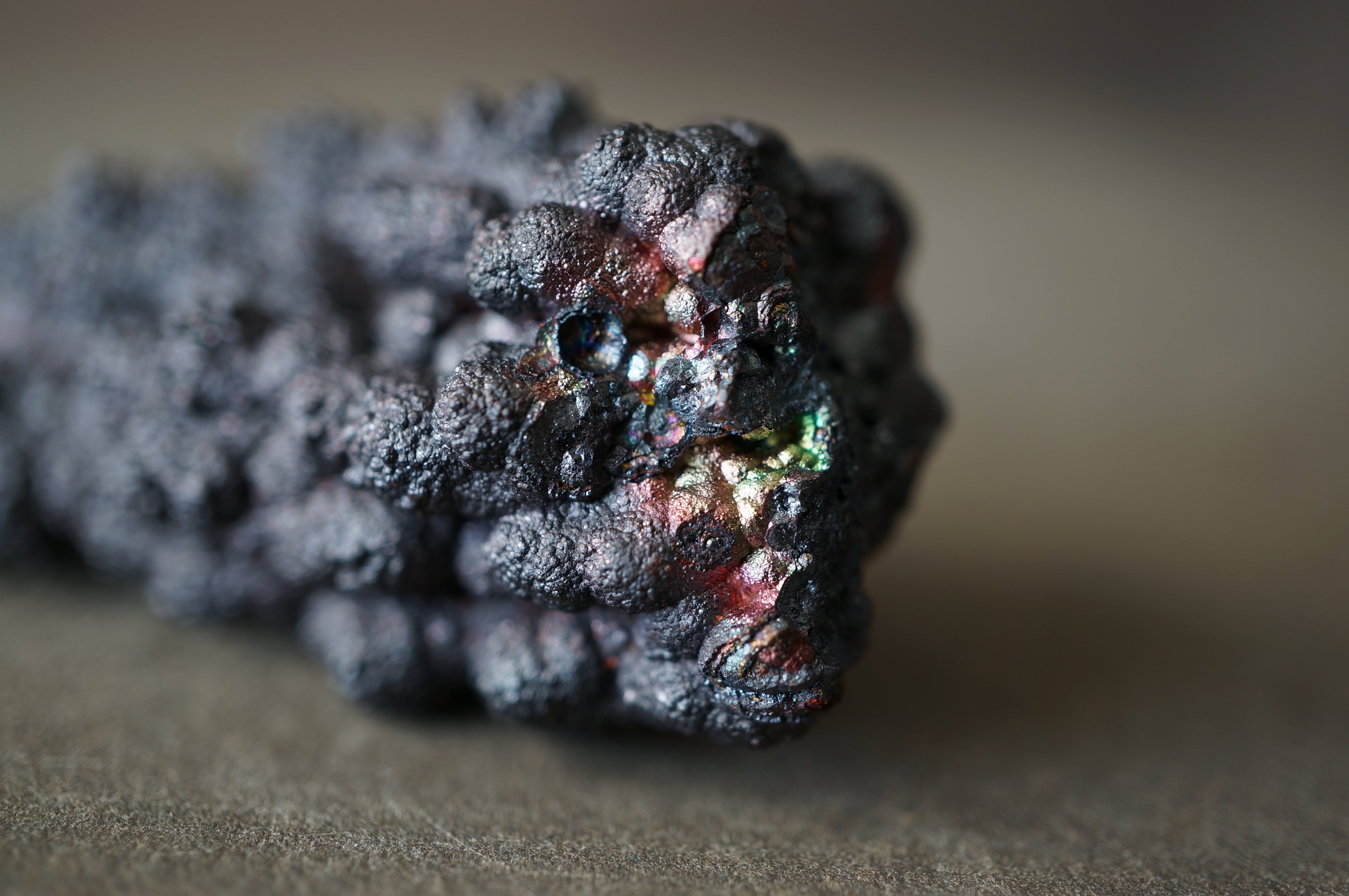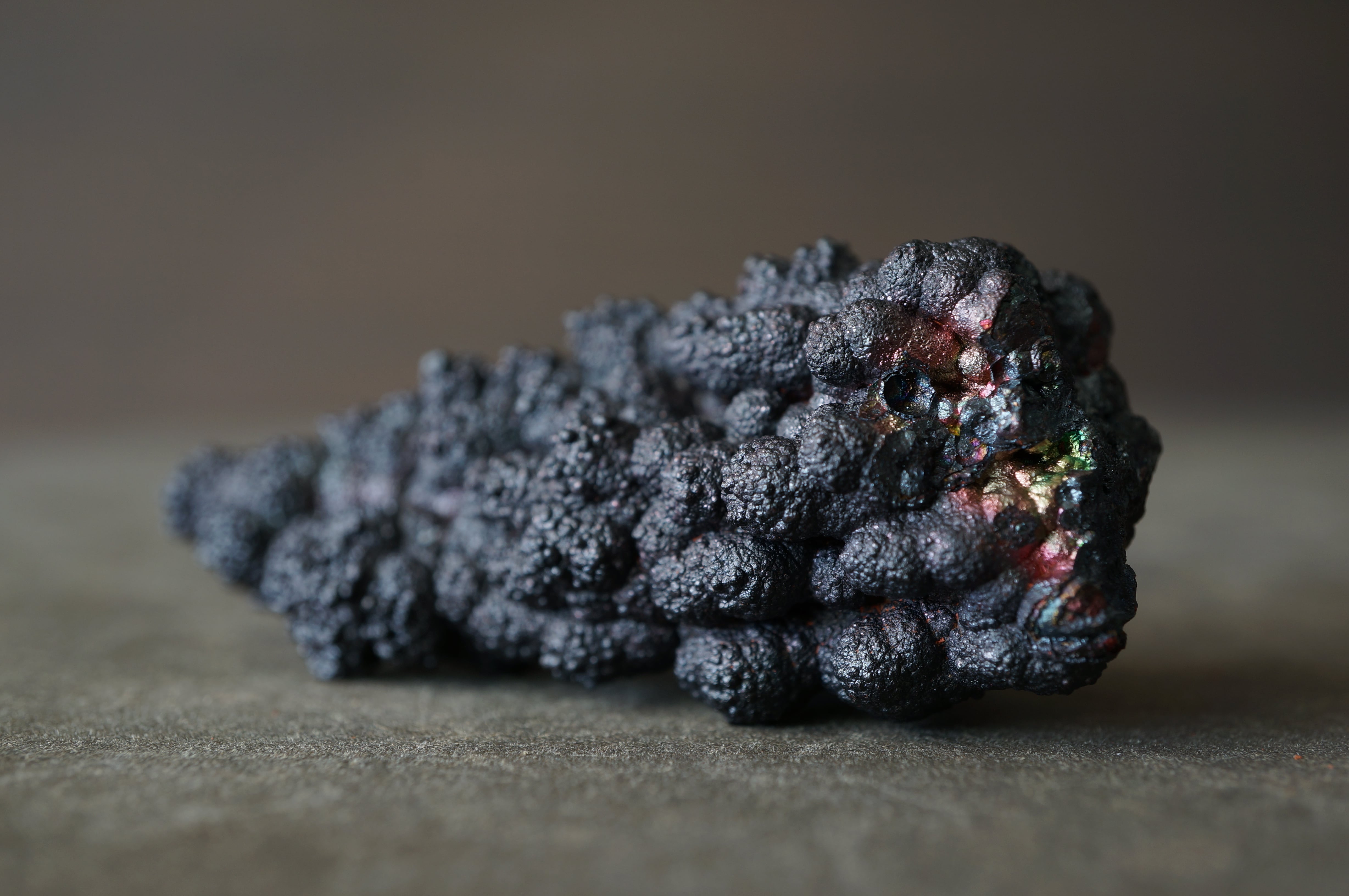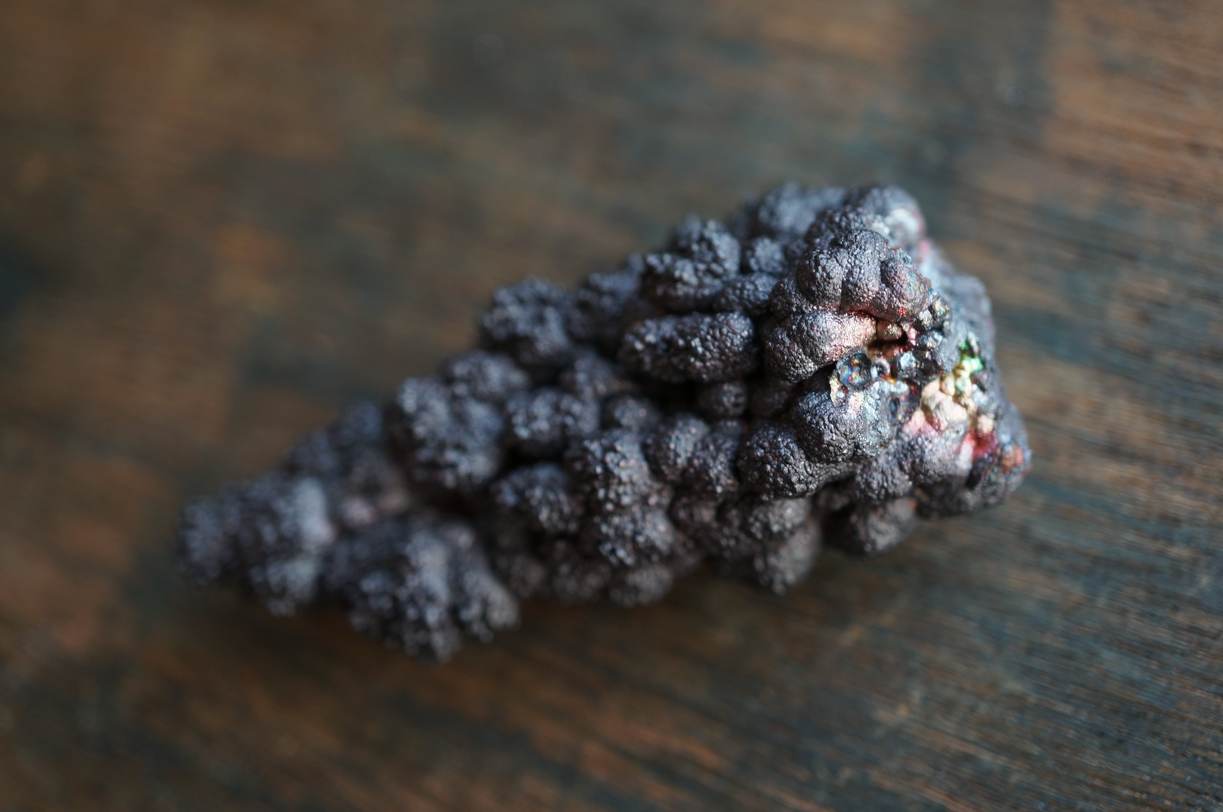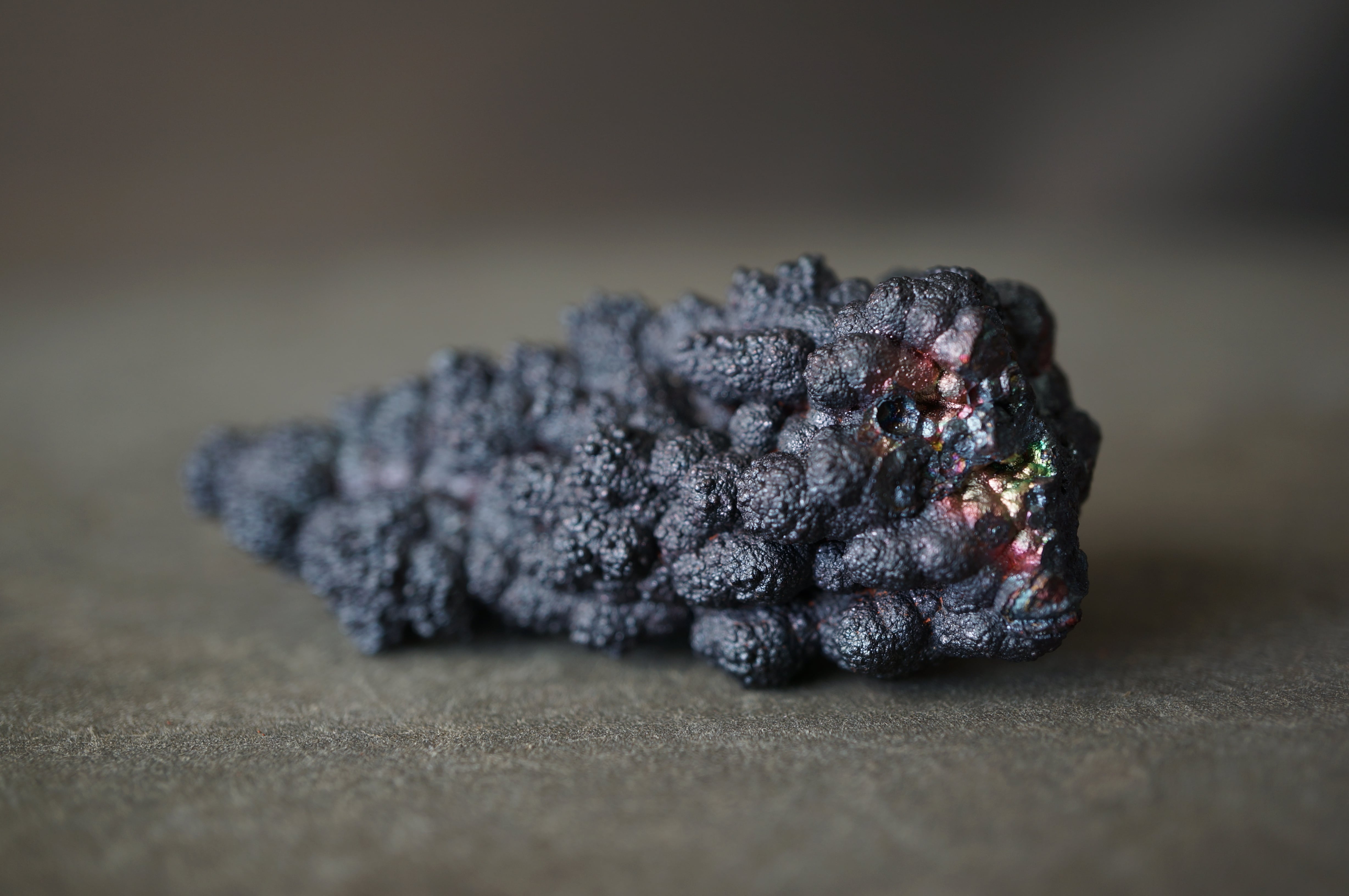 本産地のゲーサイトは鍾乳状、葡萄状の膨らみが連なり、赤紫・緑・青など多彩な光沢を見せる点が大きな特徴です。