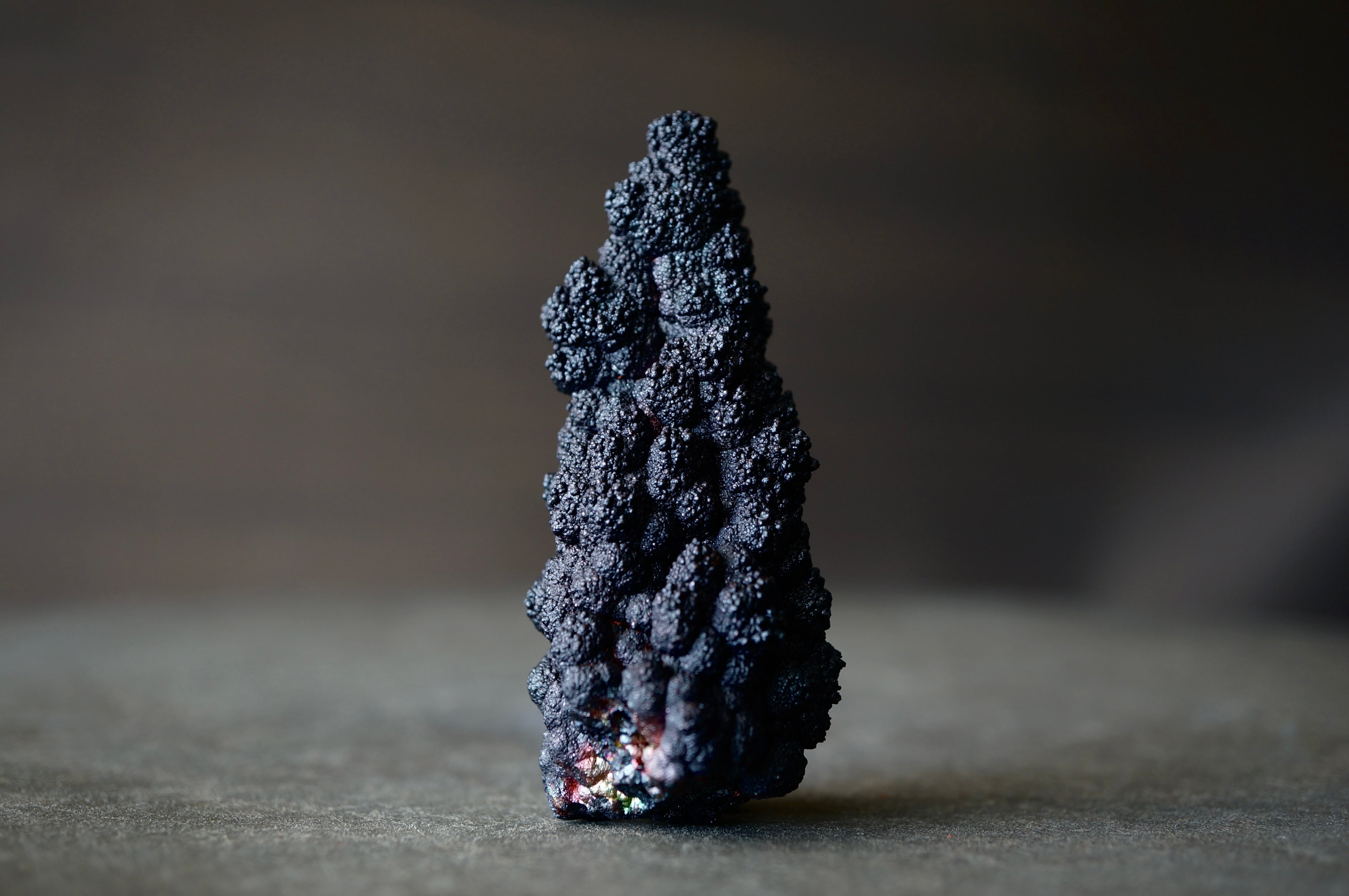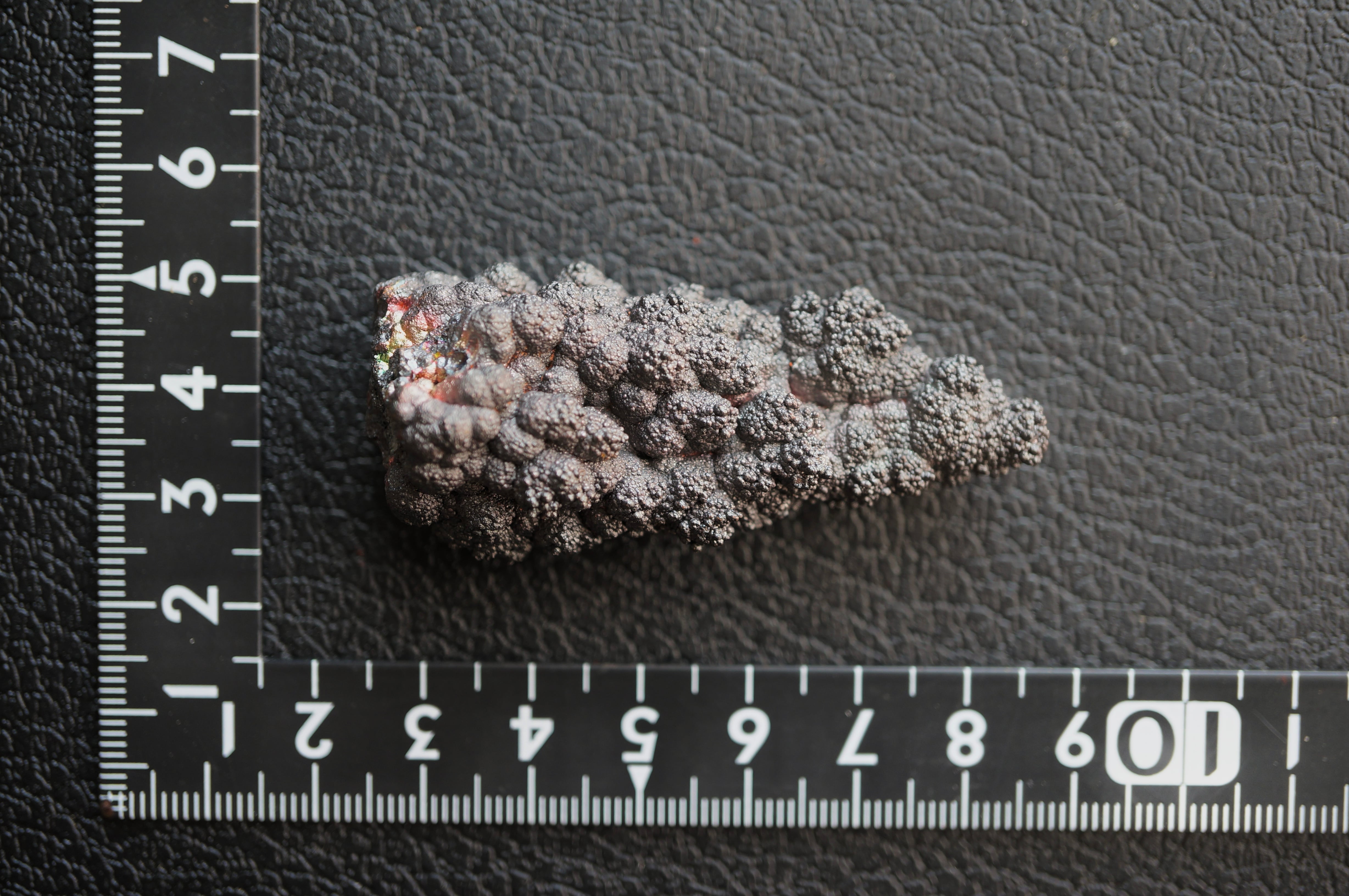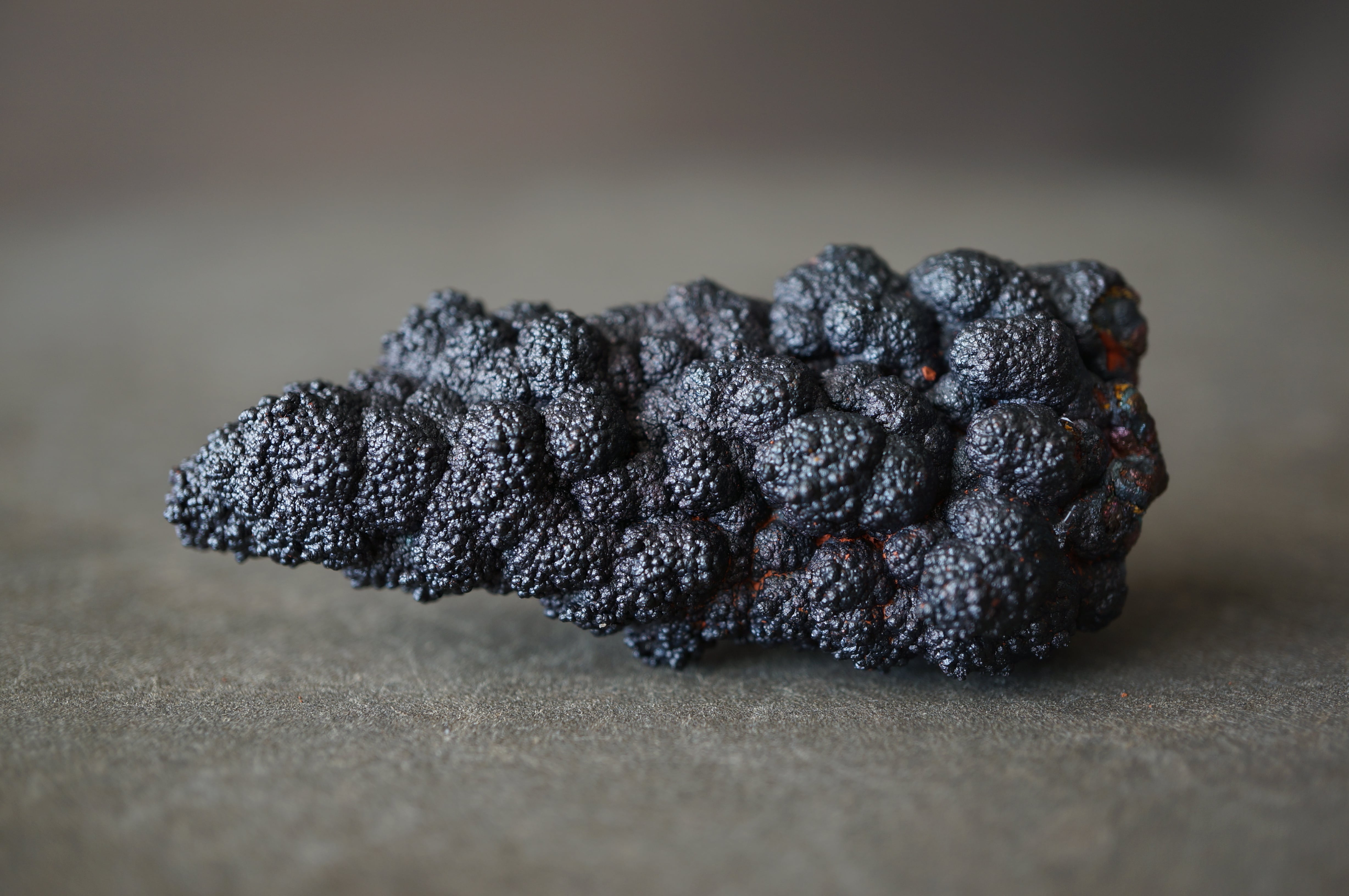 本産地のゲーサイトは鍾乳状、葡萄状の膨らみが連なり、赤紫・緑・青など多彩な光沢を見せる点が大きな特徴です。