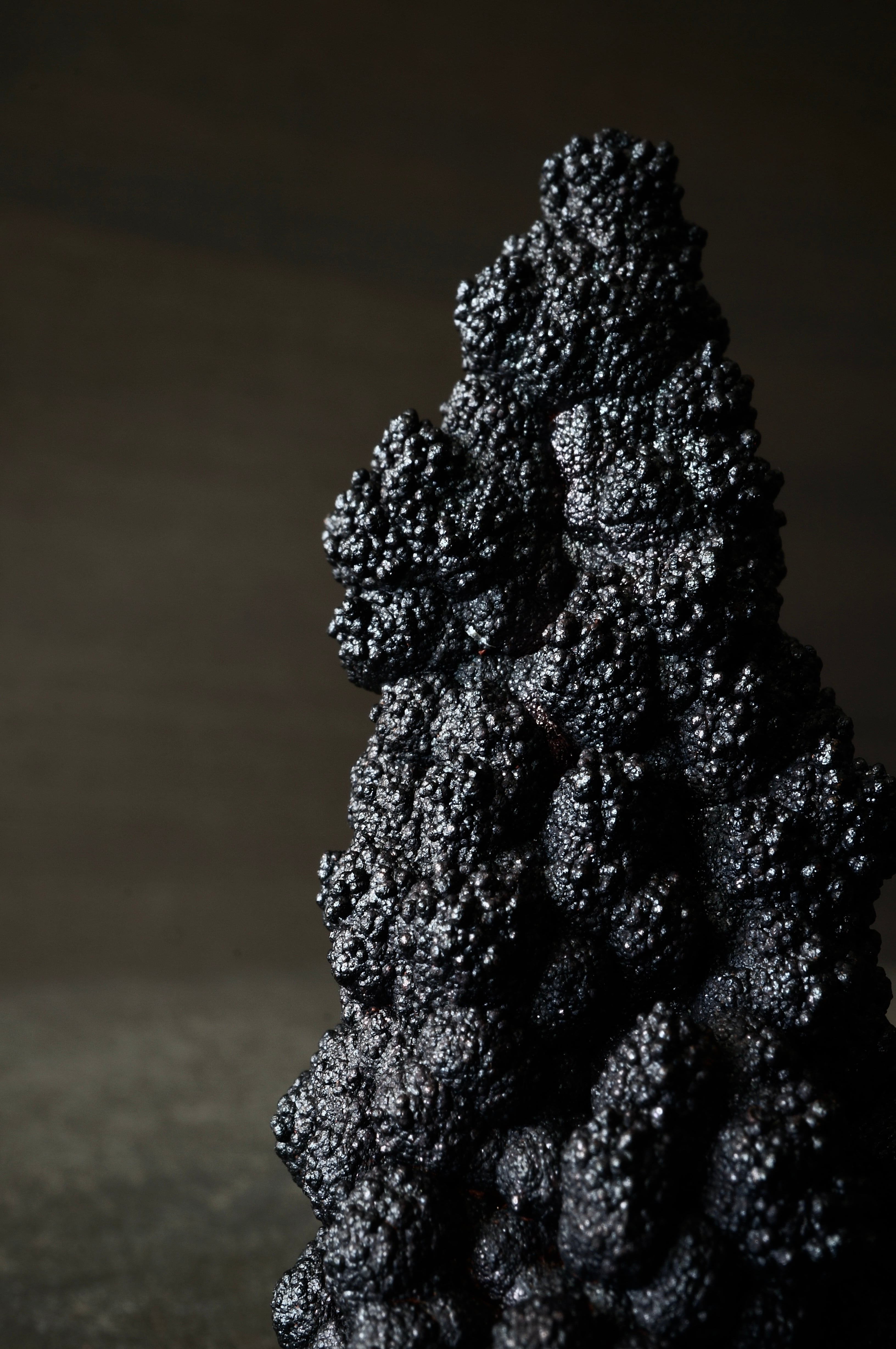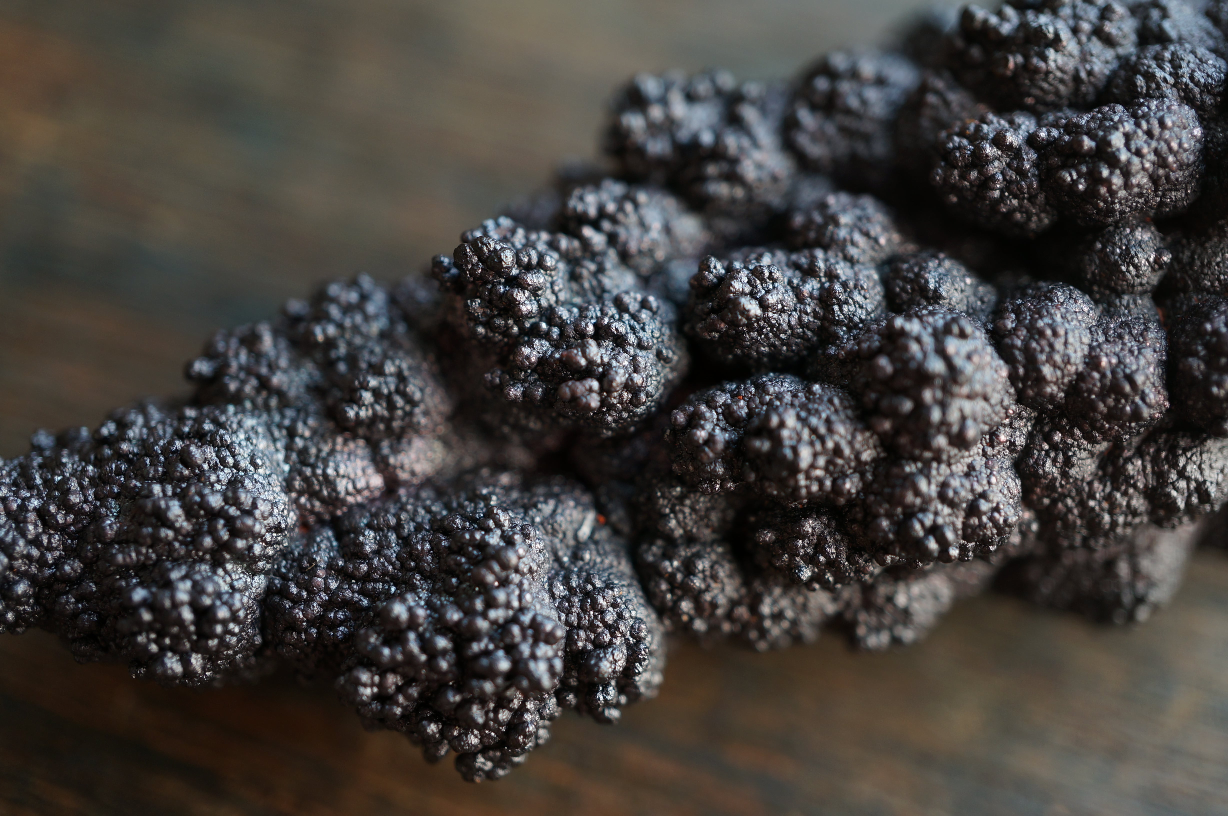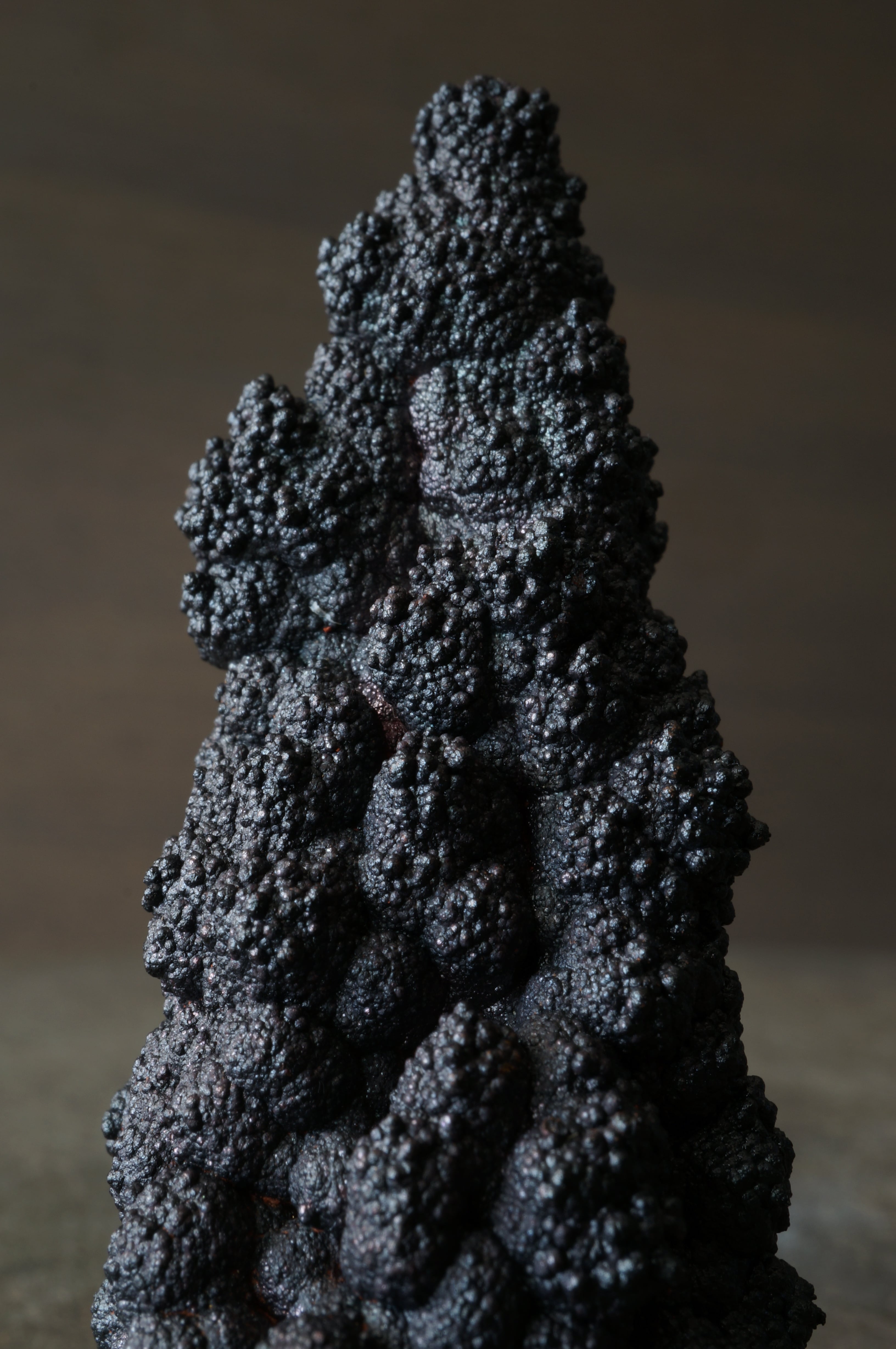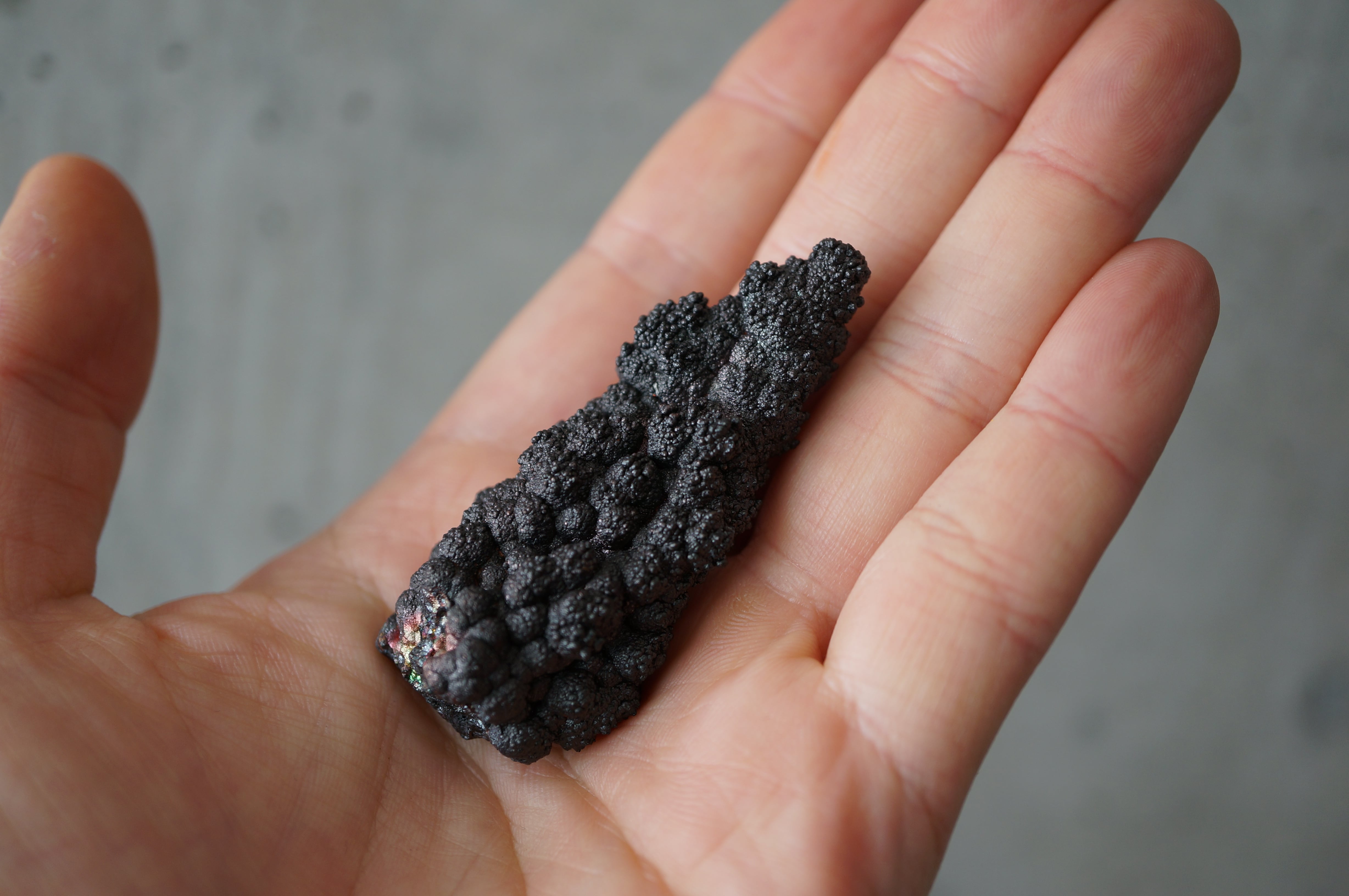 本産地のゲーサイトは鍾乳状、葡萄状の膨らみが連なり、赤紫・緑・青など多彩な光沢を見せる点が大きな特徴です。
