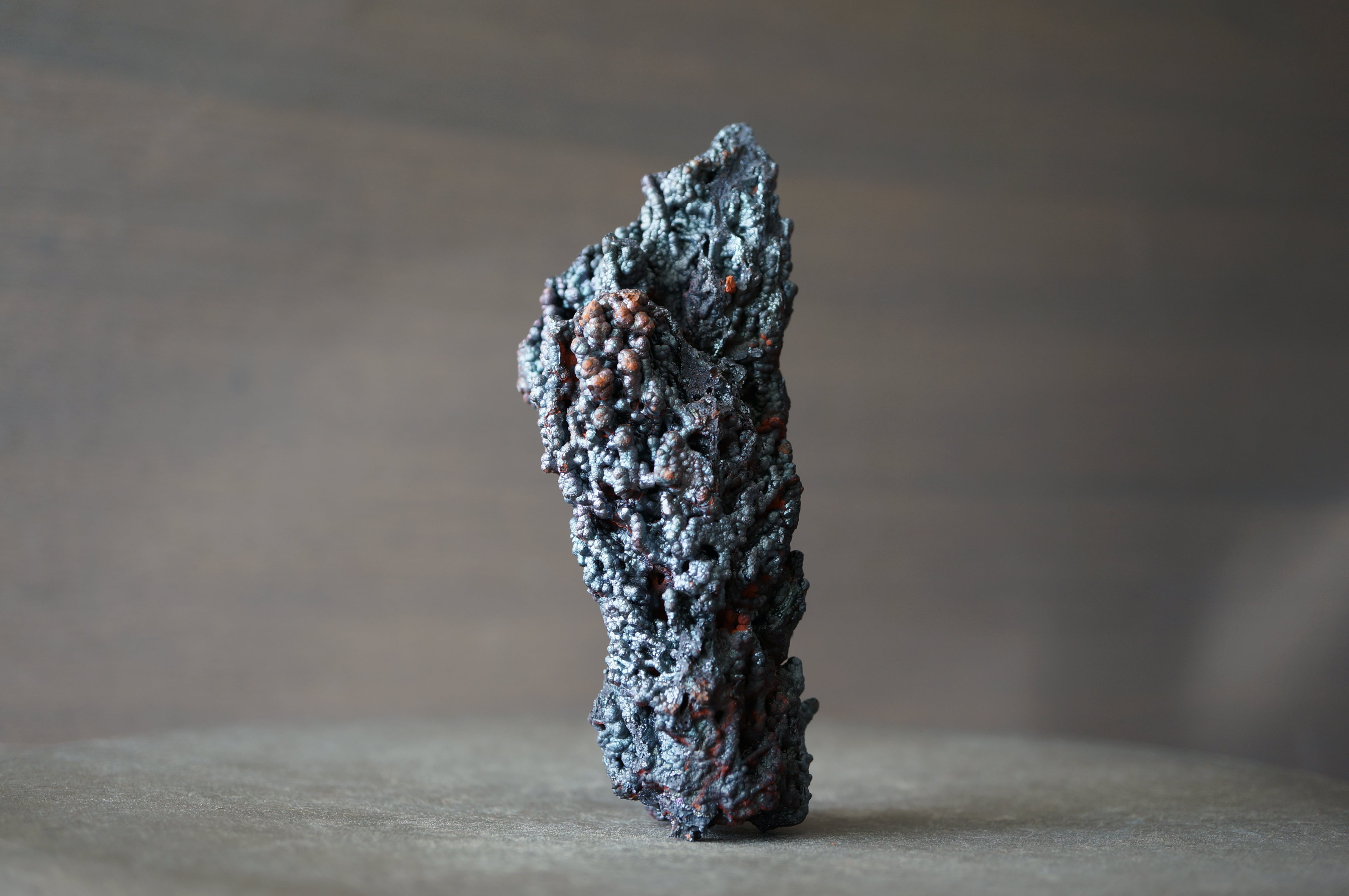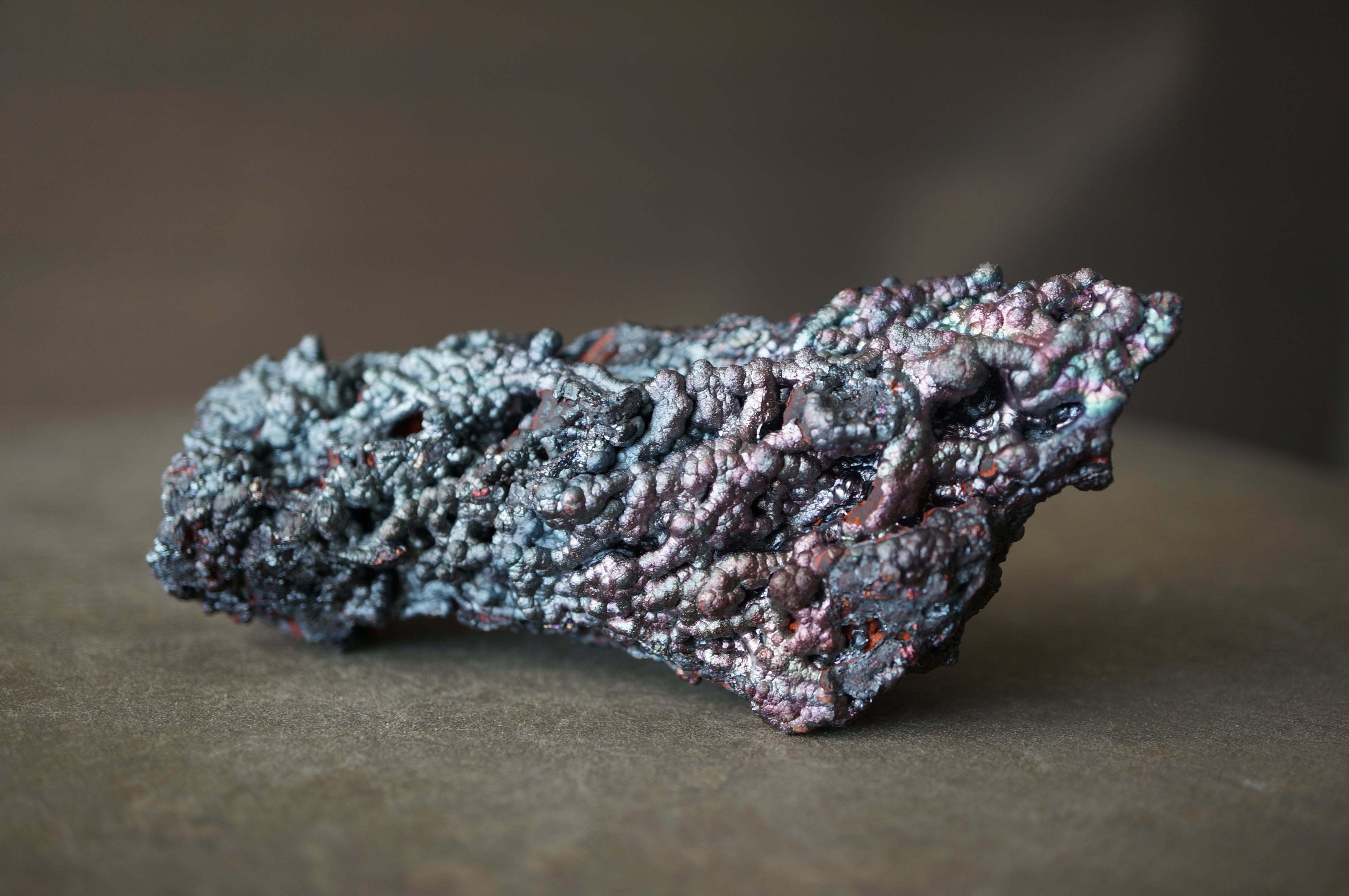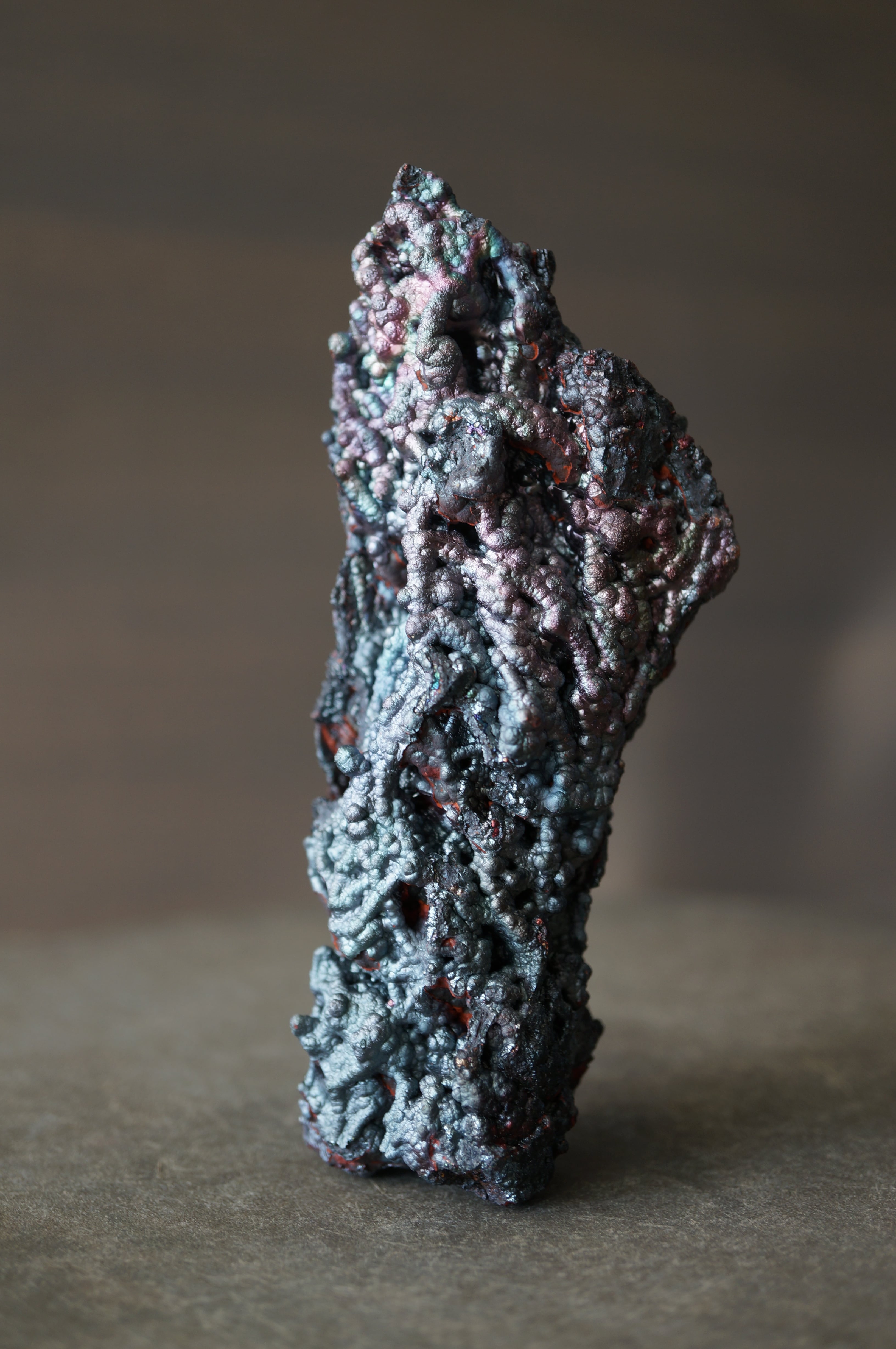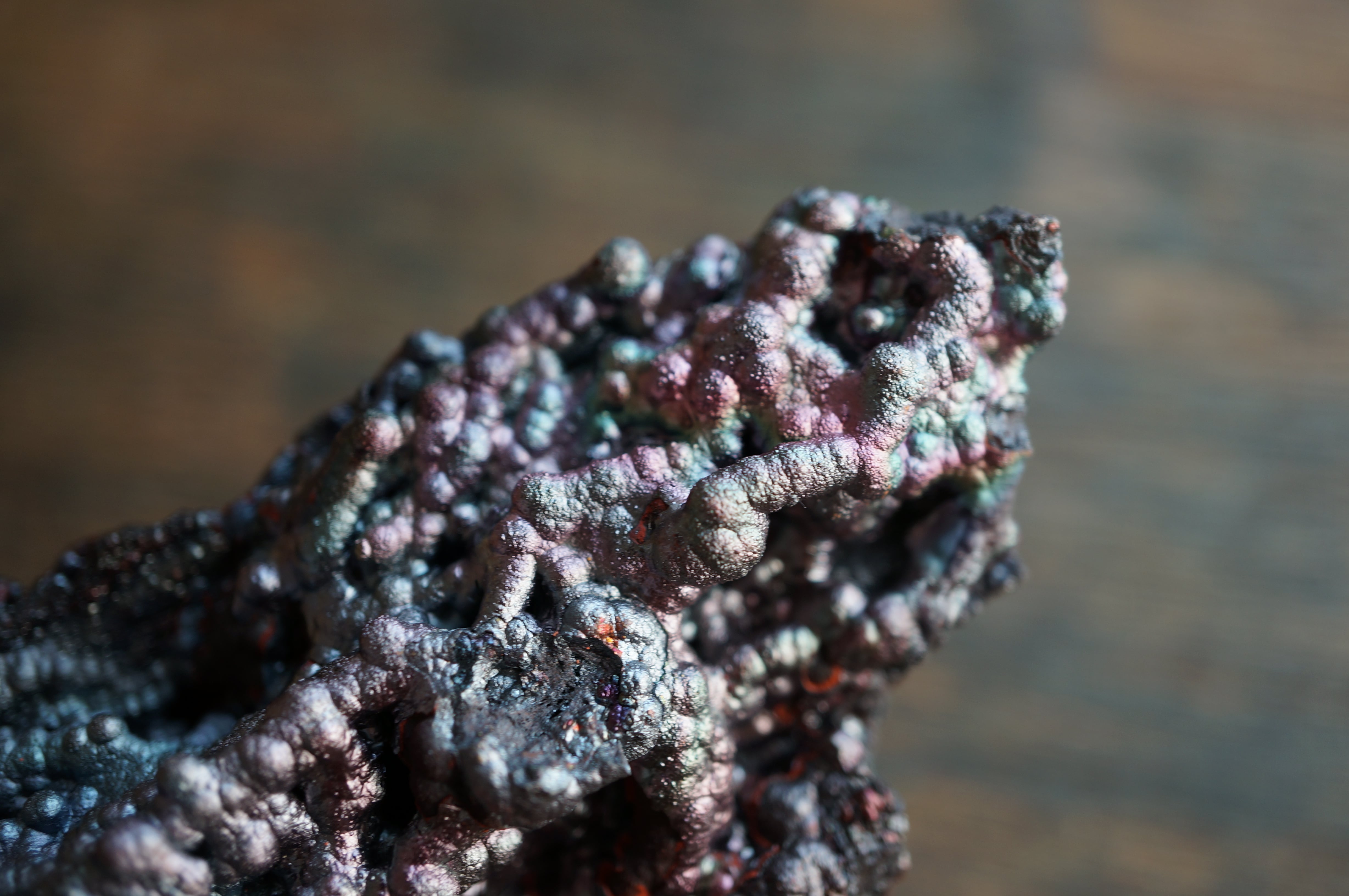 本産地のゲーサイトは鍾乳状、葡萄状の膨らみが連なり、赤紫・緑・青など多彩な光沢を見せる点が大きな特徴です。