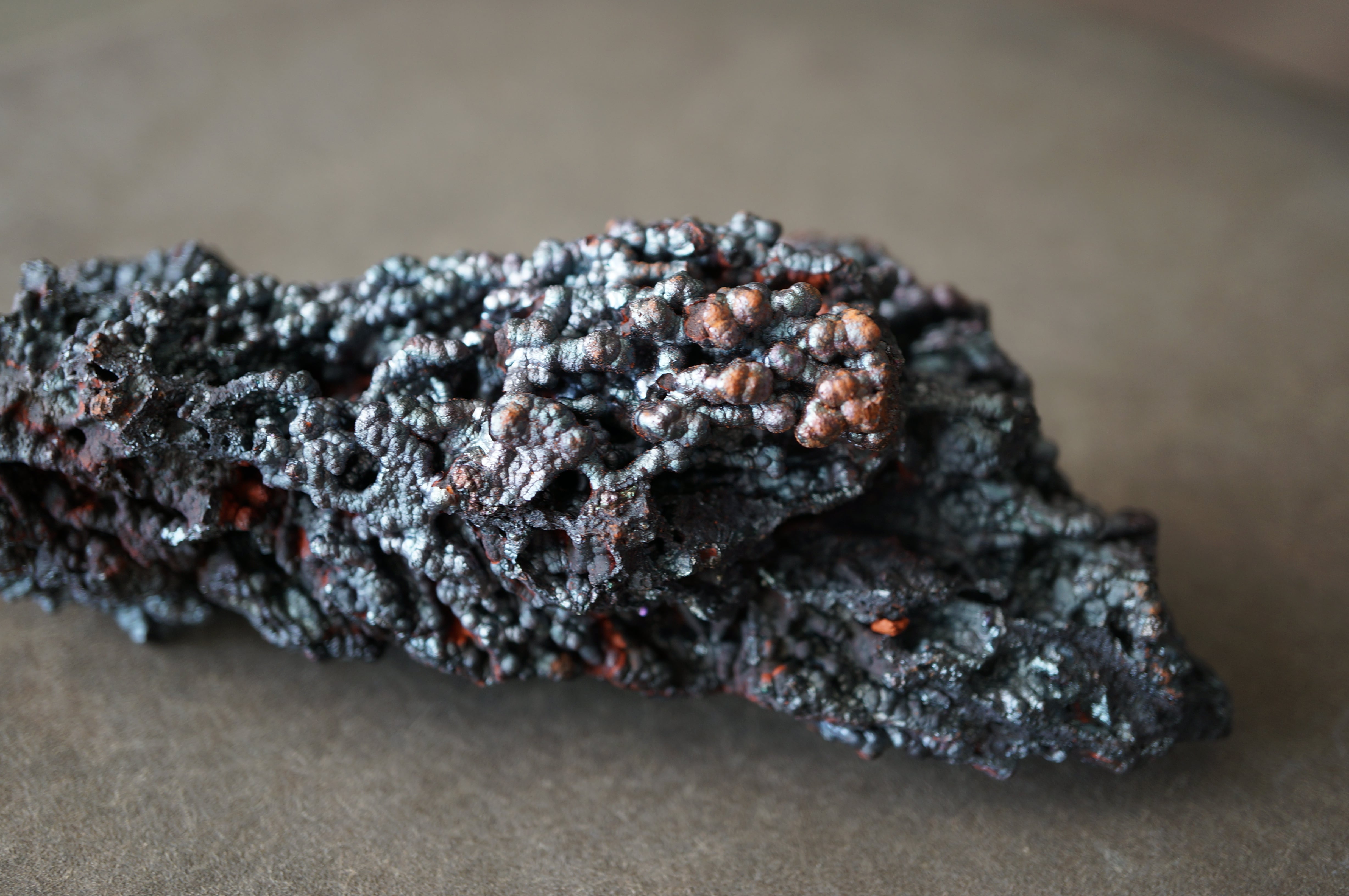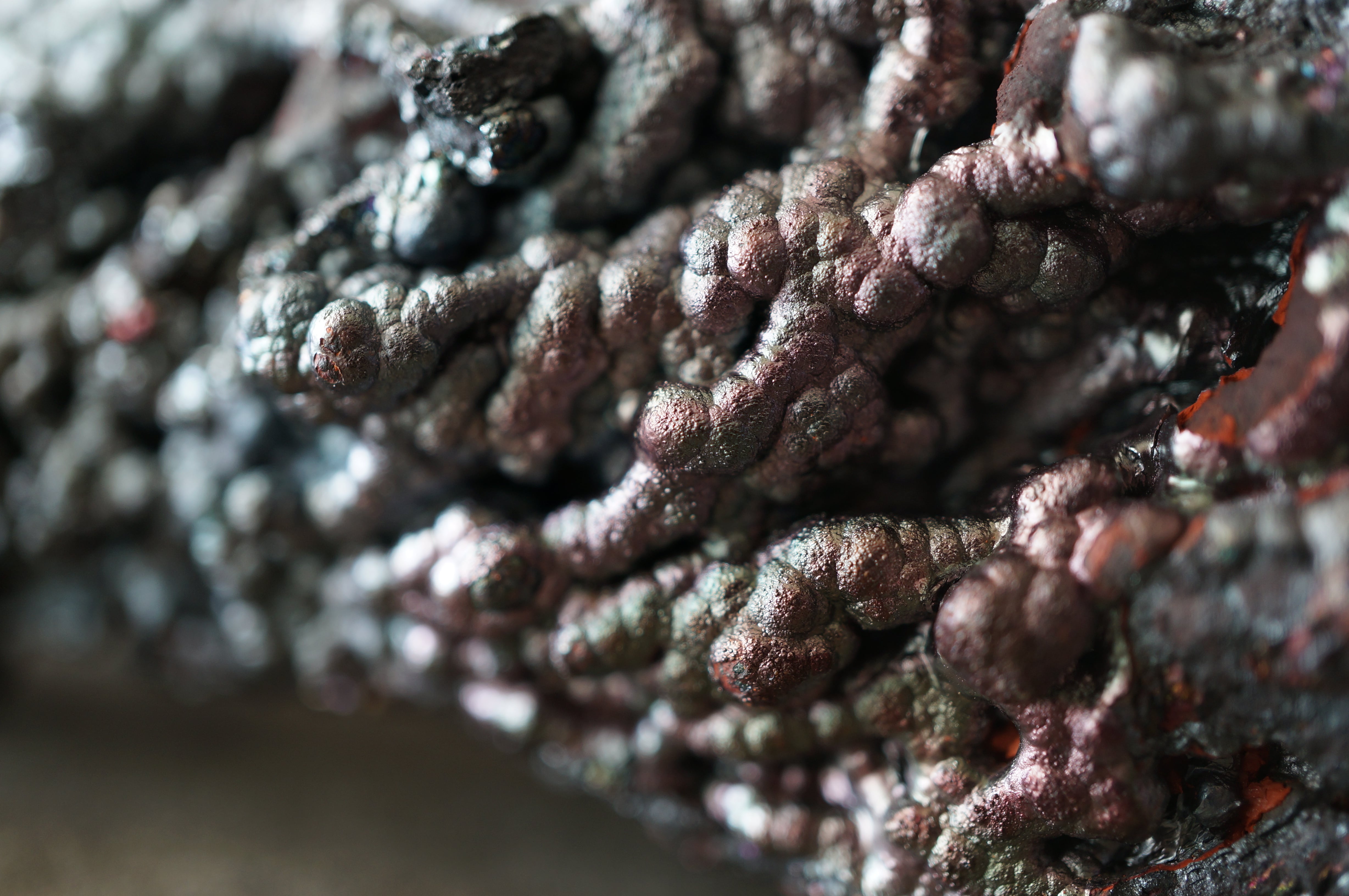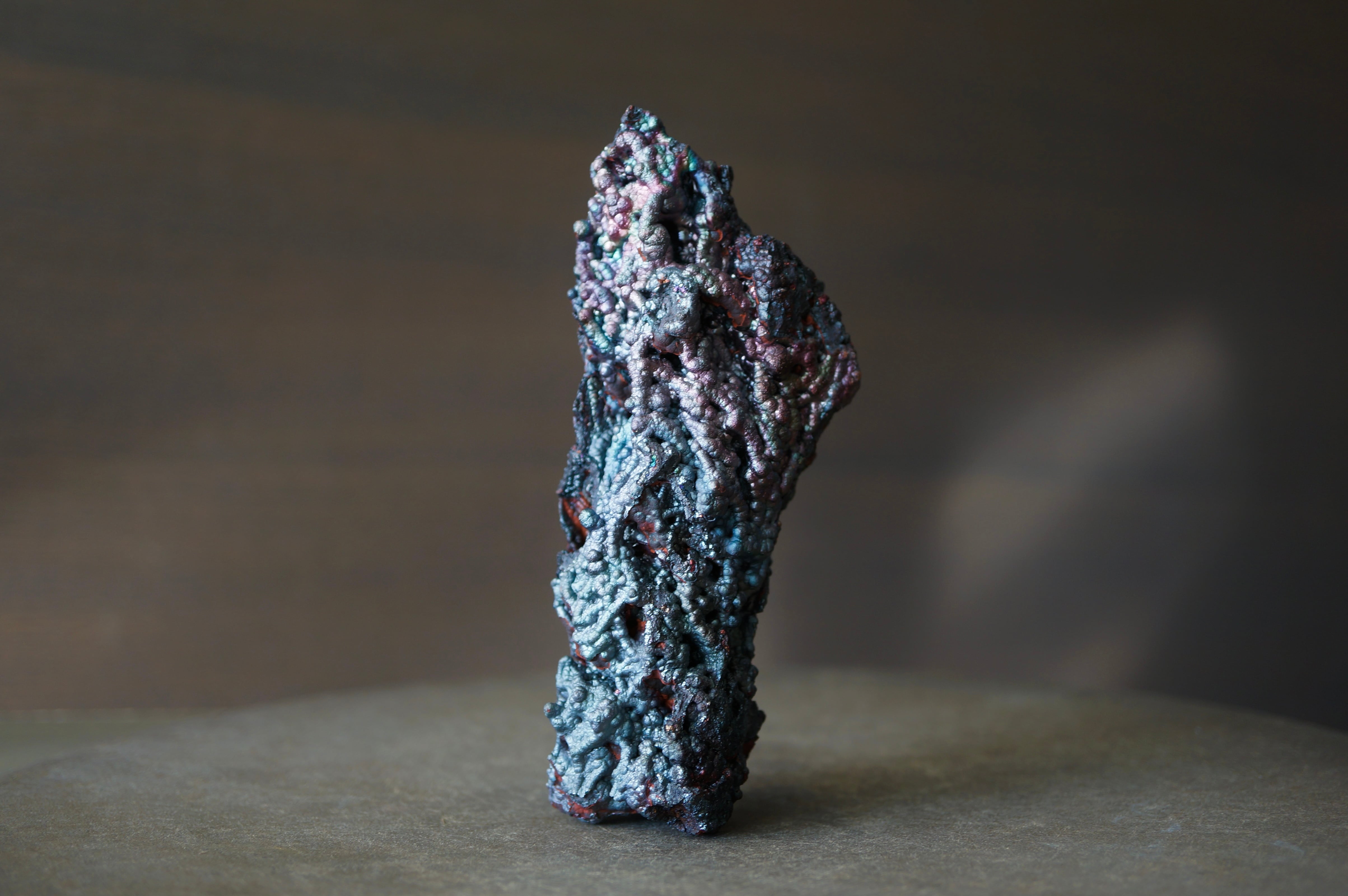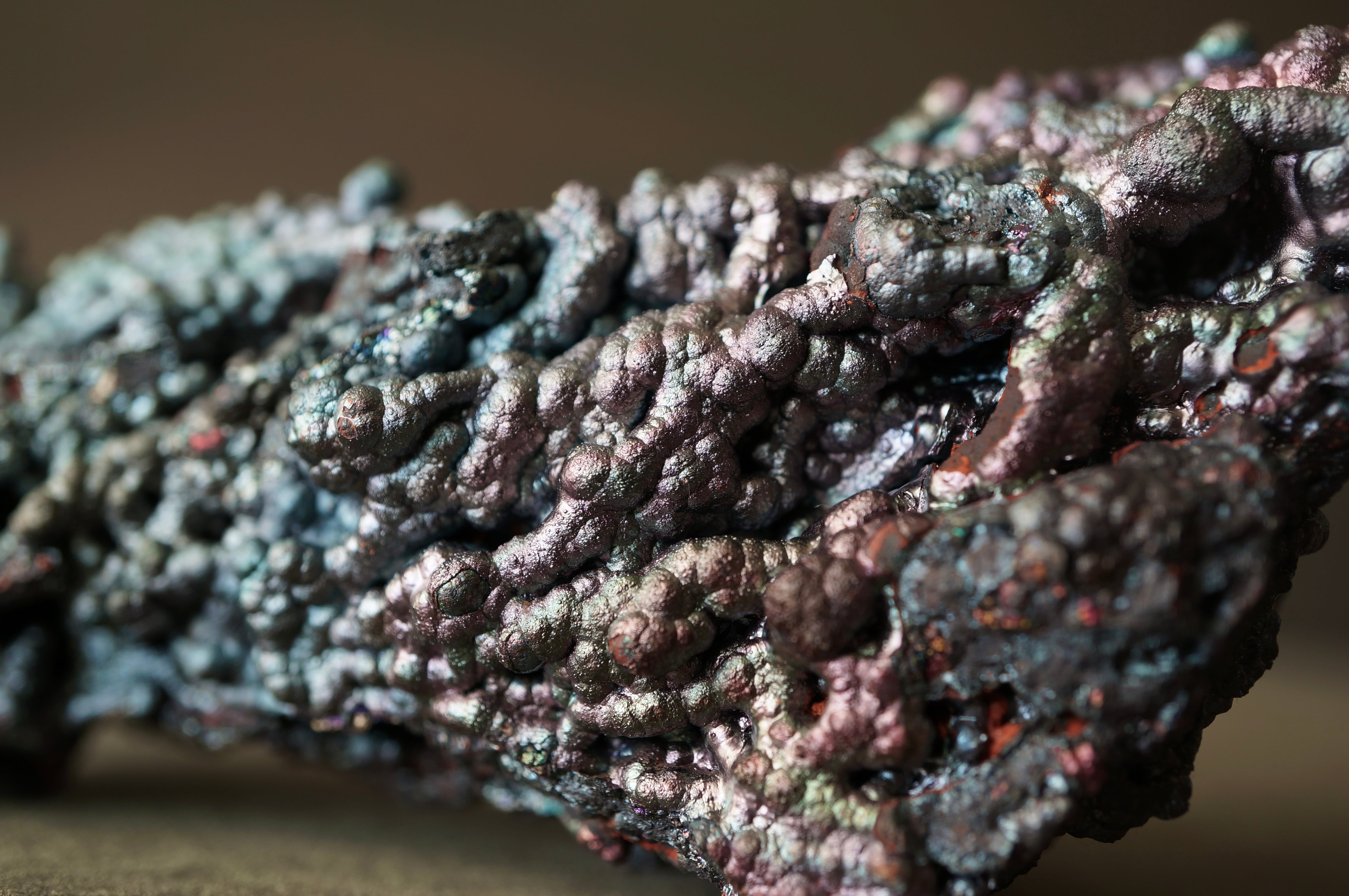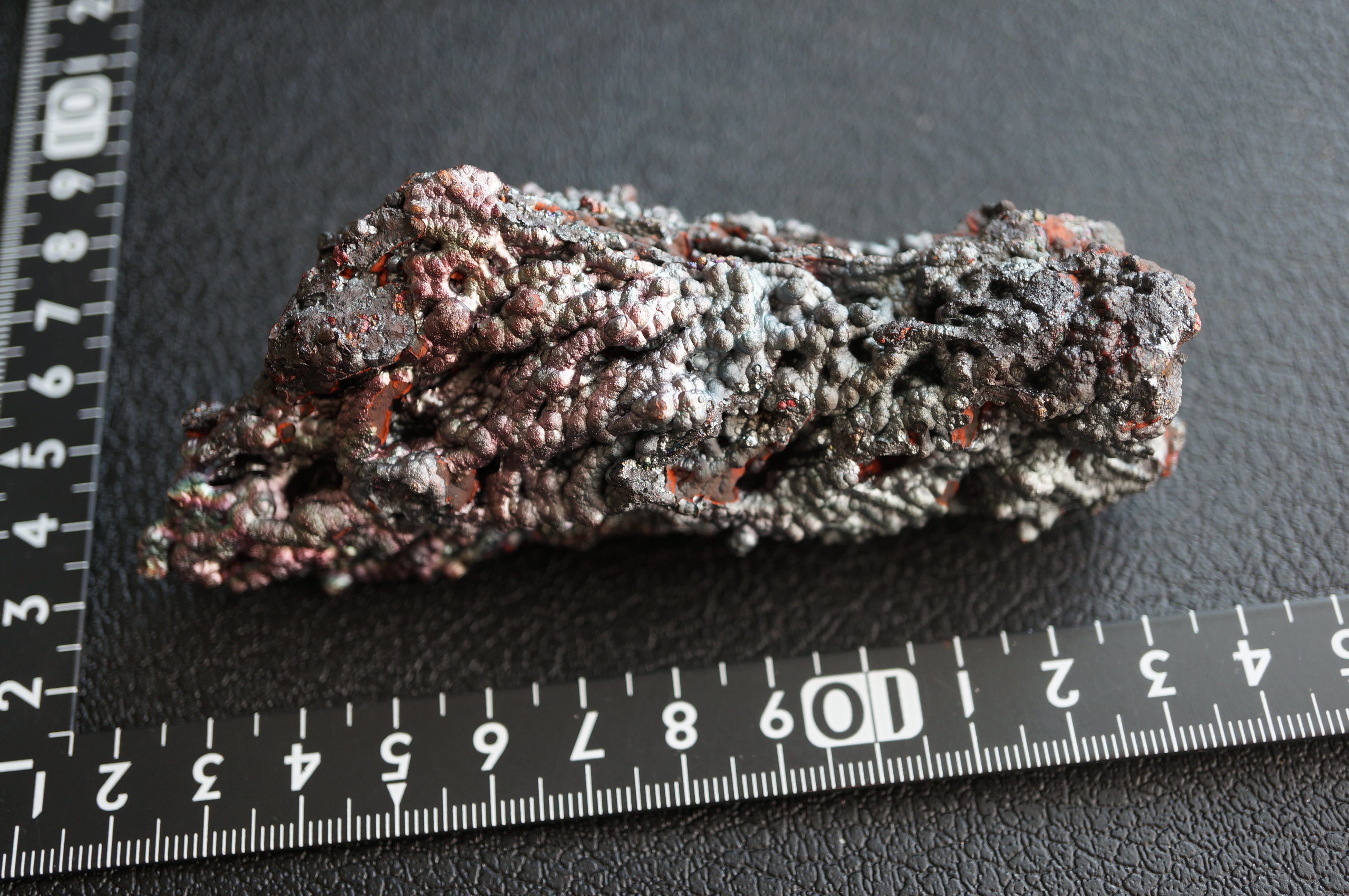 本産地のゲーサイトは鍾乳状、葡萄状の膨らみが連なり、赤紫・緑・青など多彩な光沢を見せる点が大きな特徴です。