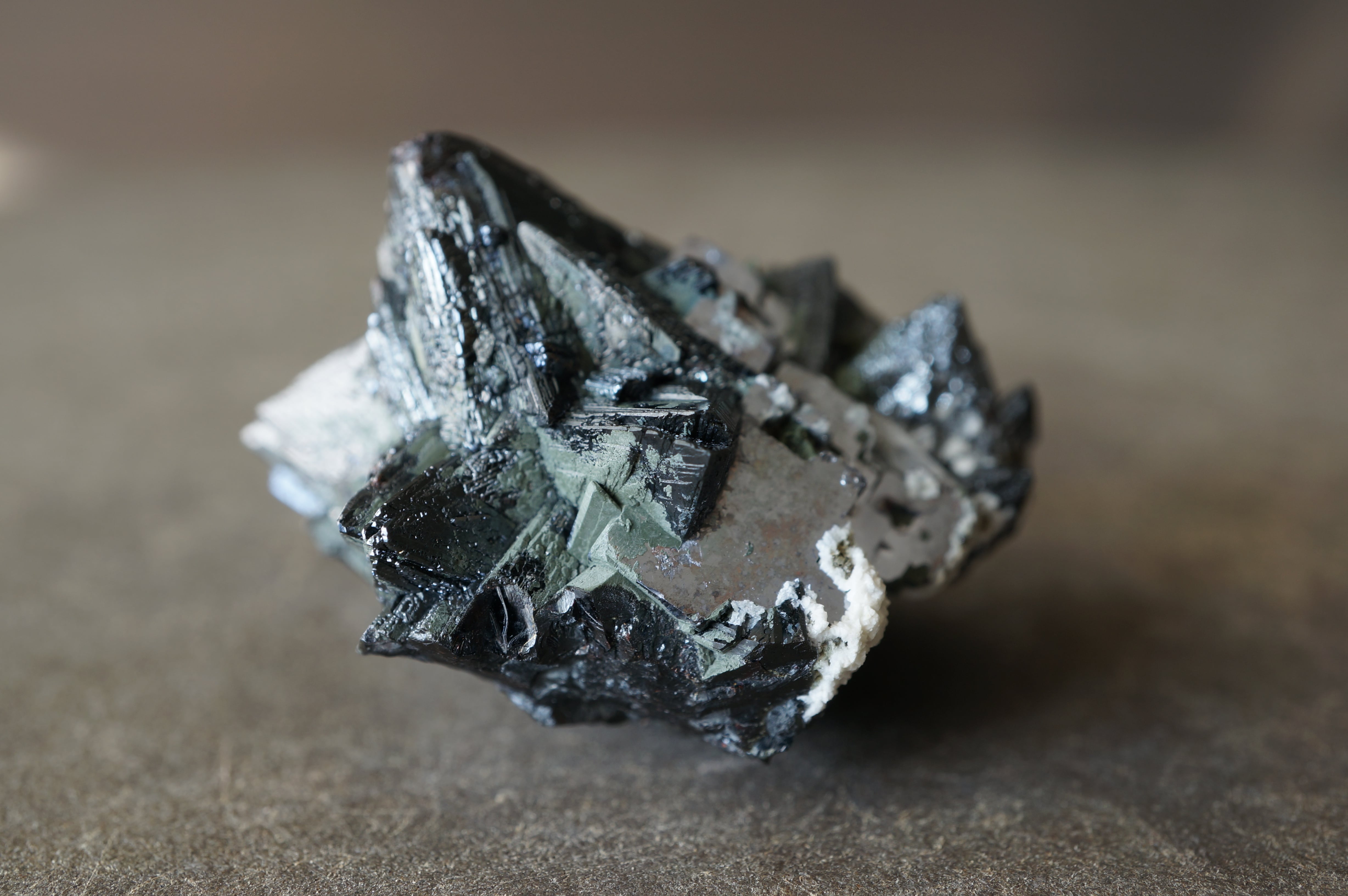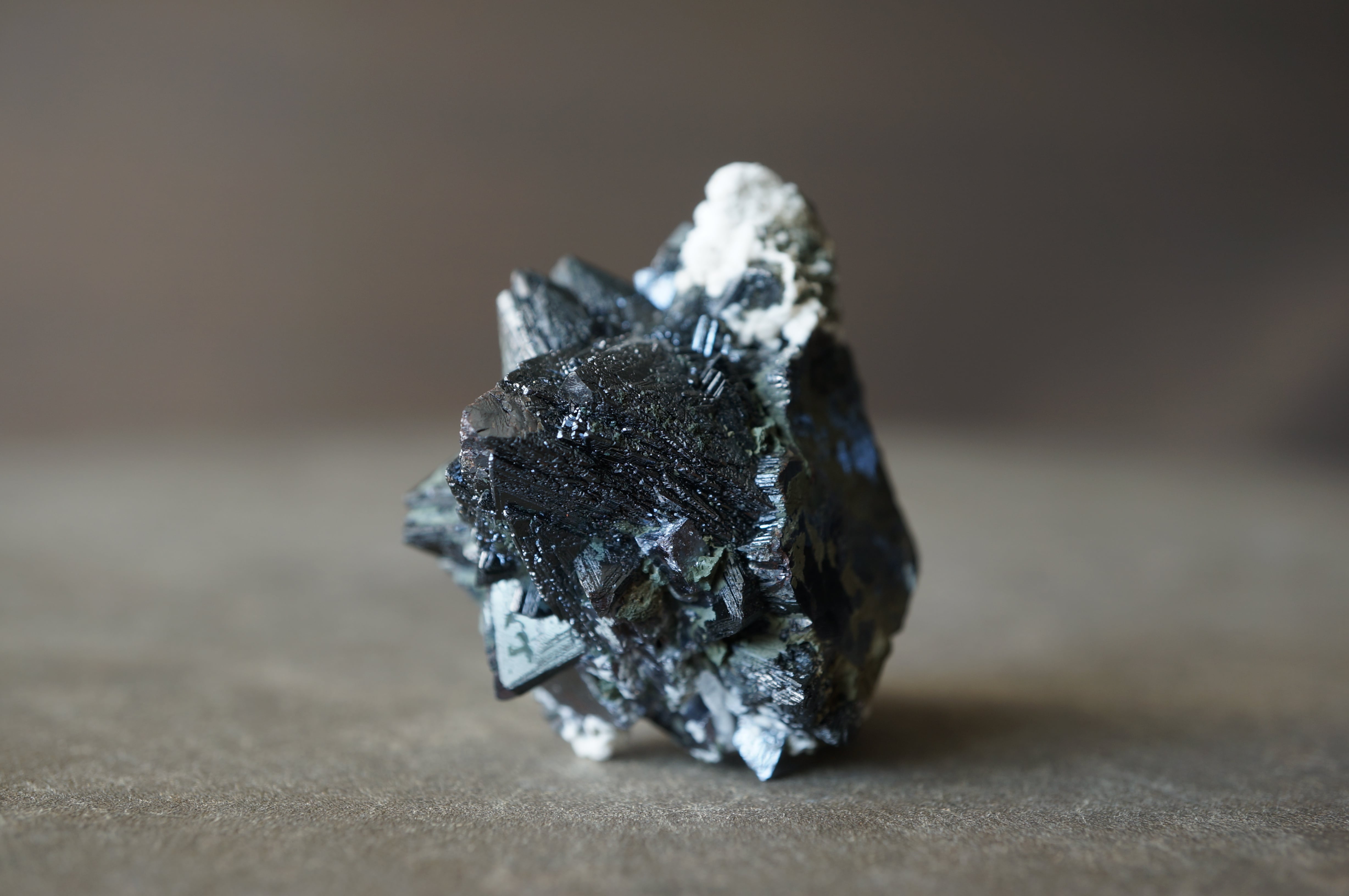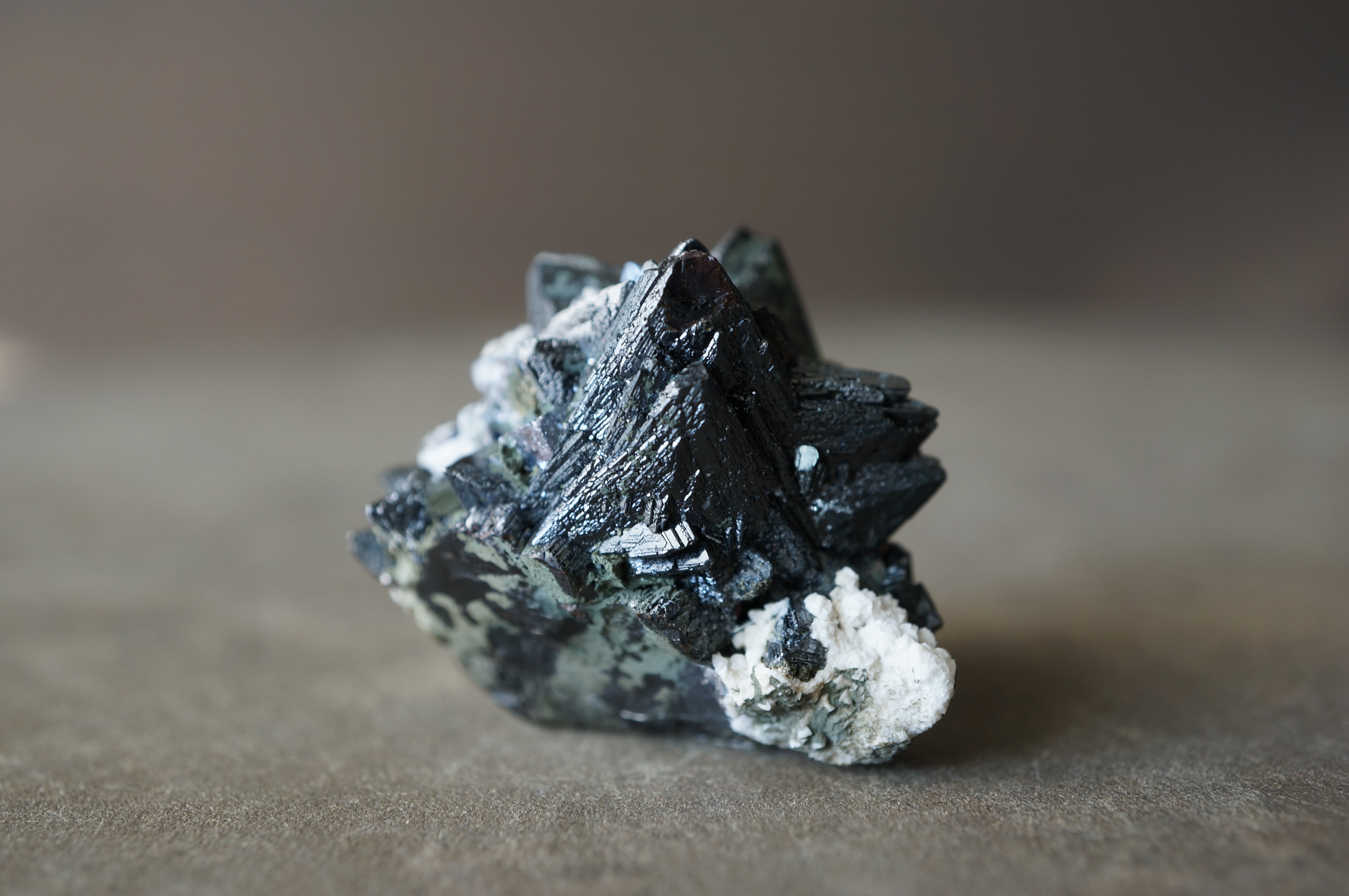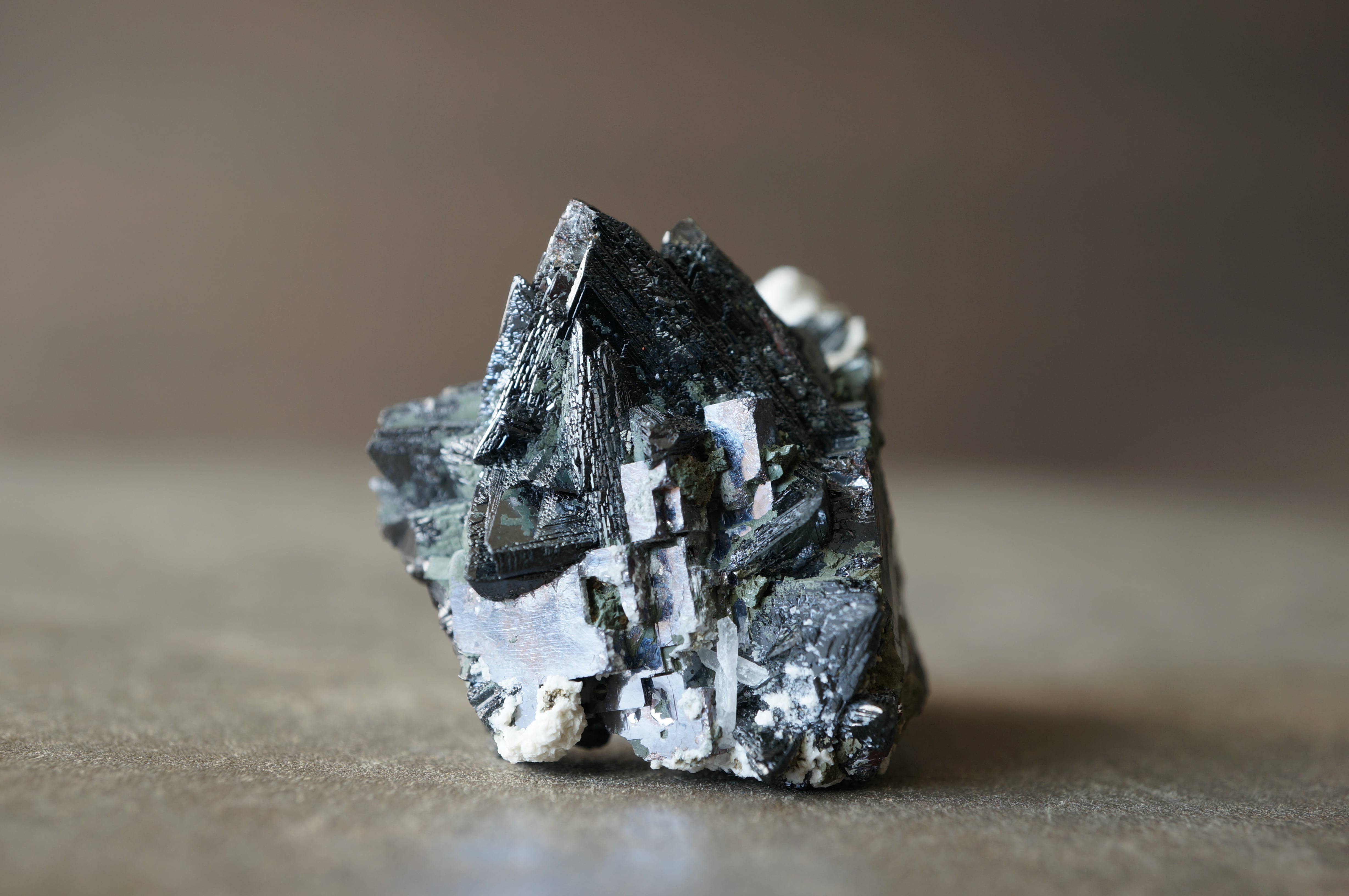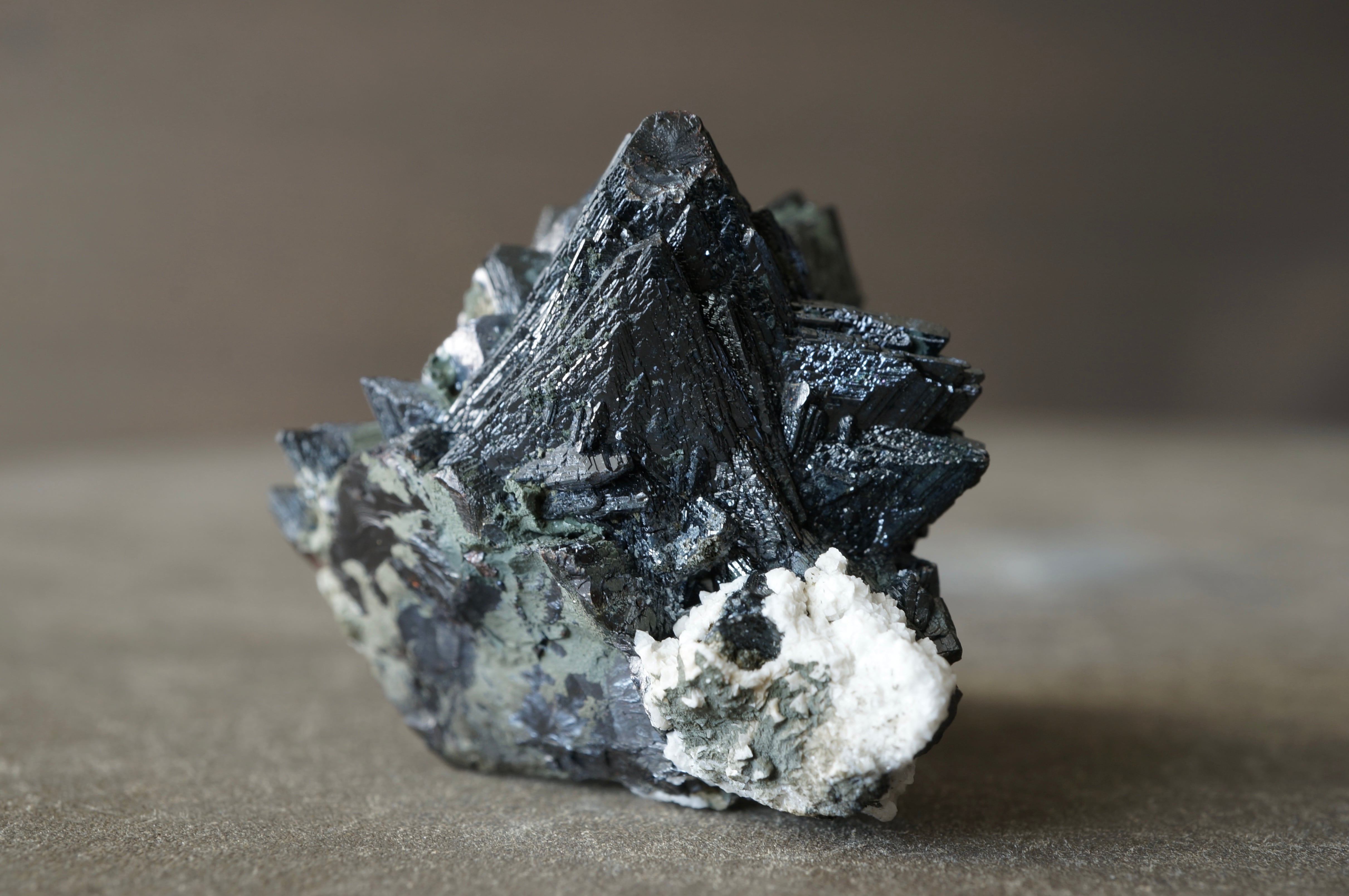 テトラヘドライトは銅とアンチモンを主成分とする希少な硫塩鉱物の一種で、結晶は特徴的な四面体の形をとります。