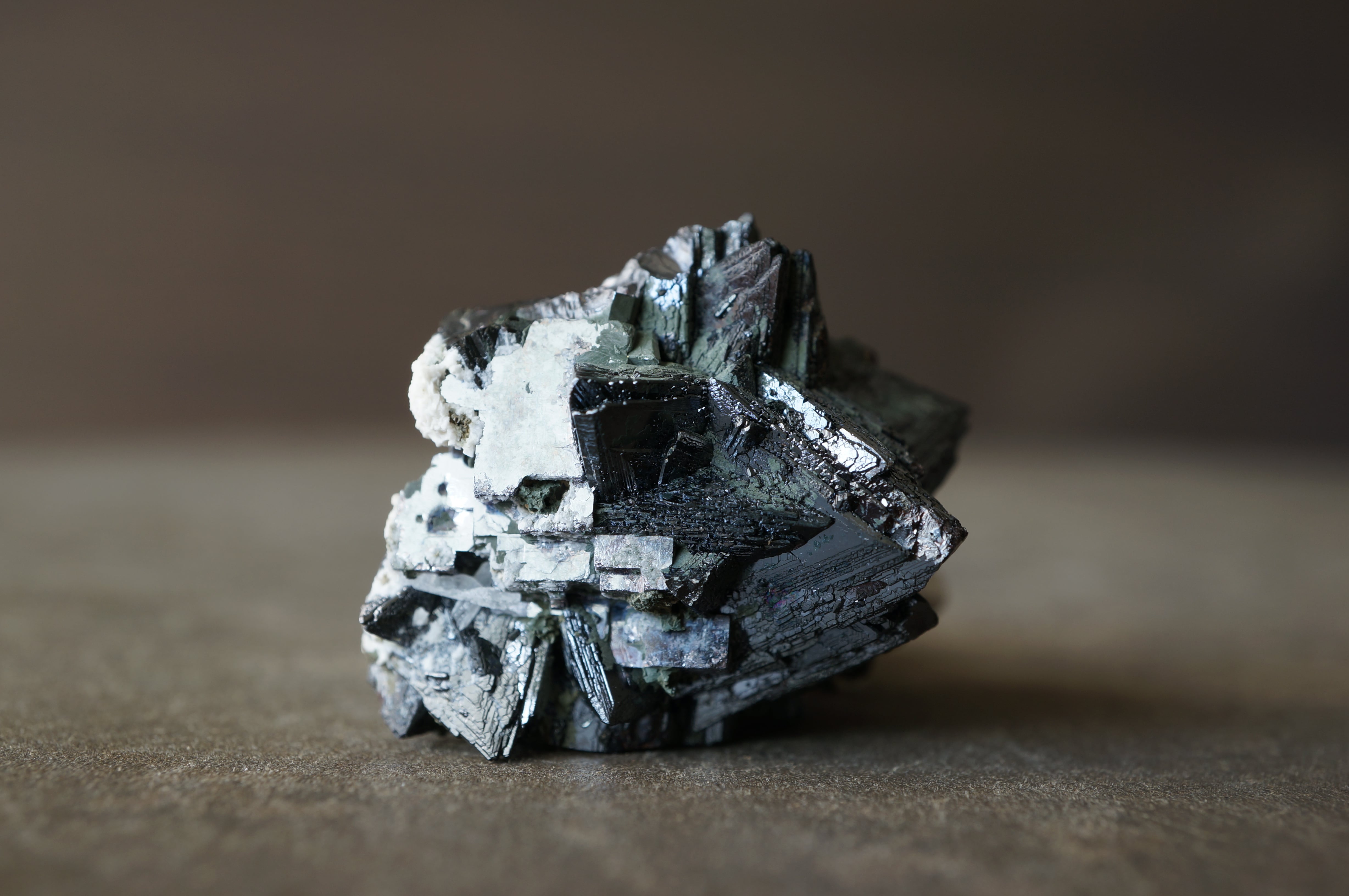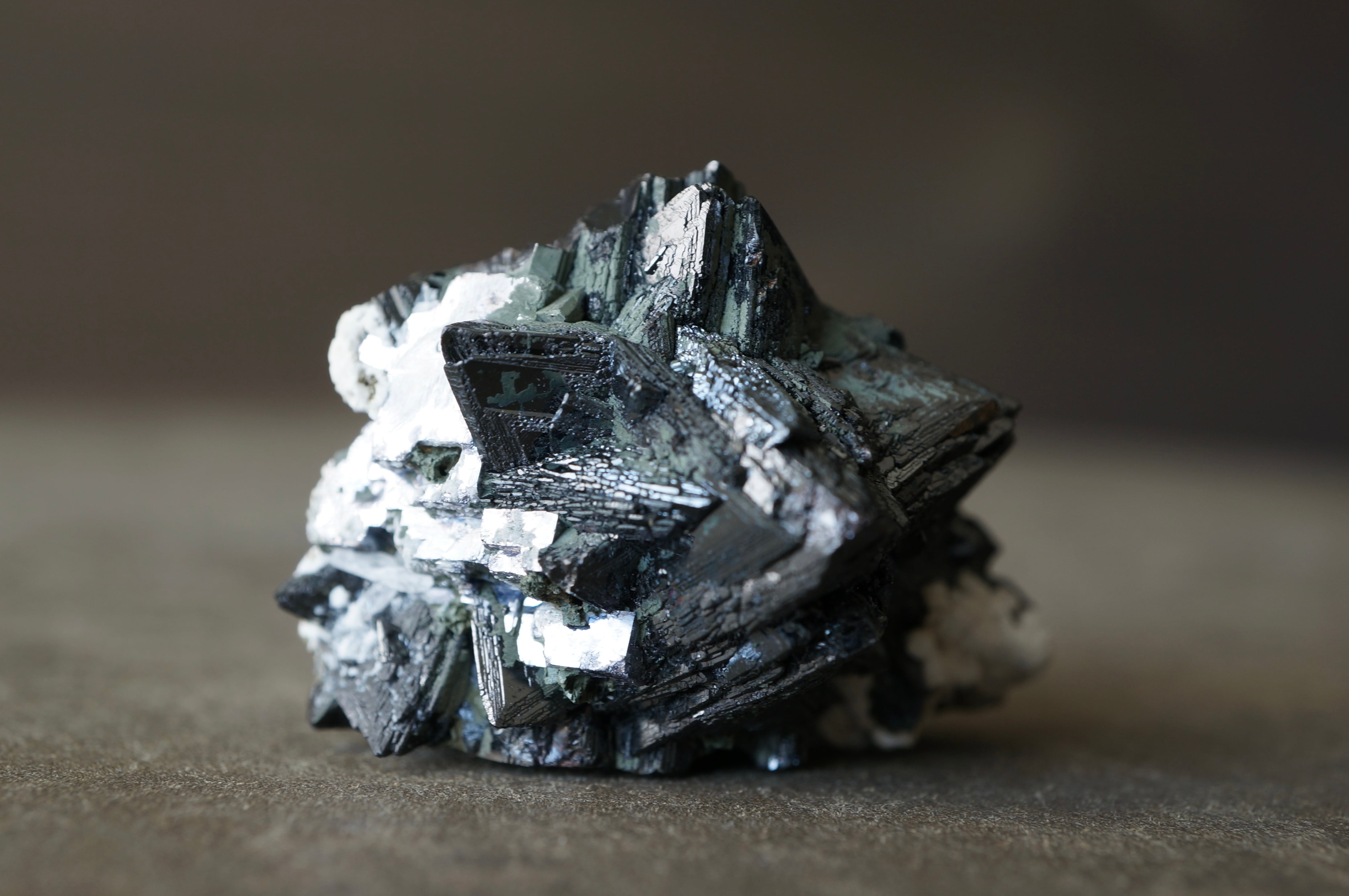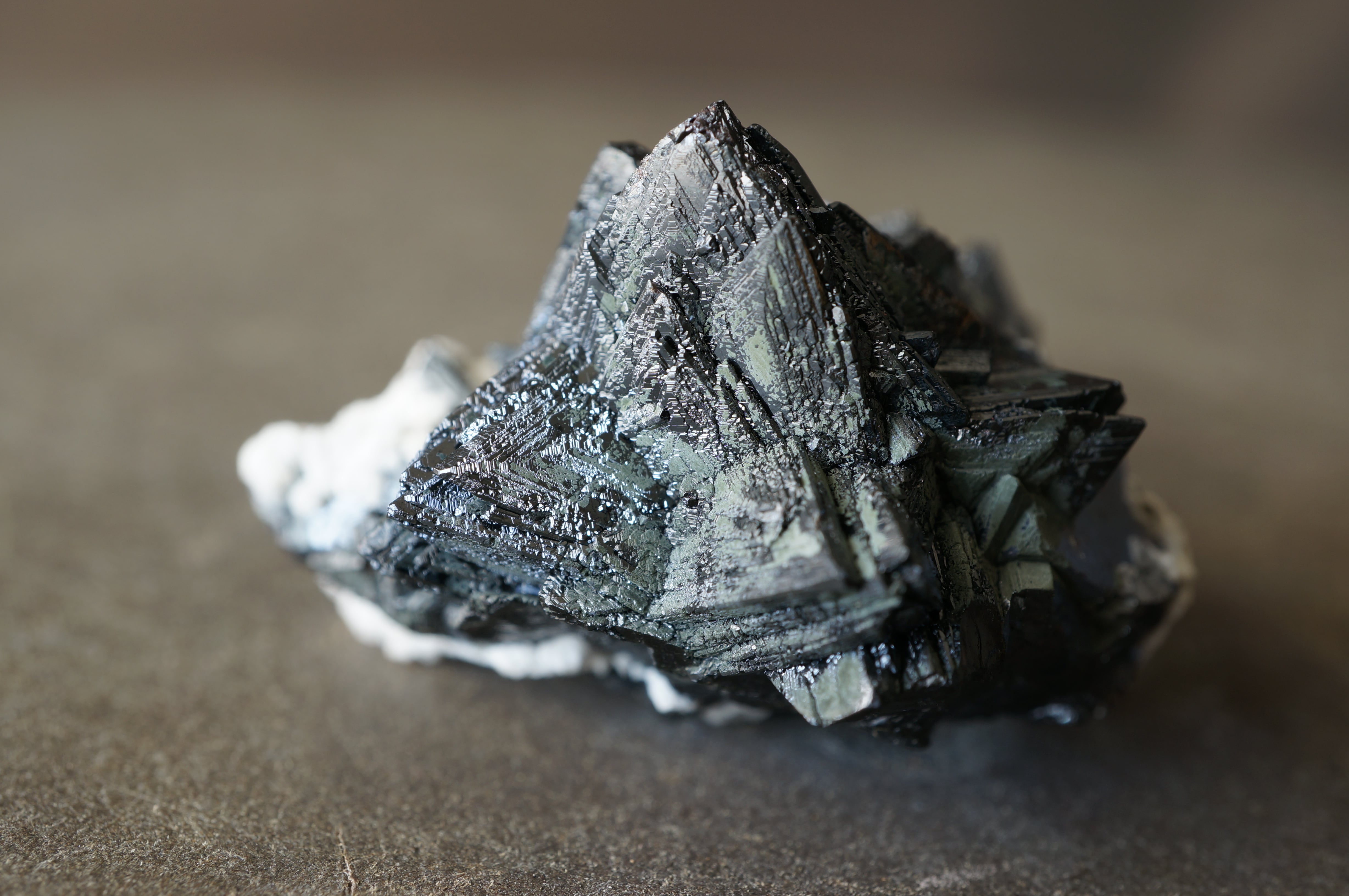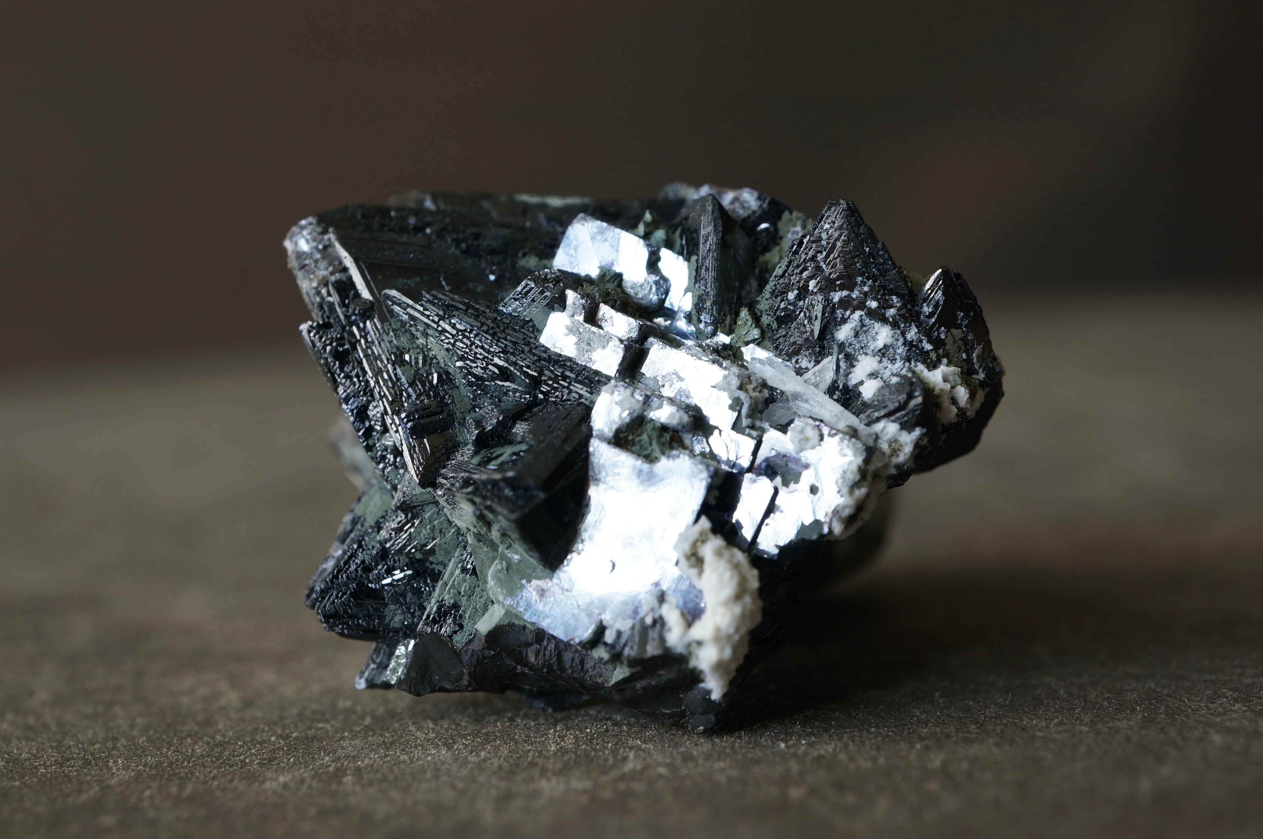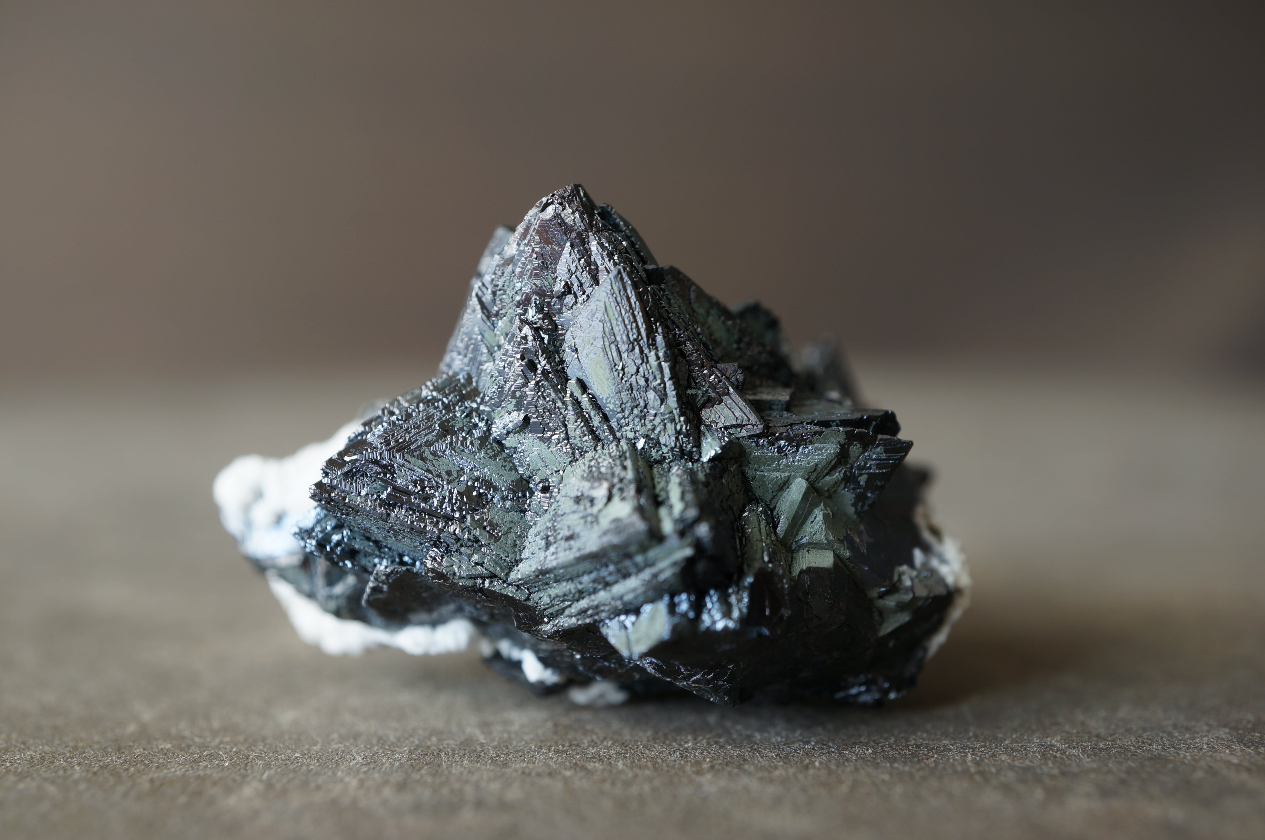 テトラヘドライトは銅とアンチモンを主成分とする希少な硫塩鉱物の一種で、結晶は特徴的な四面体の形をとります。