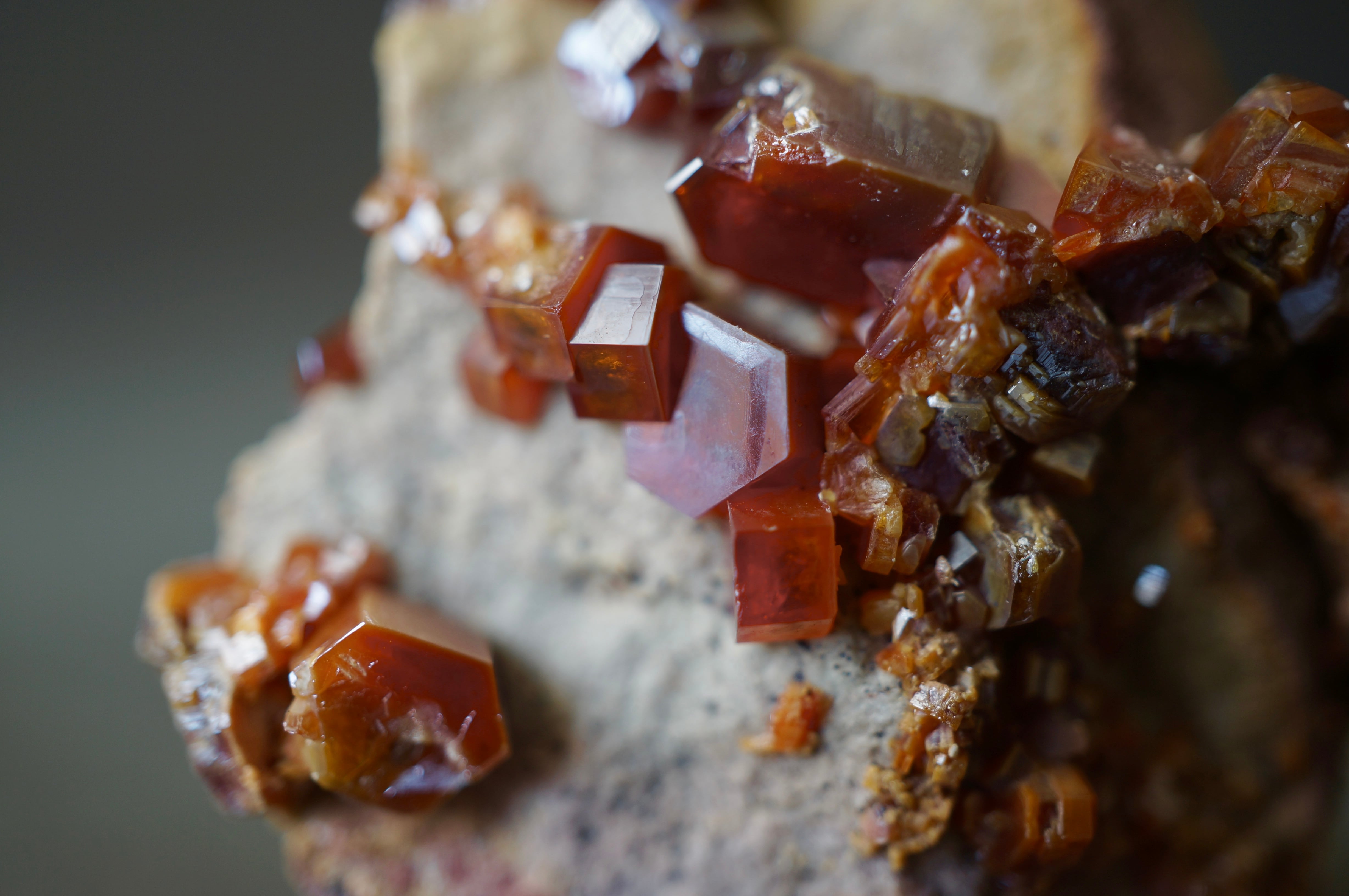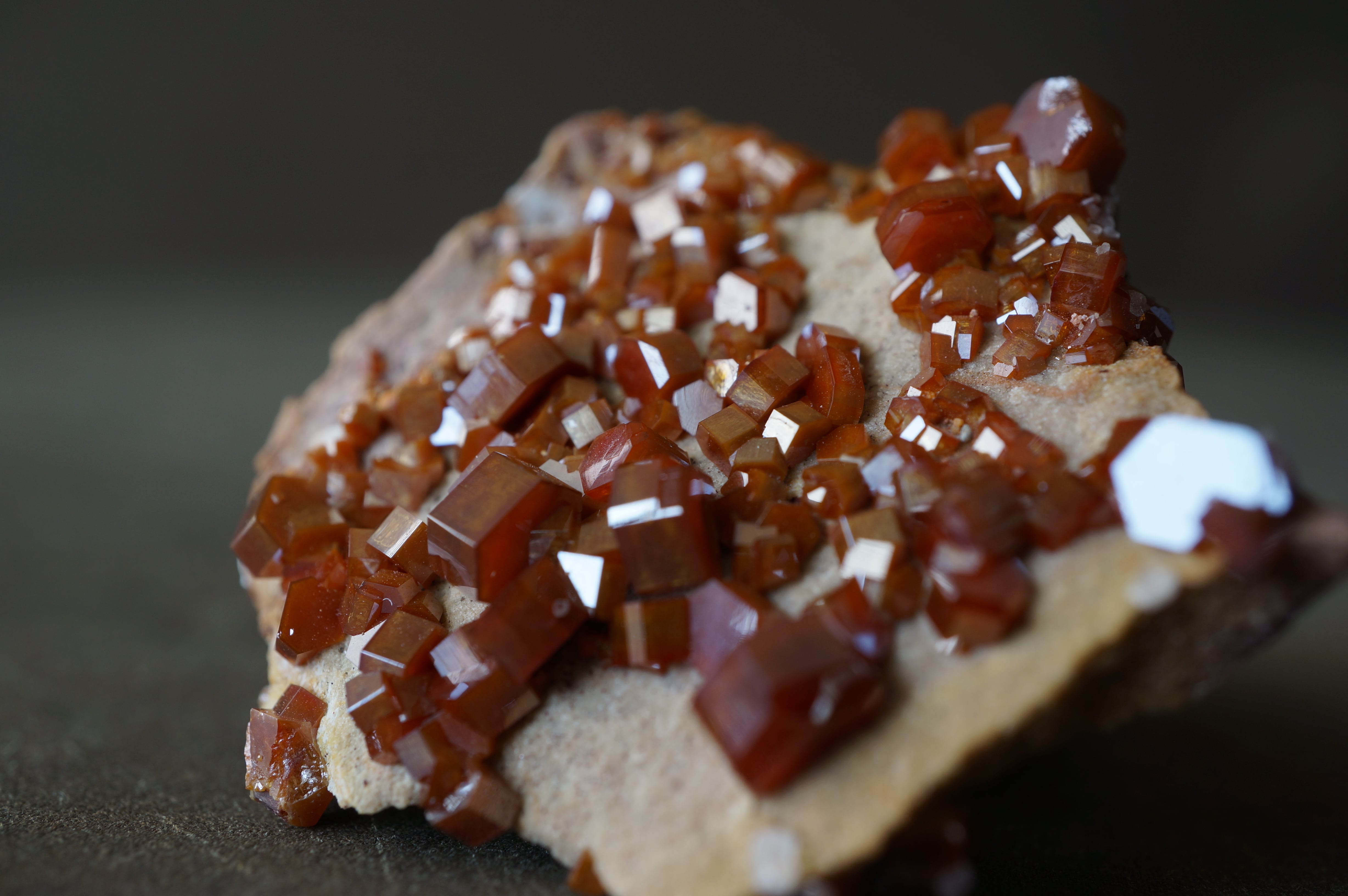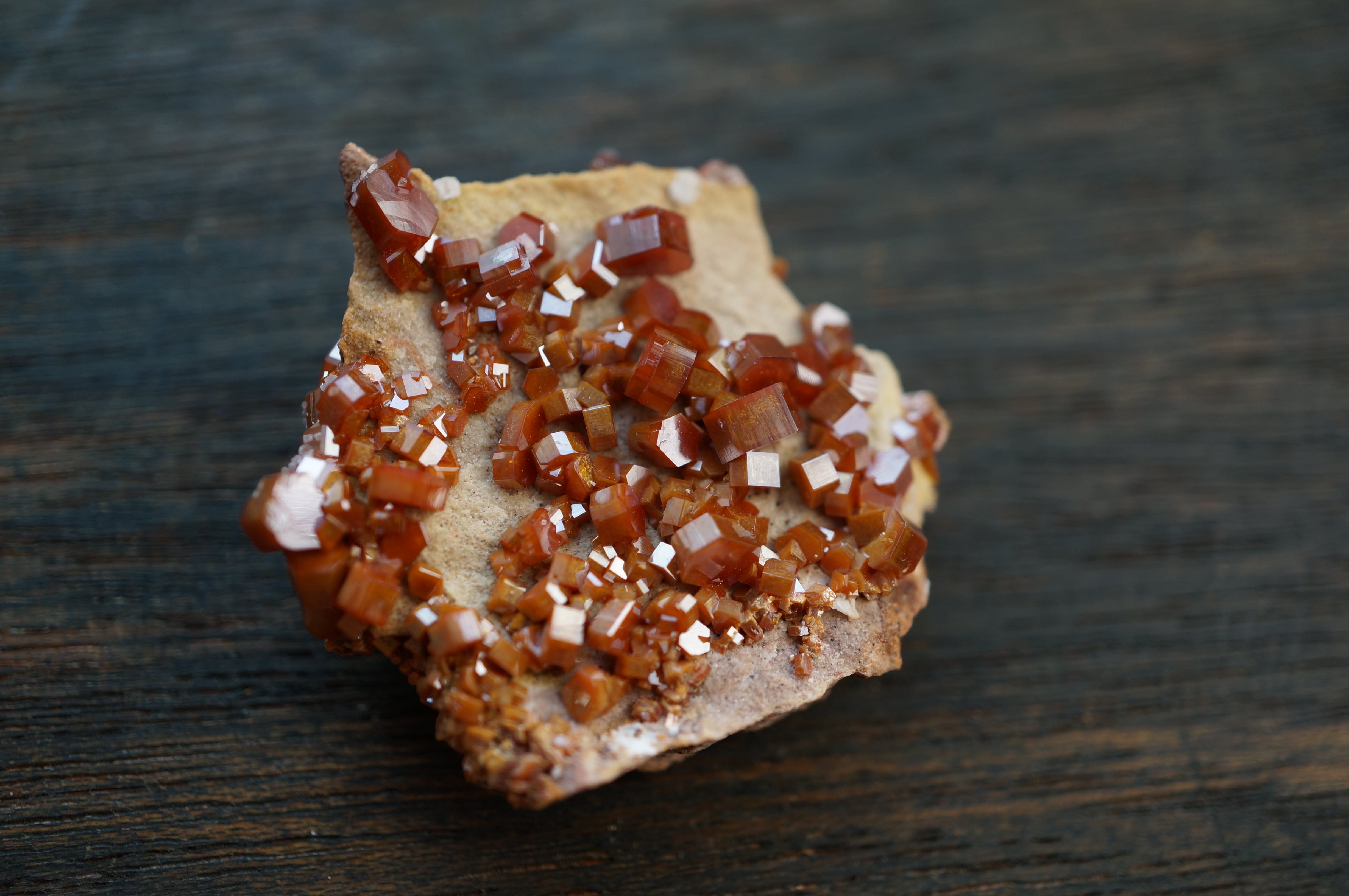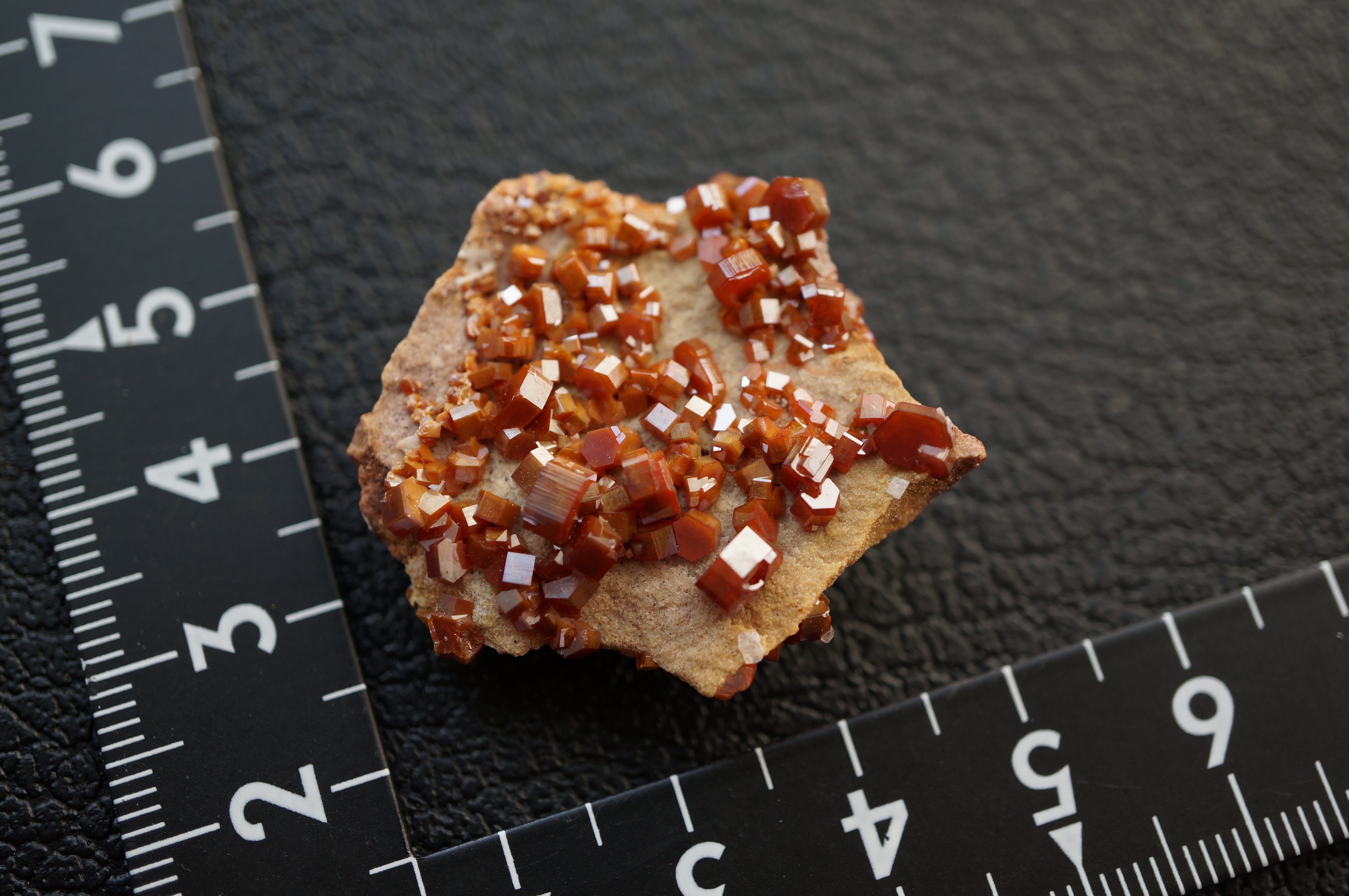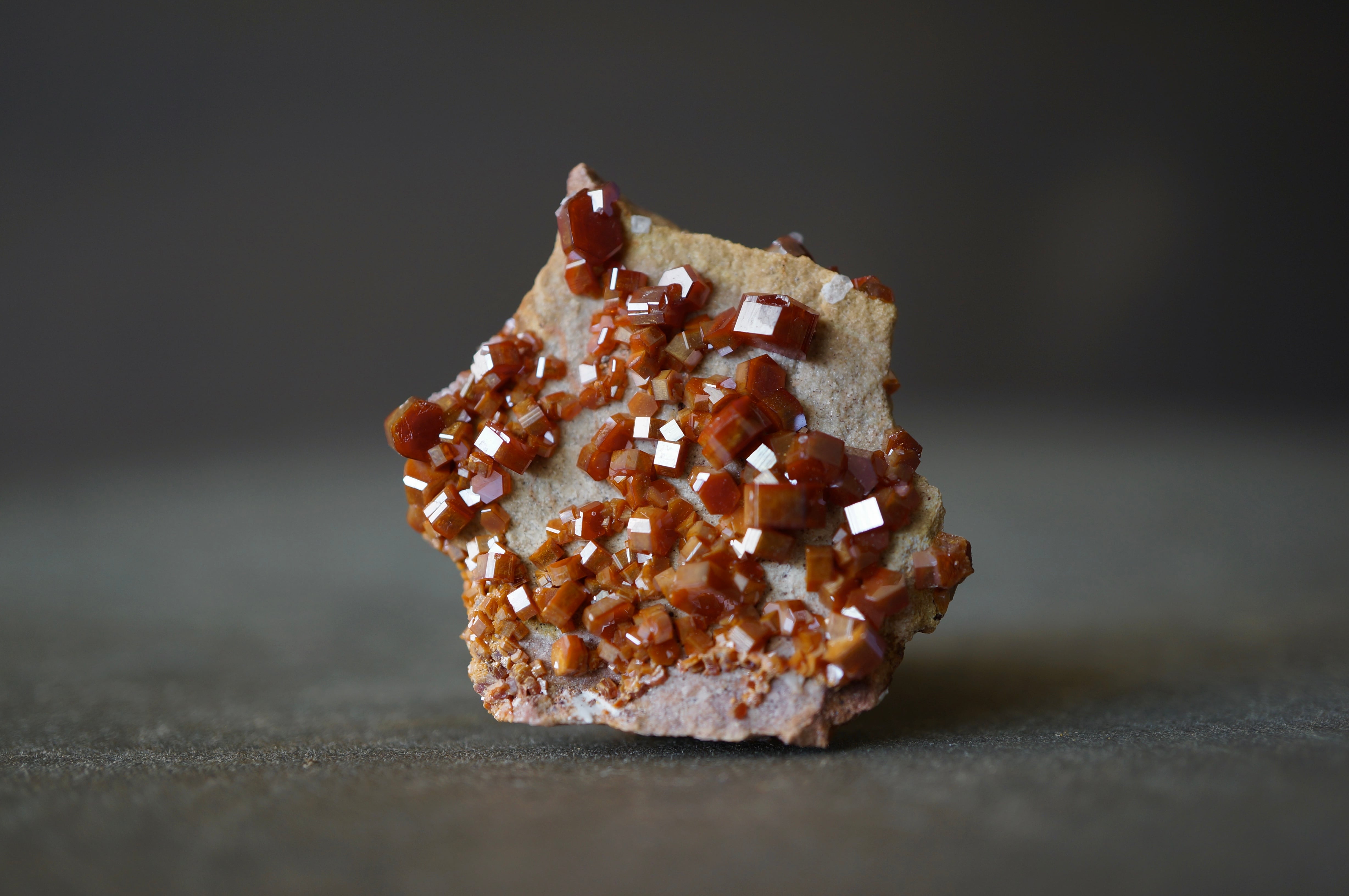 バナジナイトは鉛鉱床の酸化帯に生成するバナジウム鉱物で、六角柱状の結晶を基本とします。