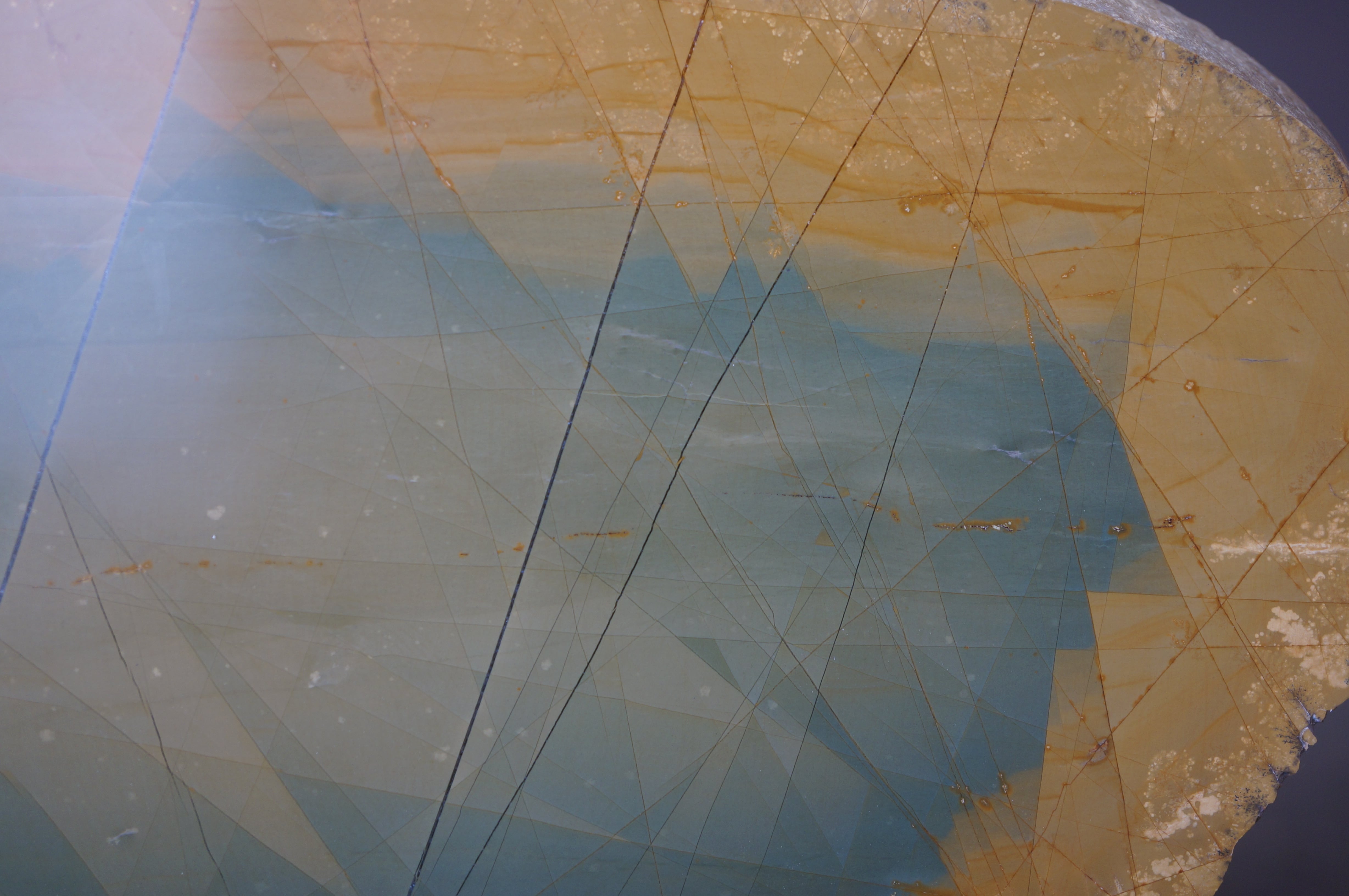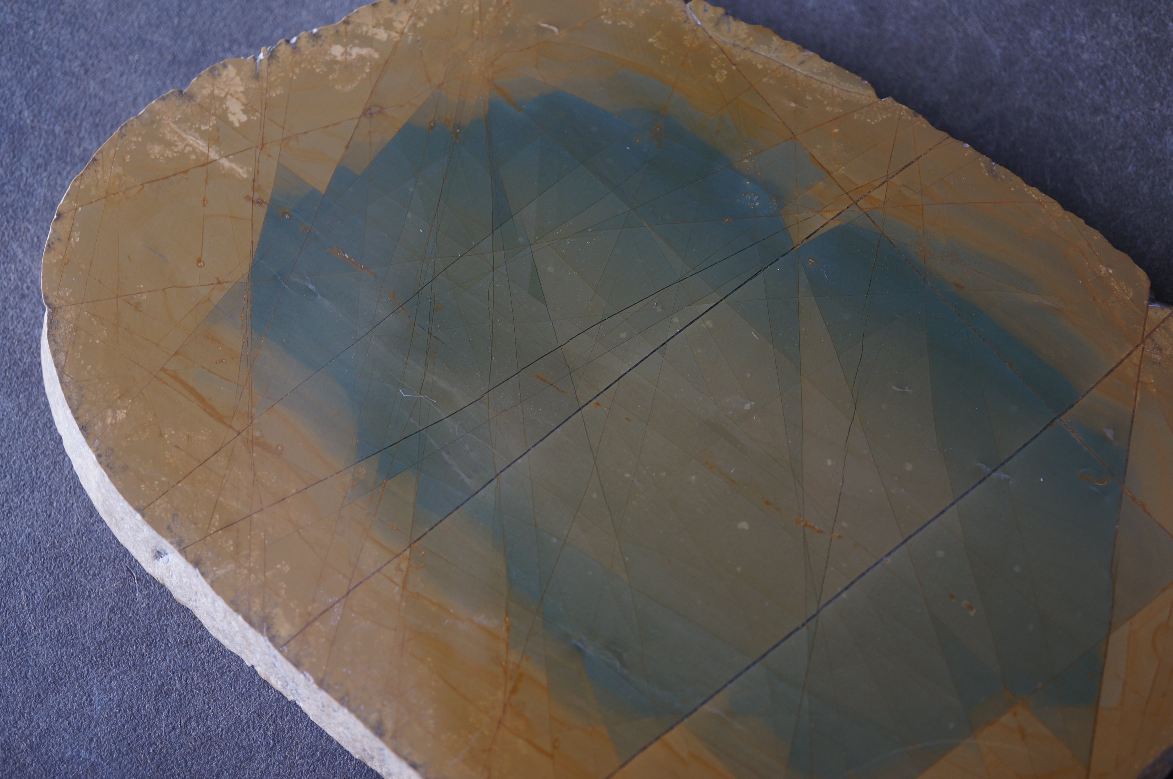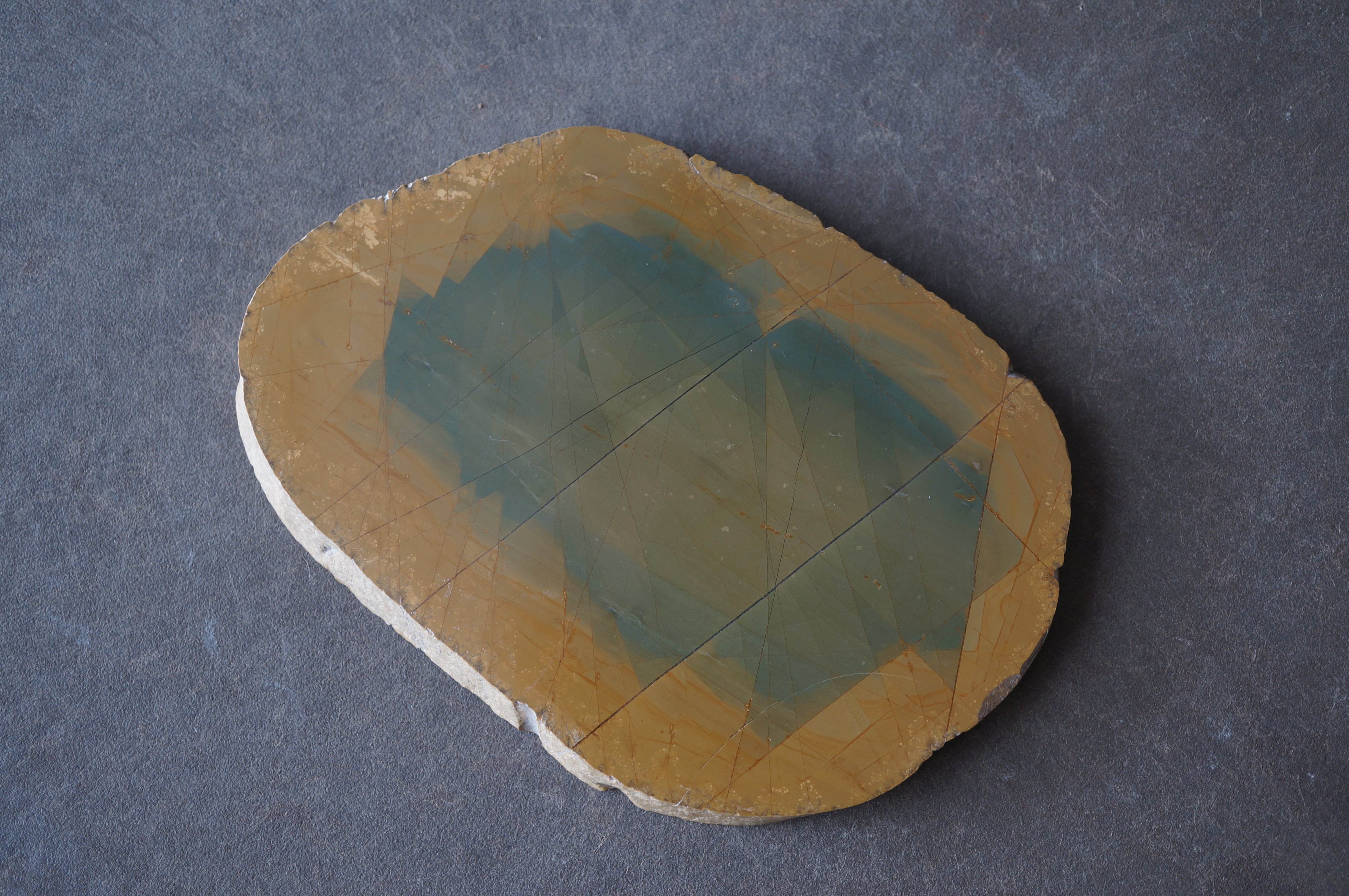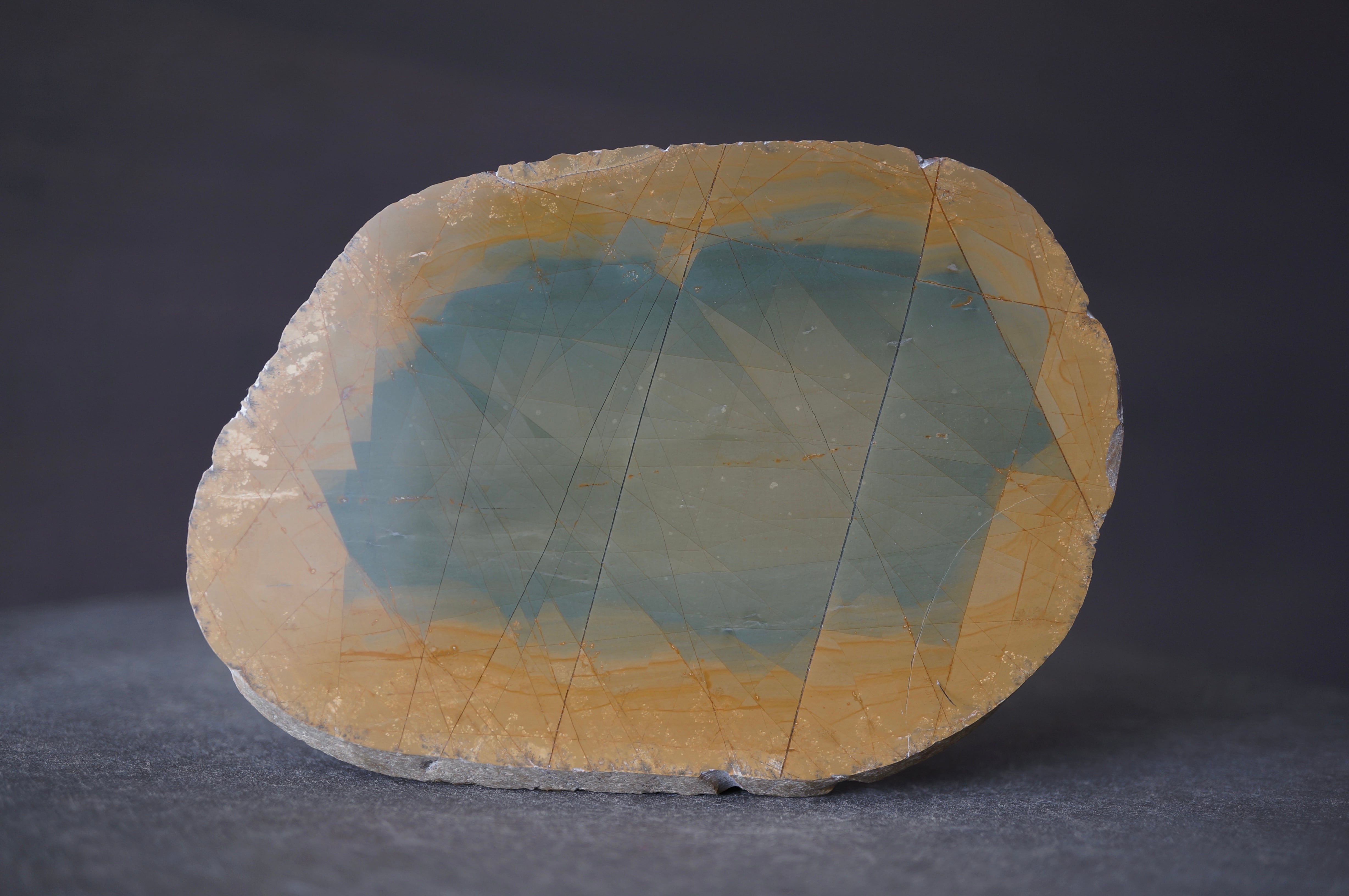 切断・研磨された断面には、褐色から灰色、青みを帯びた線や割れが複雑に重なり、廃墟や都市の遠景、乾いた大地や空を思わせる像が自然に立ち現れます。