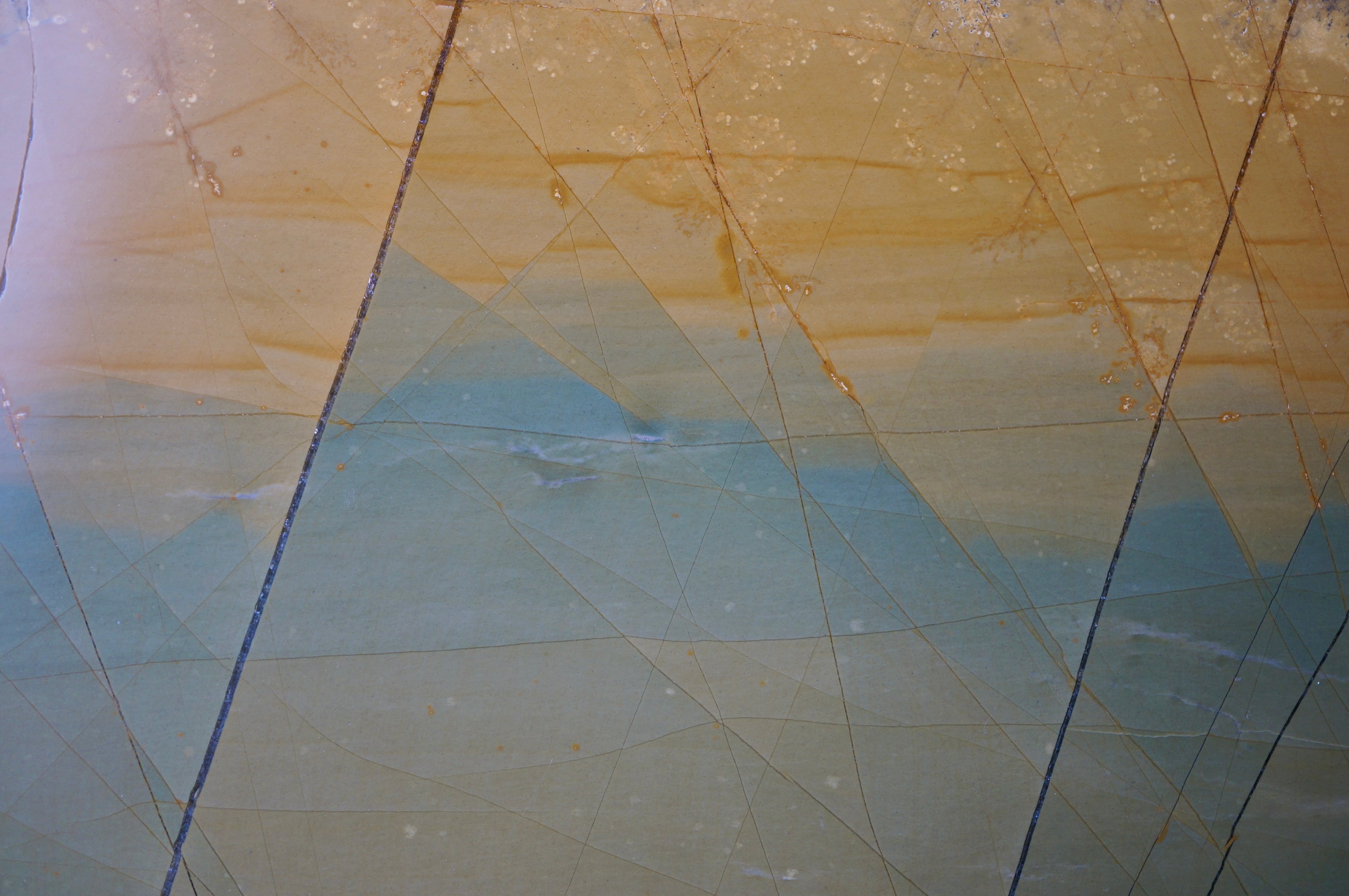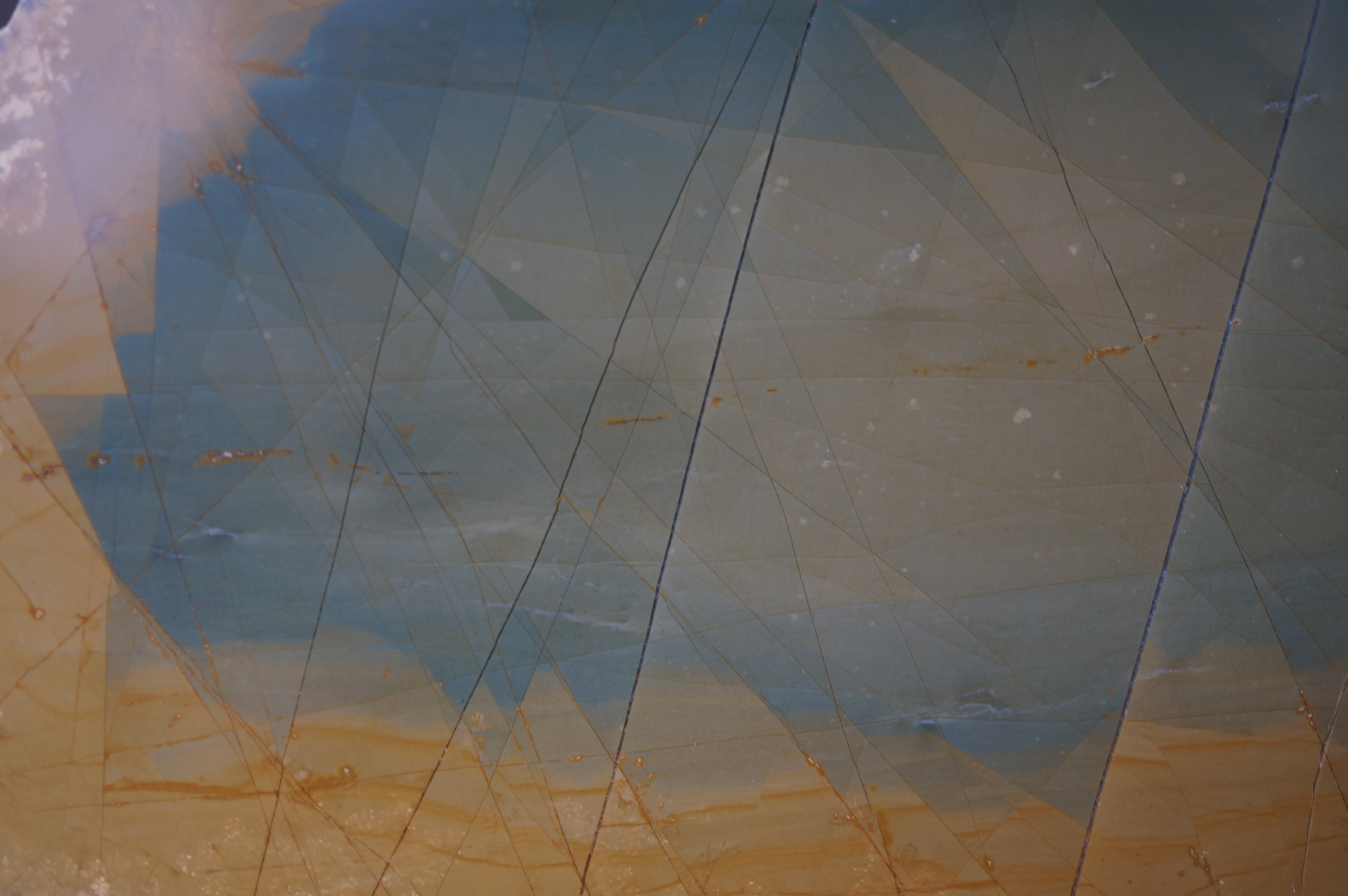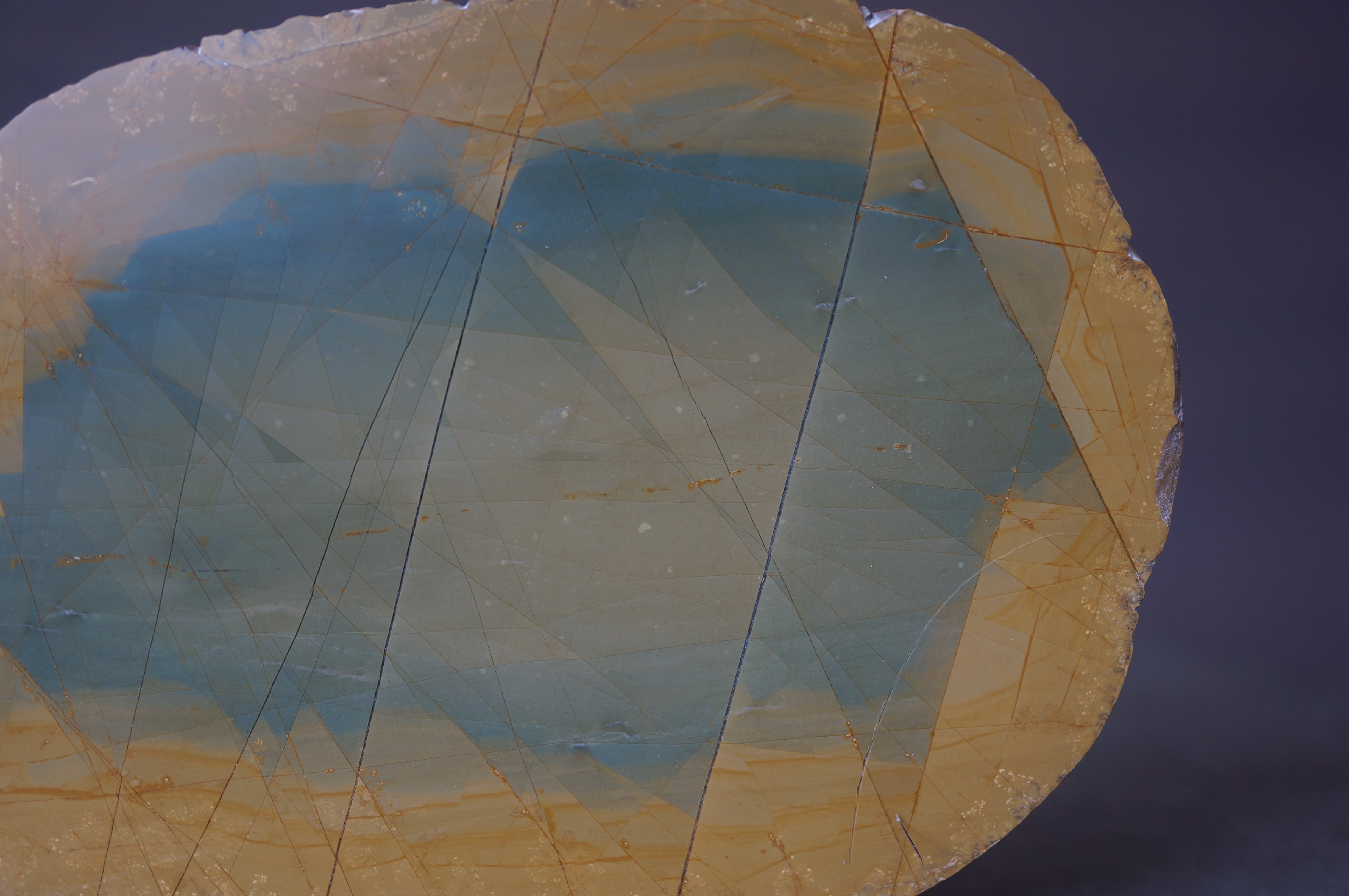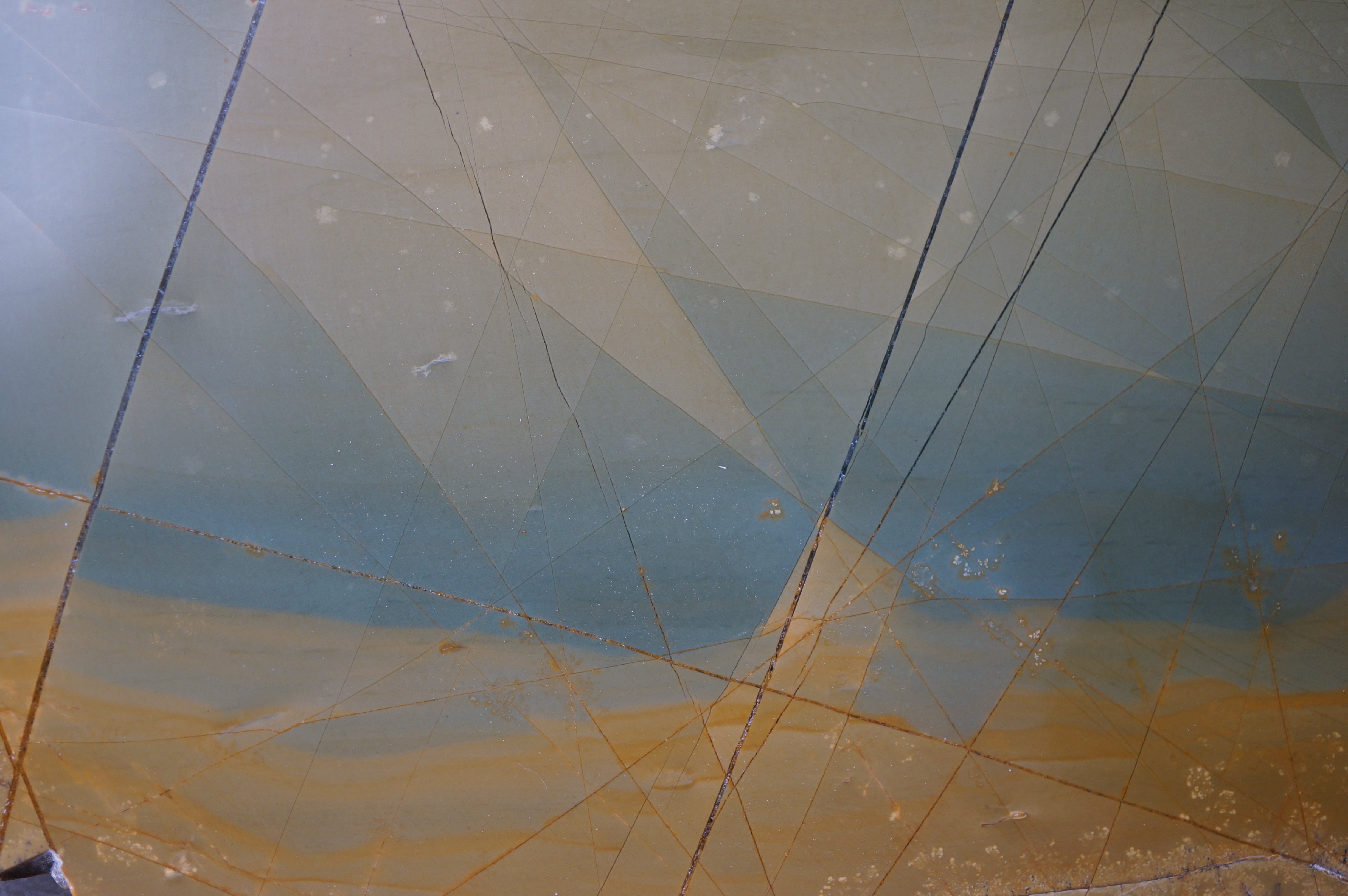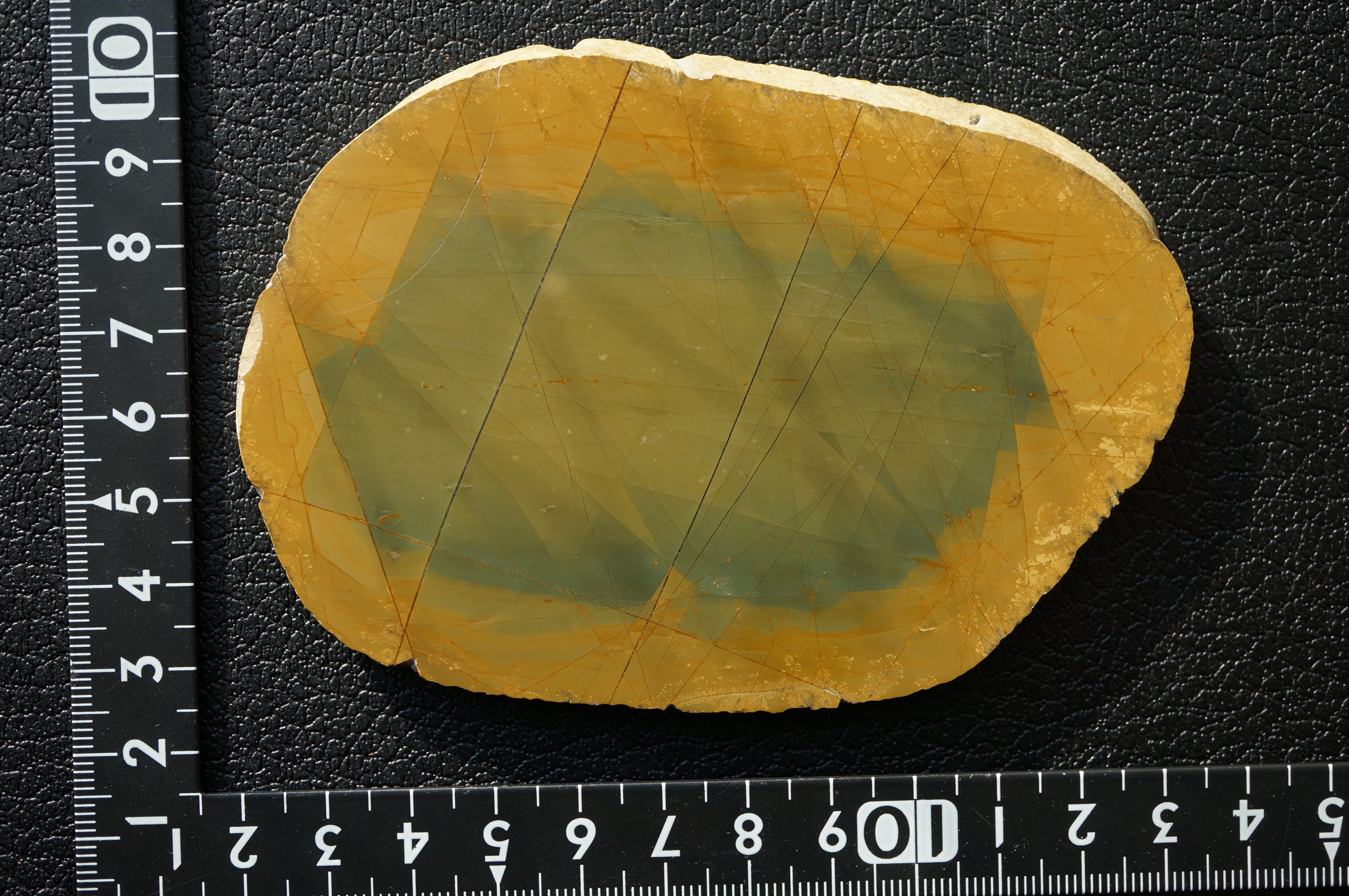 切断・研磨された断面には、褐色から灰色、青みを帯びた線や割れが複雑に重なり、廃墟や都市の遠景、乾いた大地や空を思わせる像が自然に立ち現れます。