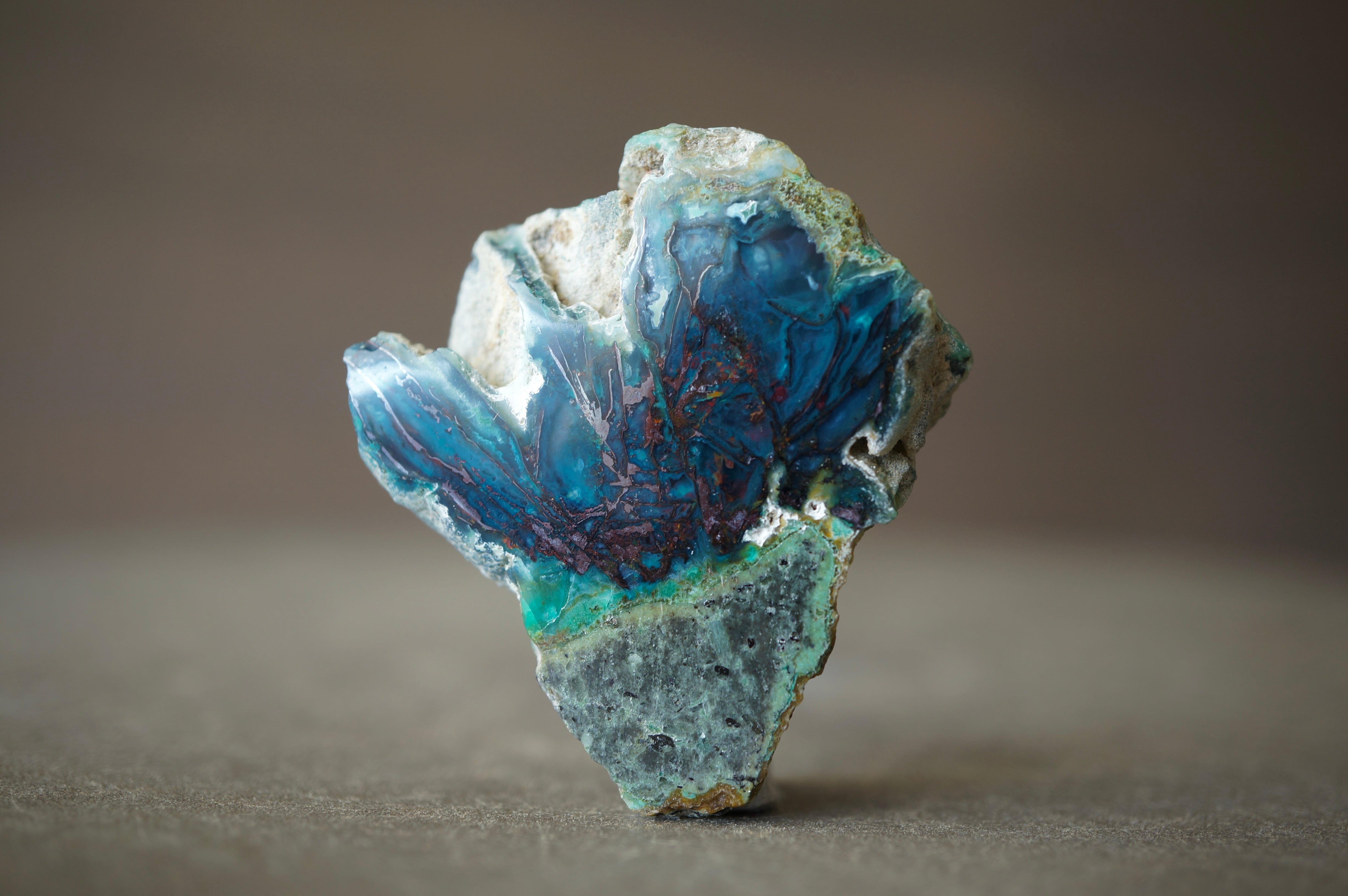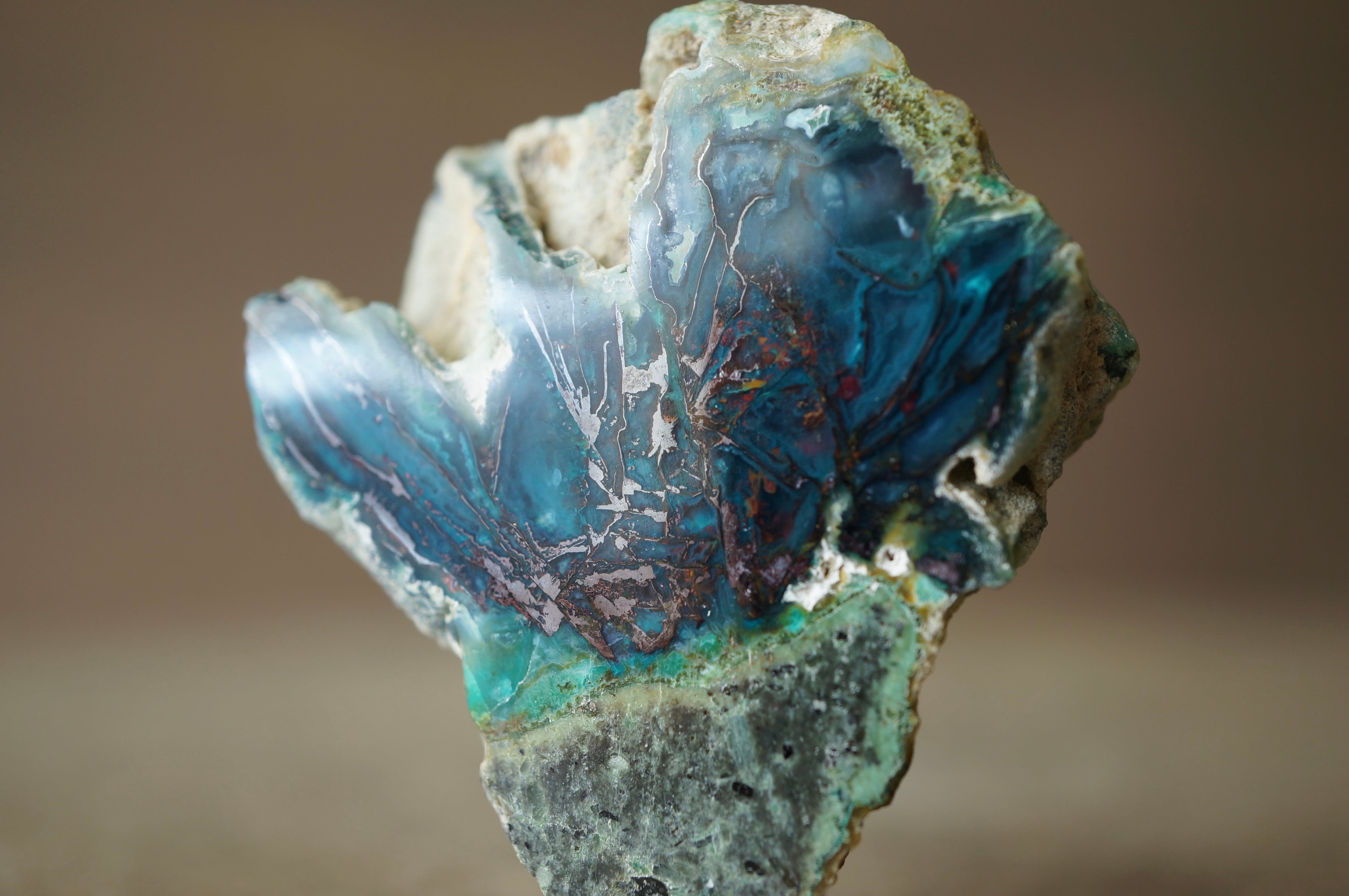 太古の木が長い時間をかけて珪化する過程で、銅を含む鉱液によって鮮やかに彩られました。