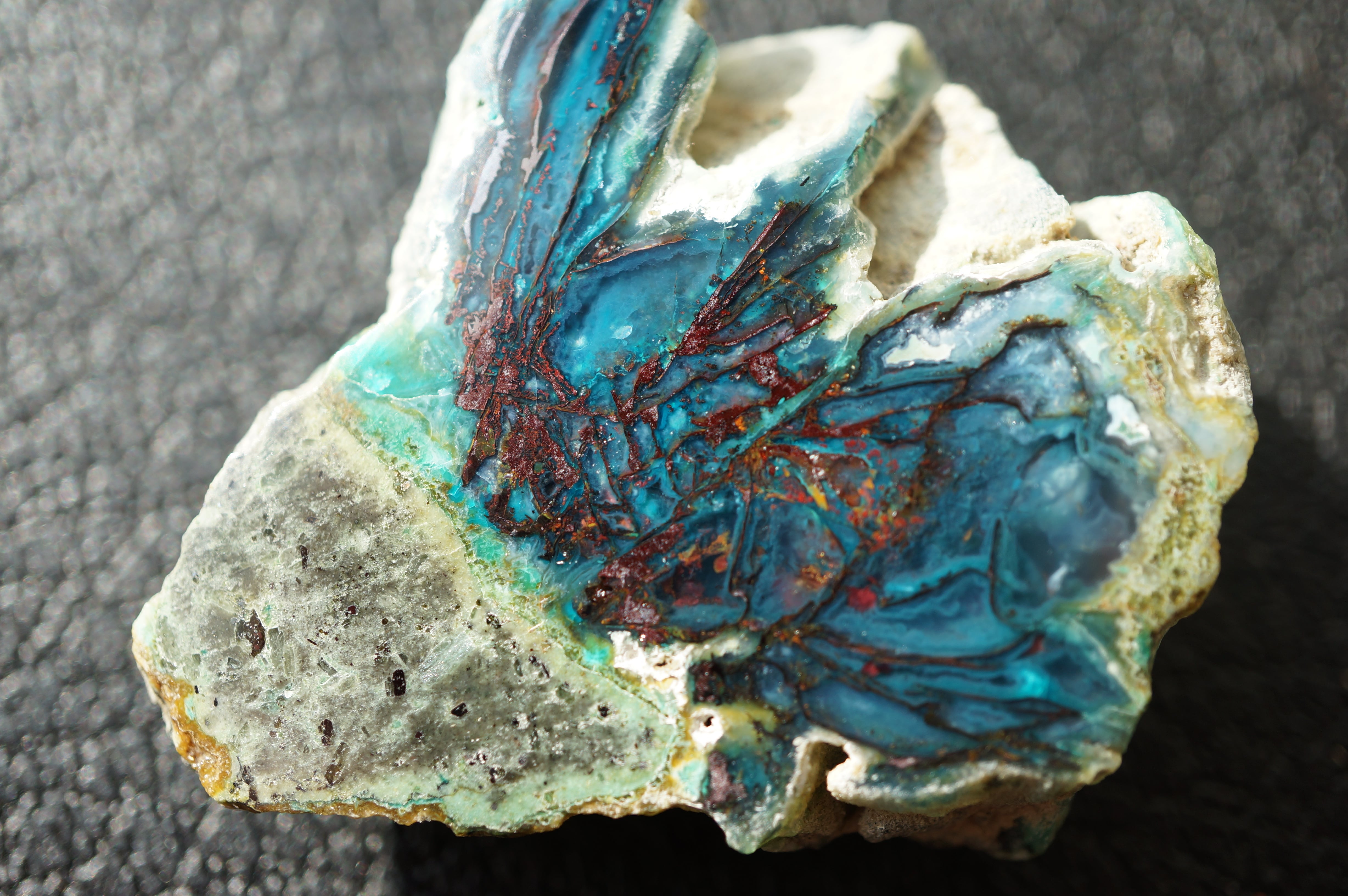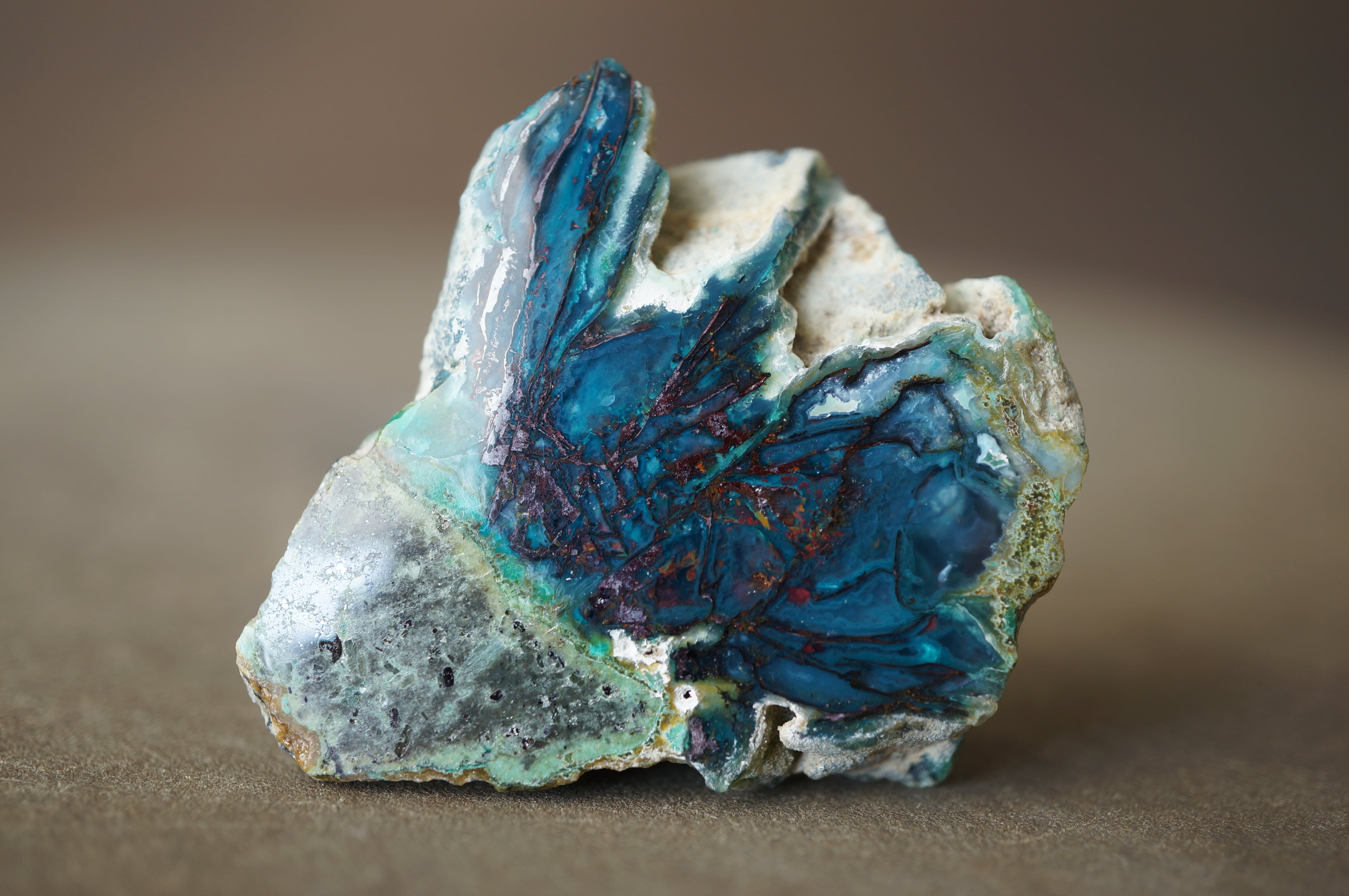 研磨された表面には、深い湖を覗くような奥行きのある色彩と、きらびやかな金属光沢が混在し、他の鉱物では得られない独特の視覚効果を見せています。