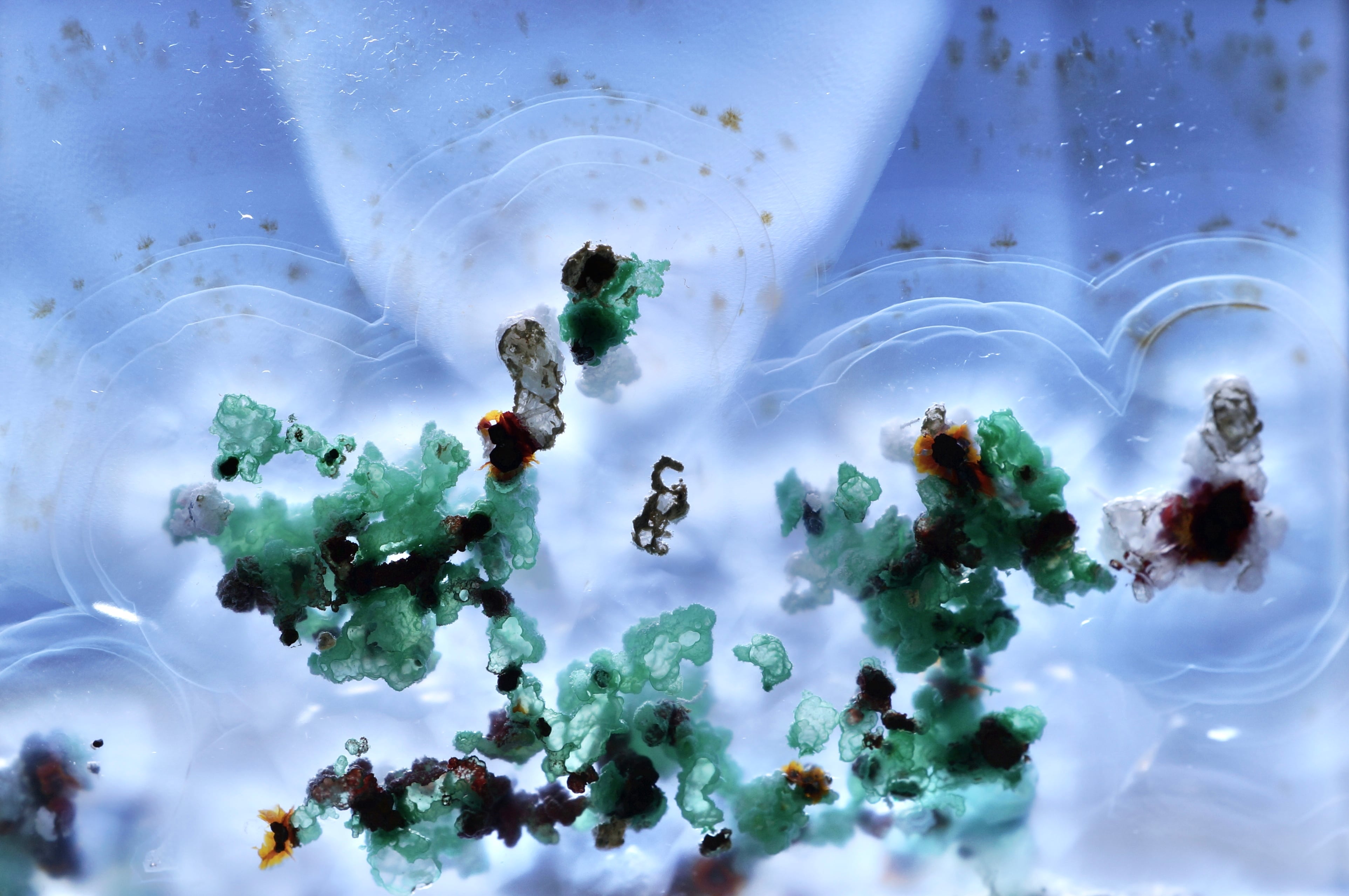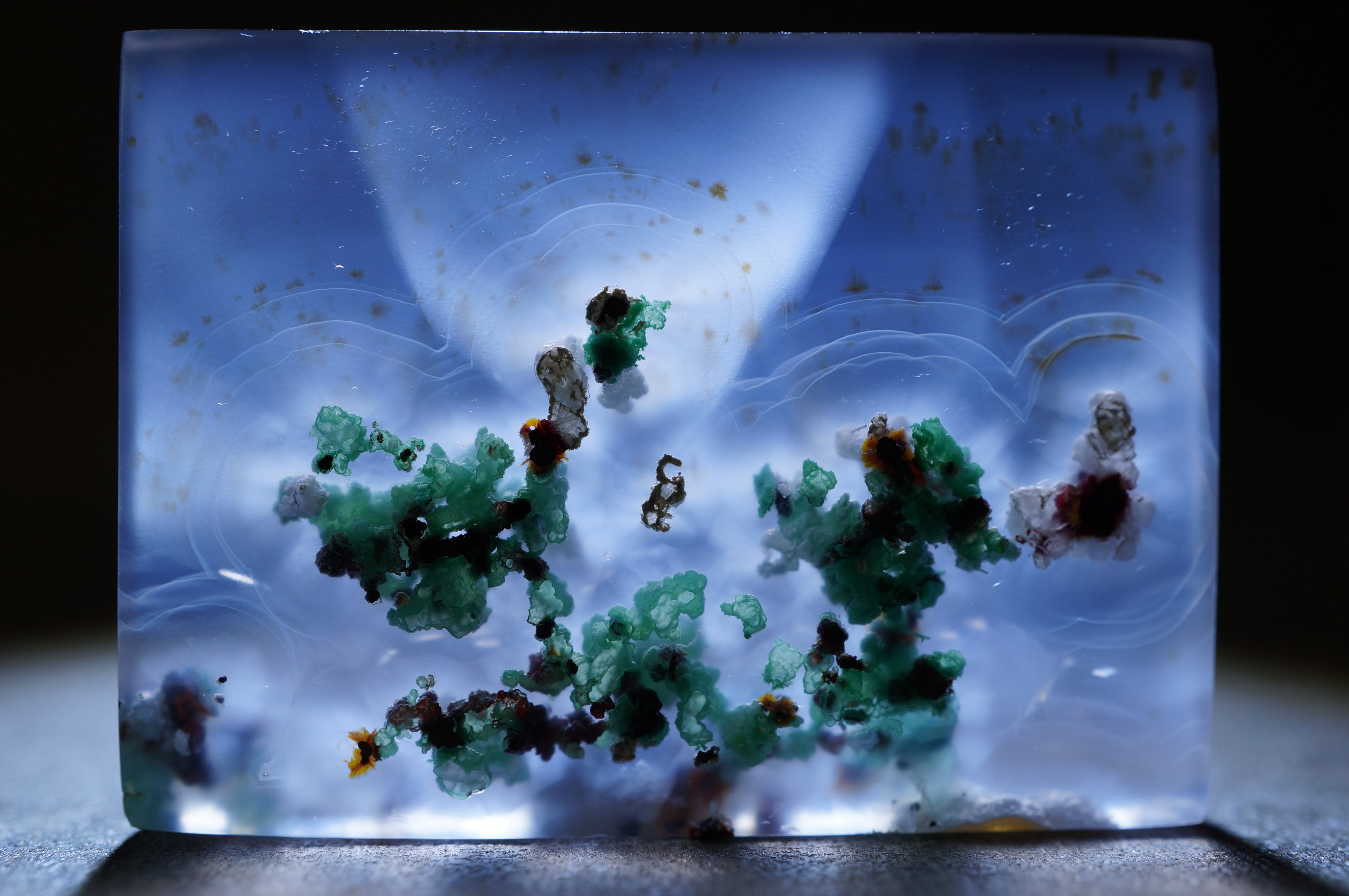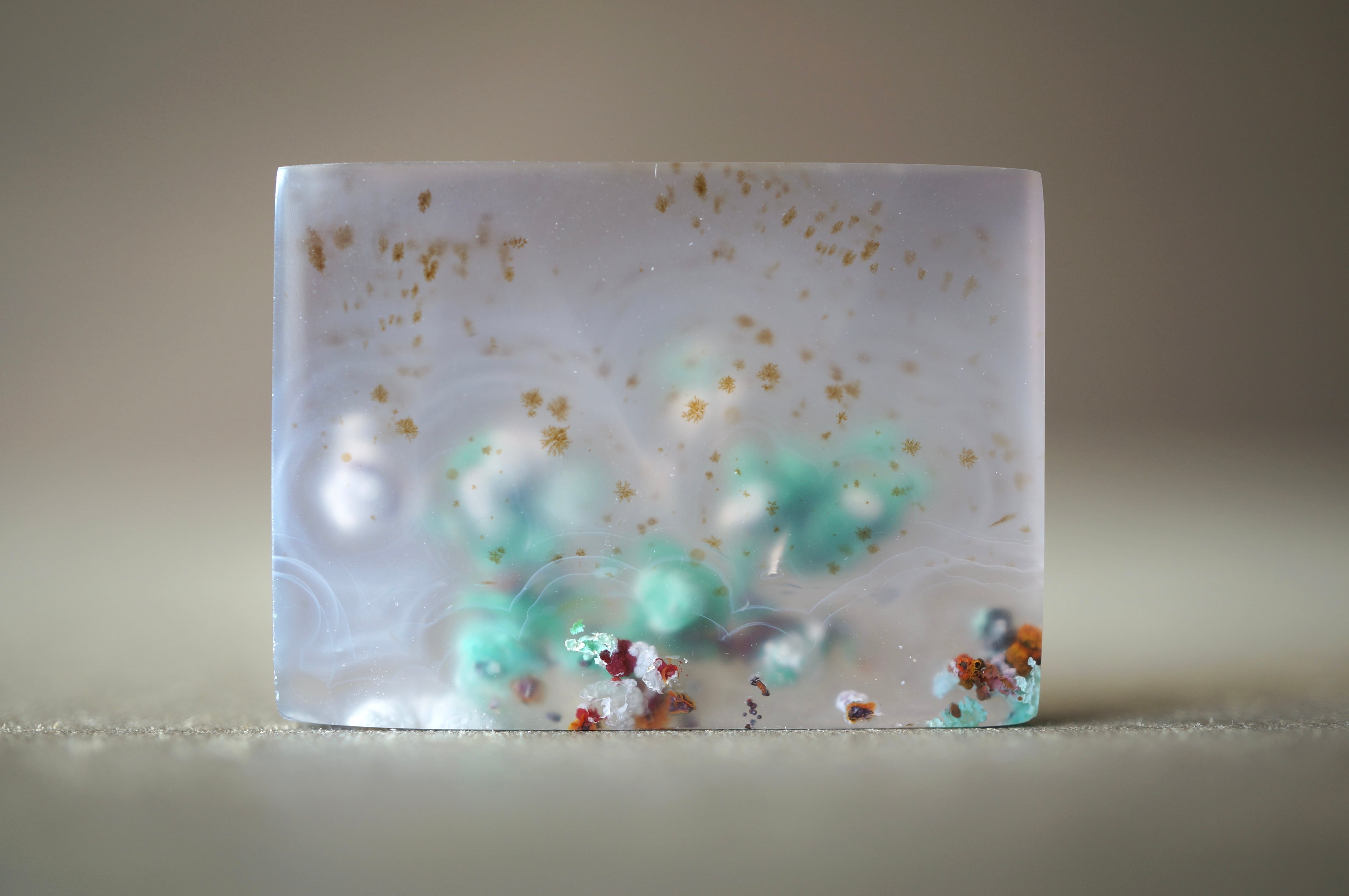 その様子は色彩が水中でゆっくりとほどけていく過程を想わせ、固定された鉱物でありながら、たおやかで流動的な印象の一枚です。