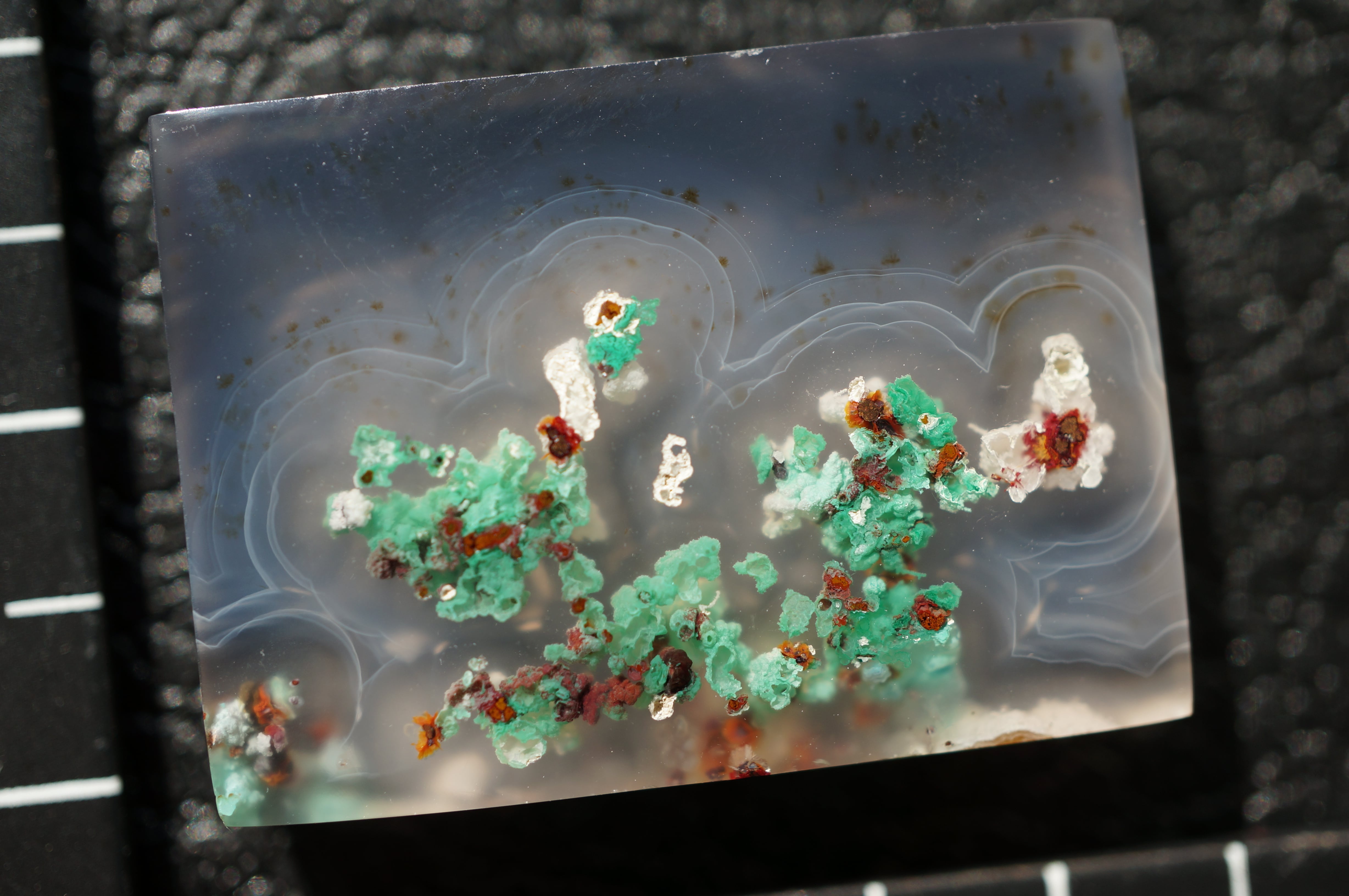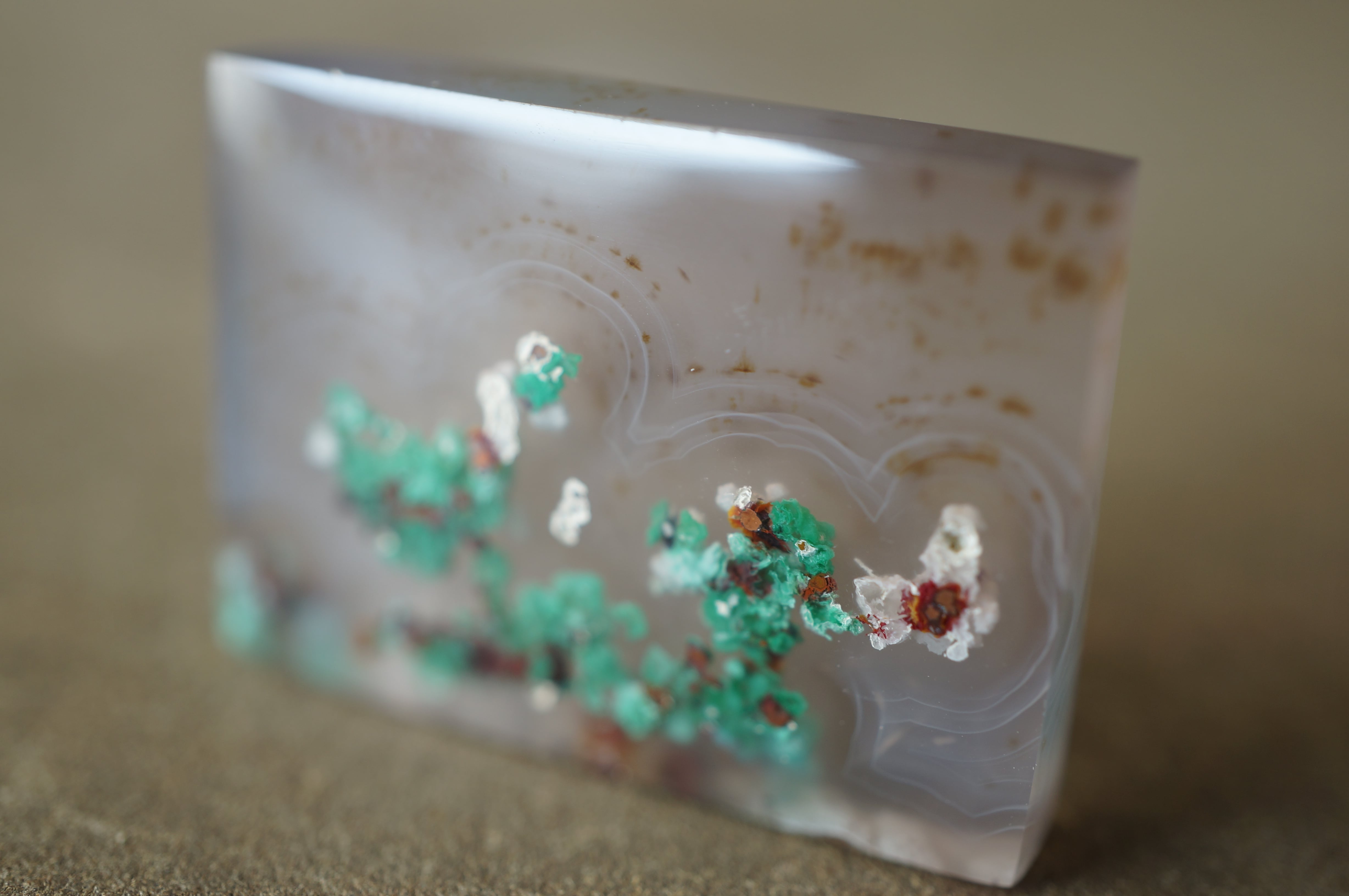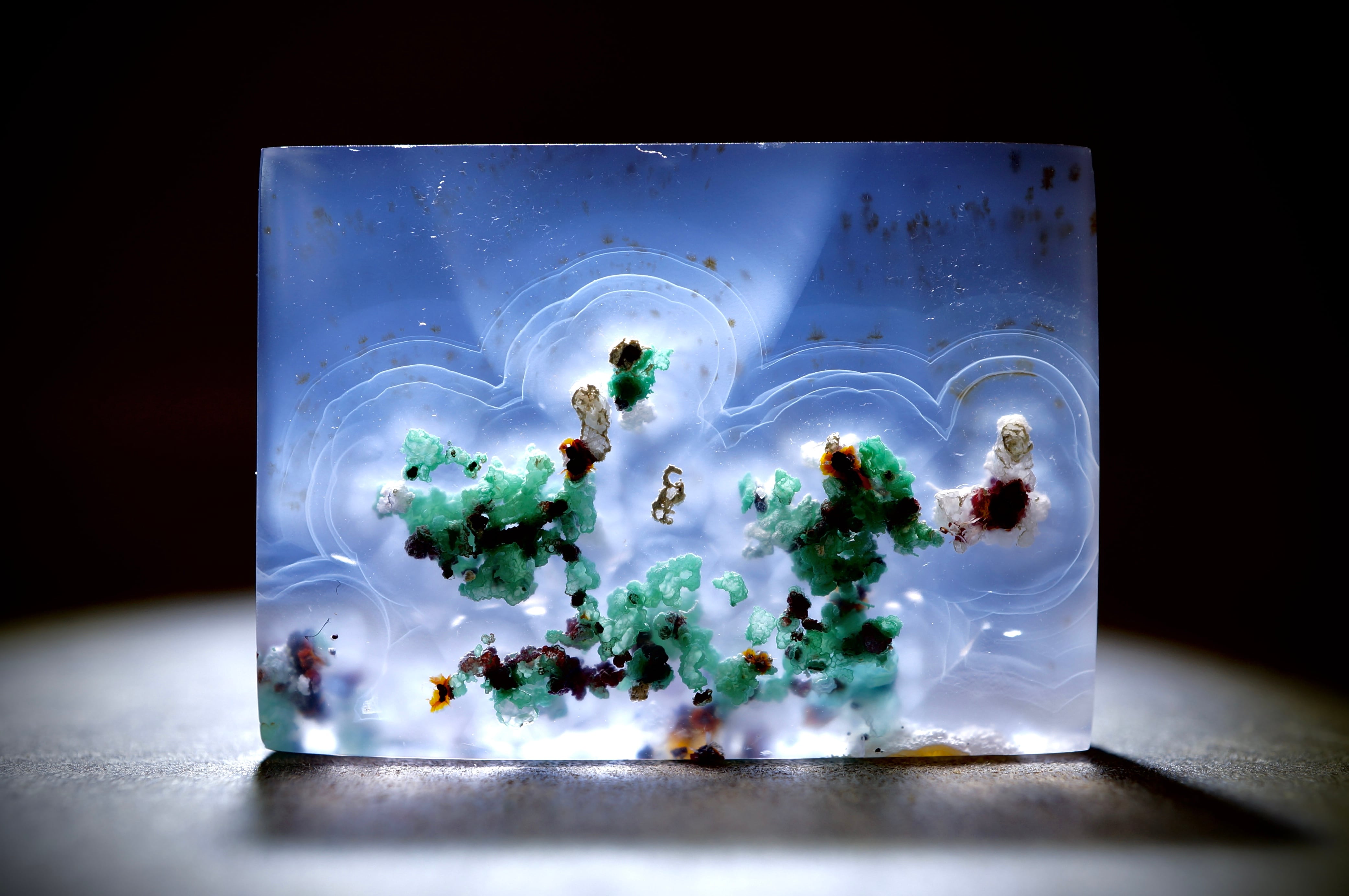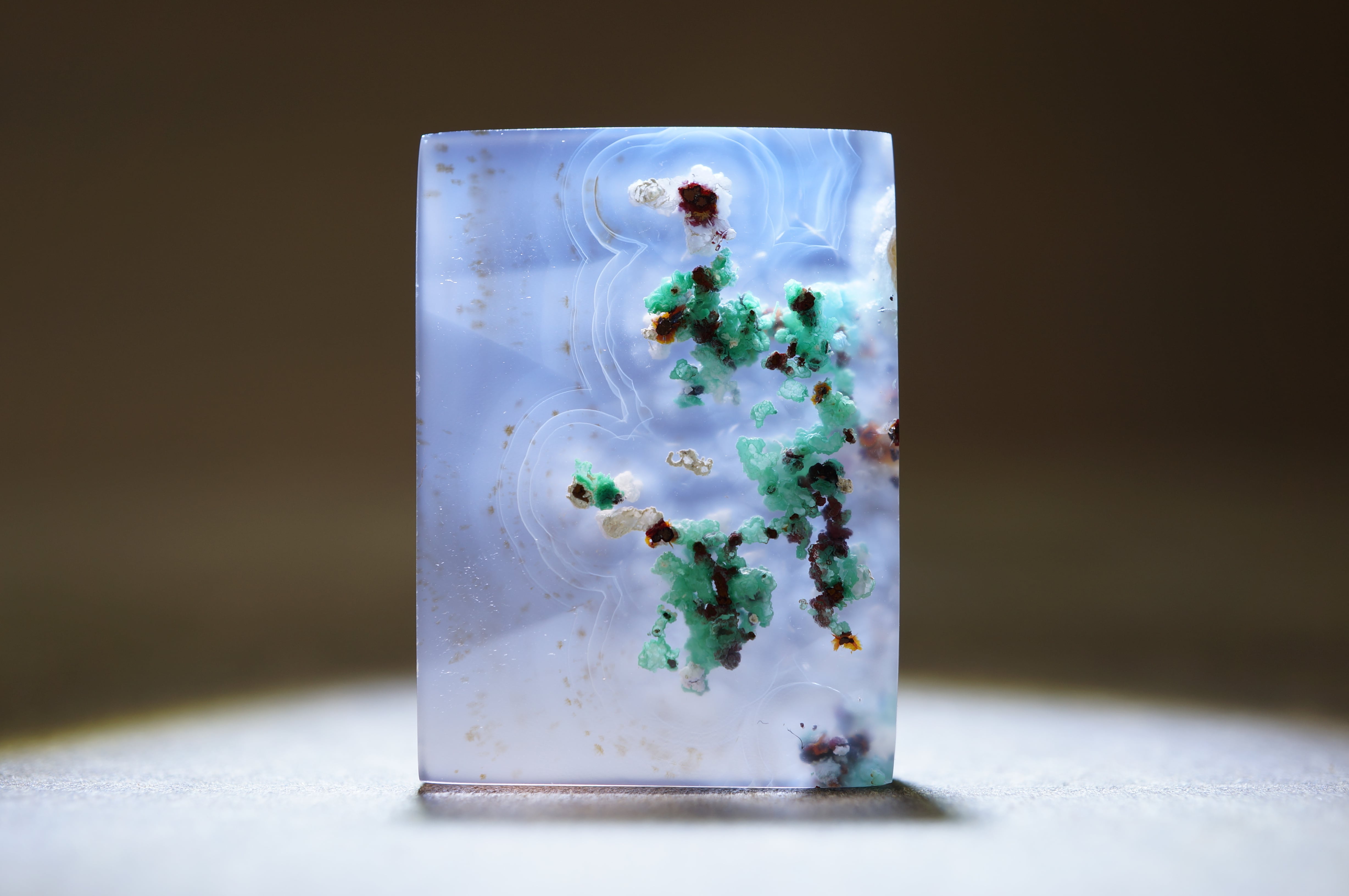 層状に重なるカルセドニーのバンディングは、空気の層のように淡く広がり、その奥に内包された粒子は、距離の異なる複数の面に分かれて現れます。