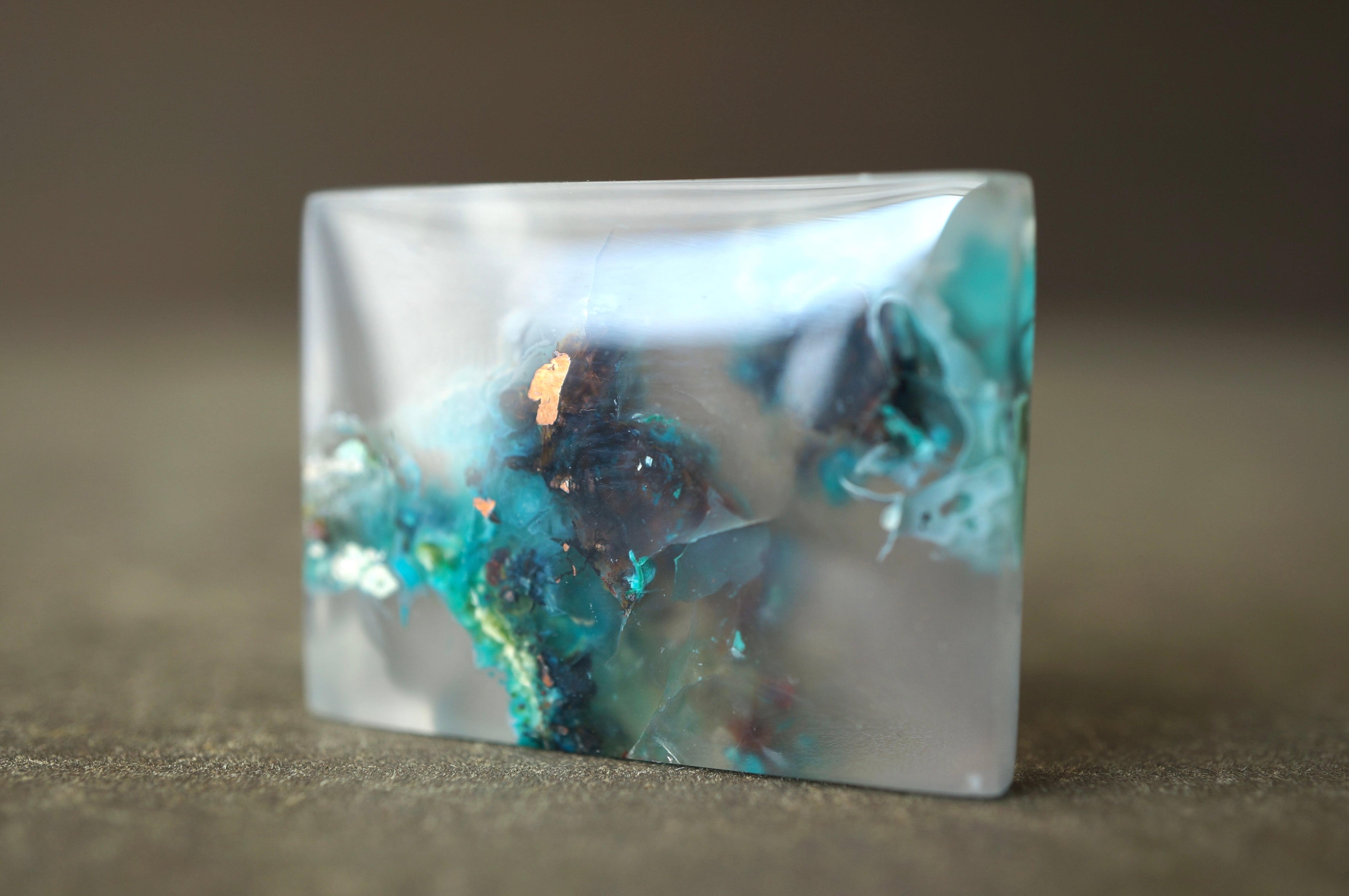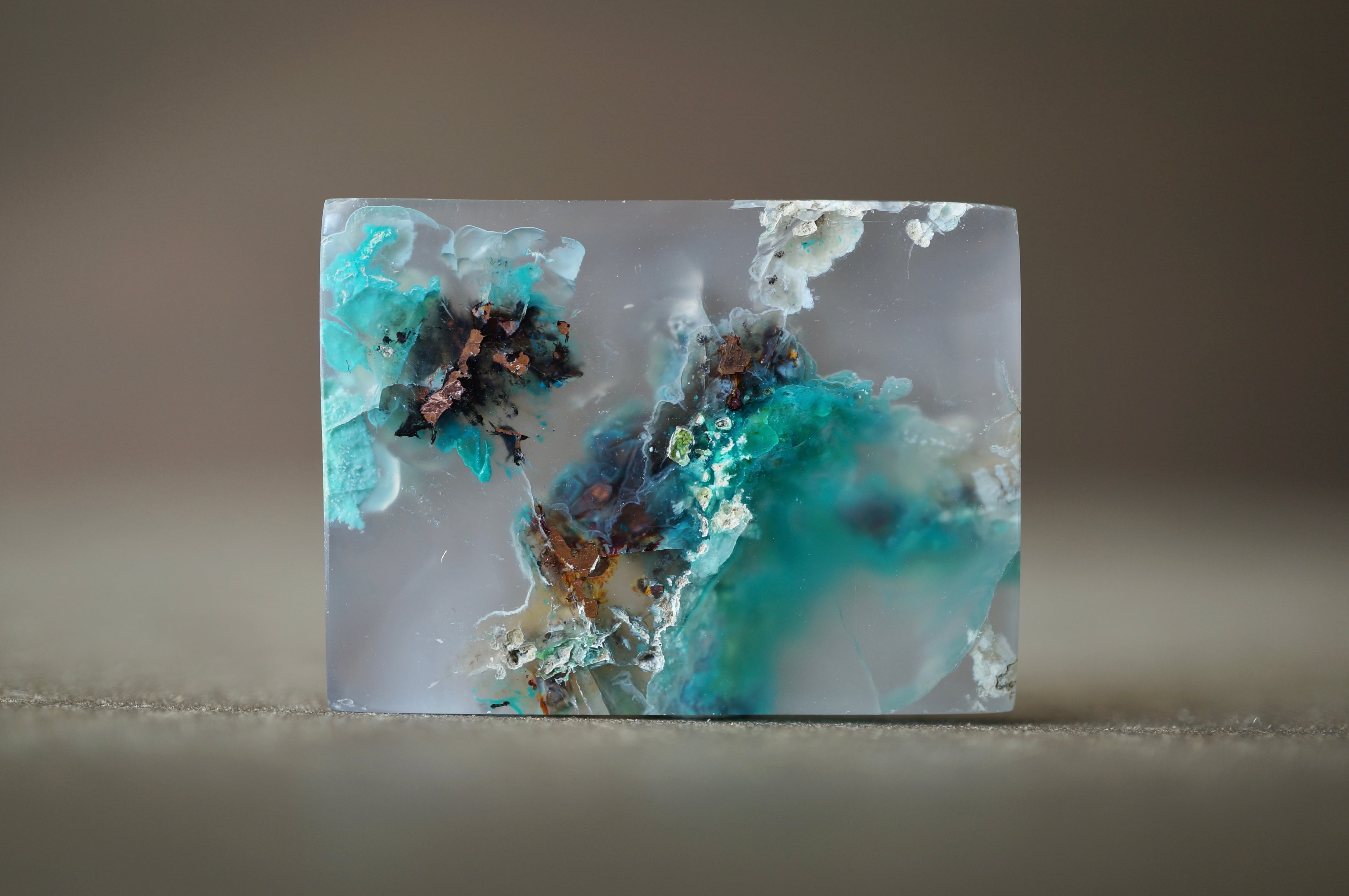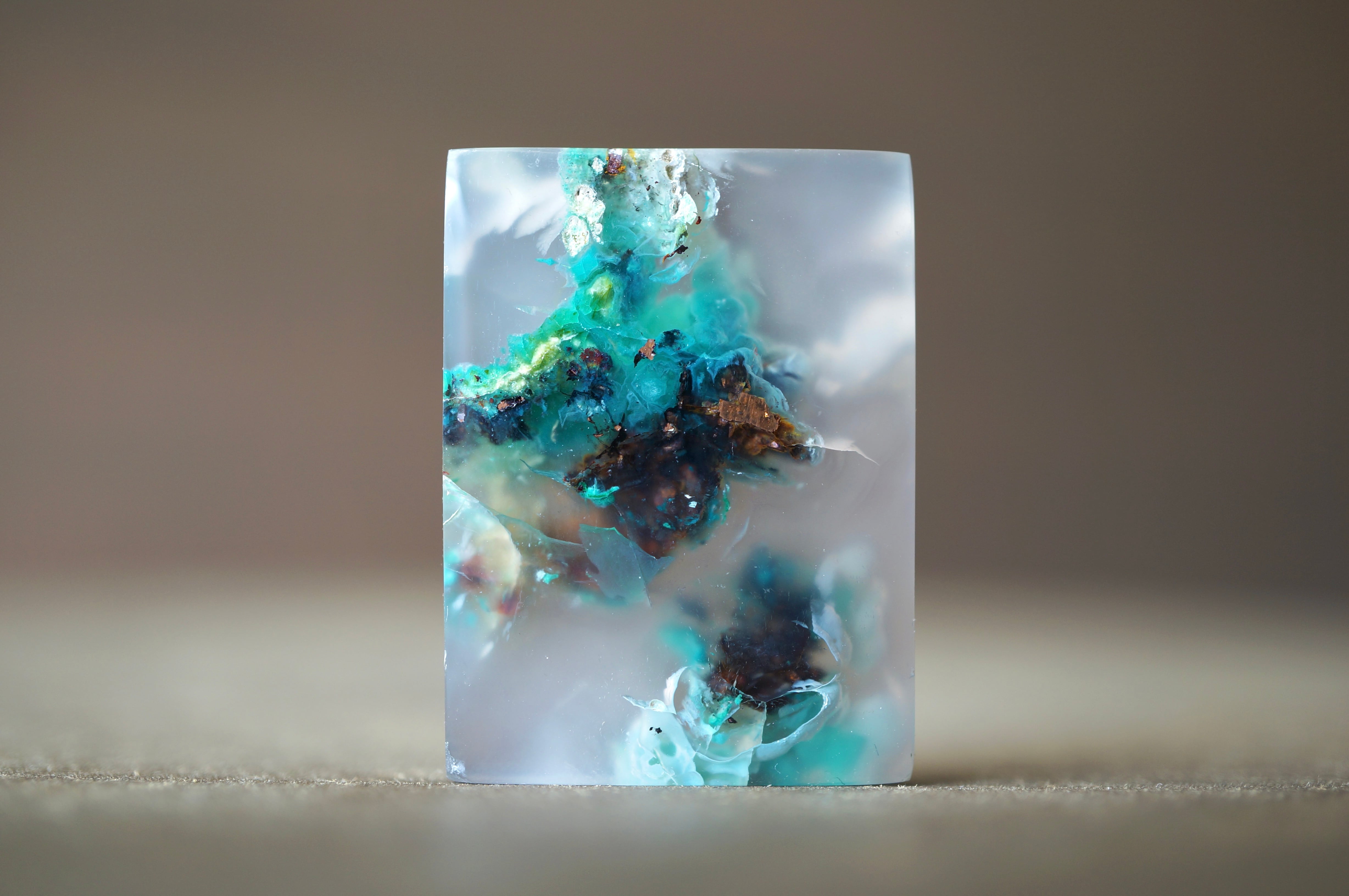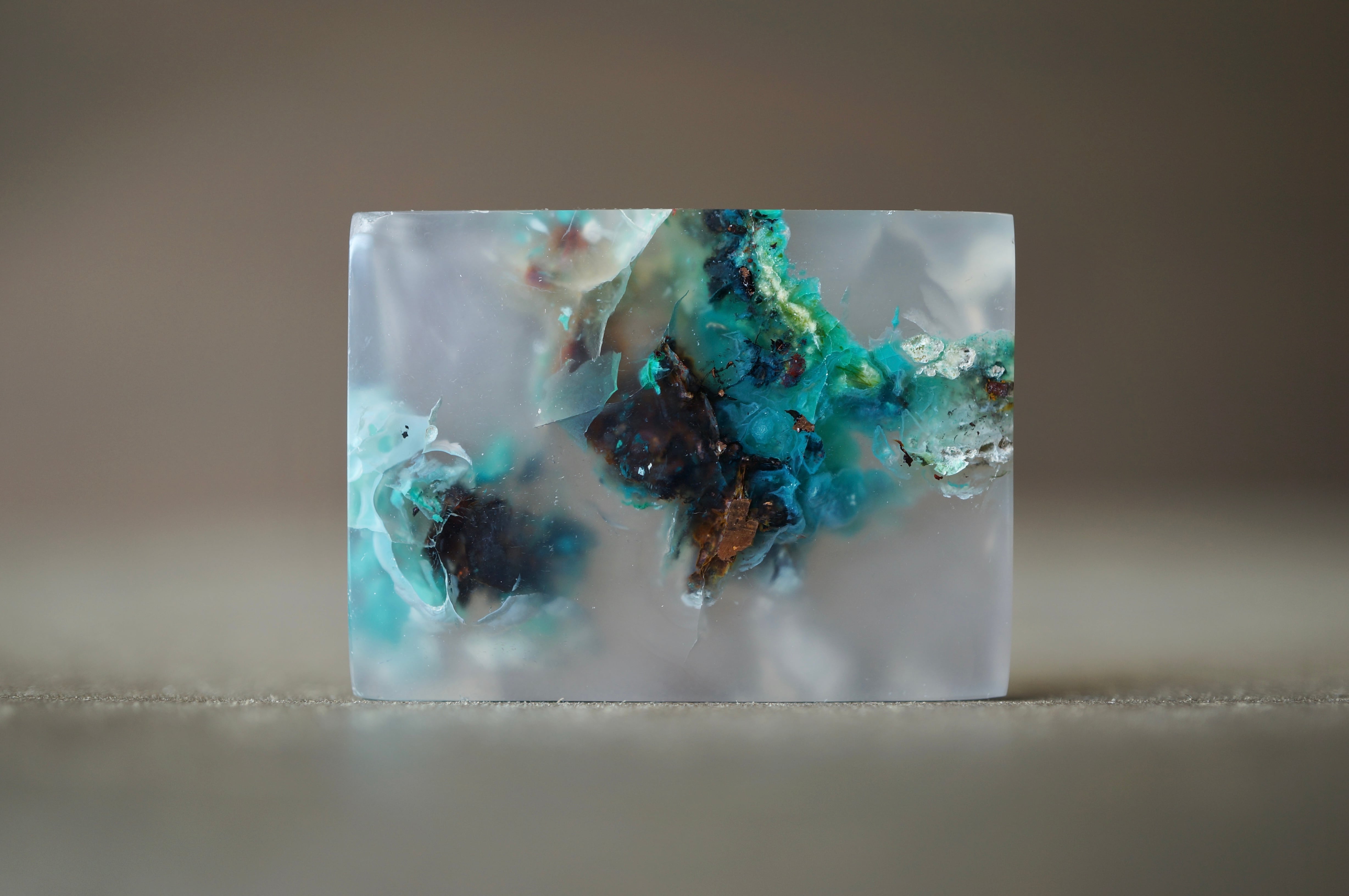 その様子は色彩が水中でゆっくりとほどけていく過程を想わせ、固定された鉱物でありながら、たおやかで流動的な印象の一枚です。