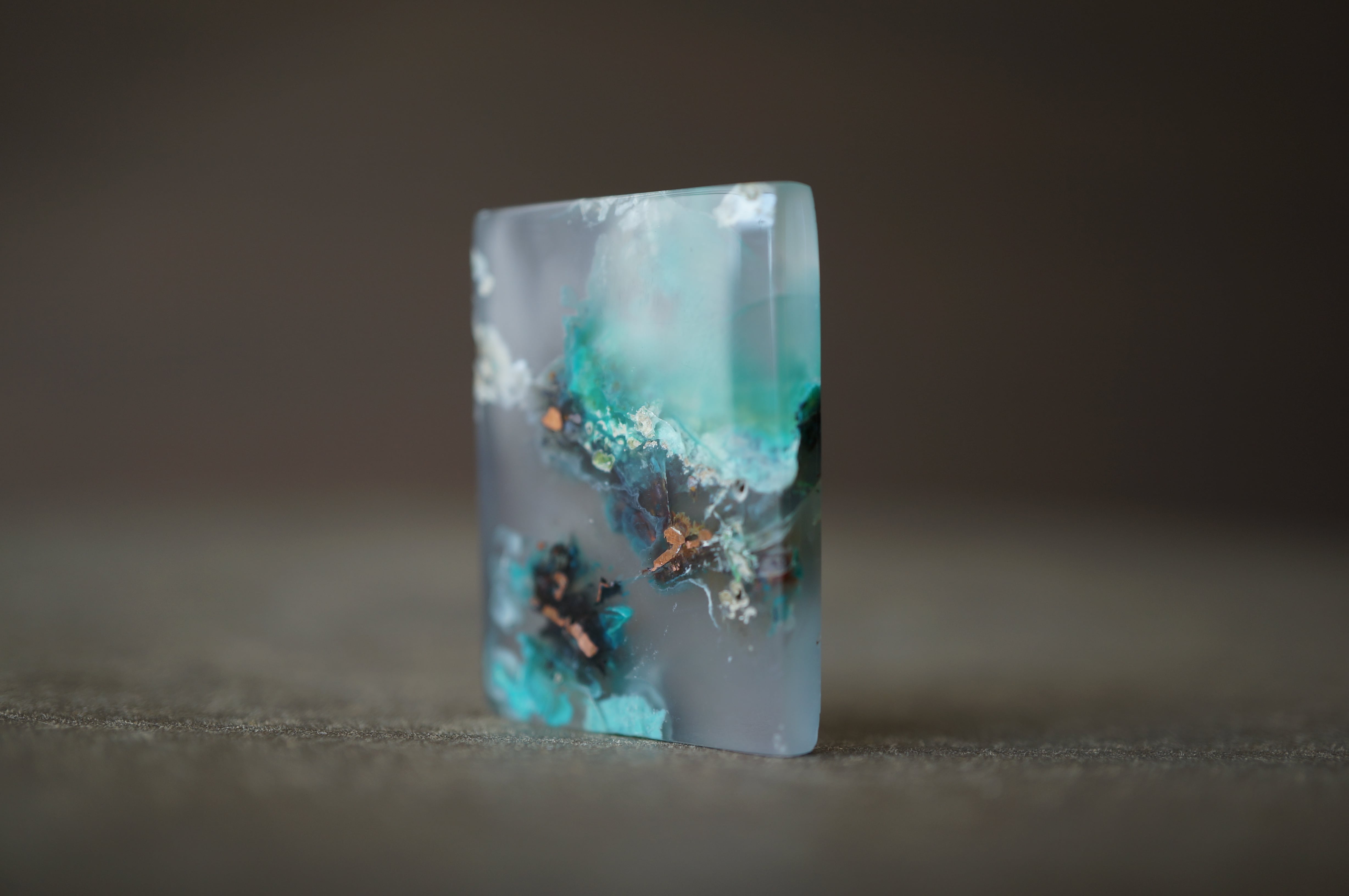 層状に重なるカルセドニーのバンディングは、空気の層のように淡く広がり、その奥に内包された粒子は、距離の異なる複数の面に分かれて現れます。