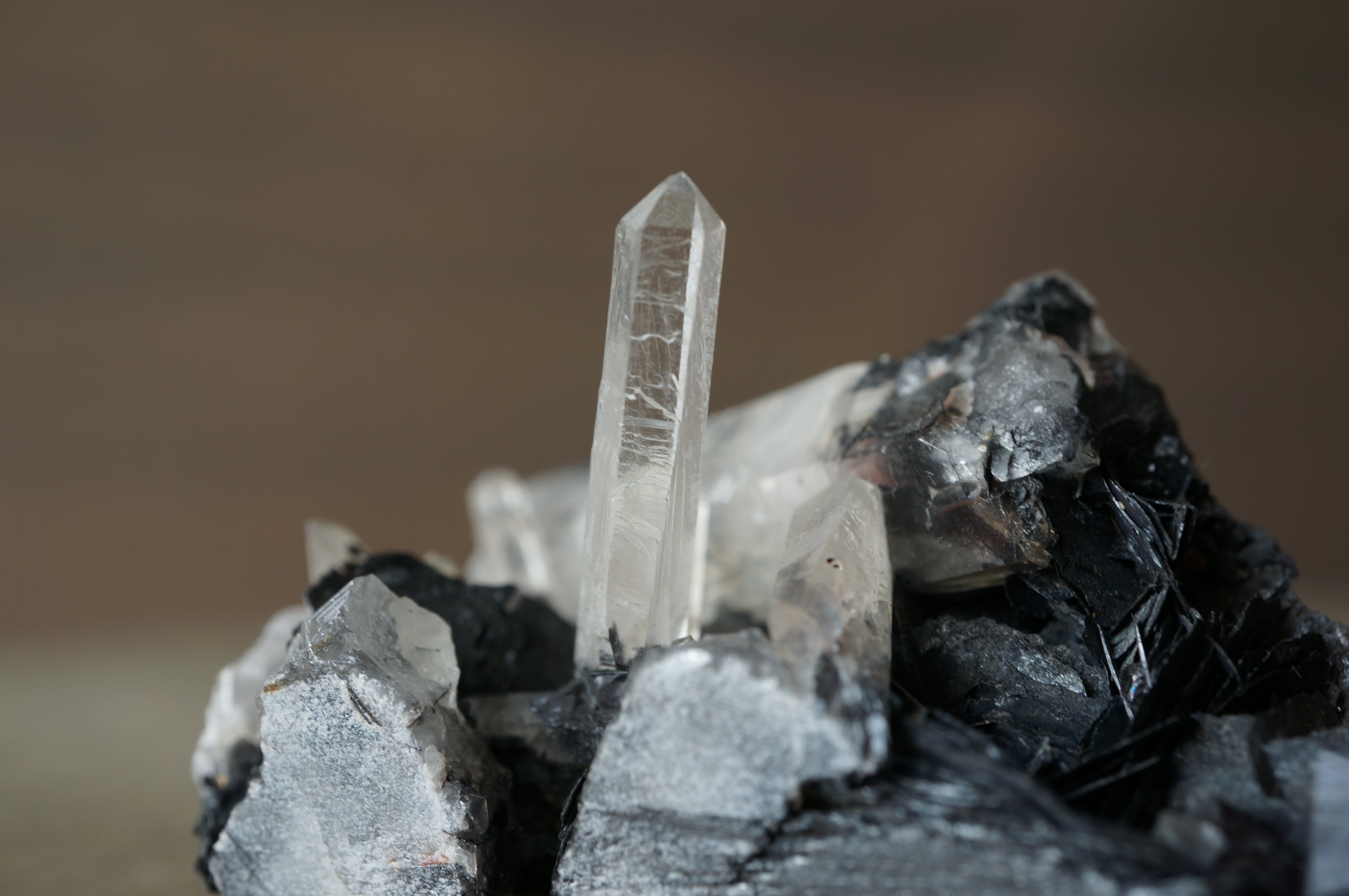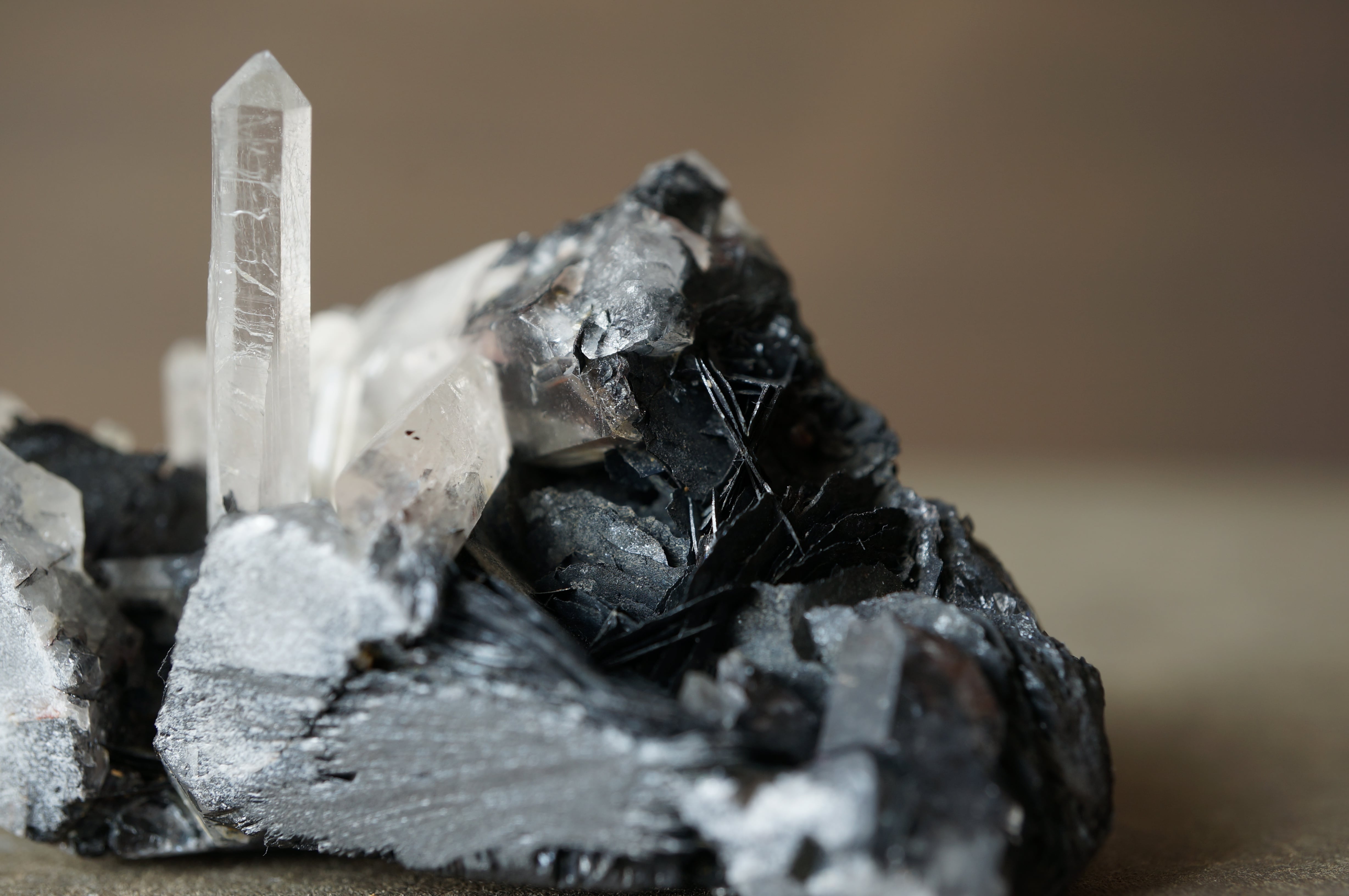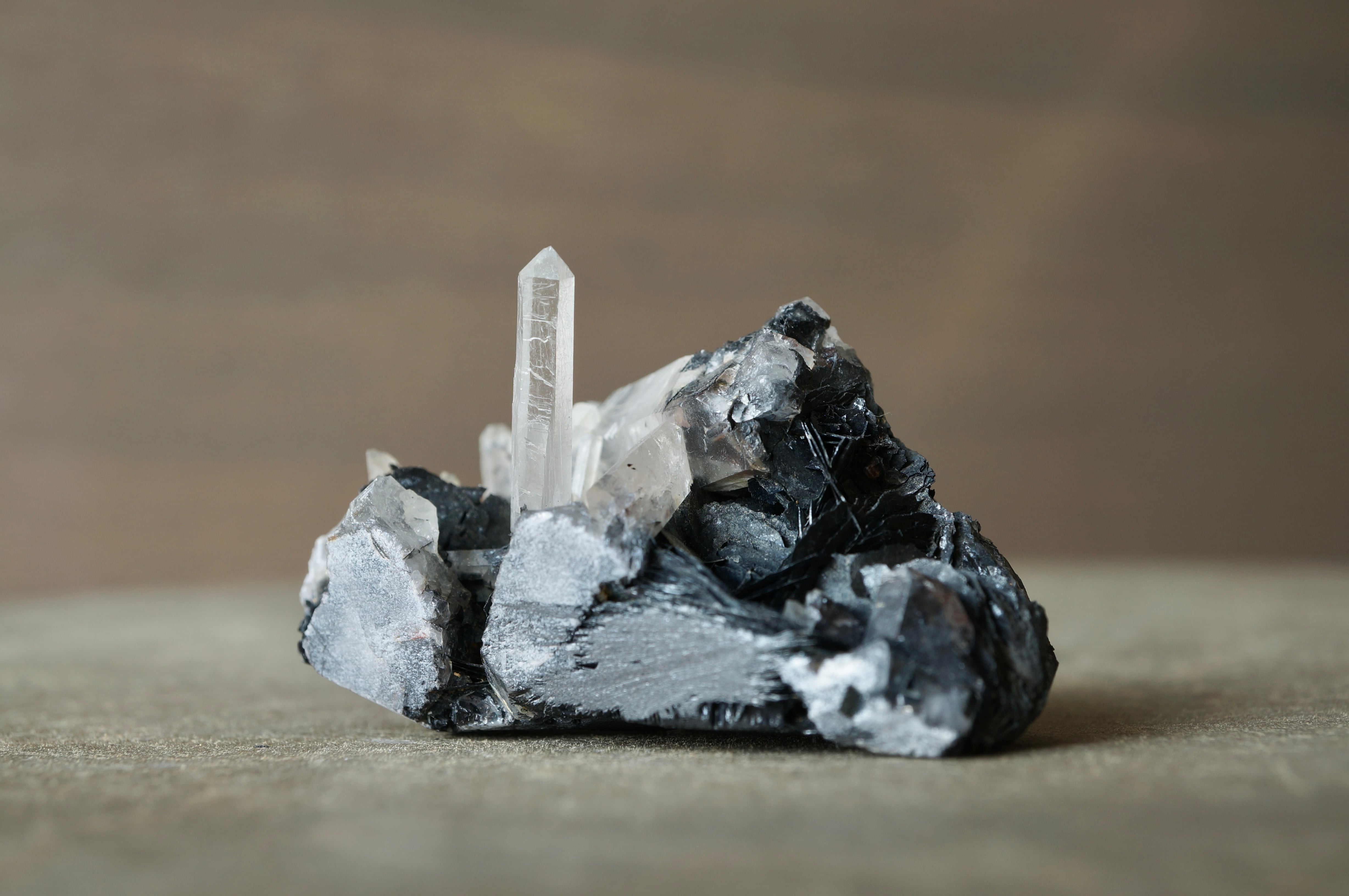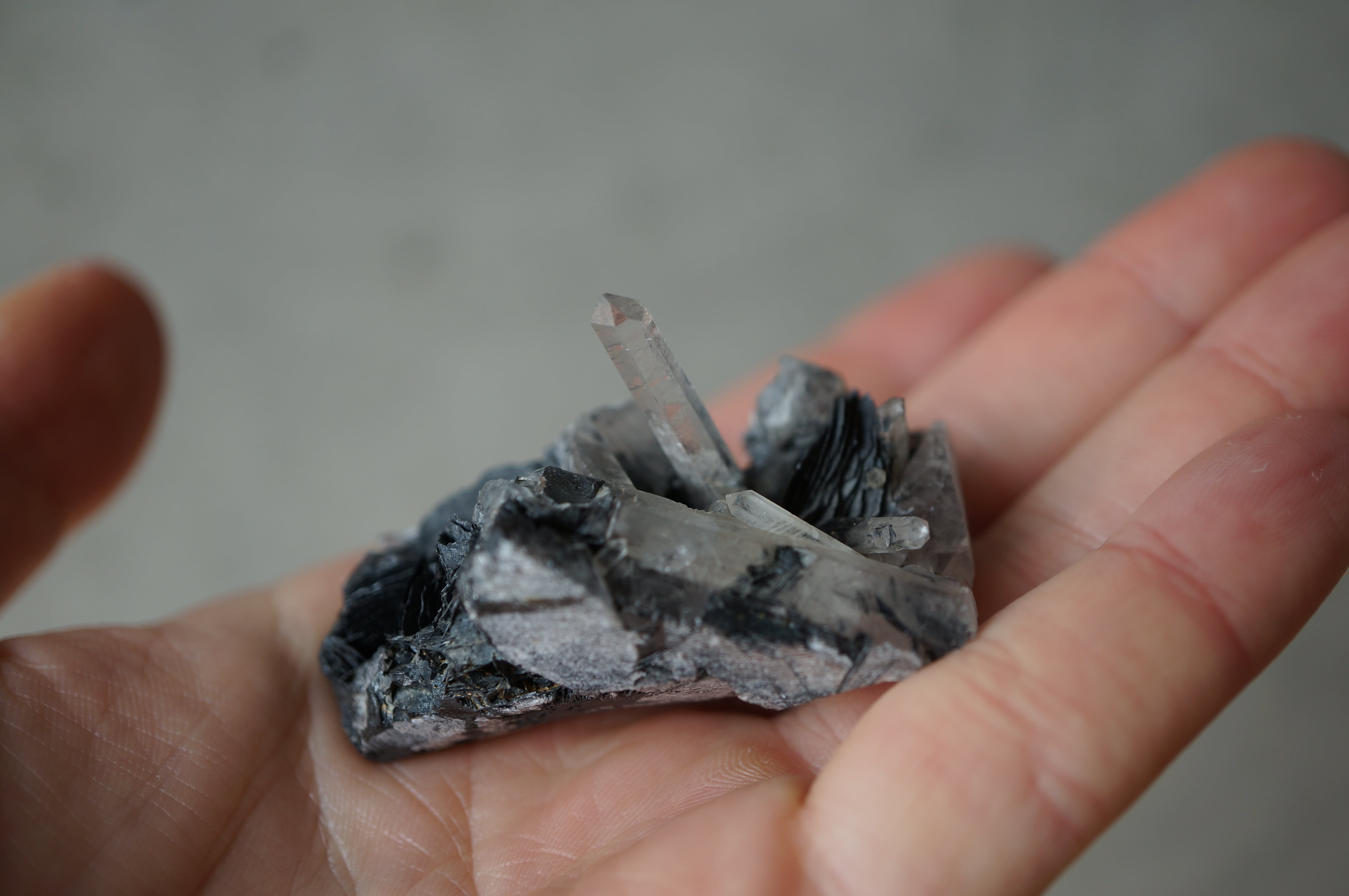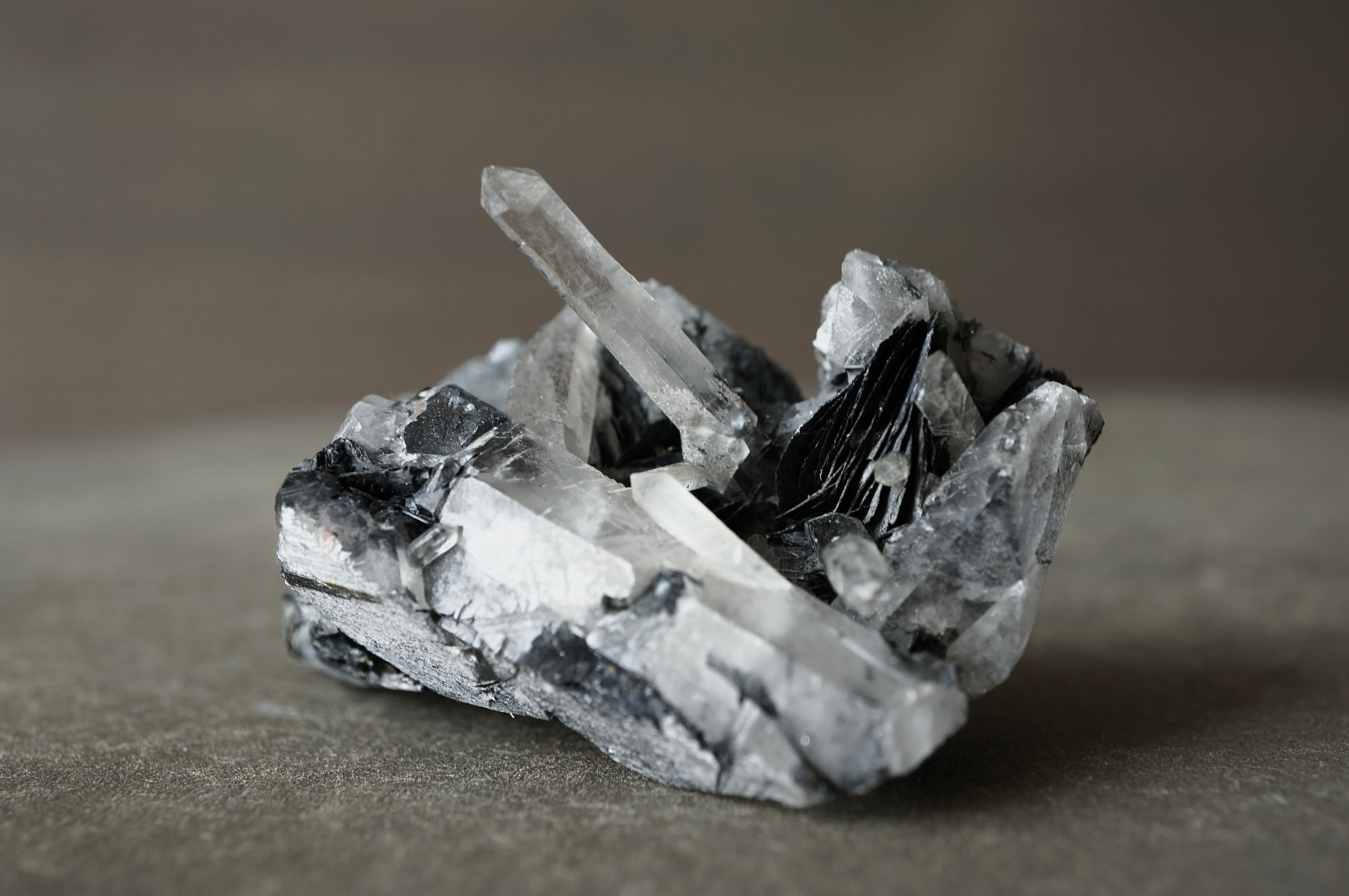 その硬質で重厚な質感に対して、伸びやかに突き出すクォーツは透明感を伴い、鋭いラインを描きながら光を透過します。