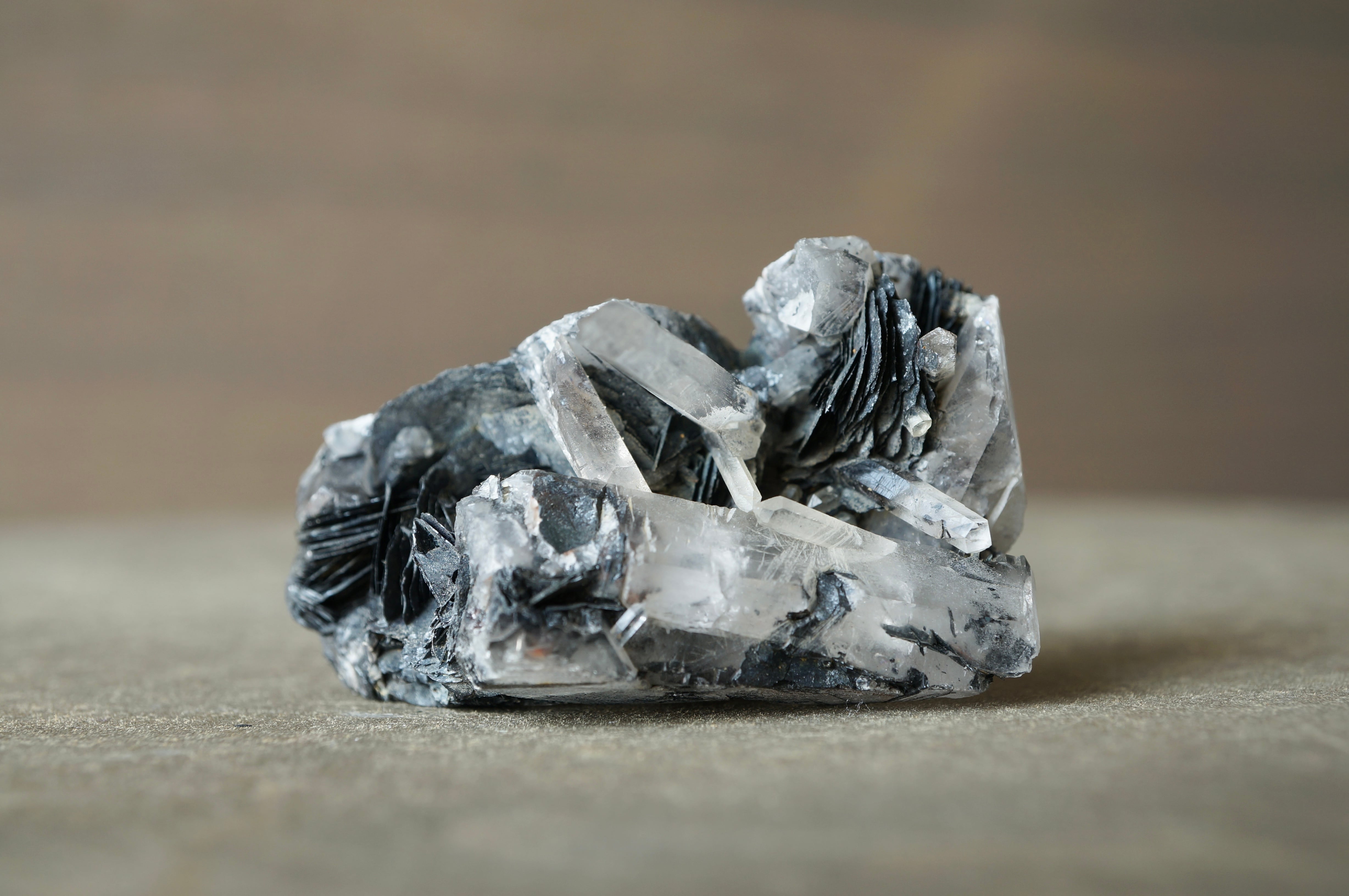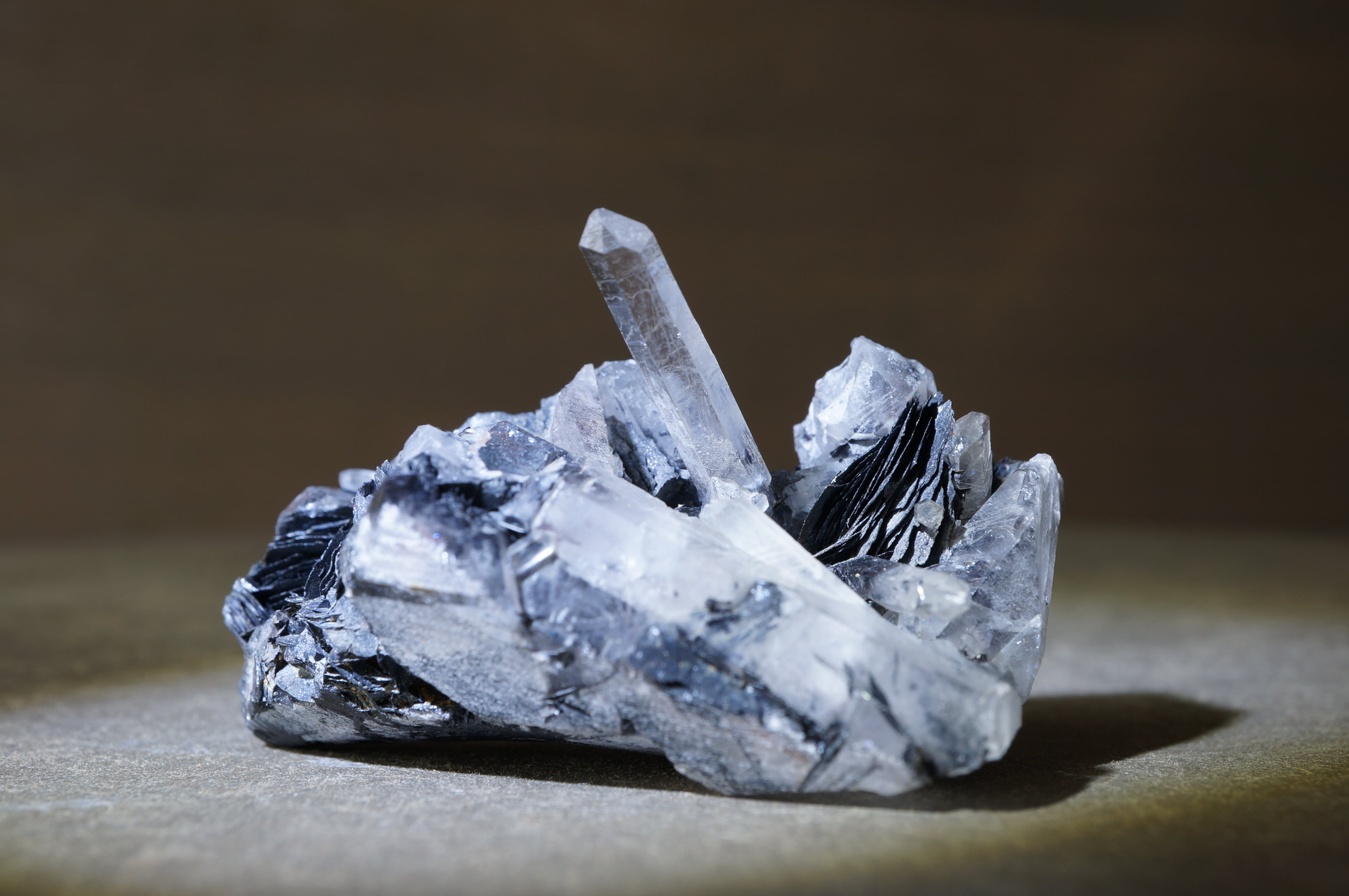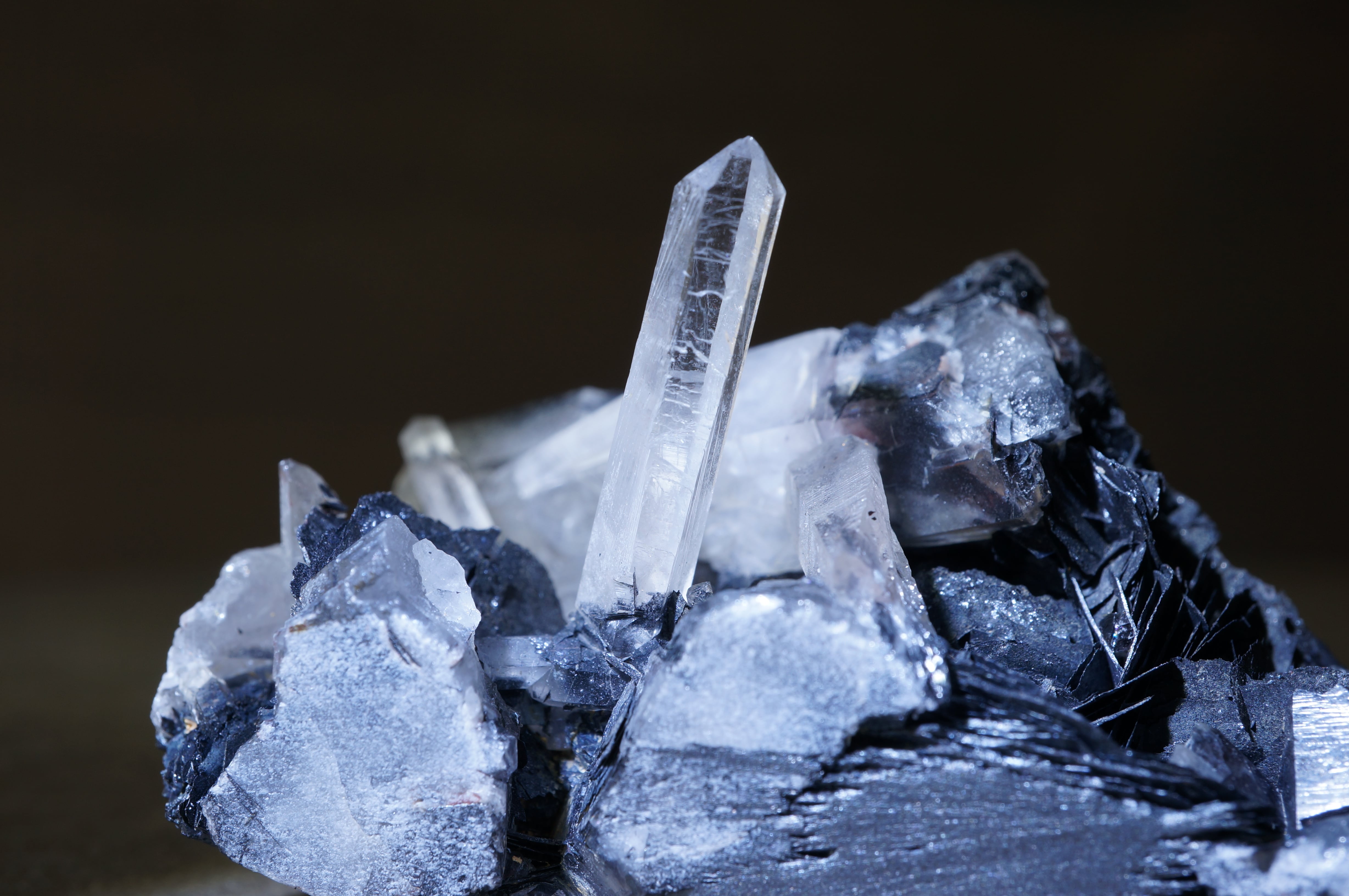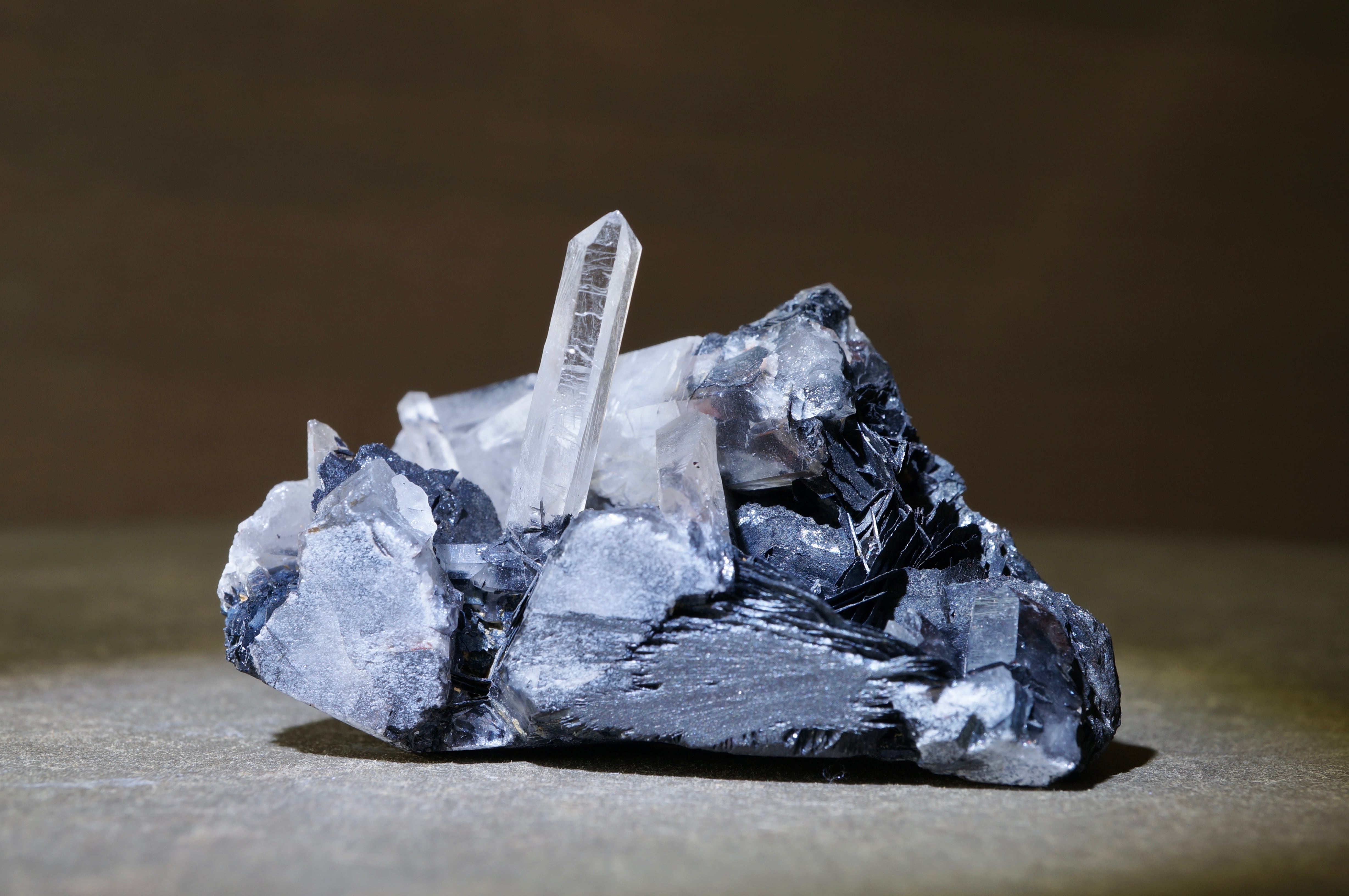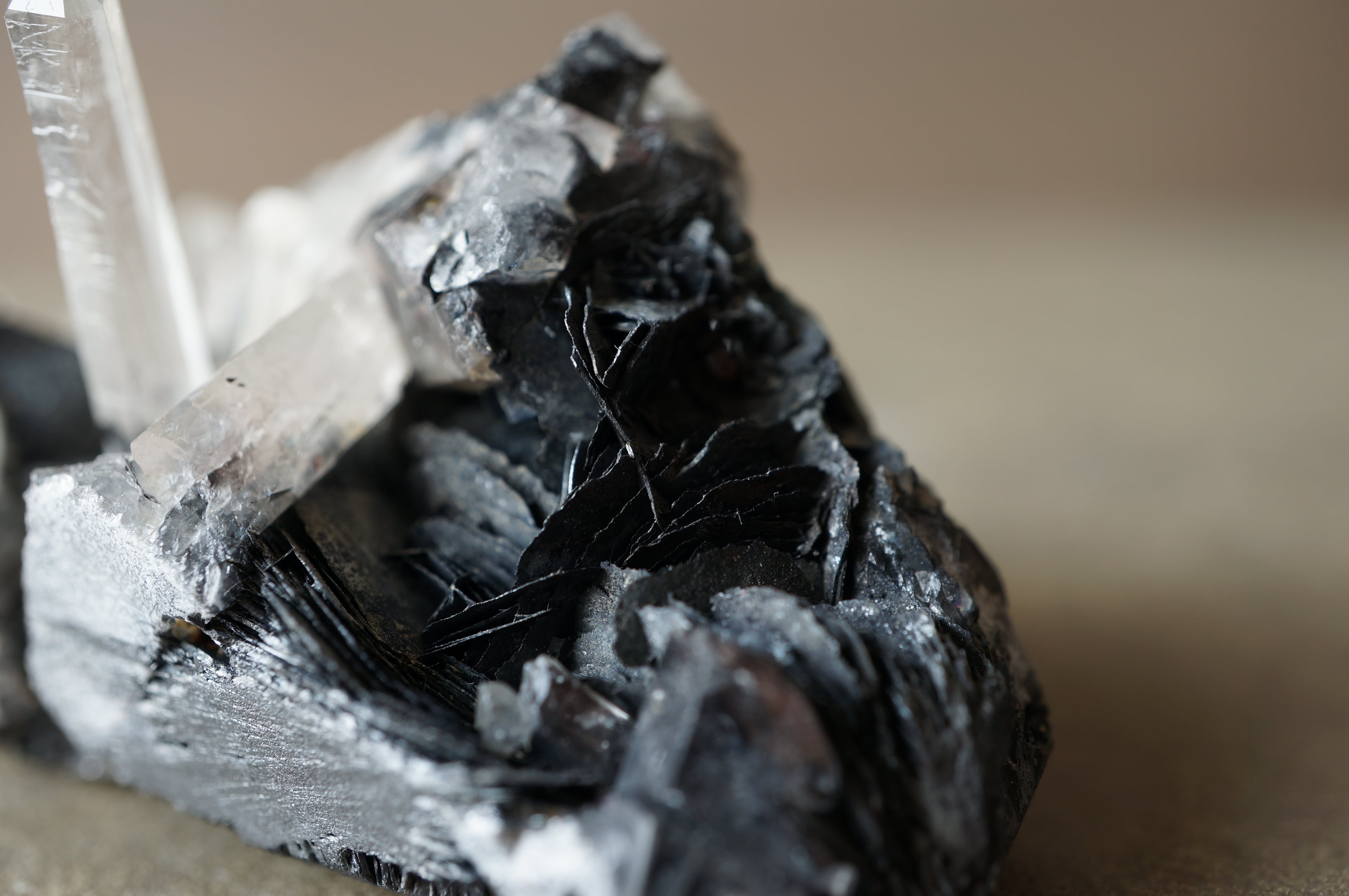その硬質で重厚な質感に対して、伸びやかに突き出すクォーツは透明感を伴い、鋭いラインを描きながら光を透過します。