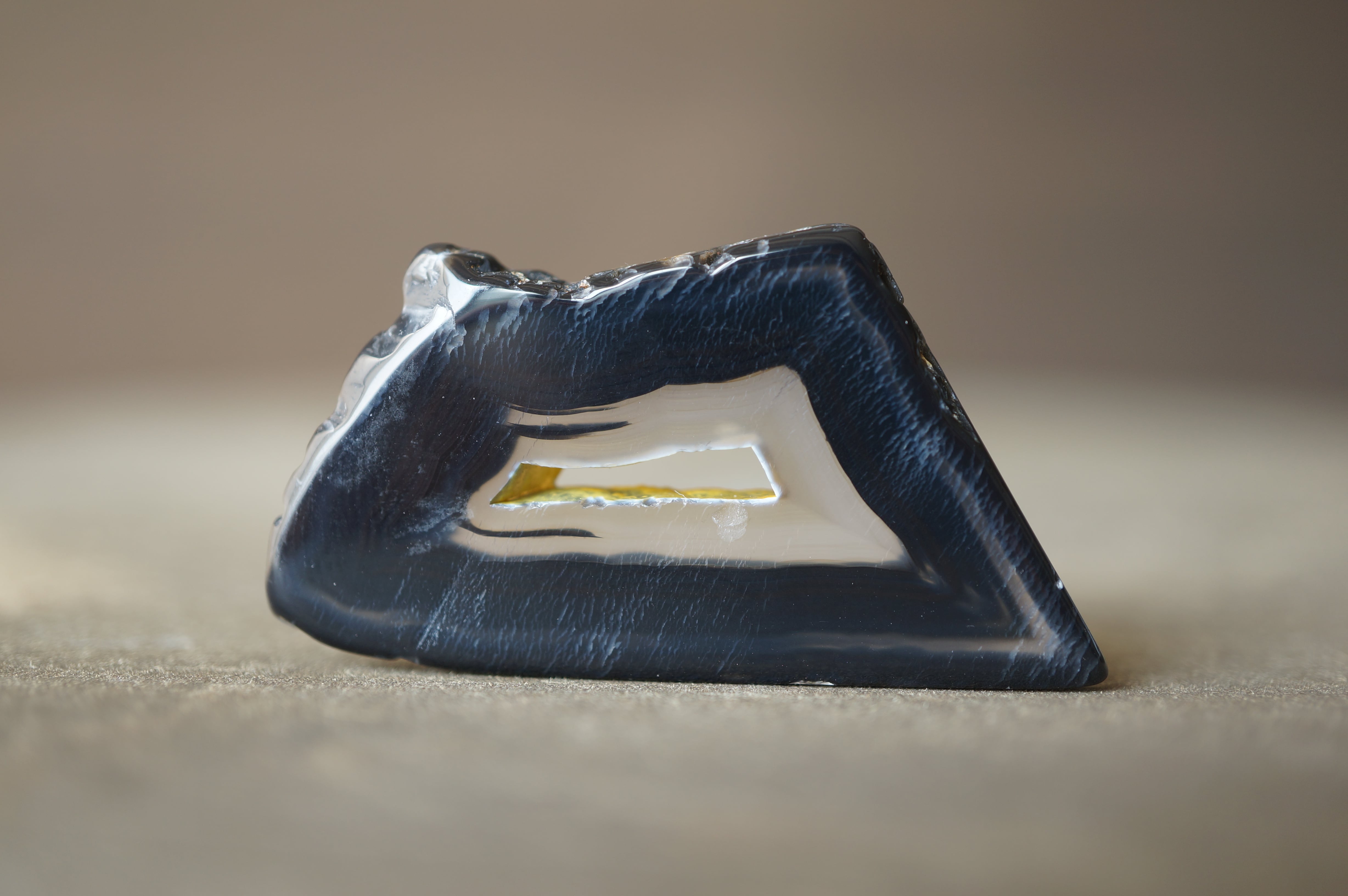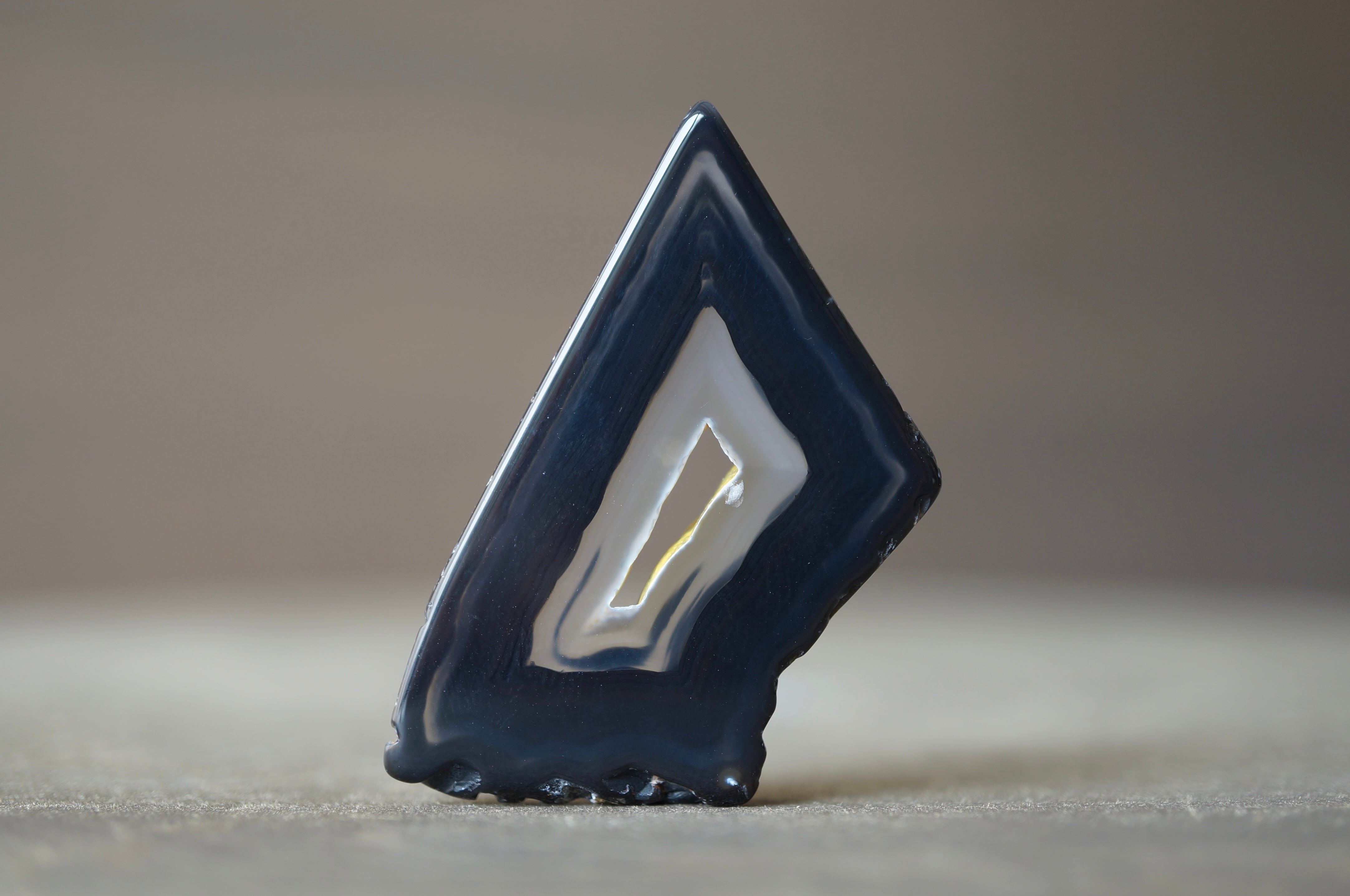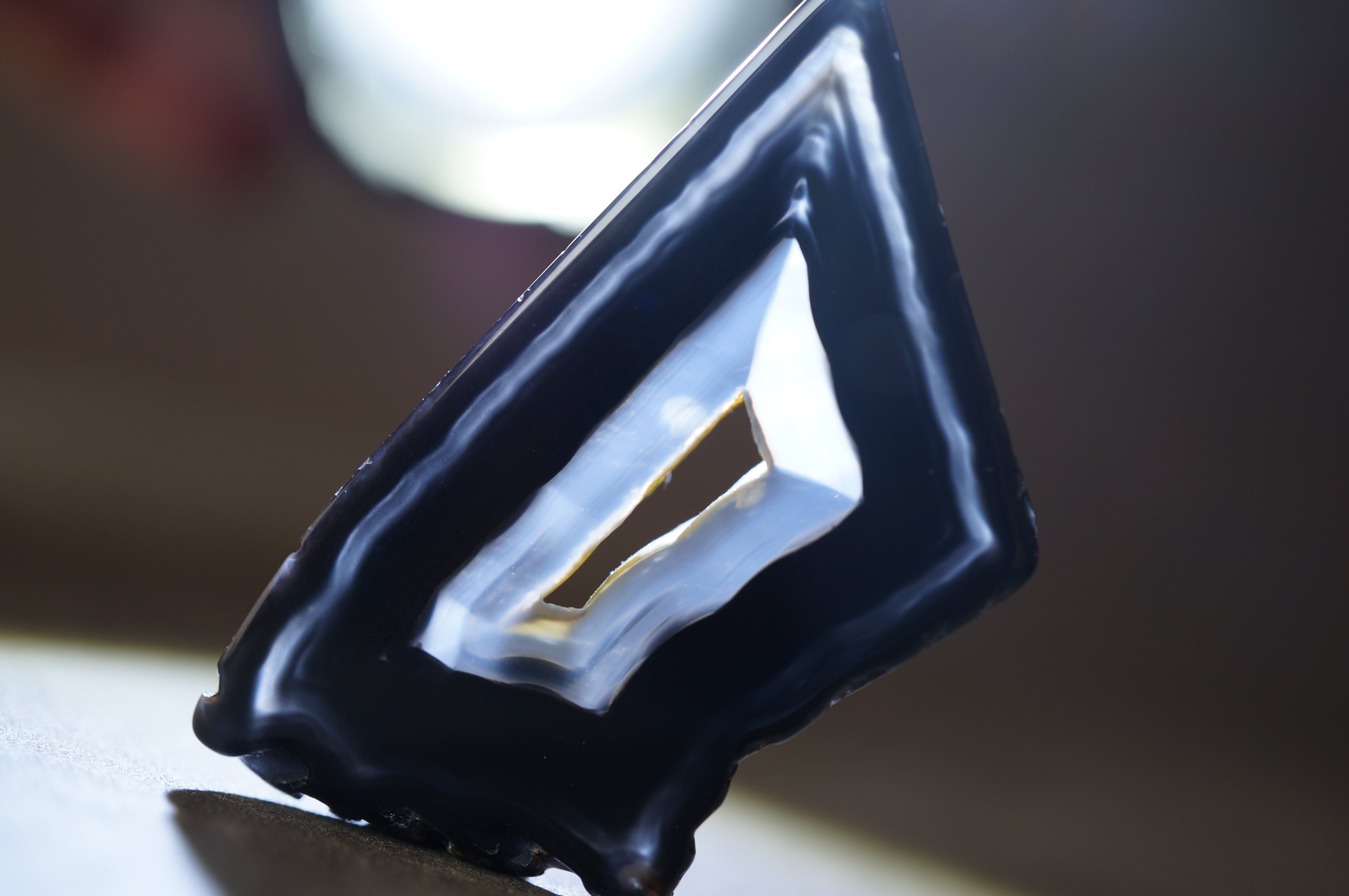 「Polyhedroid」は「多面体」を意味し、通常の同心円状や縞状のアゲートとは異なり、角張った面や幾何学的な層理が交錯する内部構造を持ちます。