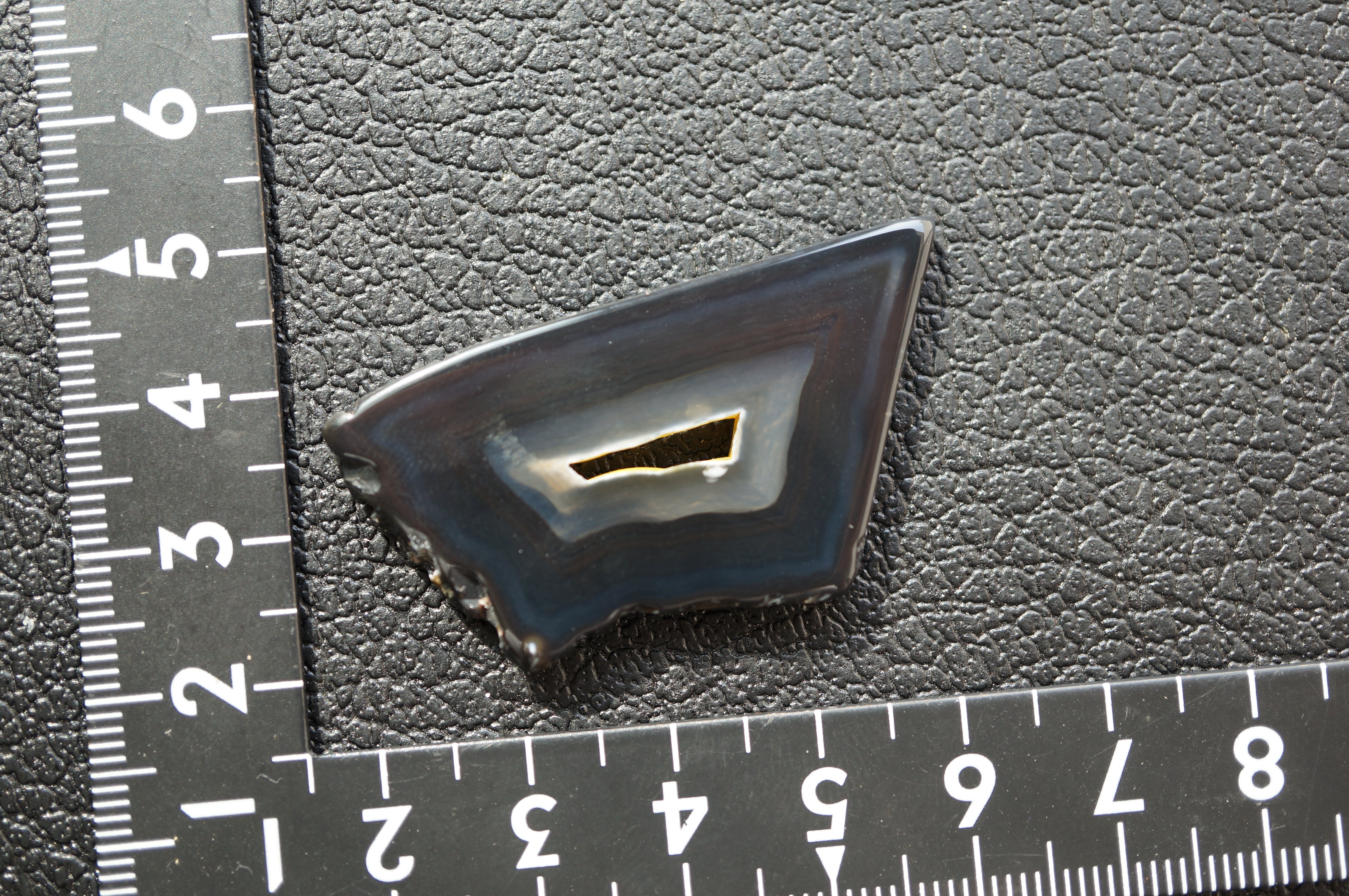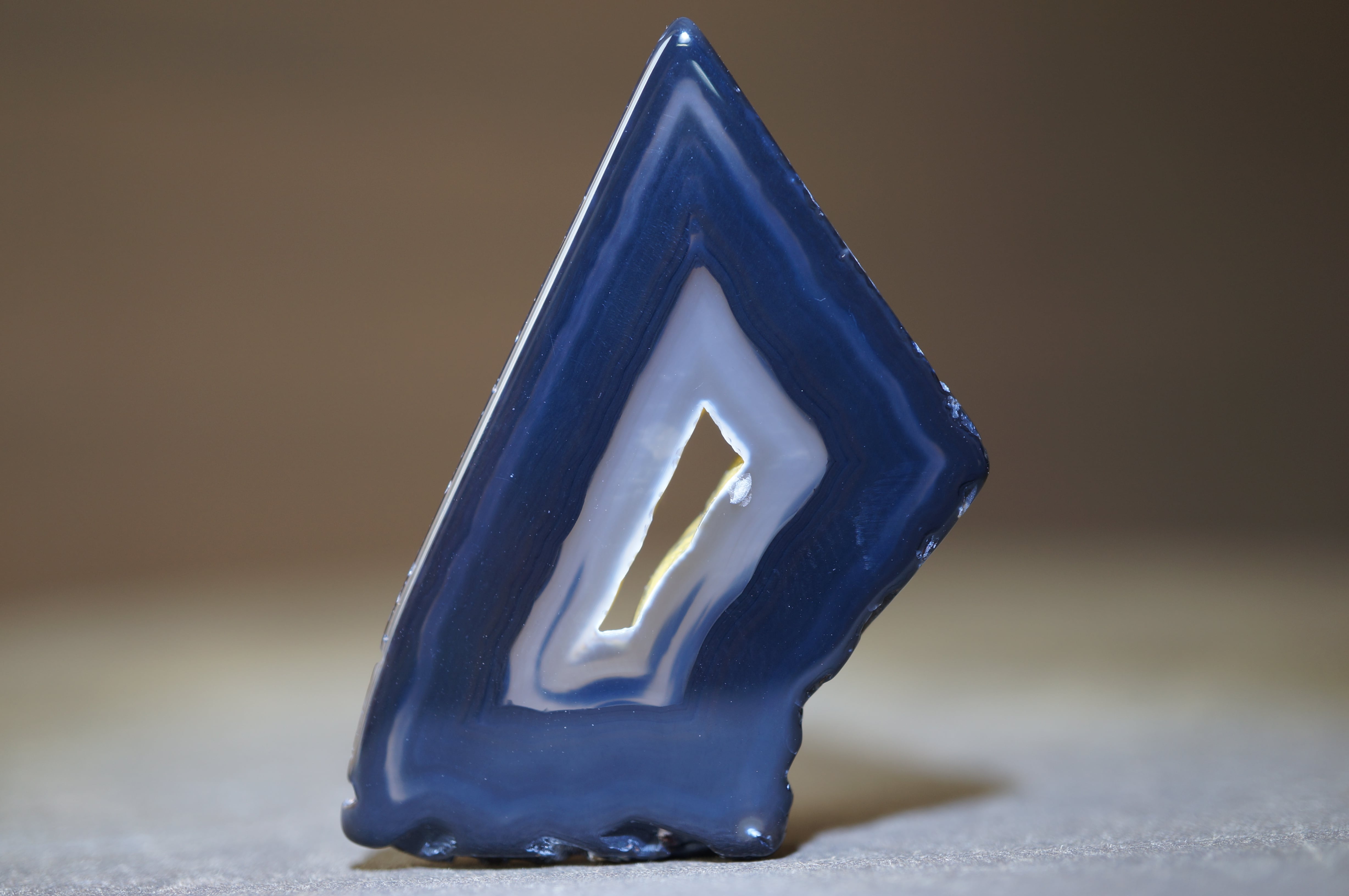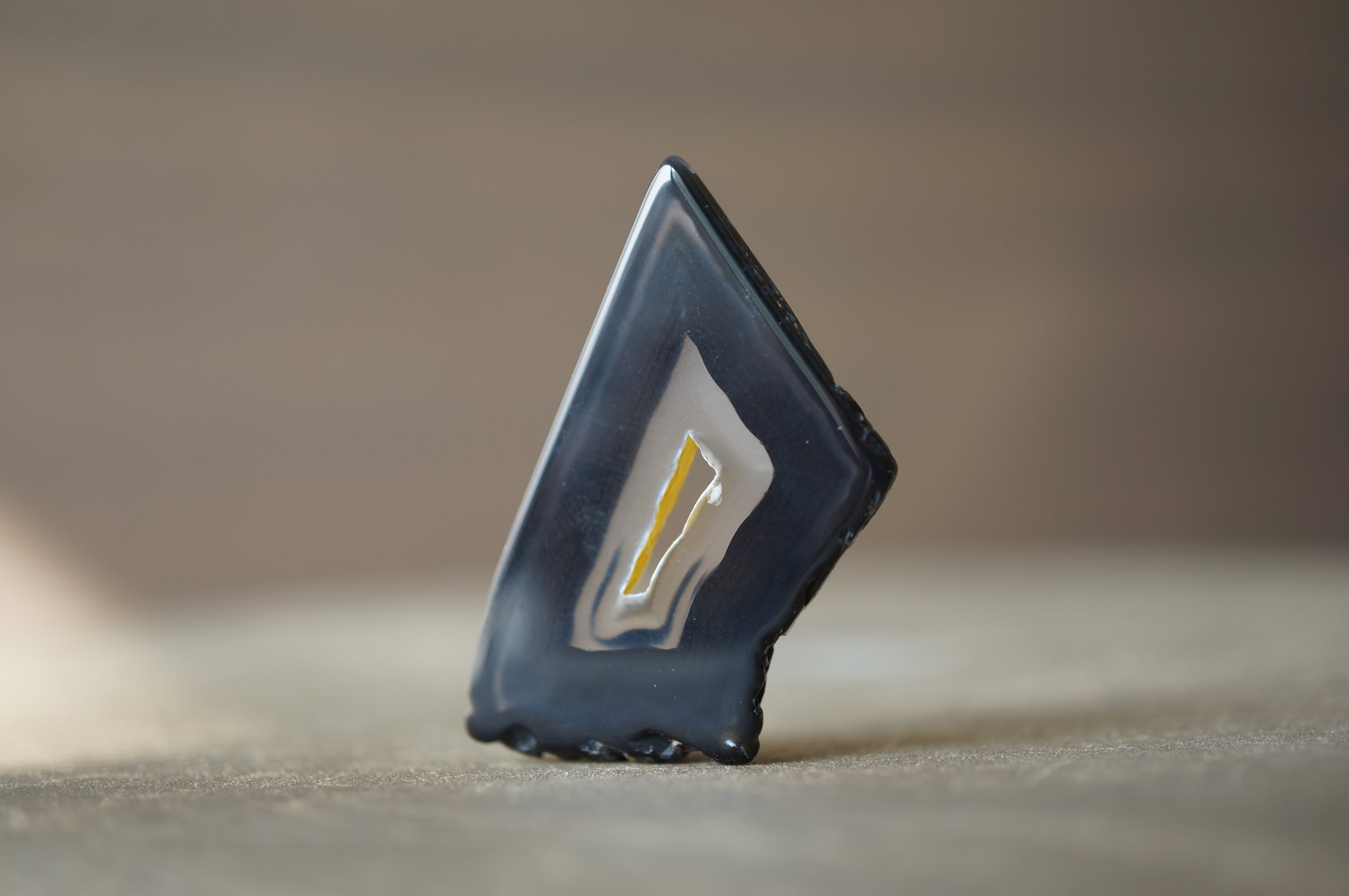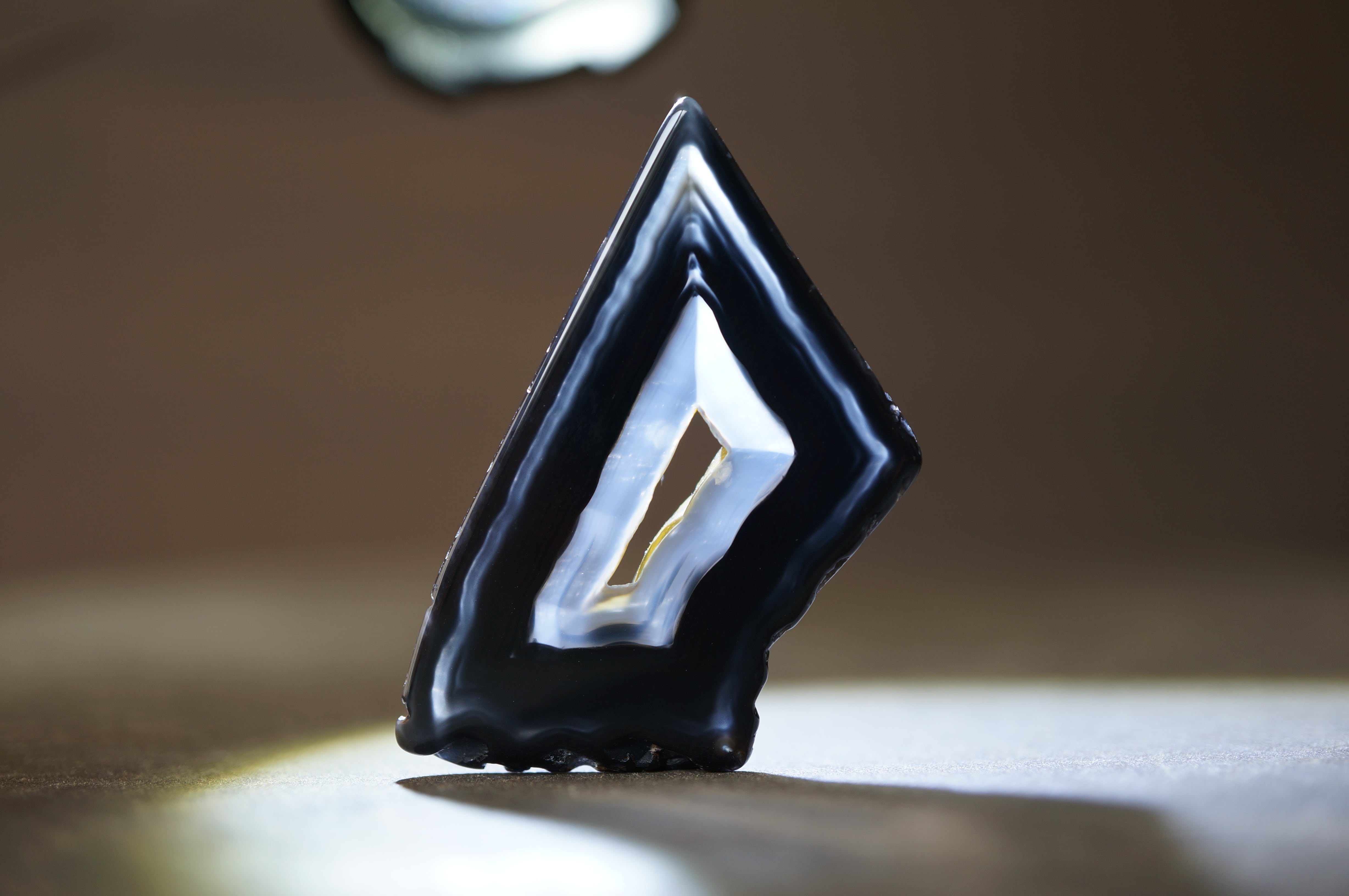 「Polyhedroid」は「多面体」を意味し、通常の同心円状や縞状のアゲートとは異なり、角張った面や幾何学的な層理が交錯する内部構造を持ちます。