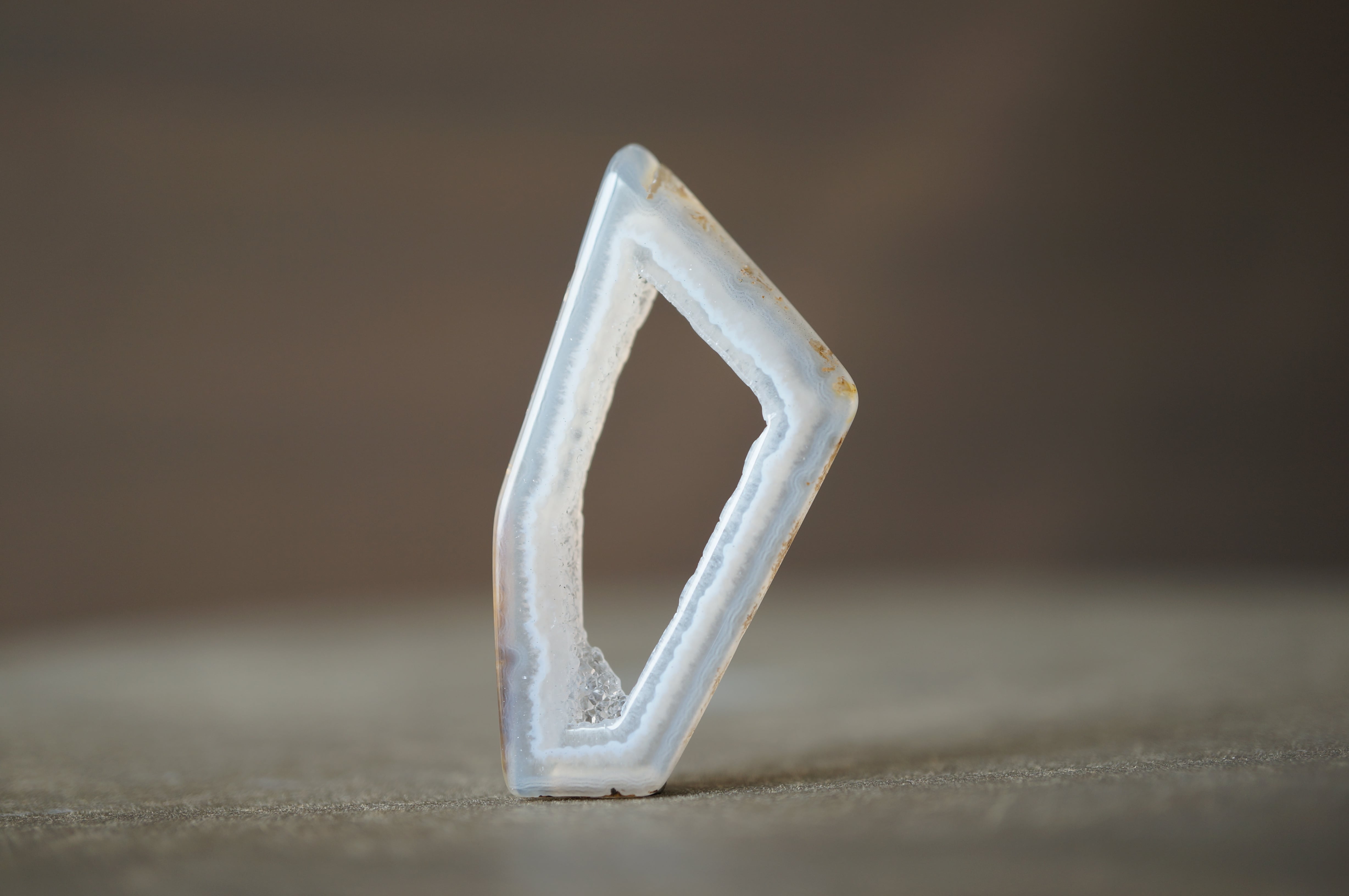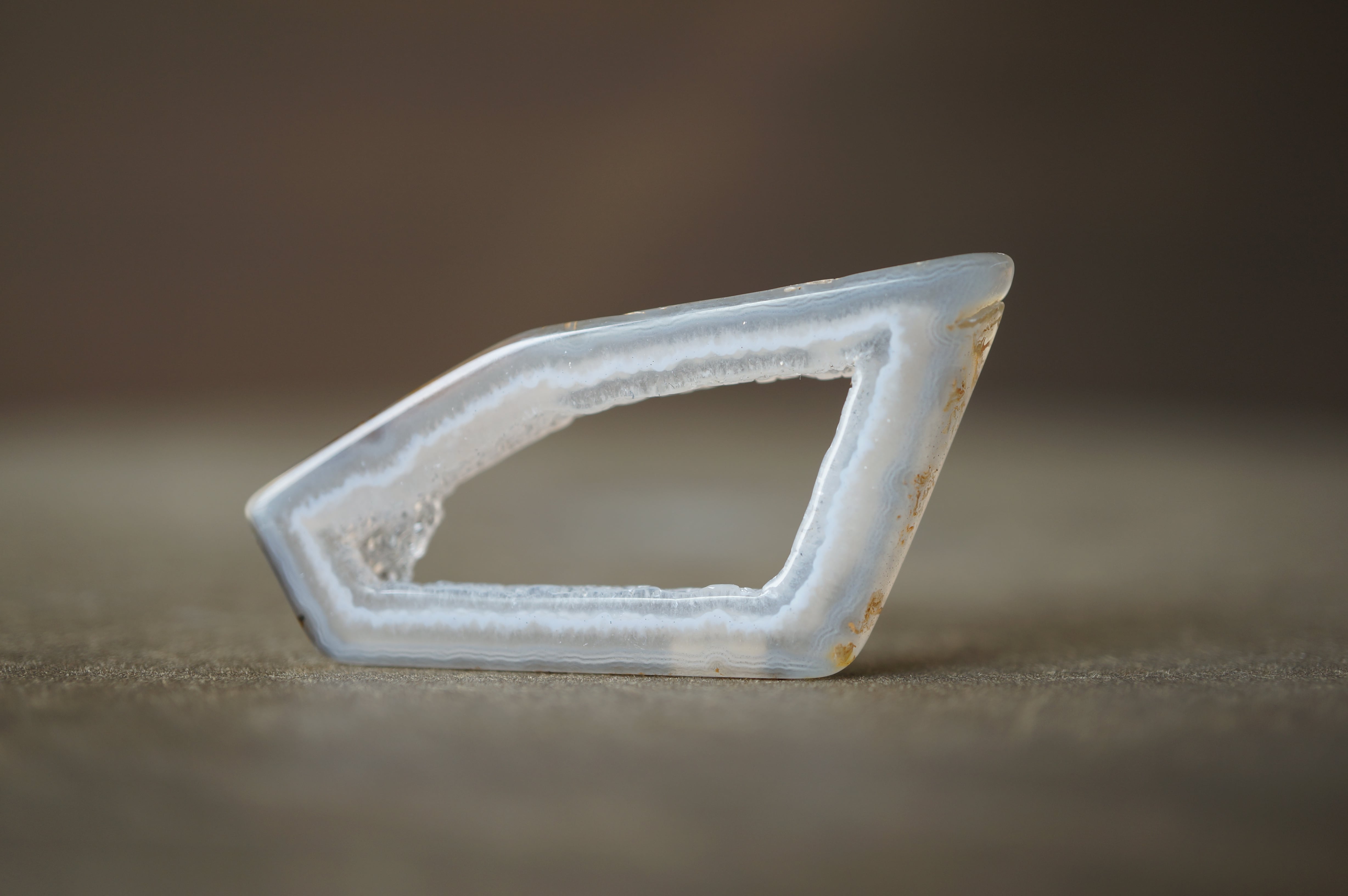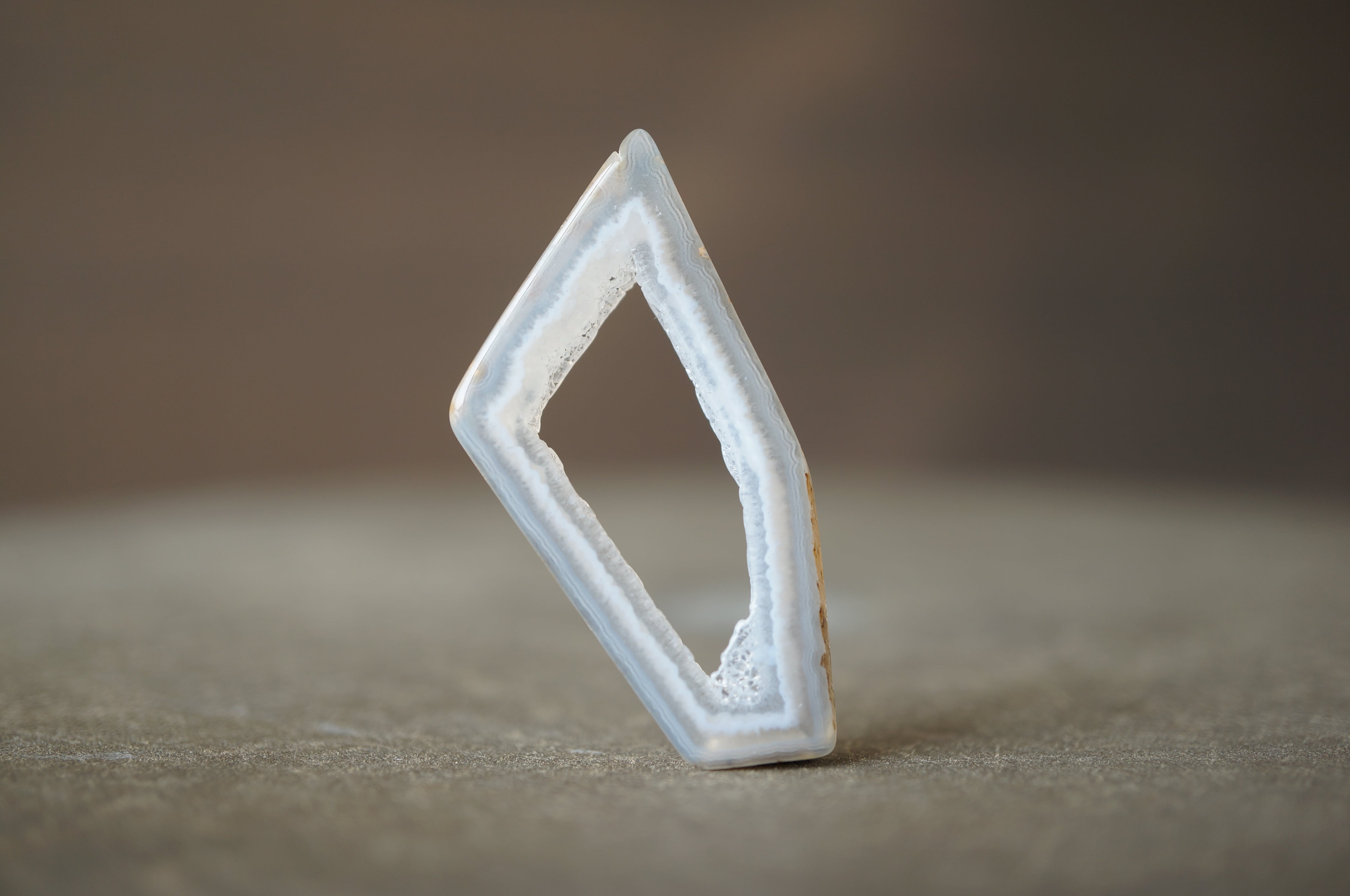 「Polyhedroid」は「多面体」を意味し、通常の同心円状や縞状のアゲートとは異なり、角張った面や幾何学的な層理が交錯する内部構造を持ちます。