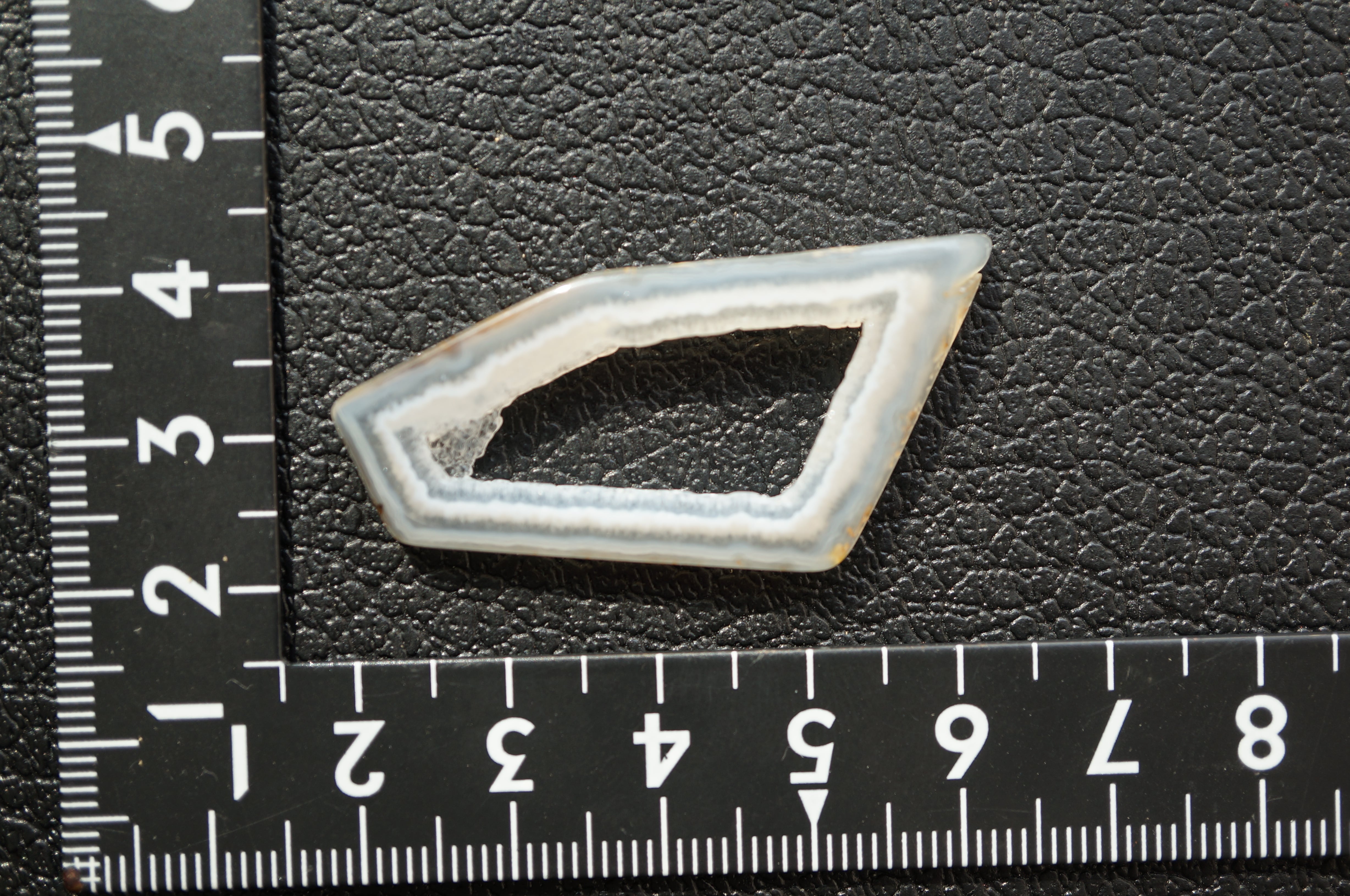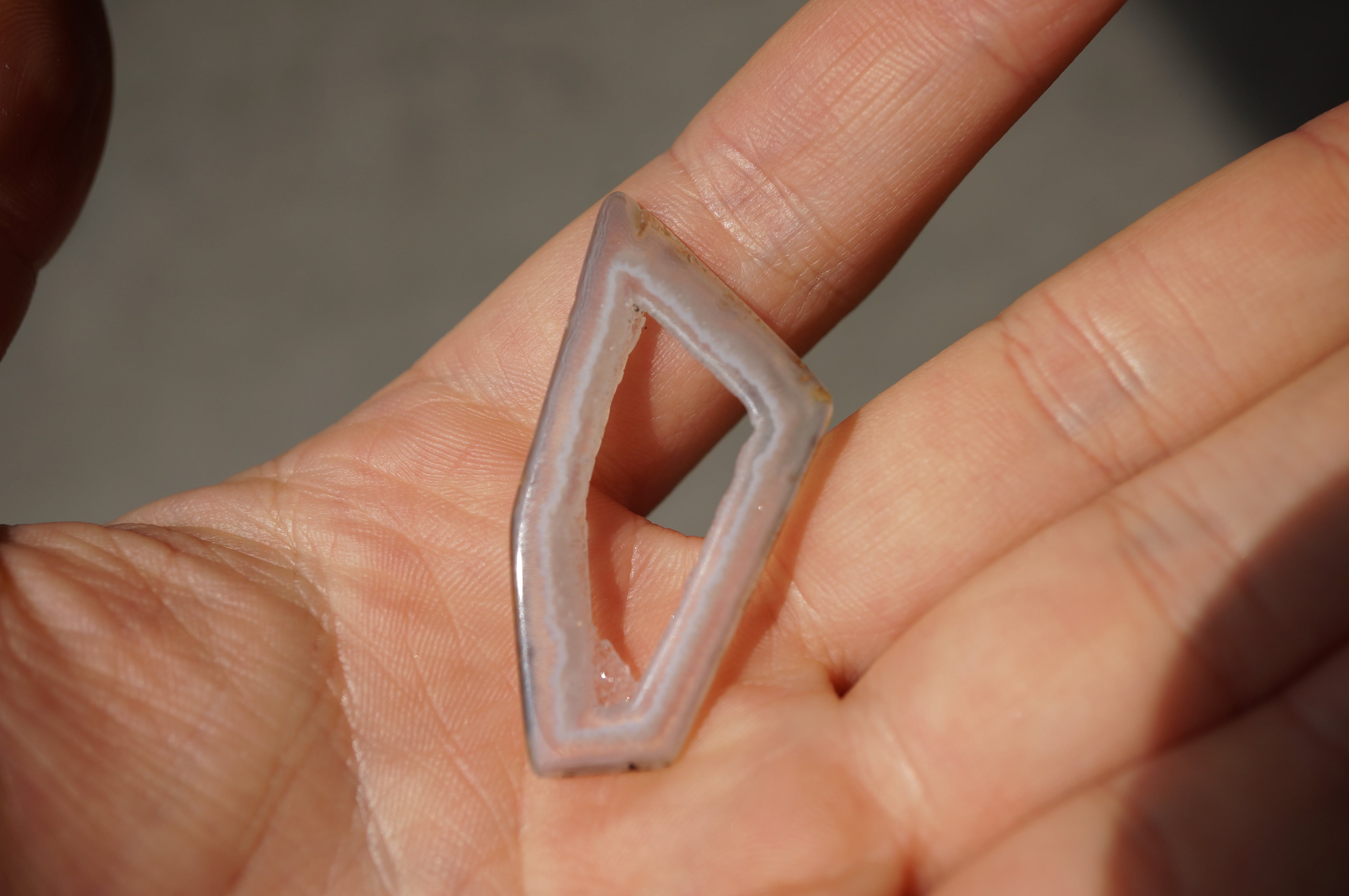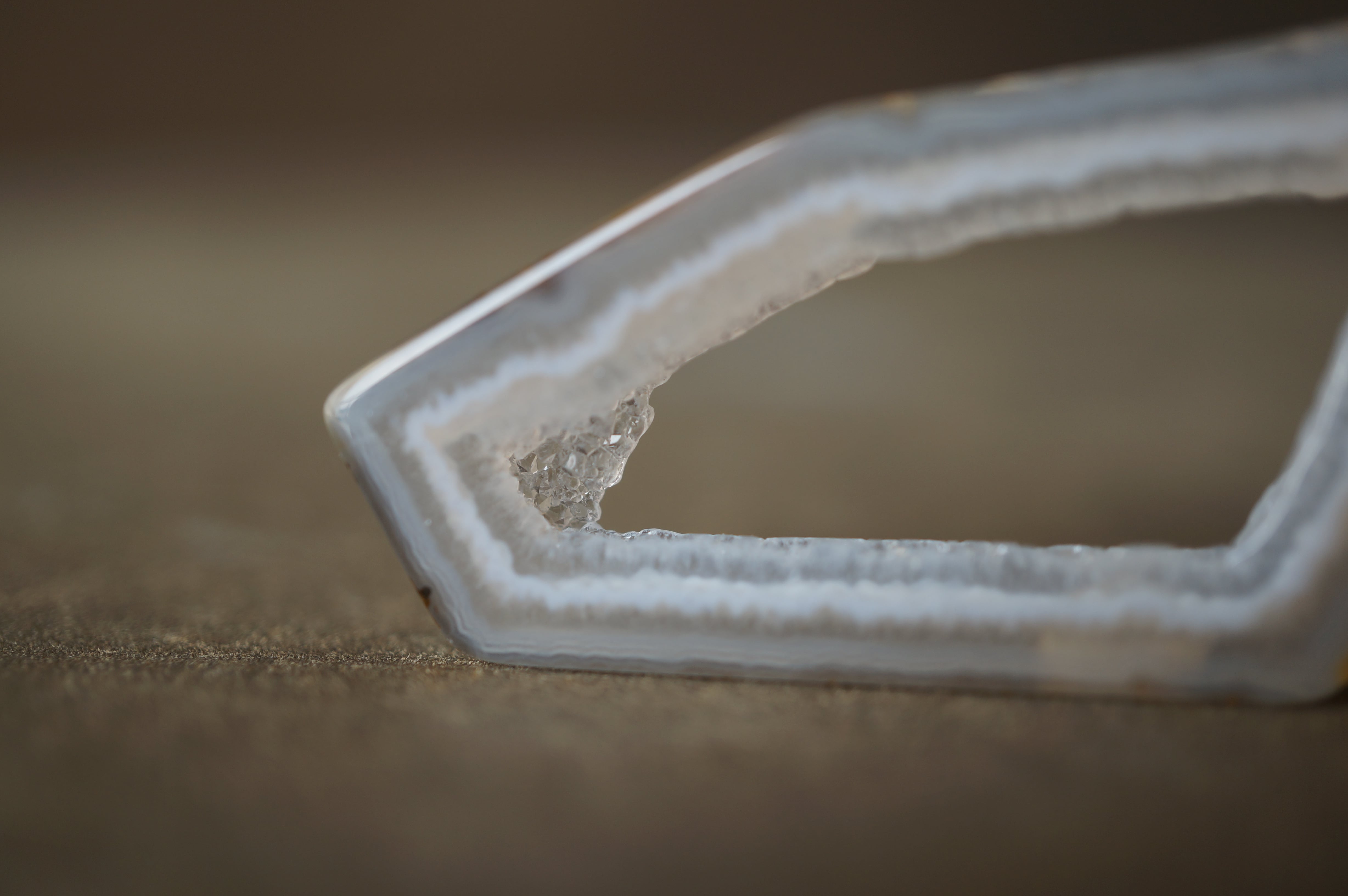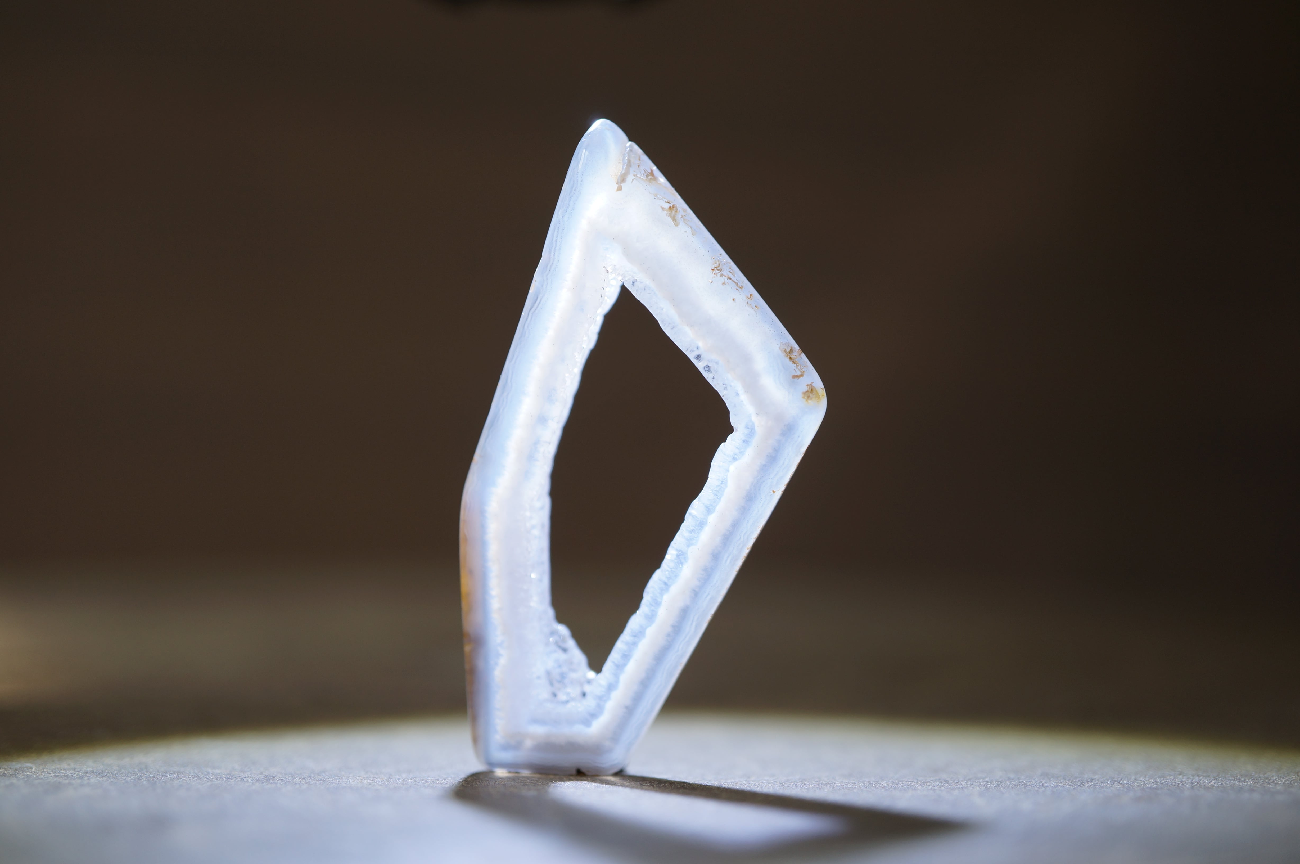 「Polyhedroid」は「多面体」を意味し、通常の同心円状や縞状のアゲートとは異なり、角張った面や幾何学的な層理が交錯する内部構造を持ちます。
