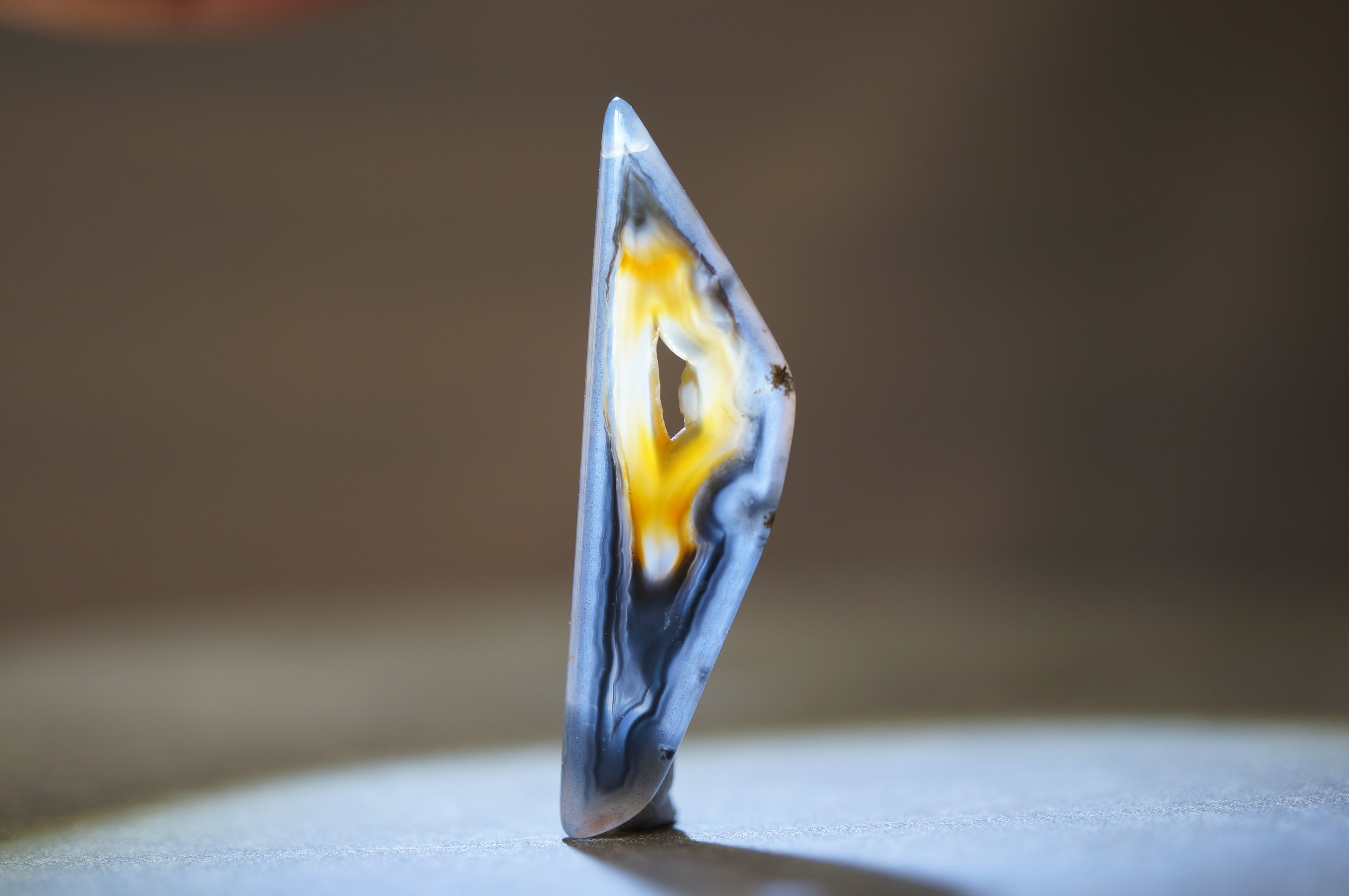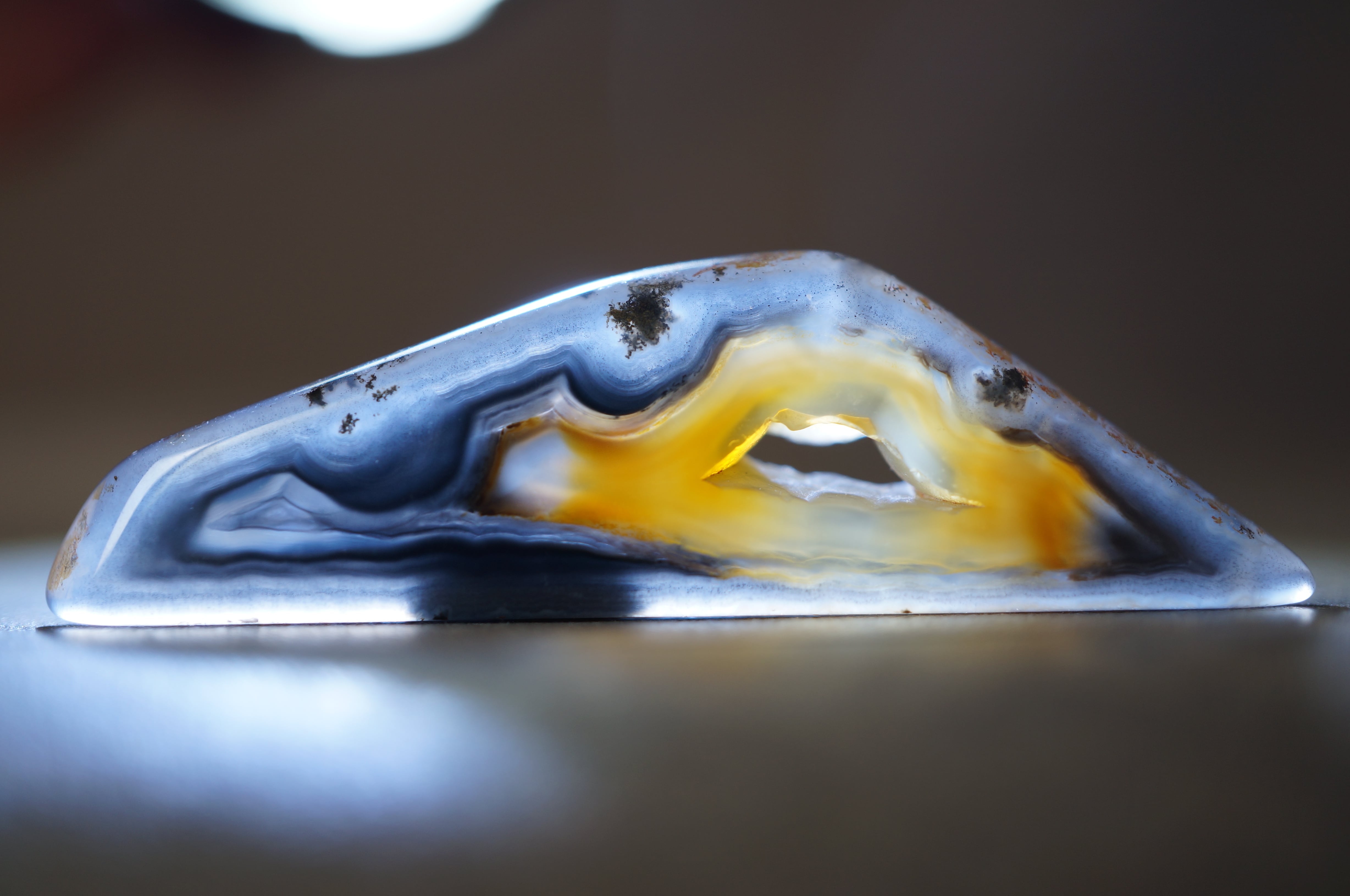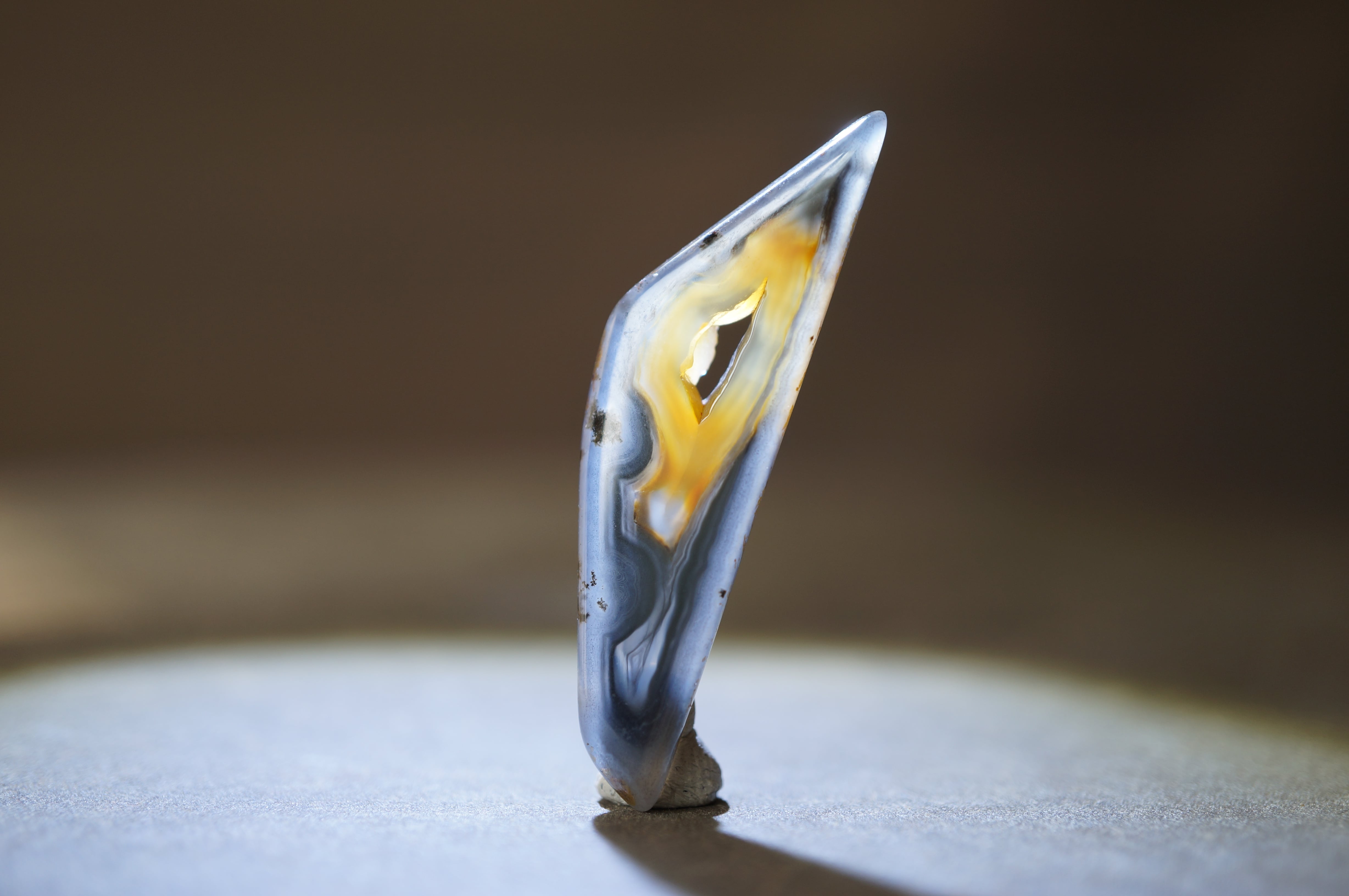 「Polyhedroid」は「多面体」を意味し、通常の同心円状や縞状のアゲートとは異なり、角張った面や幾何学的な層理が交錯する内部構造を持ちます。