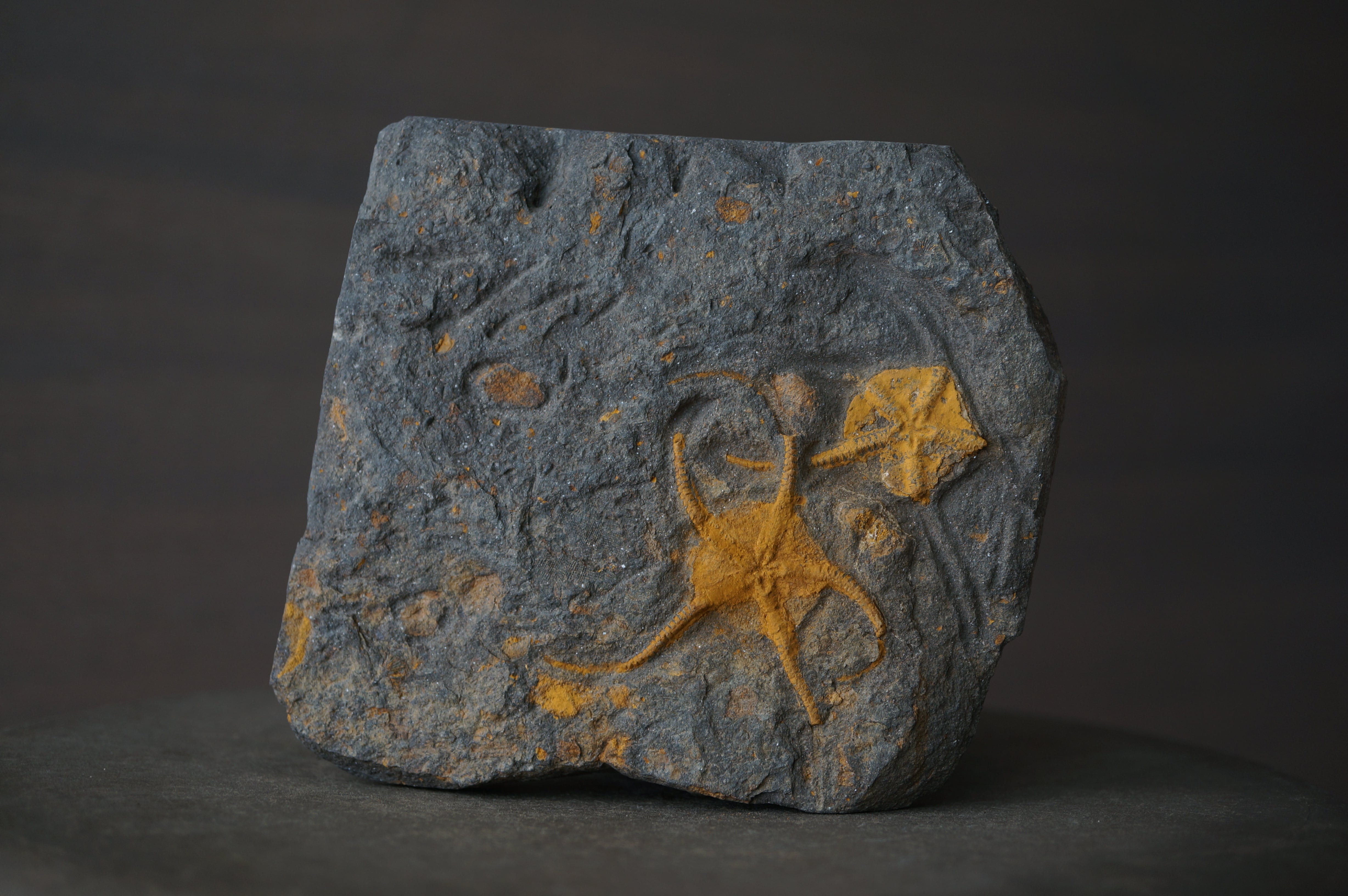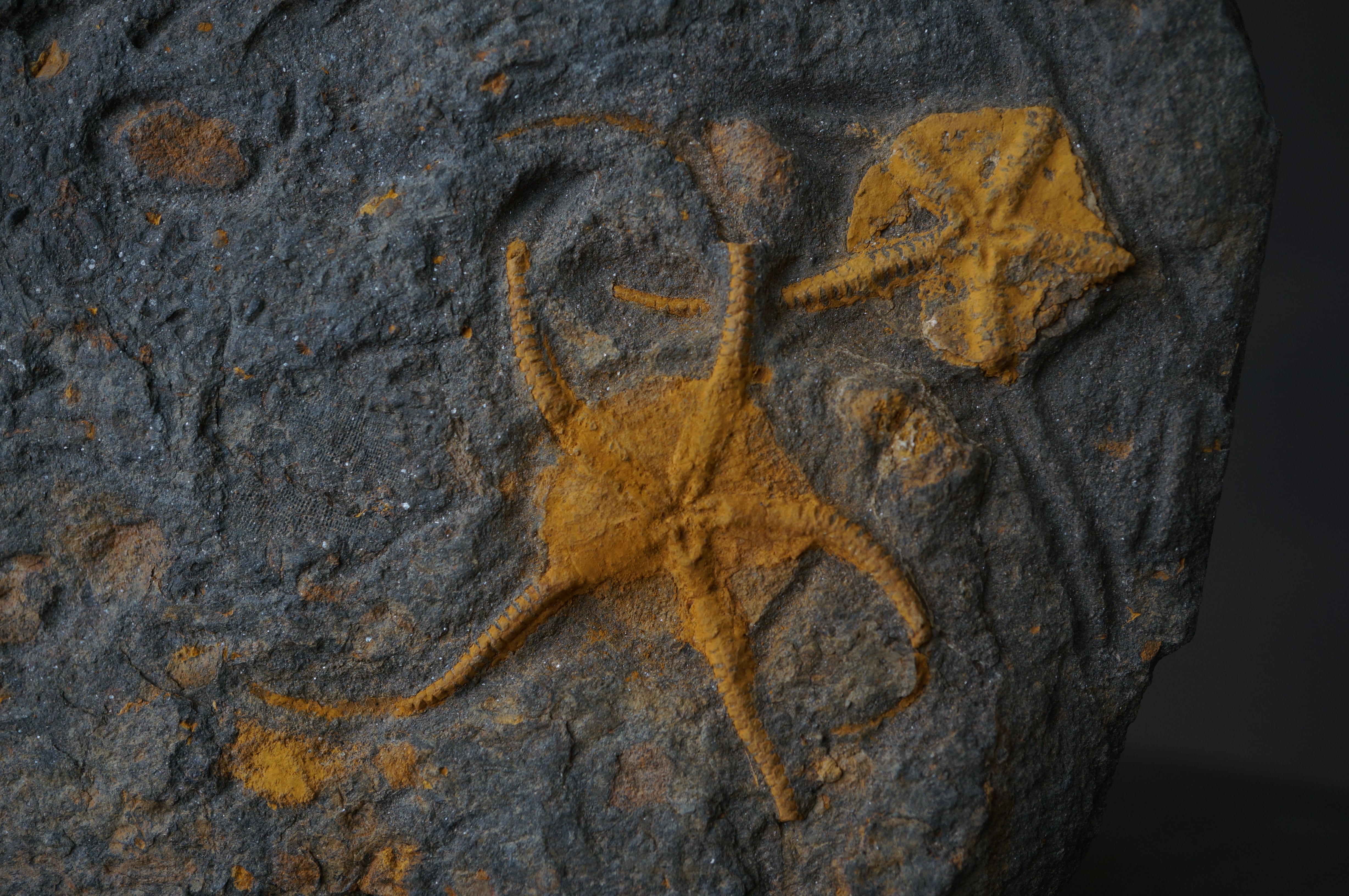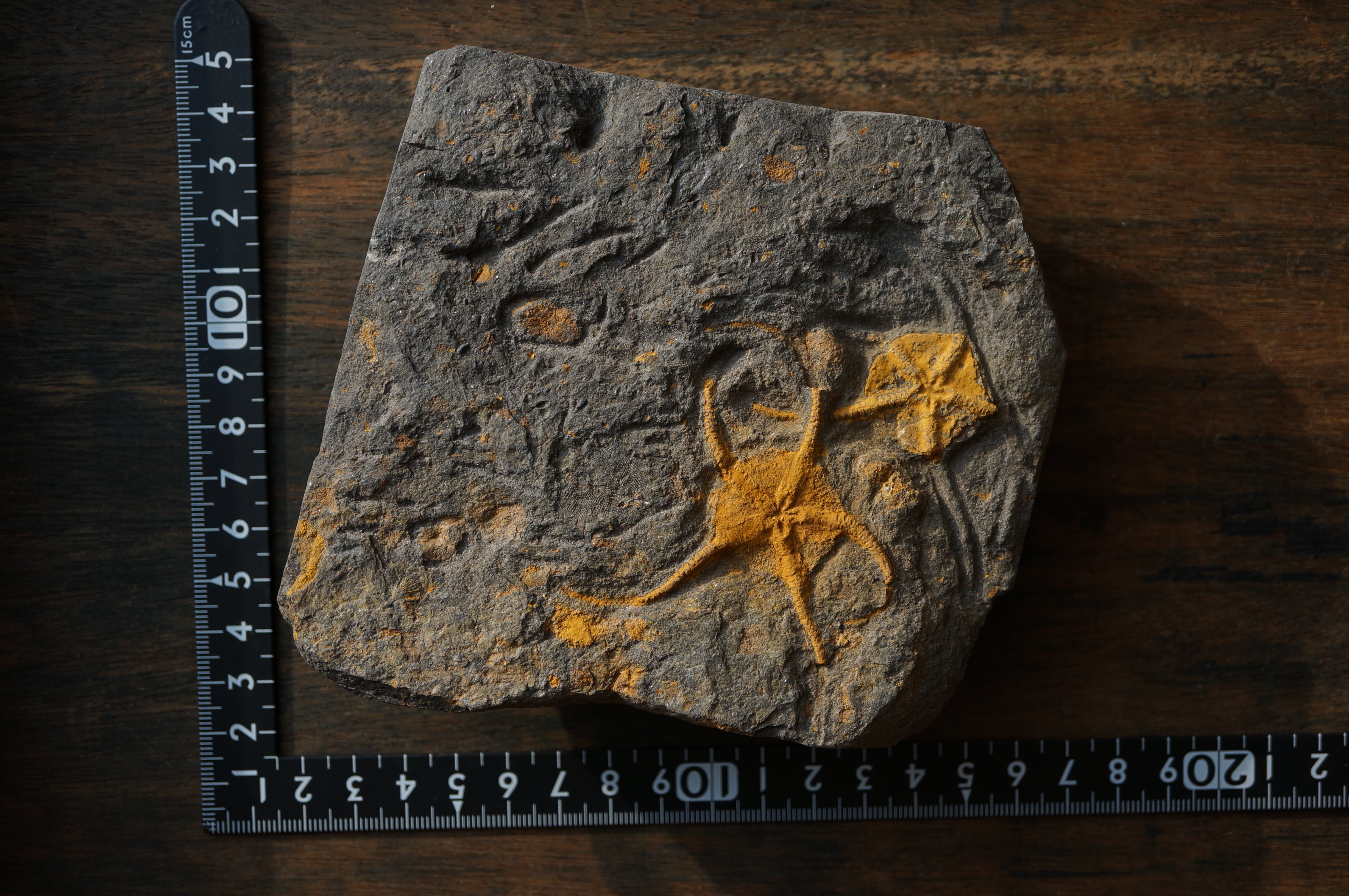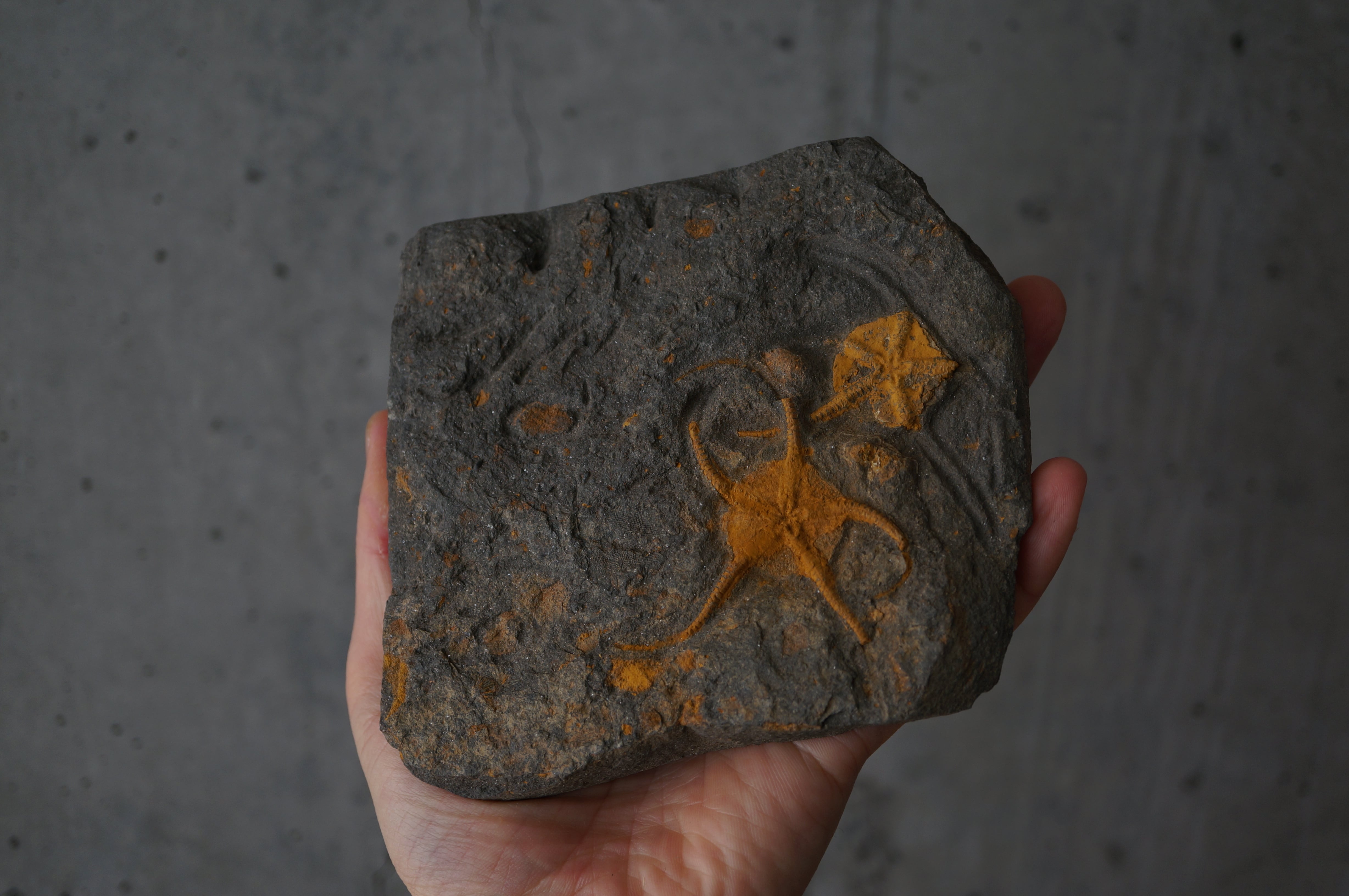 本石では2個体が保存され、5方向へ伸びる腕の構造が明瞭に確認できます。