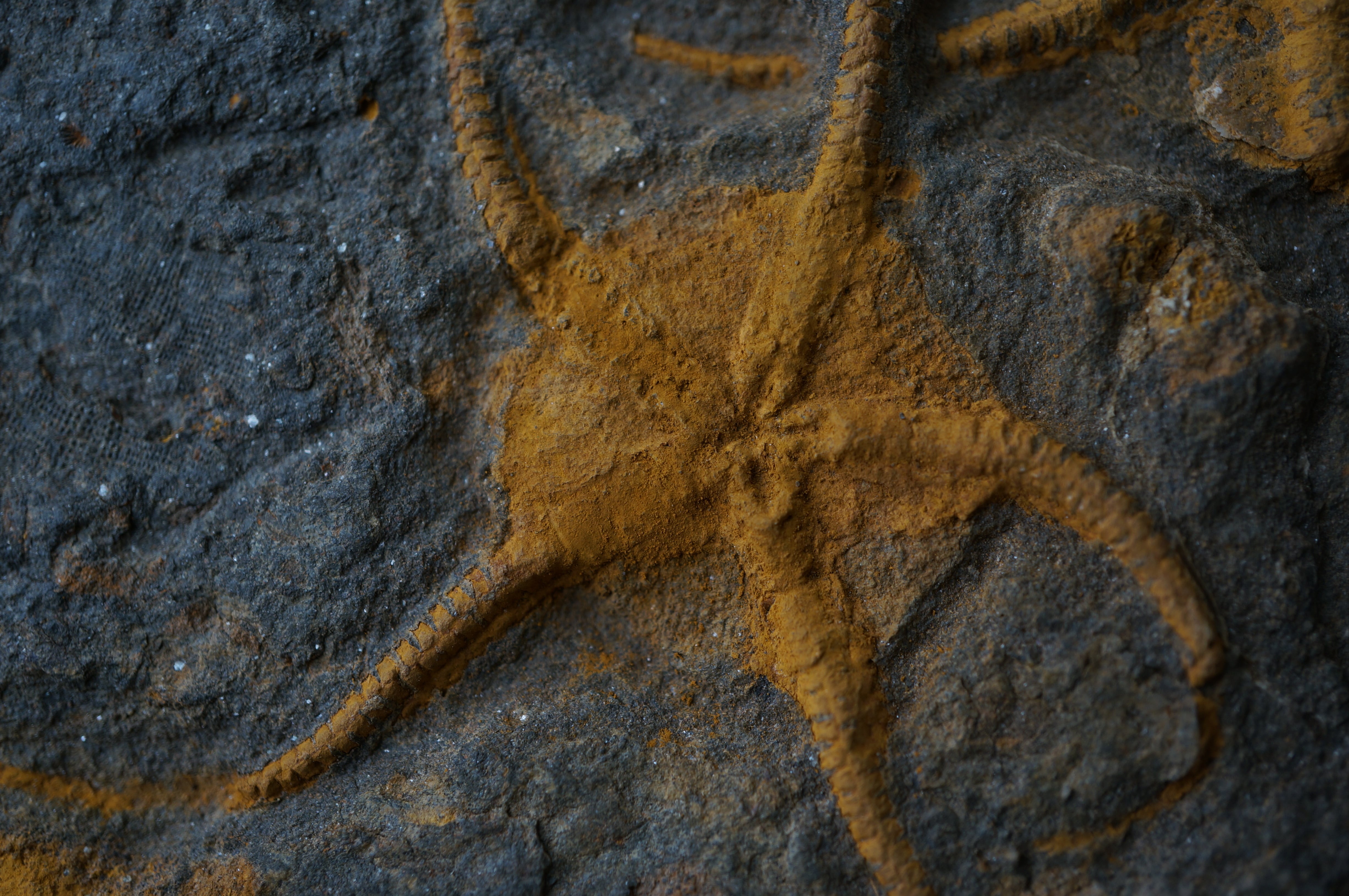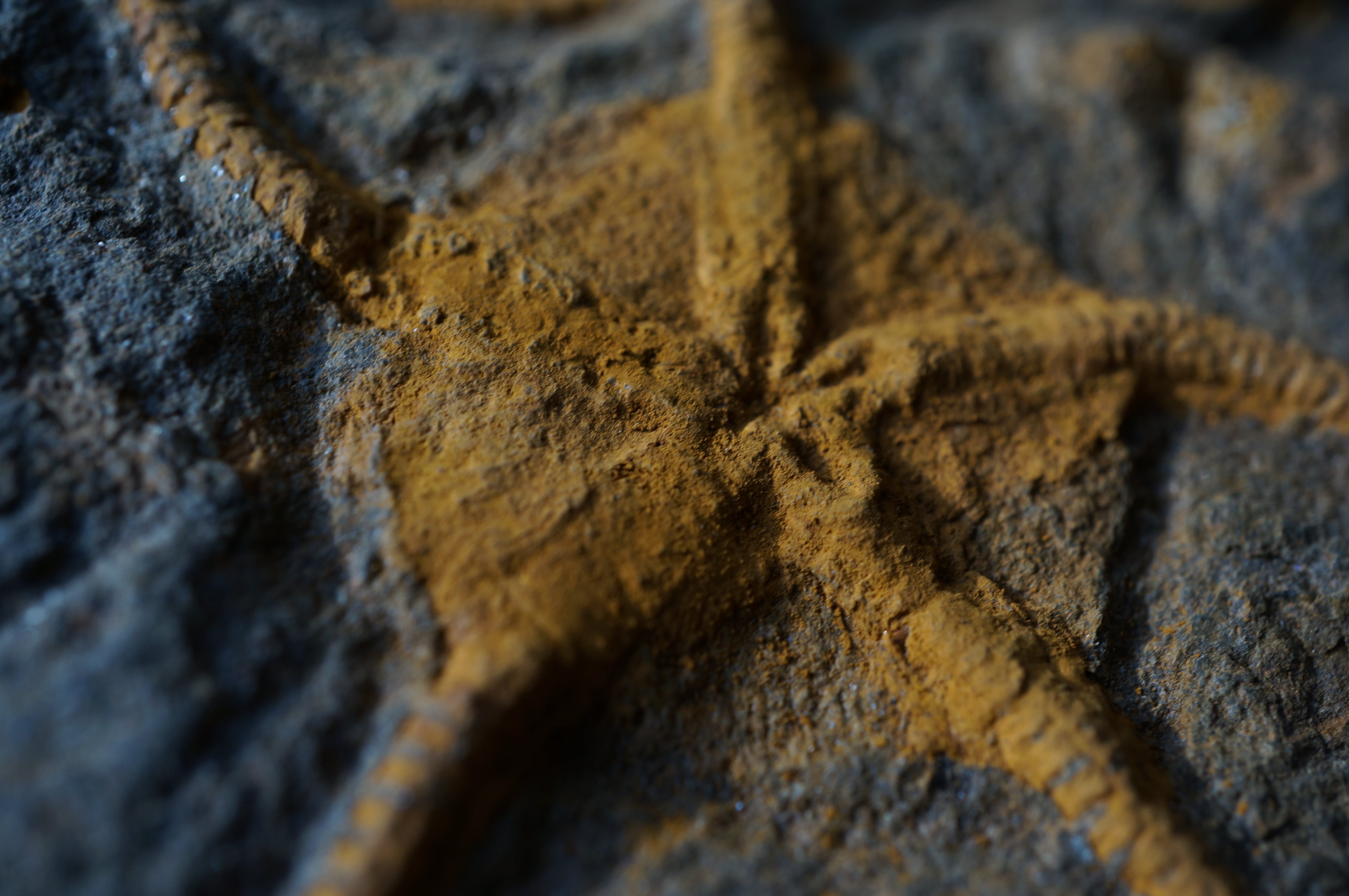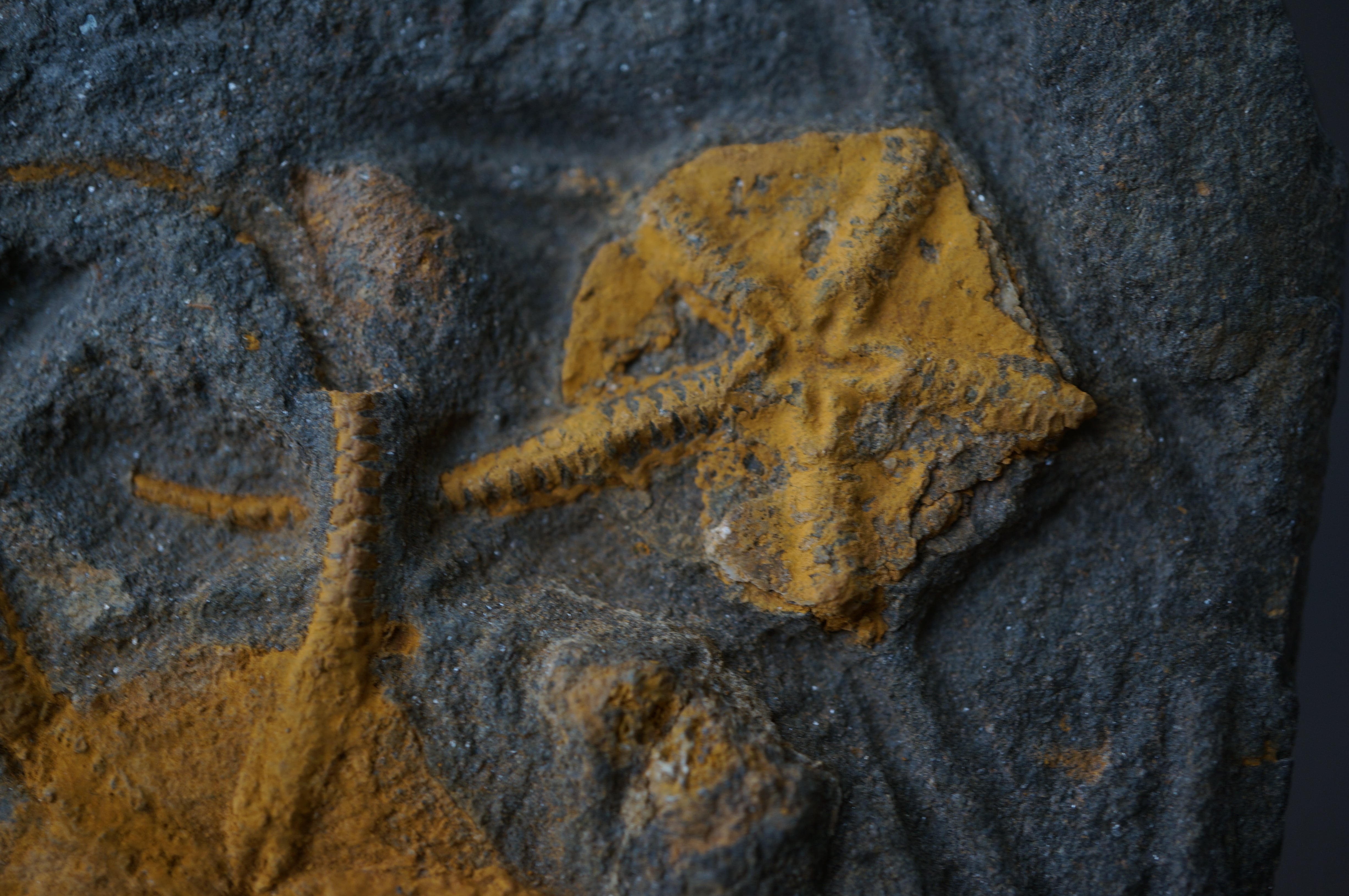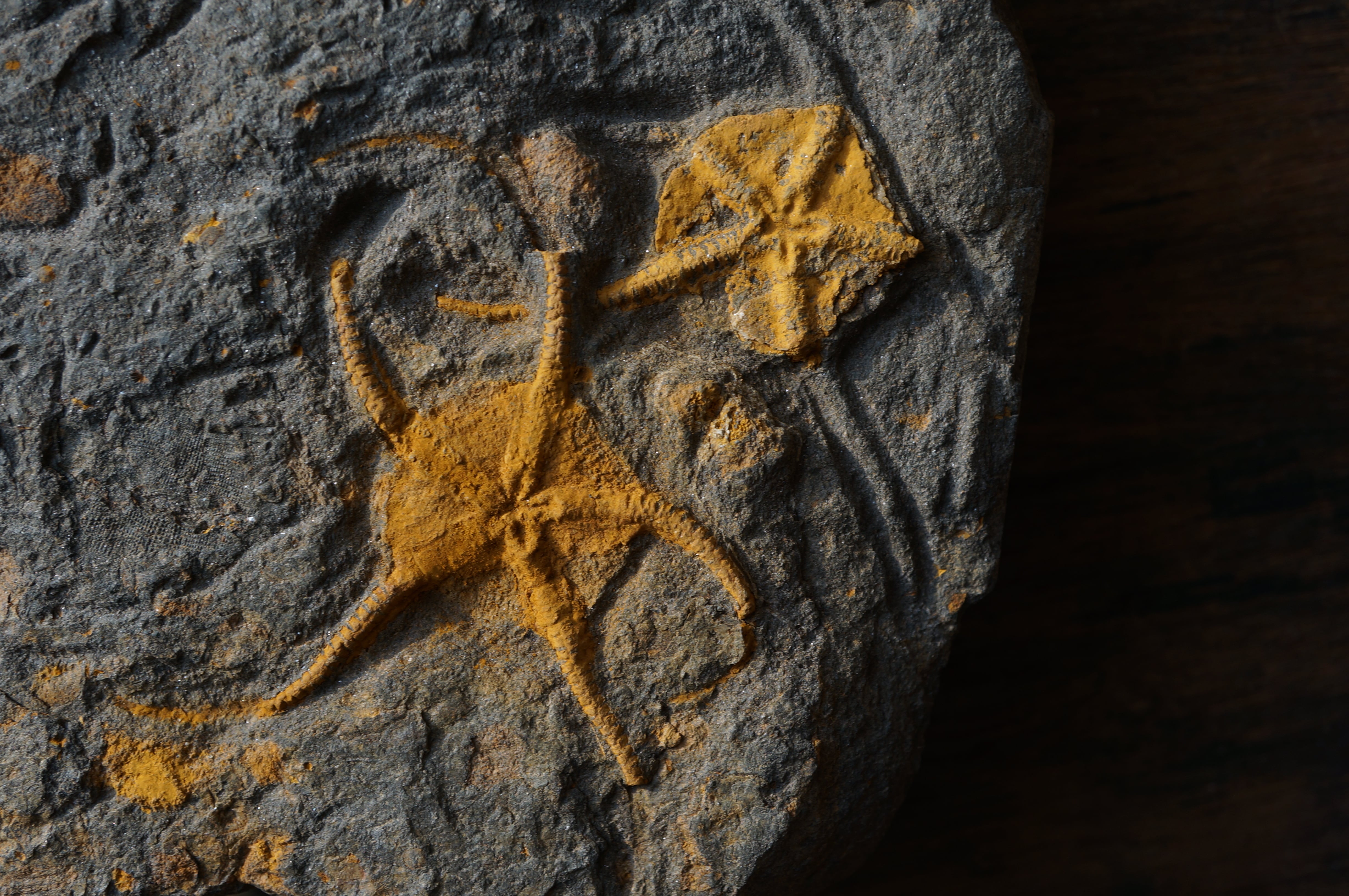 本石では2個体が保存され、5方向へ伸びる腕の構造が明瞭に確認できます。