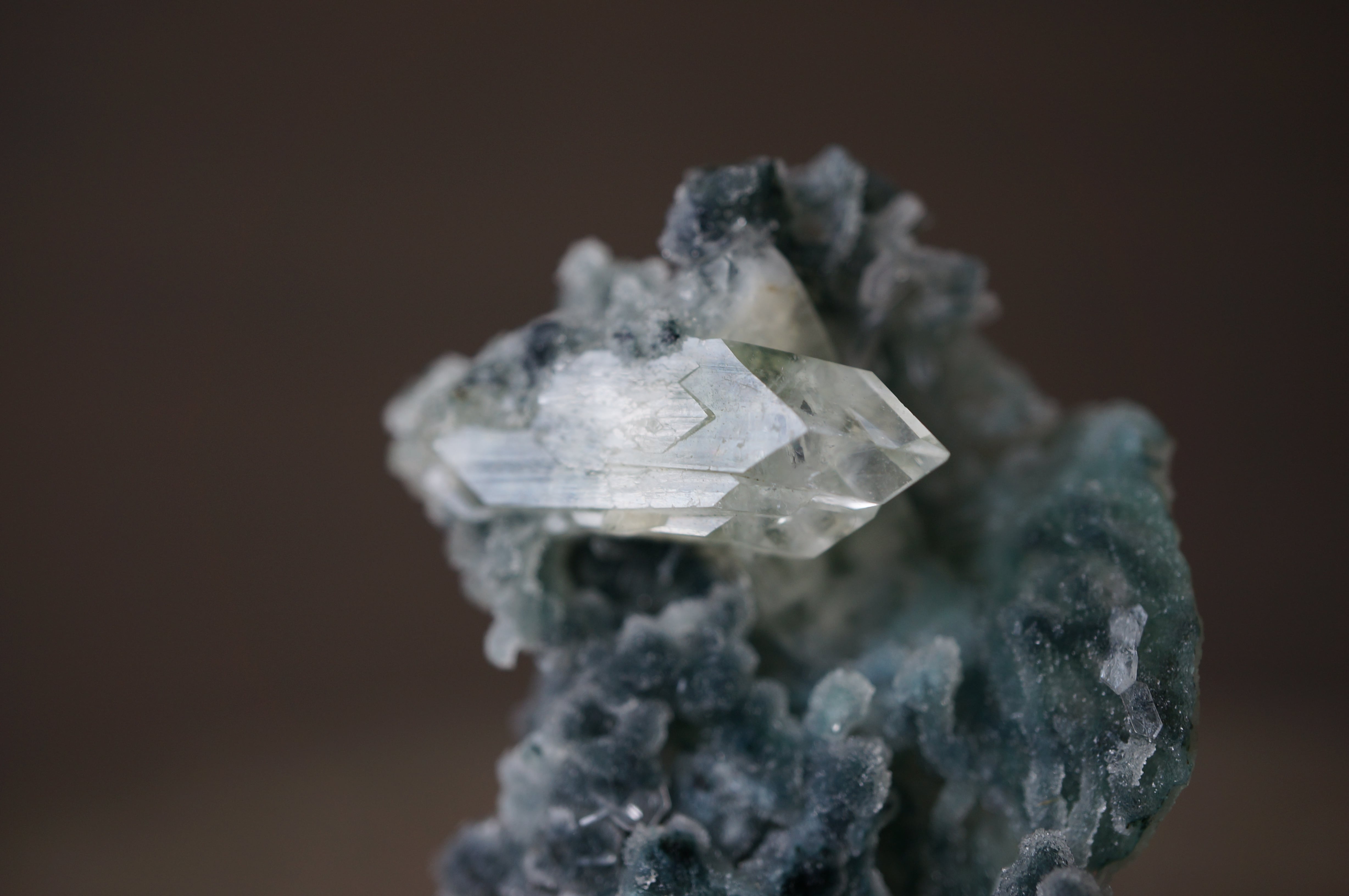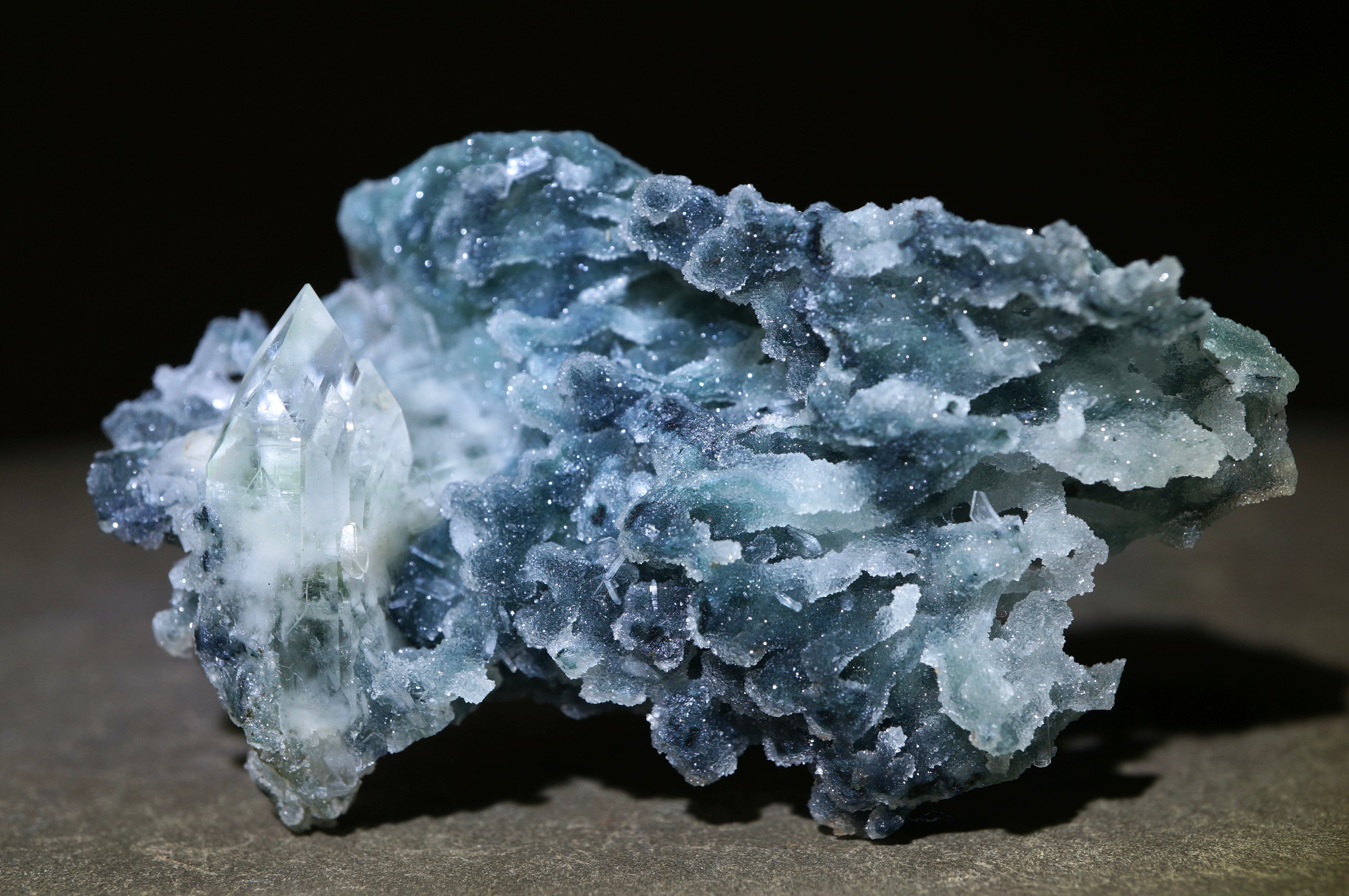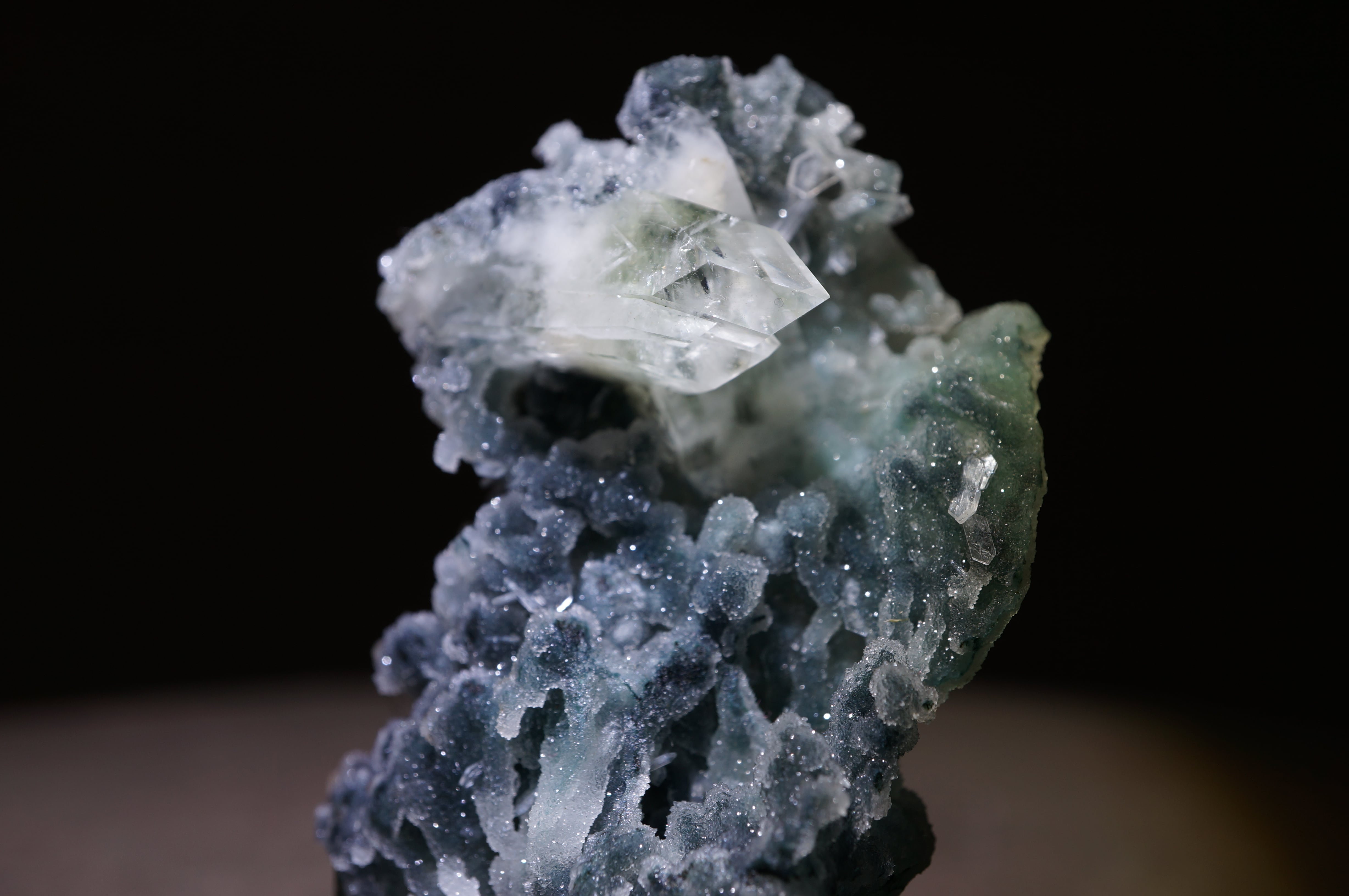 キラキラと輝く鍾乳状のカルセドニーと、ソリッドなアポフィライトが共生し、独特の景観を作り上げています。